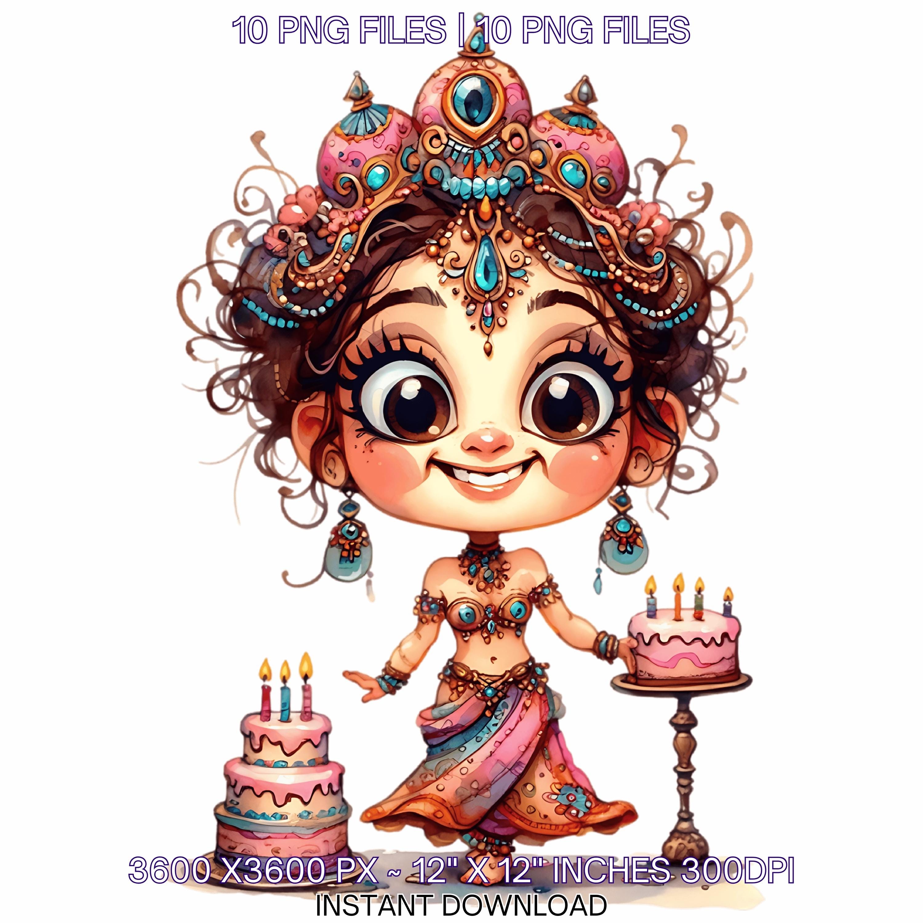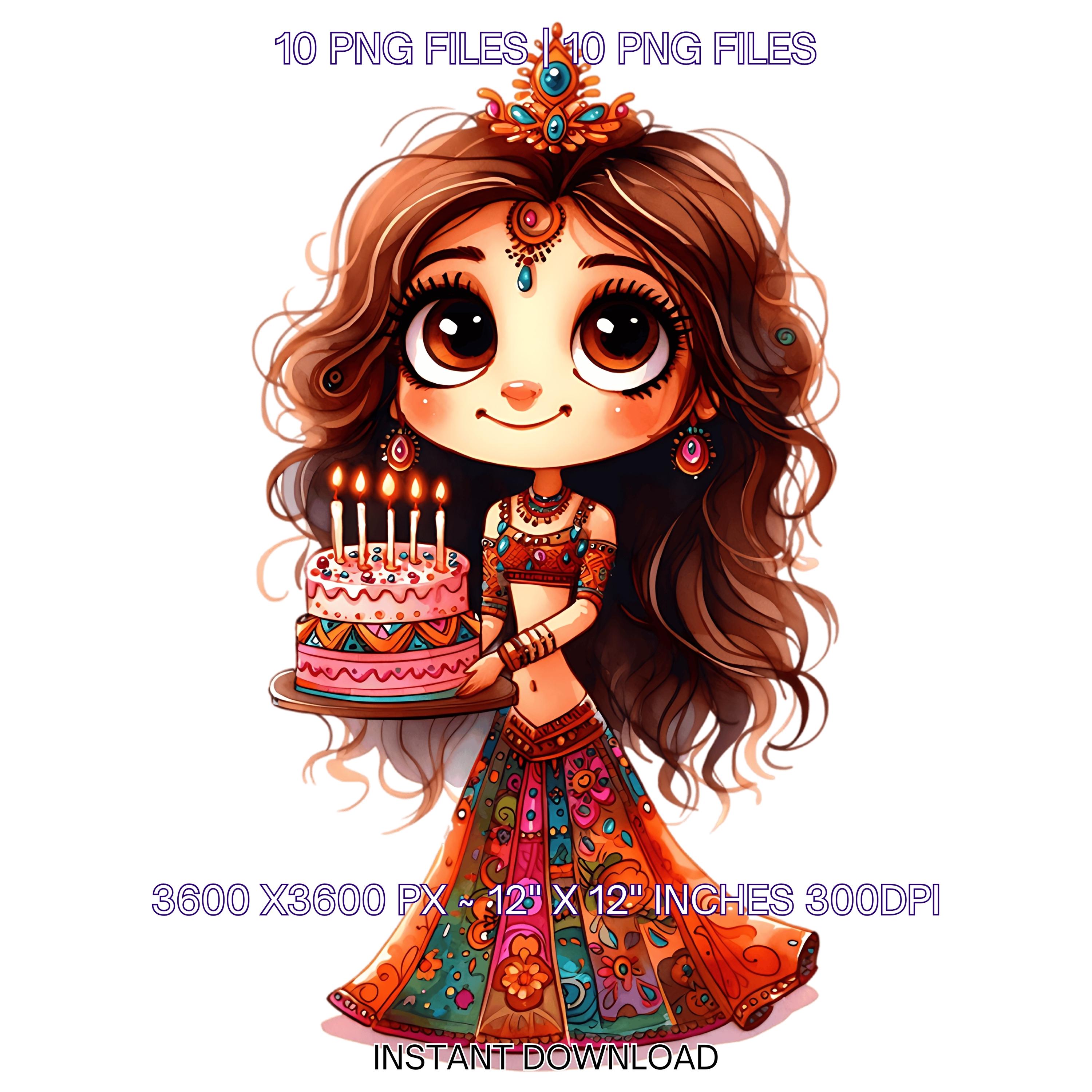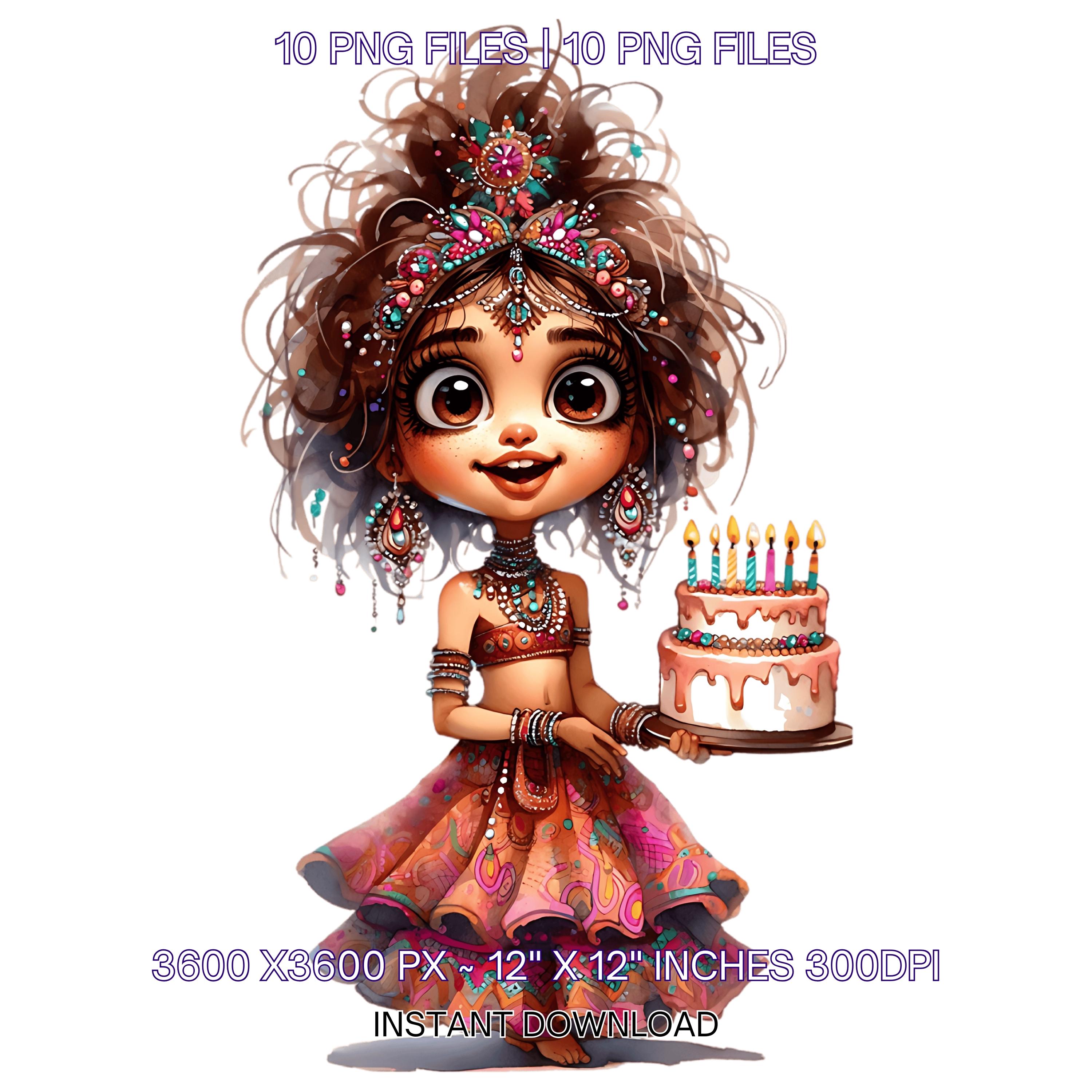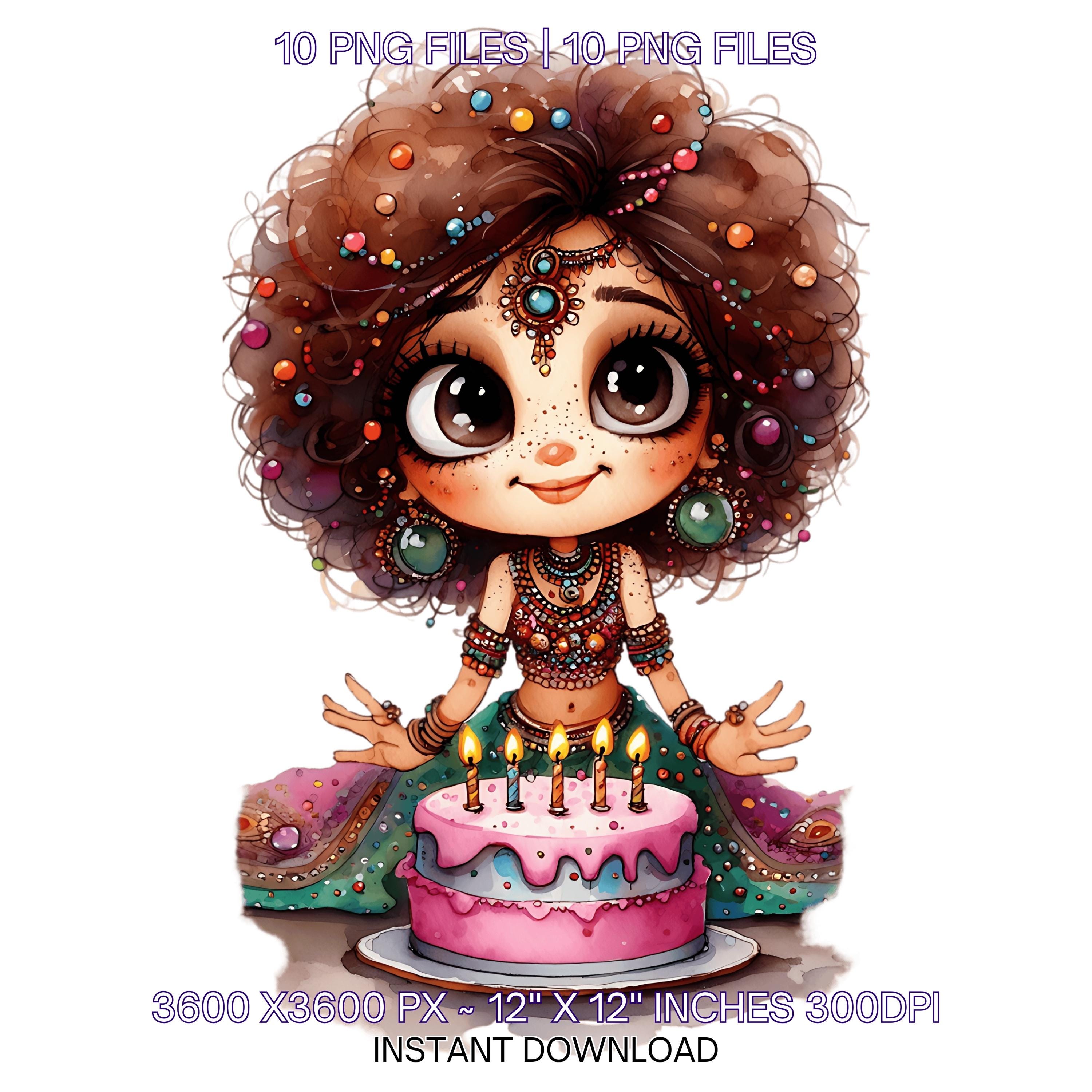10 Quirky Girl Birthday Smiling with Birthday Cake Clip Art PNG | Cute Brown Hair Woman in Haute Couture Dress Sublimation Commercial Use is an eye-catching, high-resolution digital asset designed for creators, crafters, teachers, and small business owners looking to elevate their visuals.