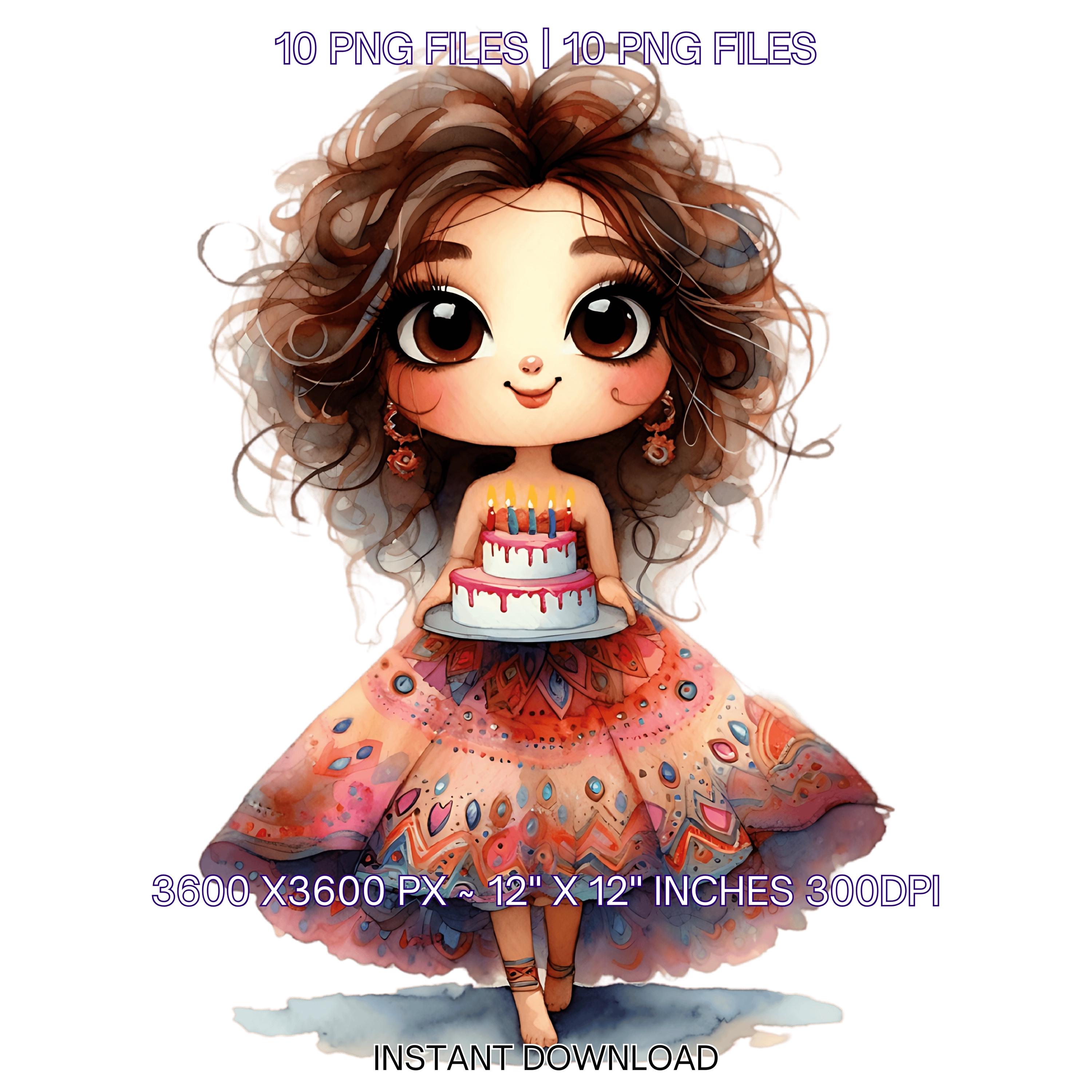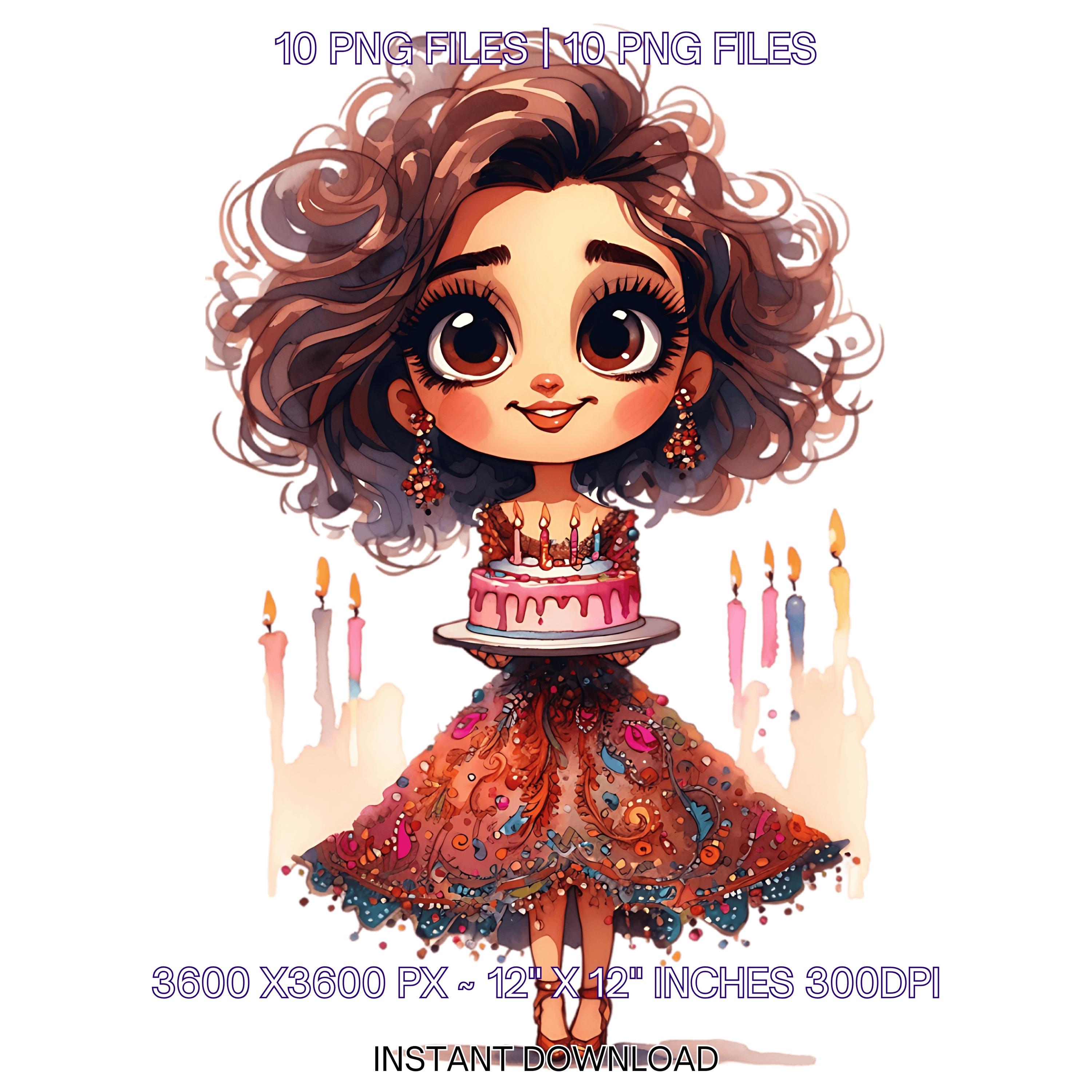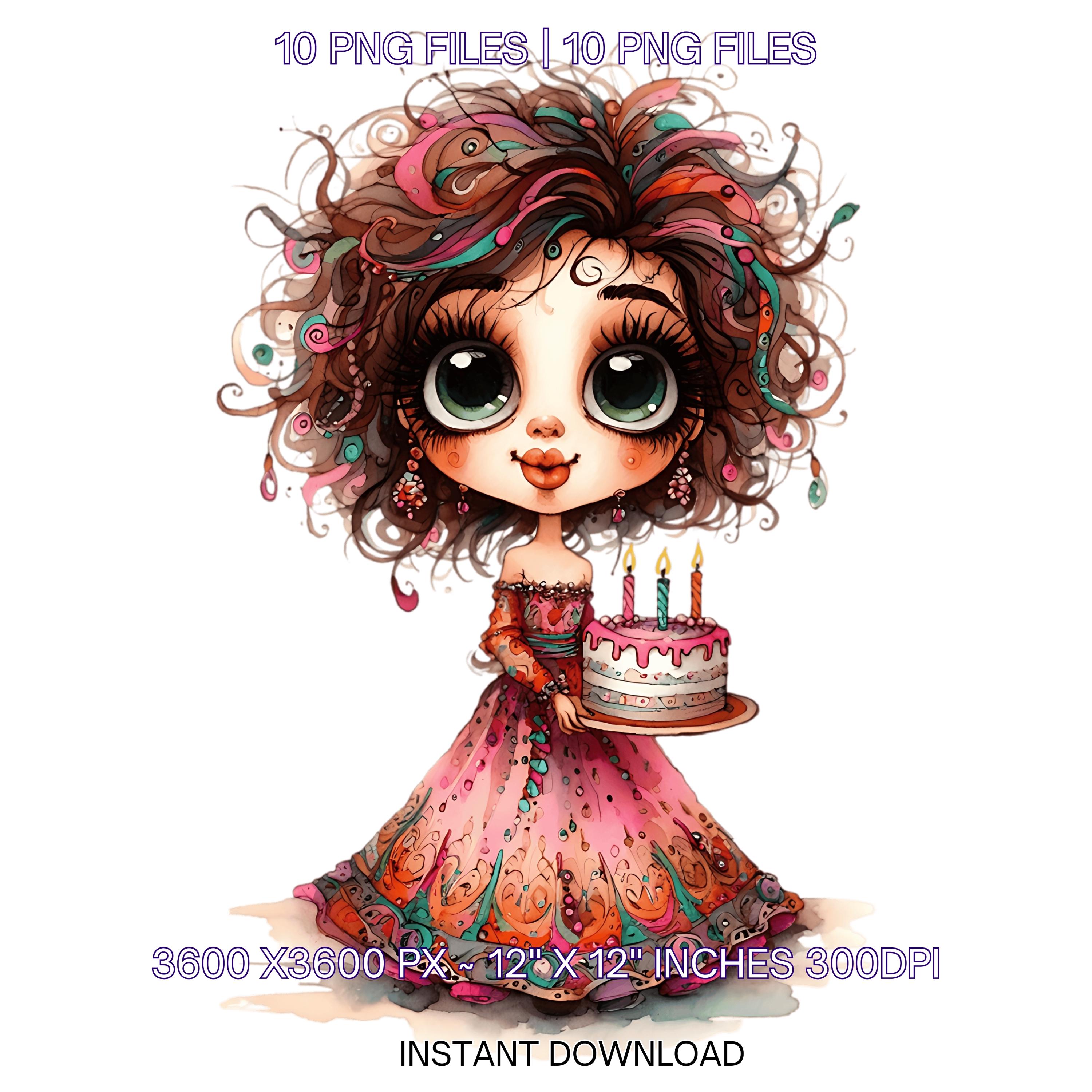 10 Quirky Girl Birthday Smiling with Birthday Cake Clip Art PNG | Cute Brown Hair Woman in Haute Couture Dress Sublimation Commercial Use