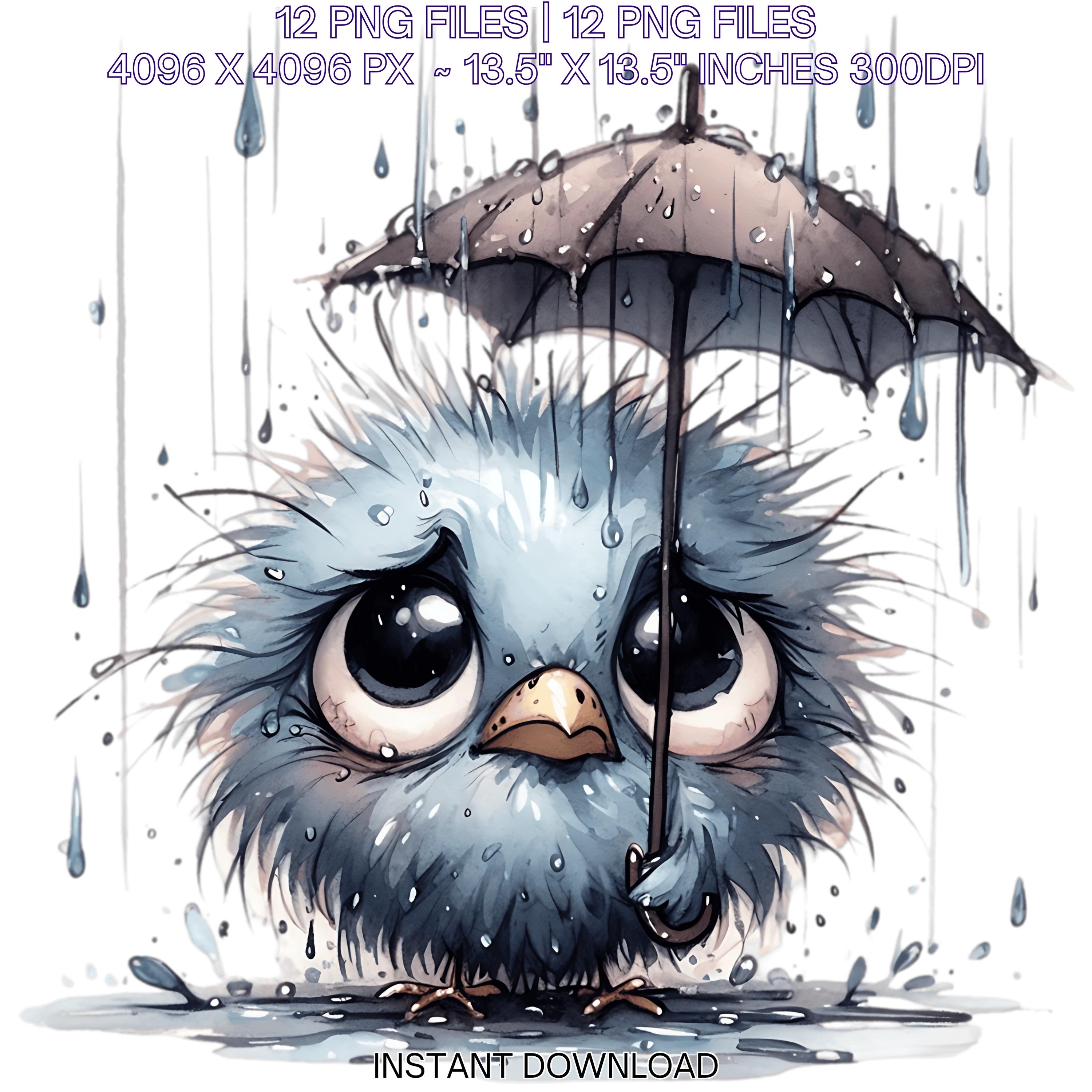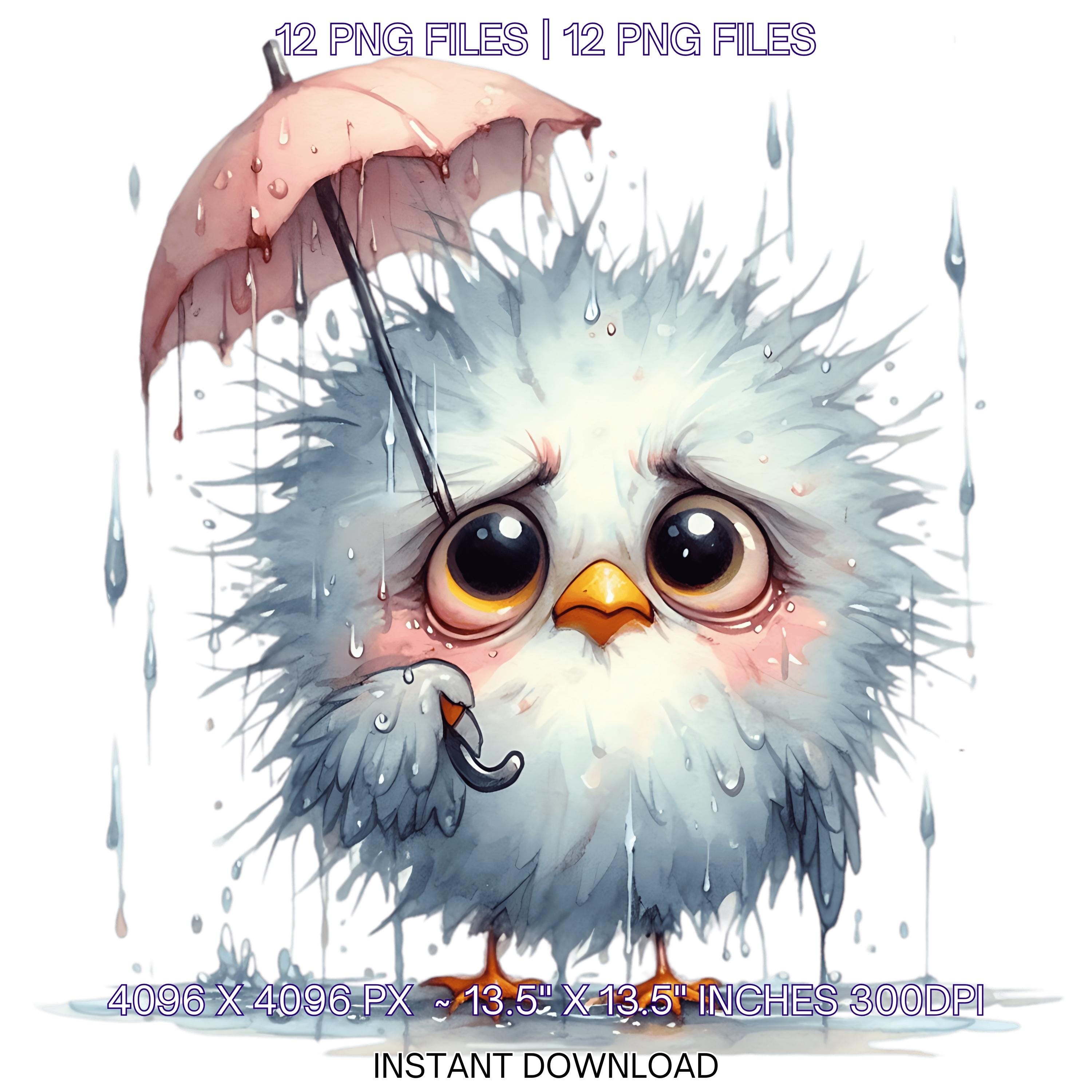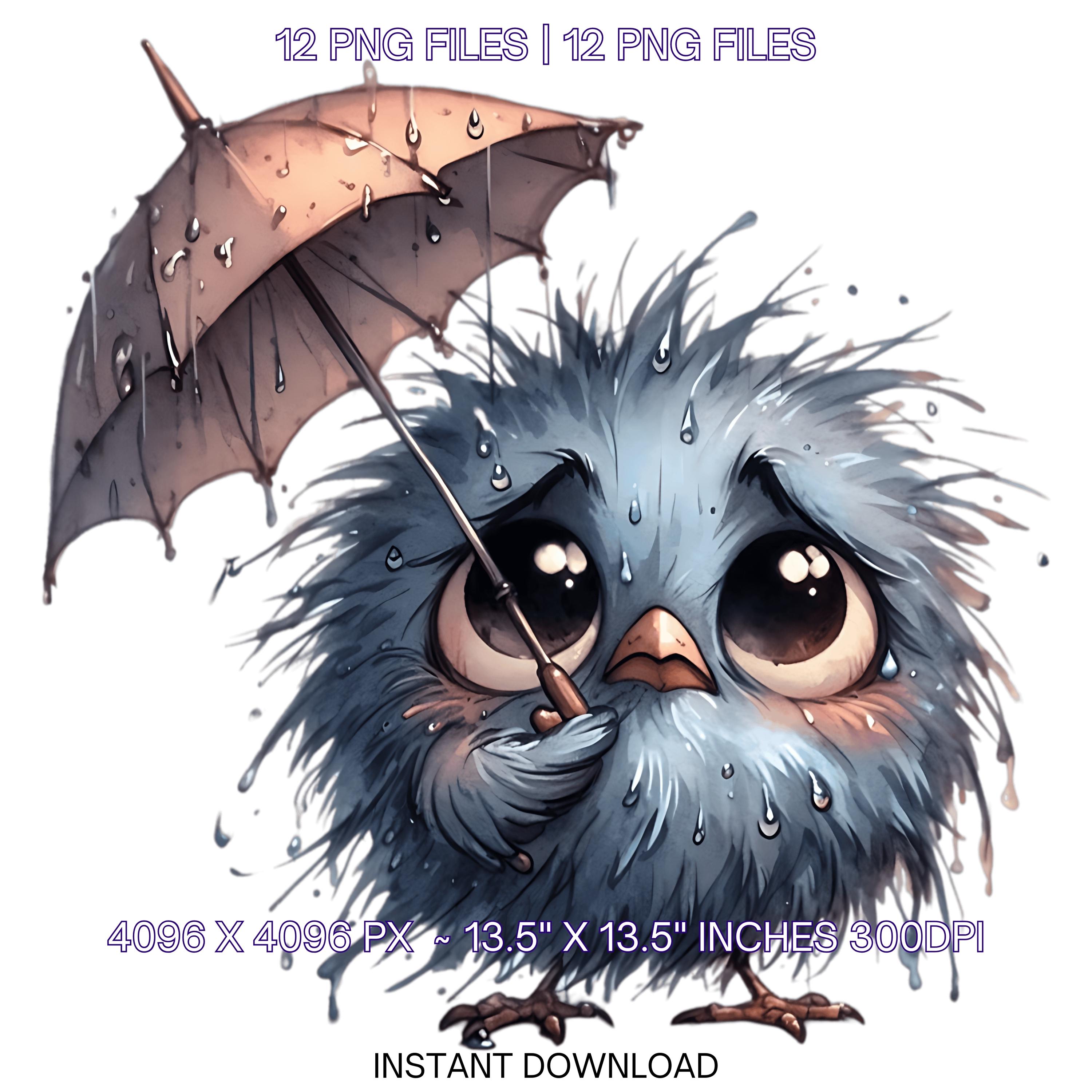 12 Frazzled Bird with a Tiny Umbrella in the Rain PNG | Quirky Grumpy Bird Clip Art Whimsical Junk Journal Scrapbooking Card Commercial Use is an eye-catching, high-resolution digital asset designed for creators, crafters, teachers, and small business owners looking to elevate their visuals.
