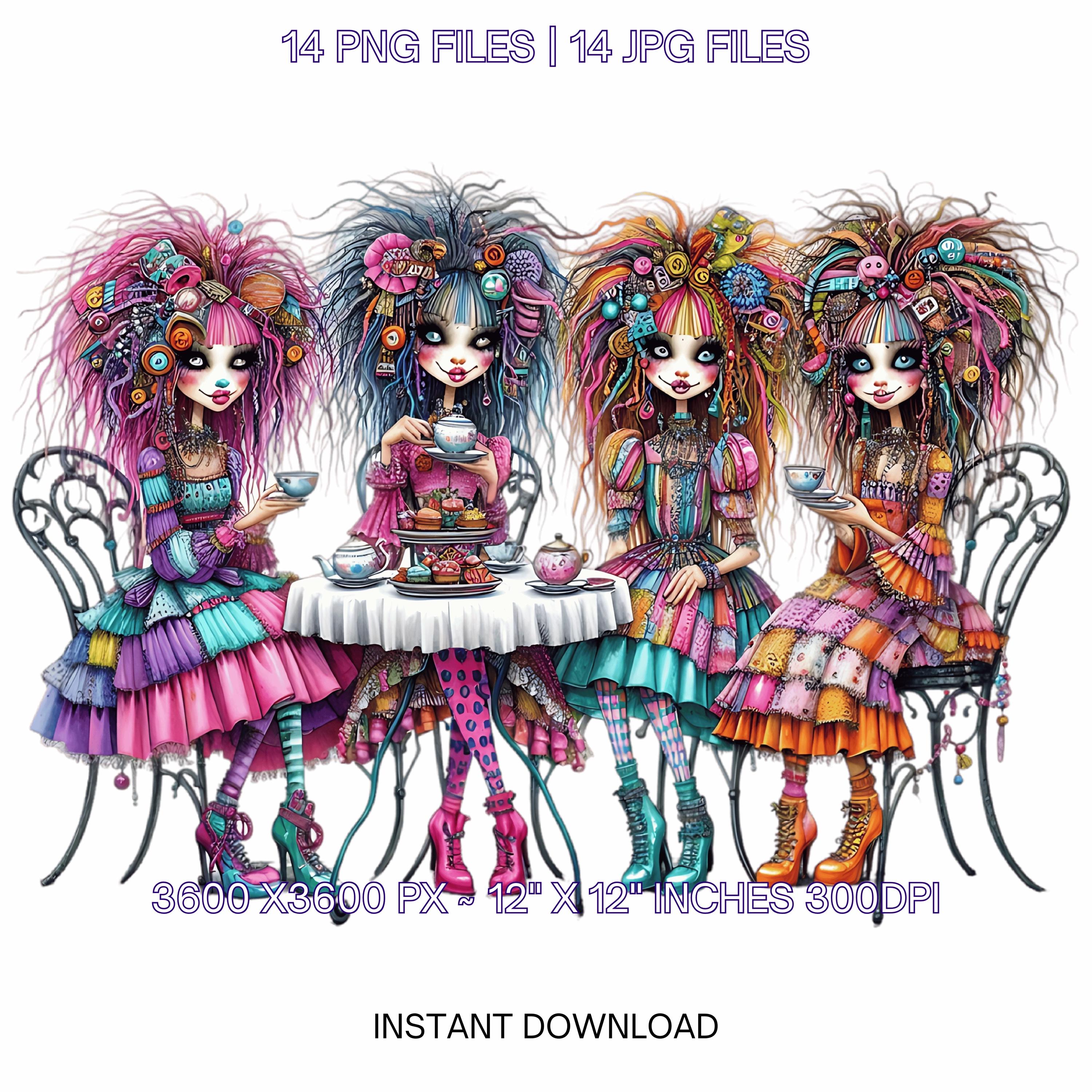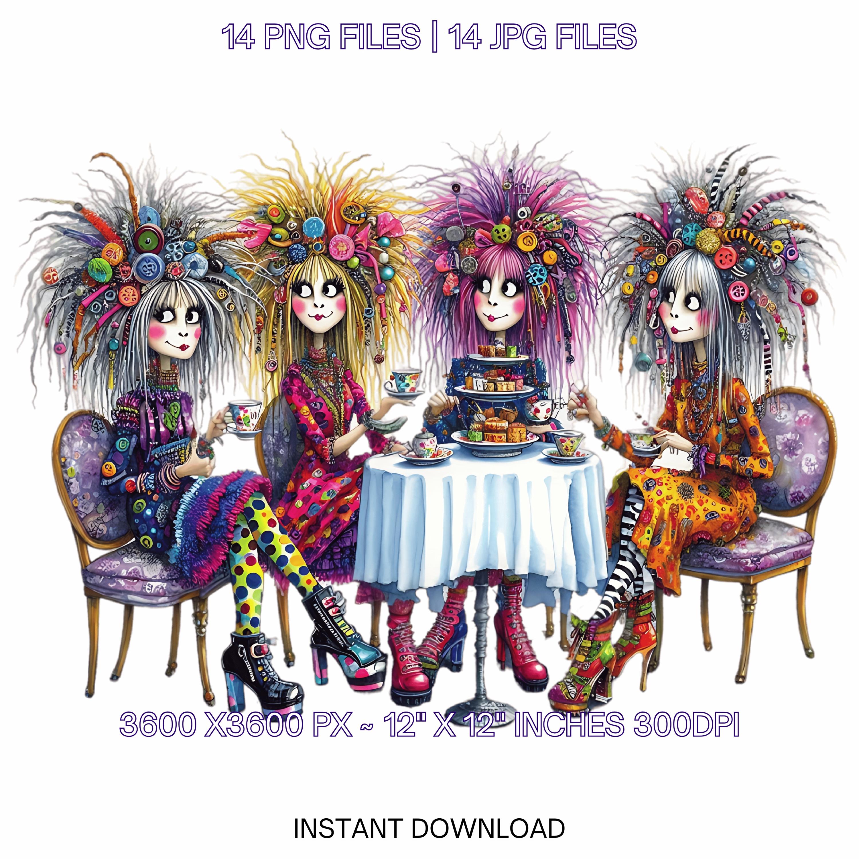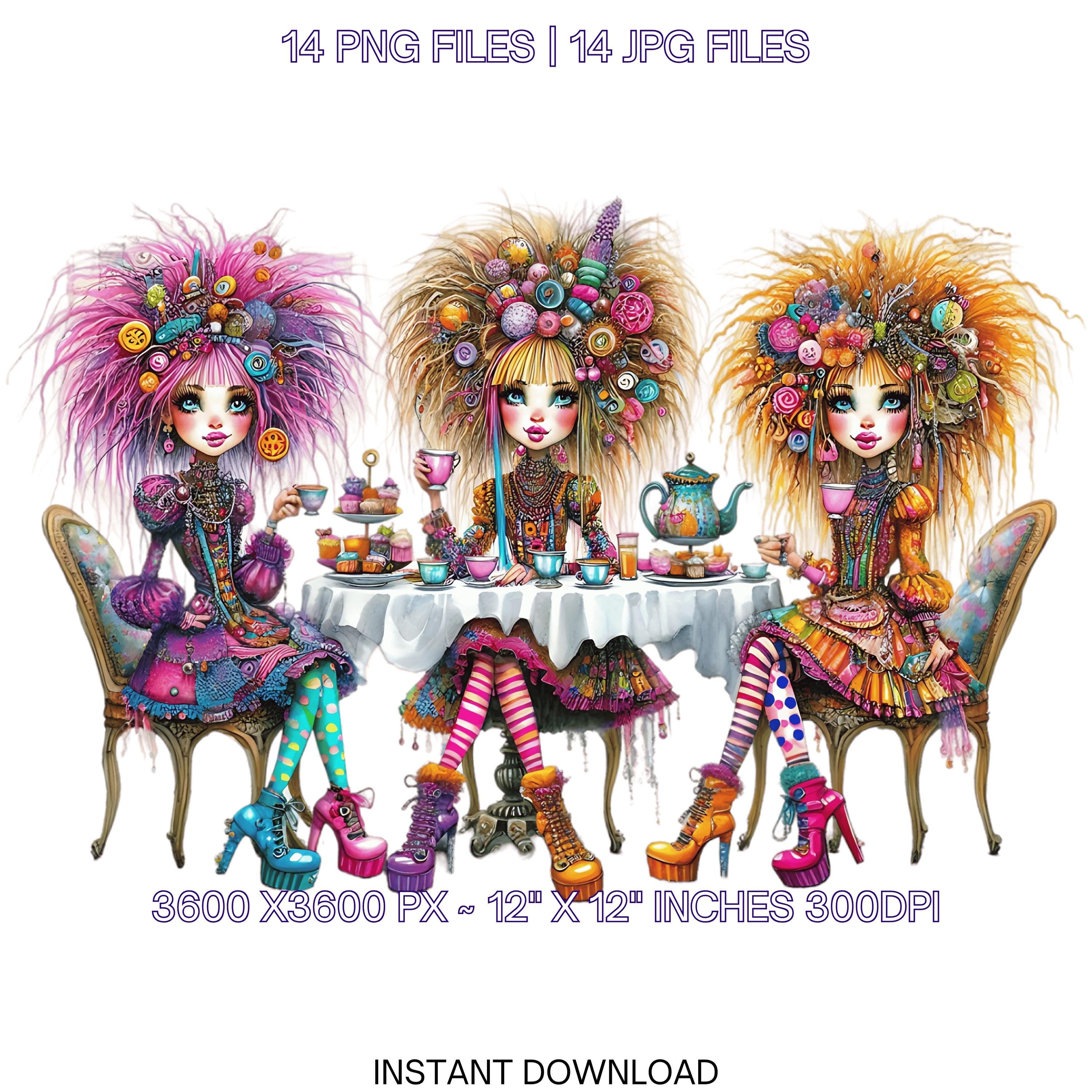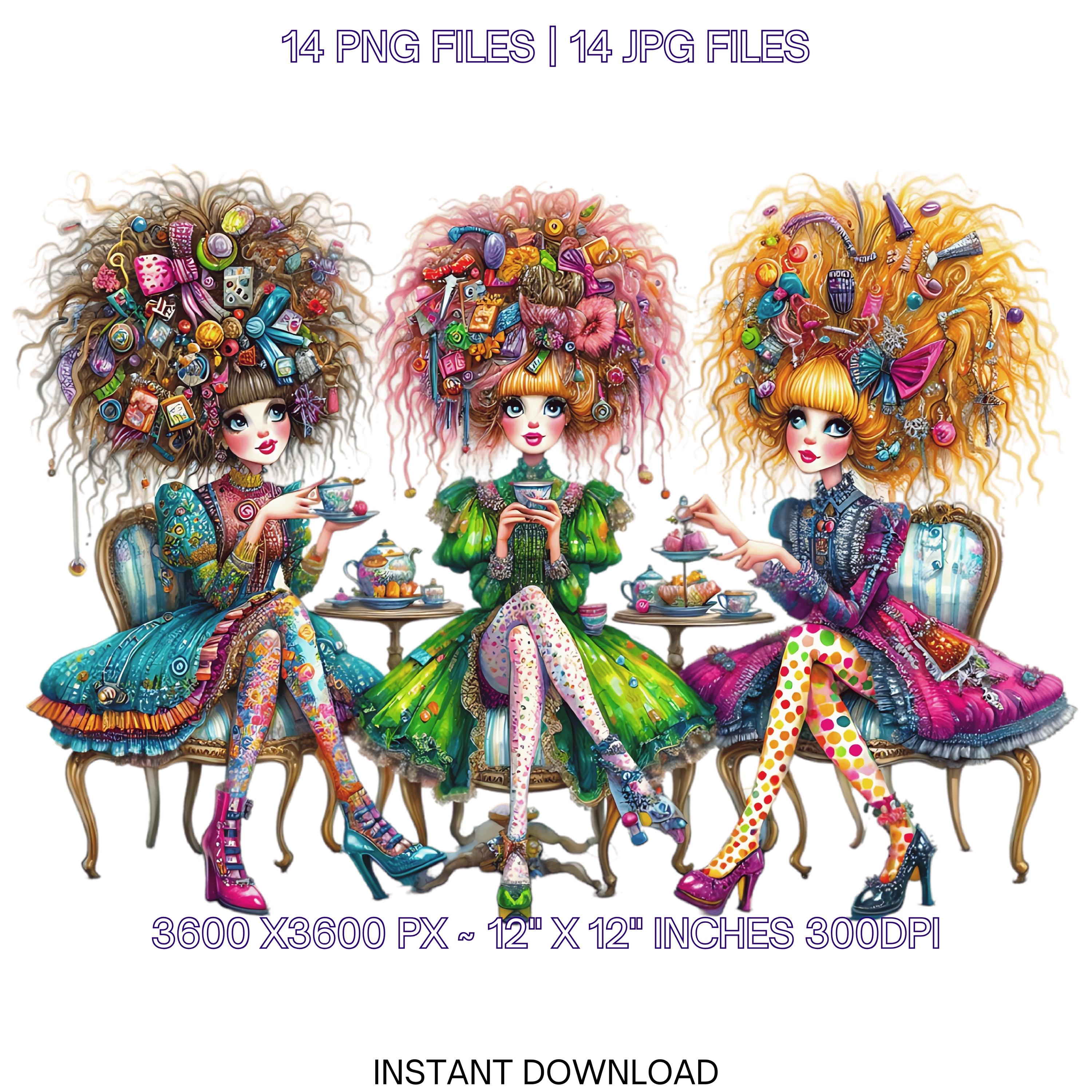 14 Afternoon Tea Quirky Girl Clip Art PNG High Res Watercolor Fantasy, Whimsical Card, Sublimation, Junk Journaling, Scrapbooking Commercial is an eye-catching, high-resolution digital asset designed for creators, crafters, teachers, and small business owners looking to elevate their visuals.