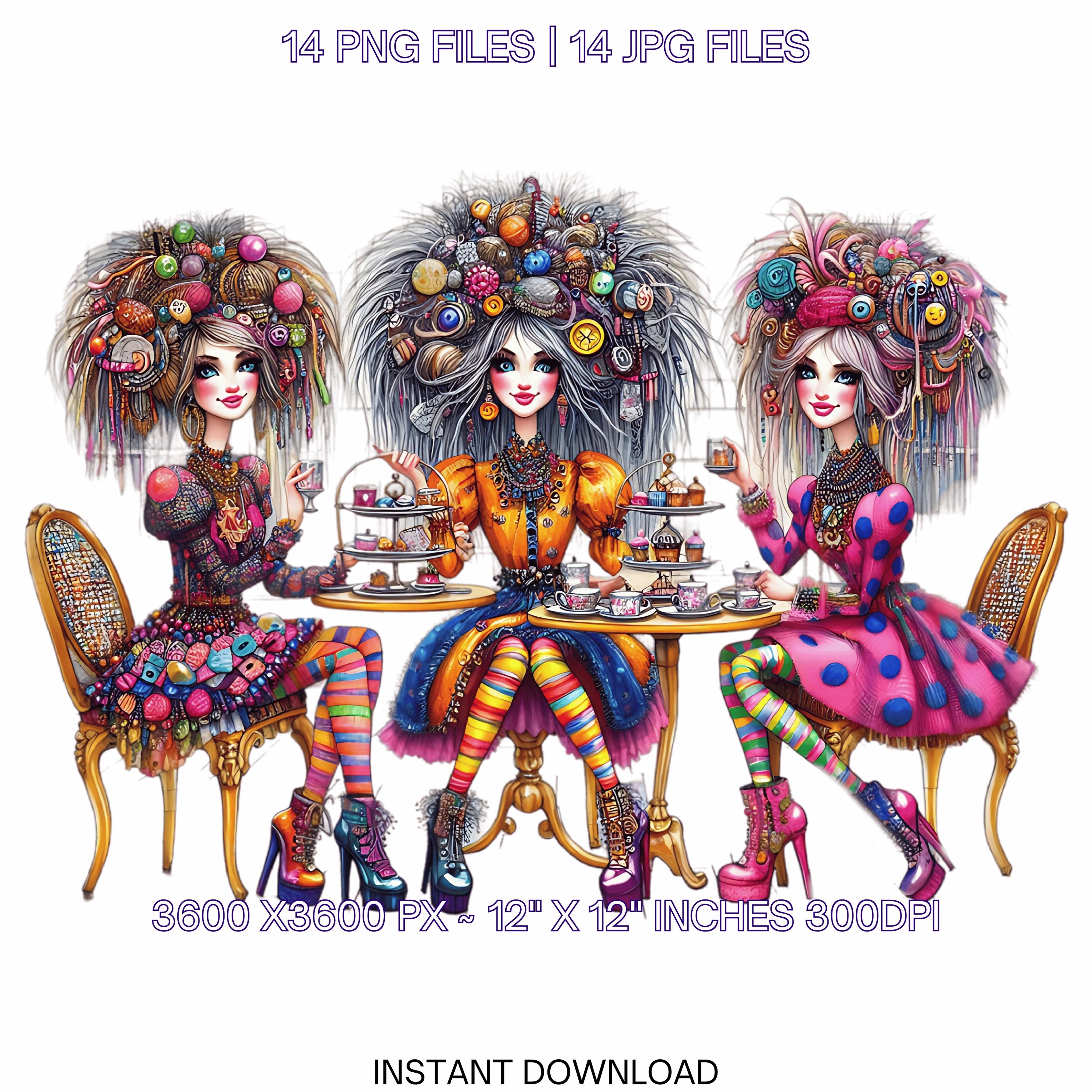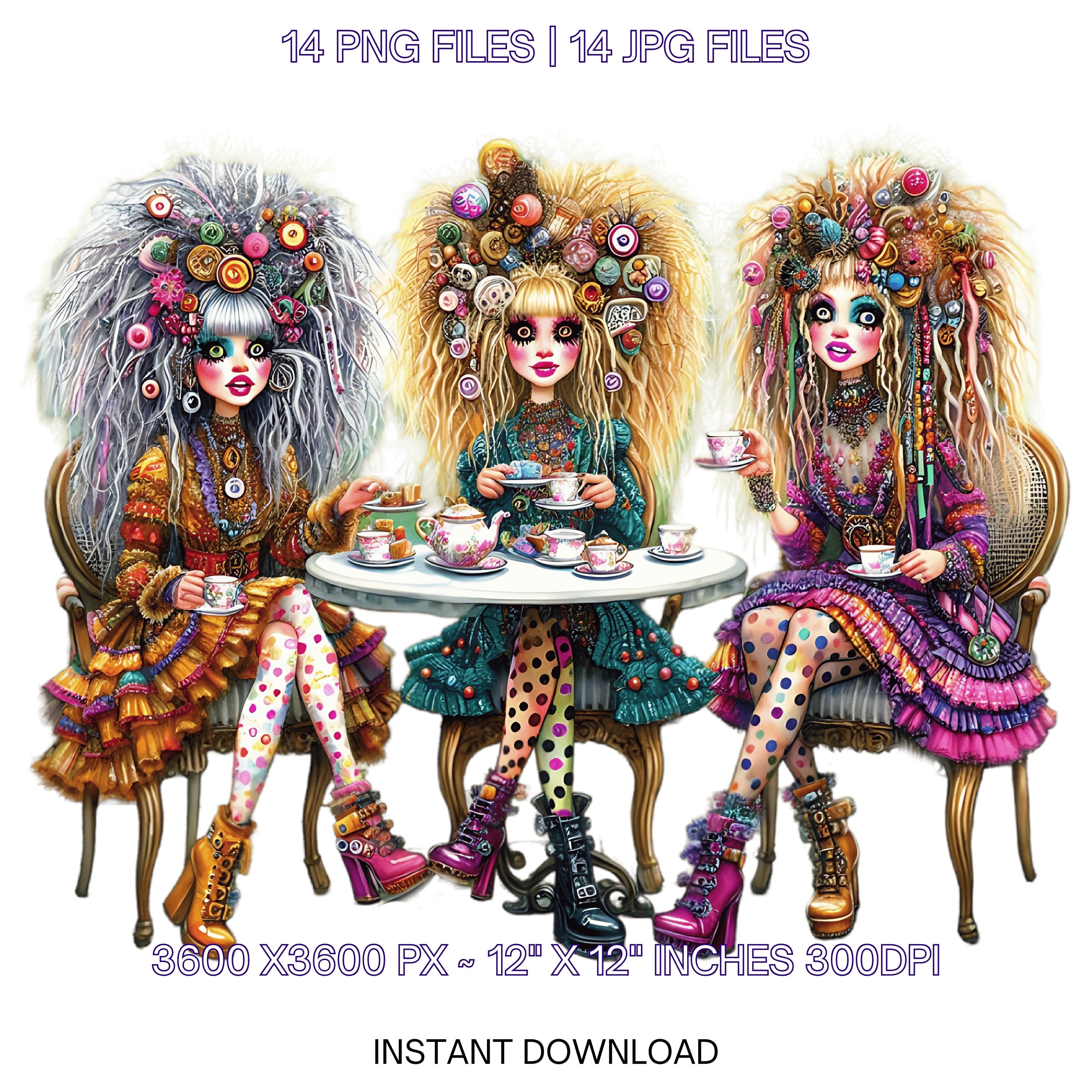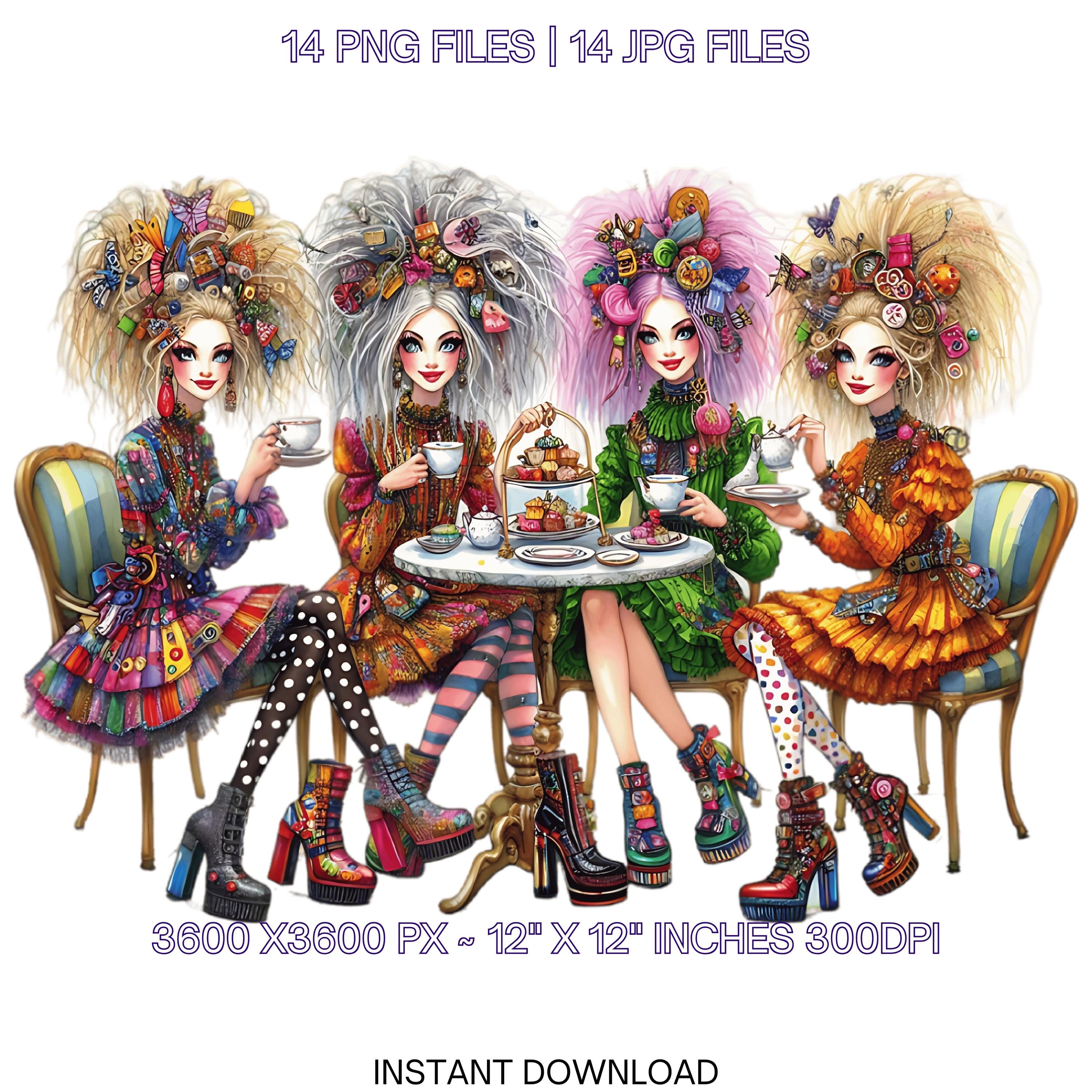 14 Afternoon Tea Quirky Girl Clip Art PNG High Res Watercolor Fantasy, Whimsical for Sublimation, Junk Journaling, Scrapbooking, Card Making, Commercial