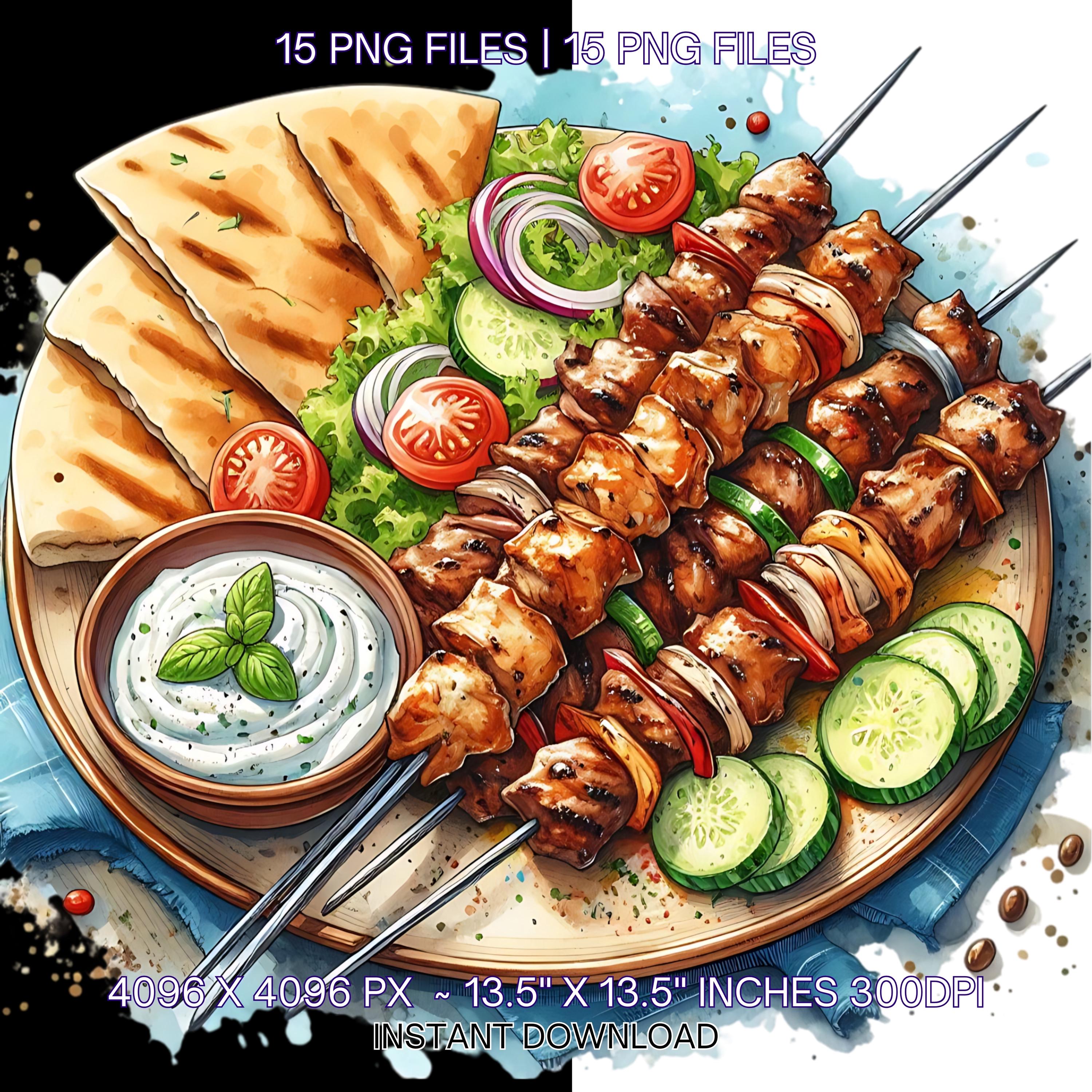 15 Greek Food Illustration PNG | Watercolour Food Transparent Clipart | Greek Salad Souvlaki Gyro Tzatziki Food Stickers JPGs PNGs Commercial Use