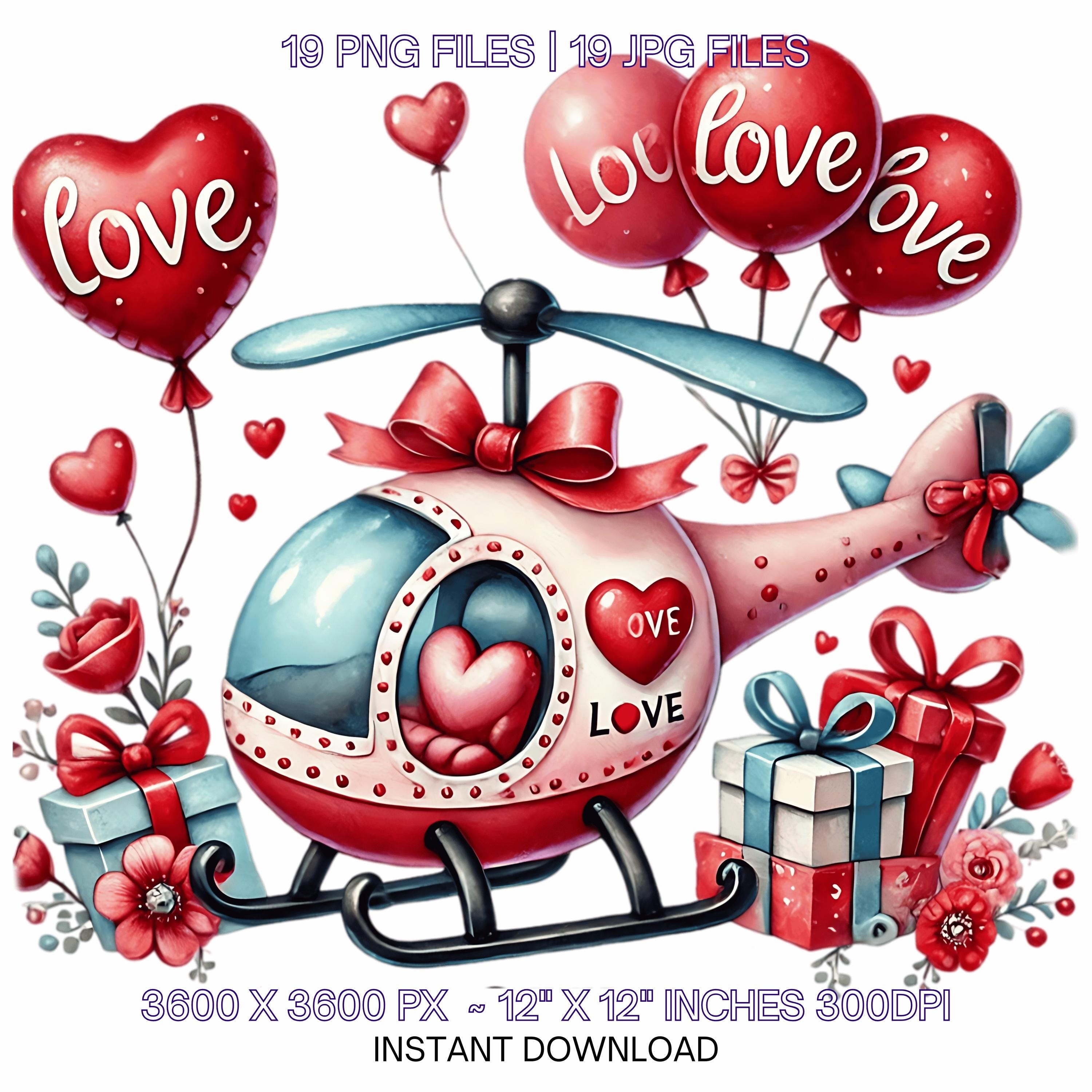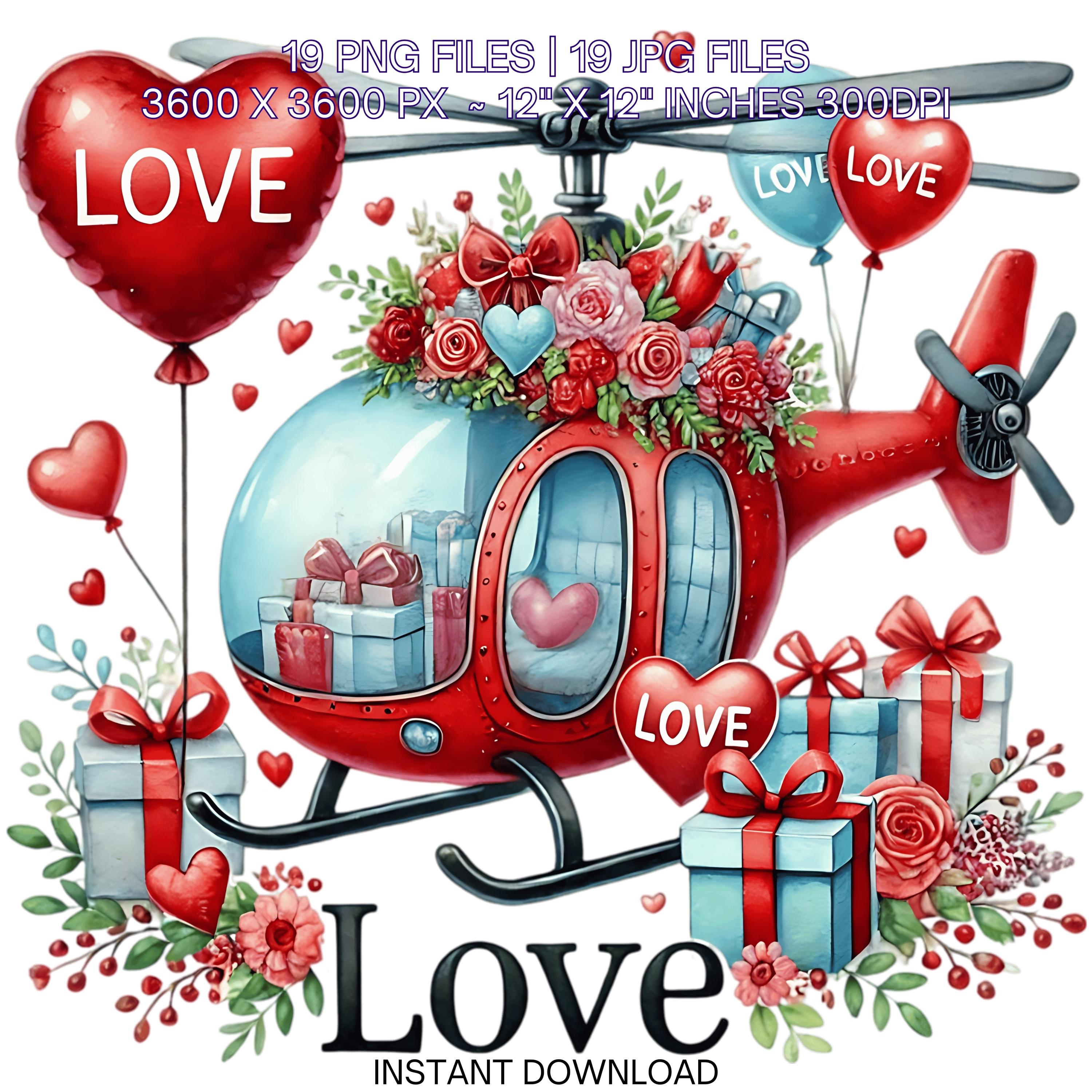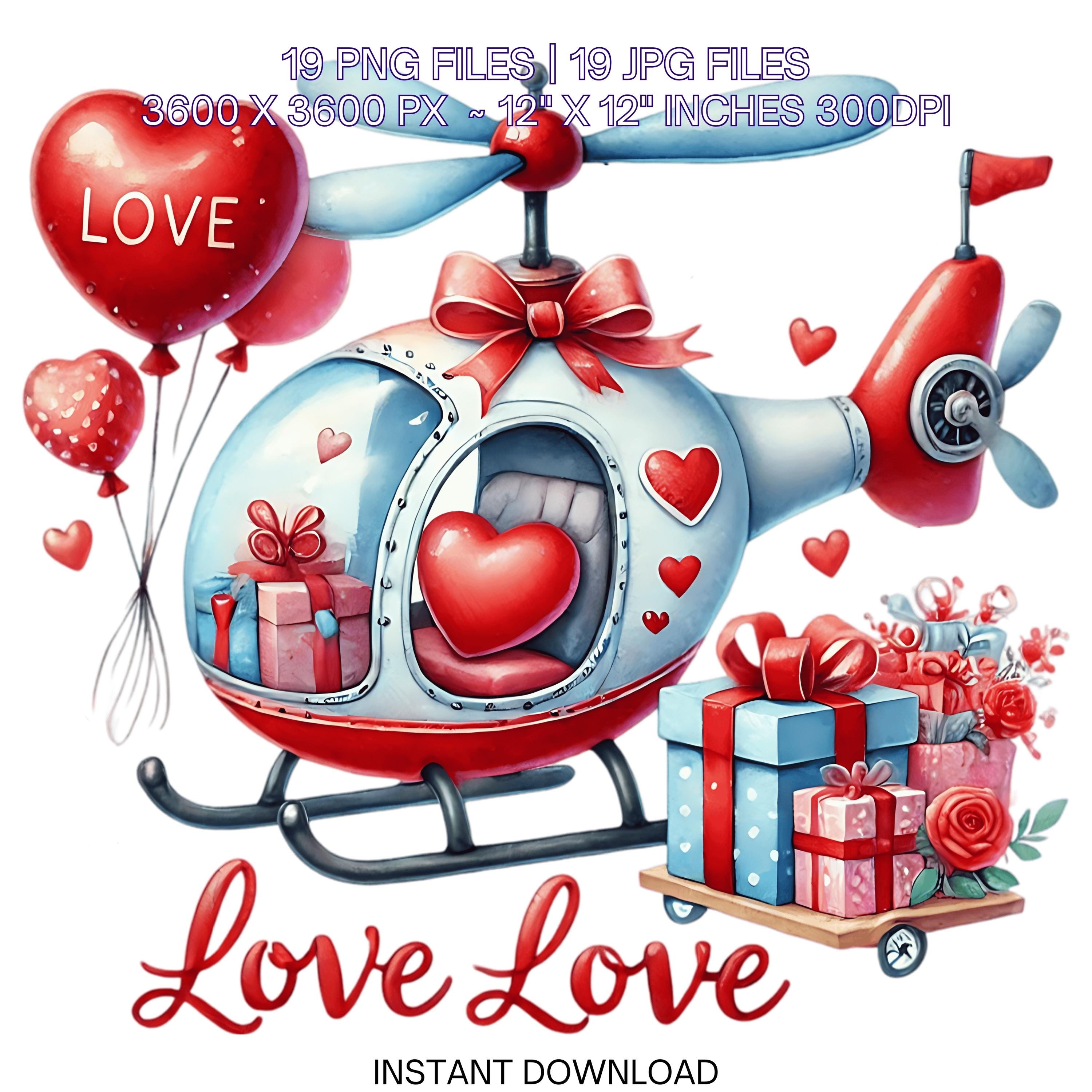 19 Valentine Helicopter Trip with Red Balloons and Gifts PNG Clipart | Lovers Chopper | Watercolor Couple In Love Sublimation Commercial Use is an eye-catching, high-resolution digital asset designed for creators, crafters, teachers, and small business owners looking to elevate their visuals.