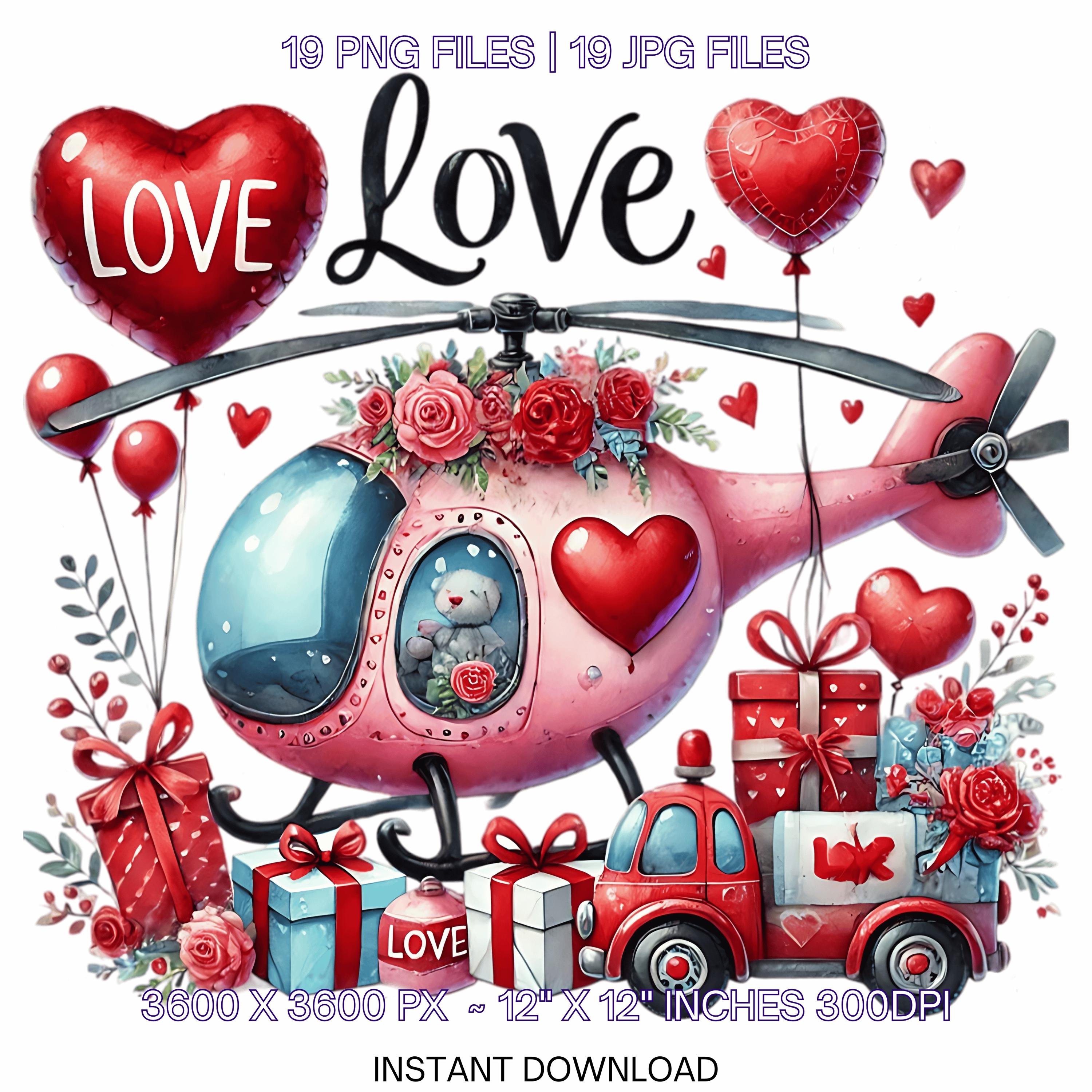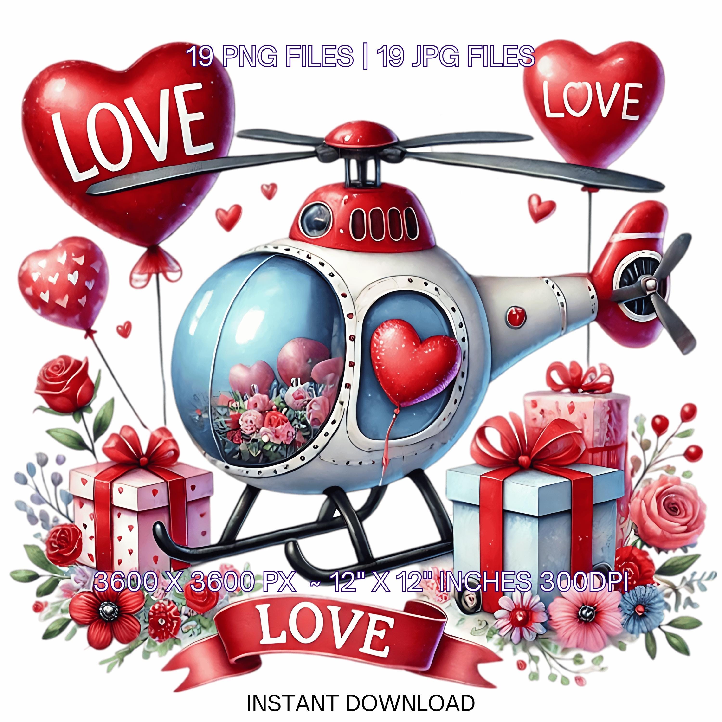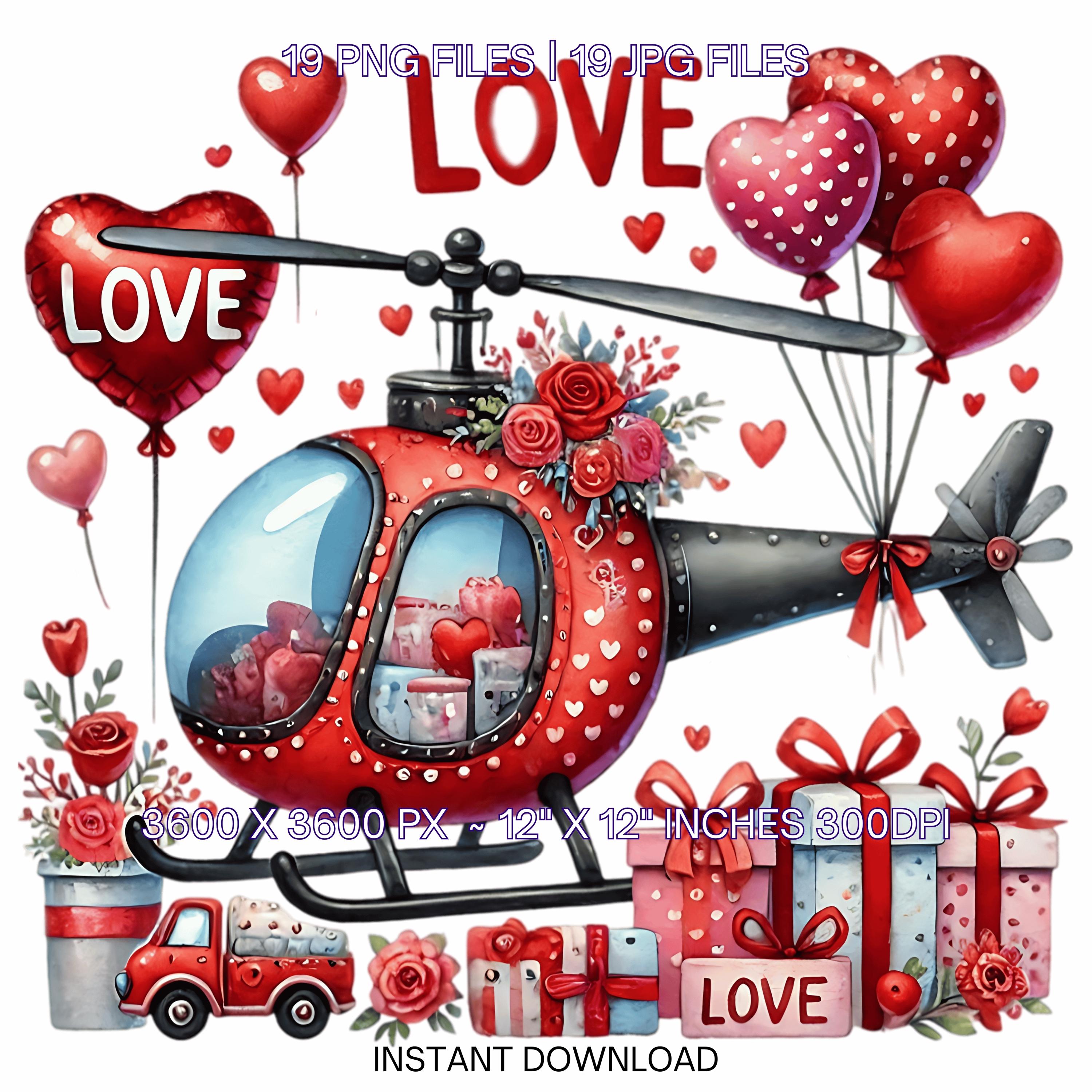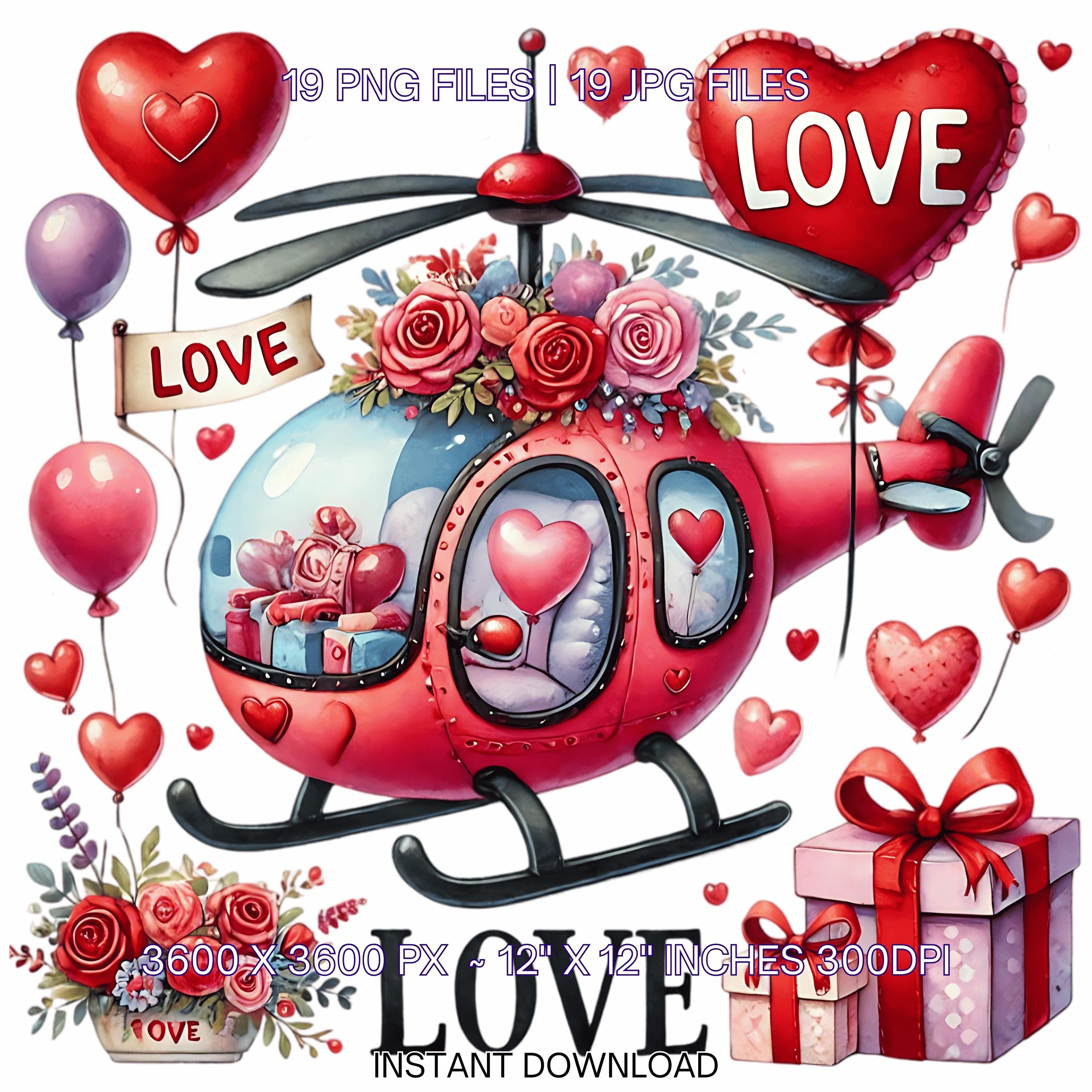 19 Valentine Helicopter Trip with Red Balloons and Gifts PNG Clipart | Lovers Chopper | Watercolor Couple In Love Sublimation Commercial Use is an eye-catching, high-resolution digital asset designed for creators, crafters, teachers, and small business owners looking to elevate their visuals.