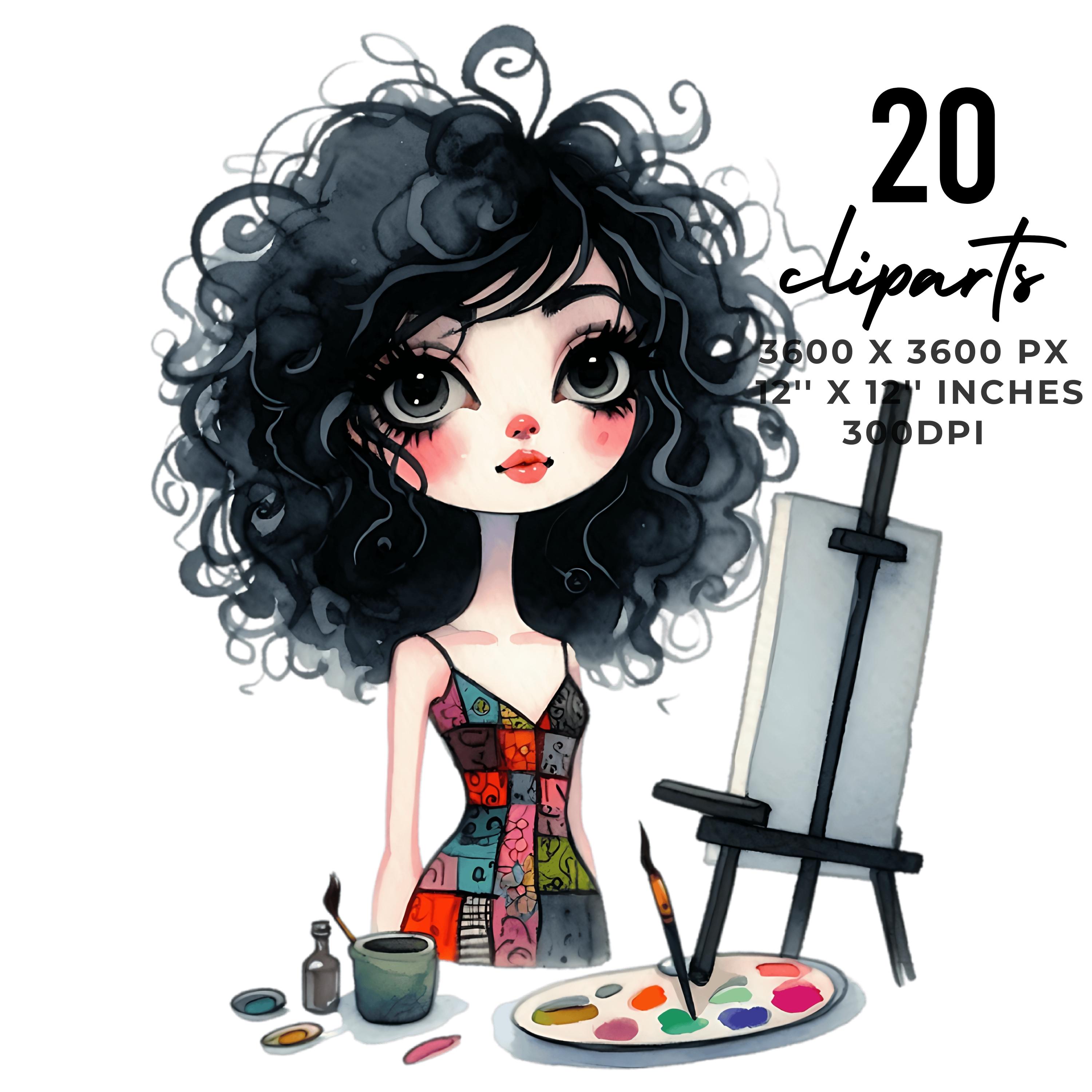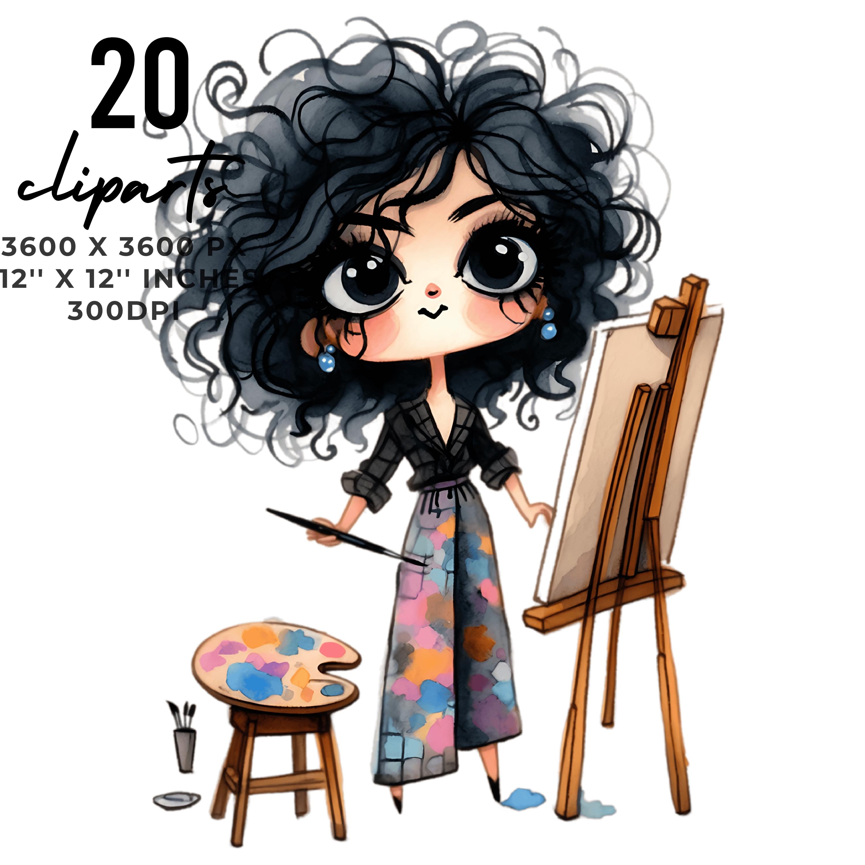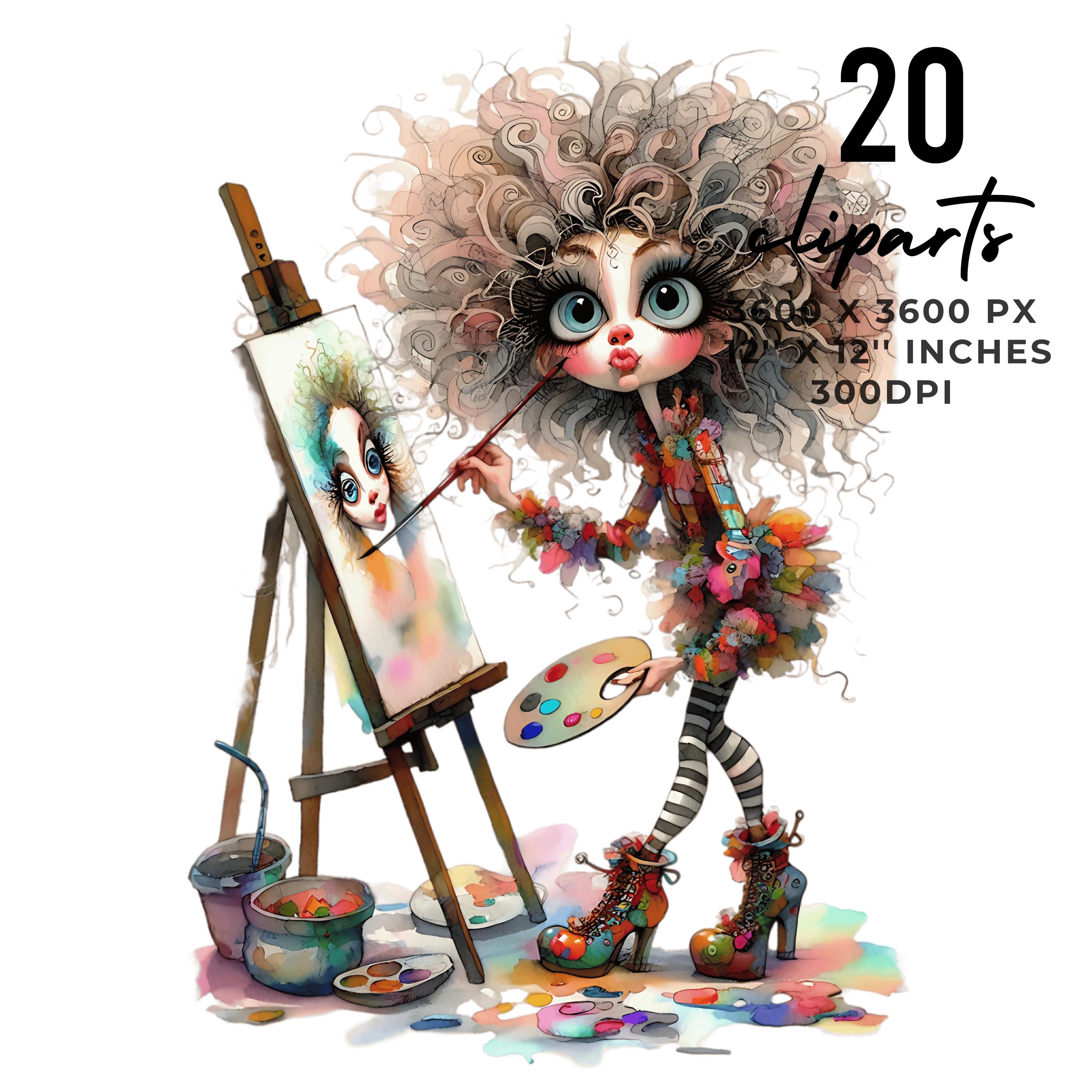 20 A quirky woman painting energetically at her easel | Whimsical Quirky messy curls Girl stands at her easel Clip Art PNG Commercial Use is an eye-catching, high-resolution digital asset designed for creators, crafters, teachers, and small business owners looking to elevate their visuals.