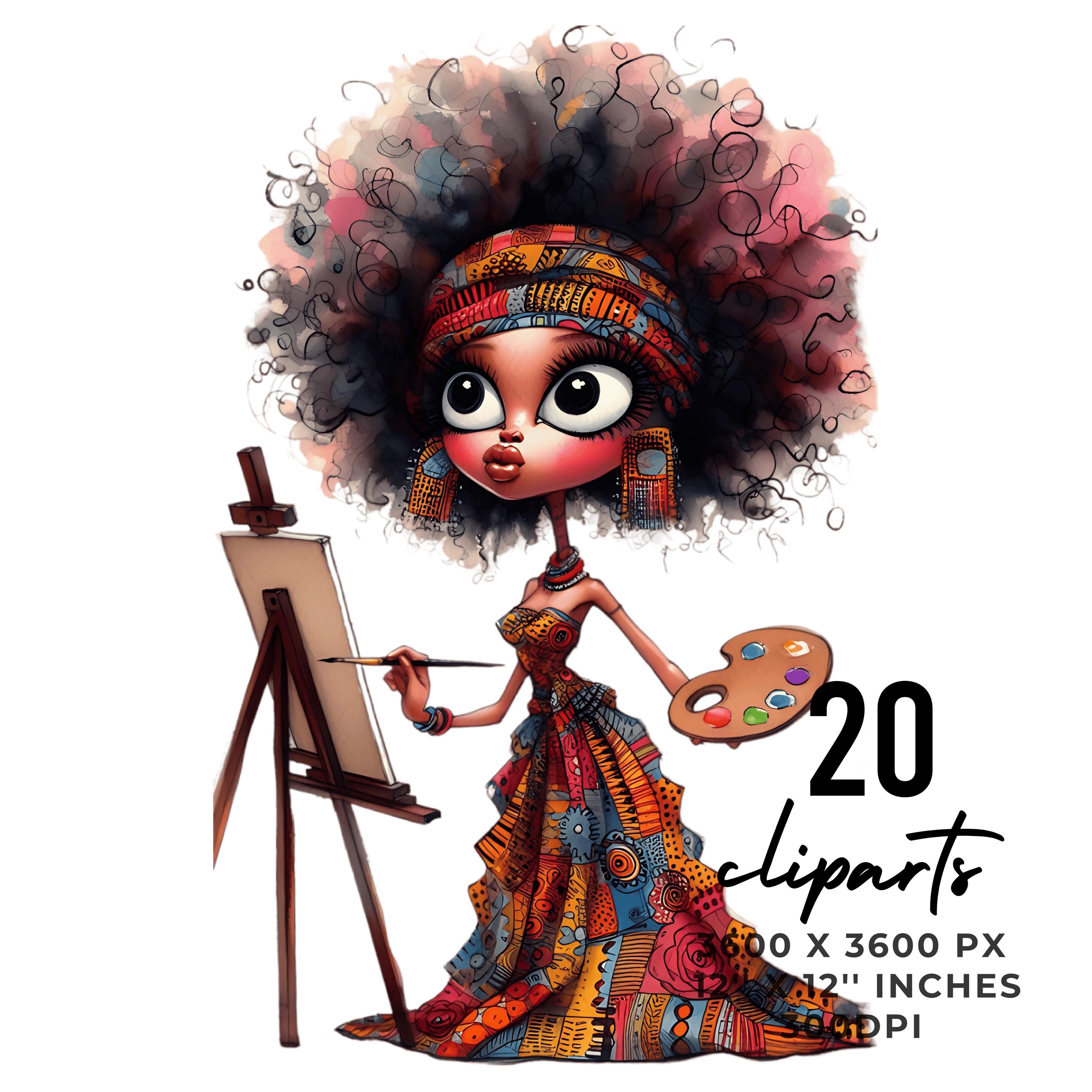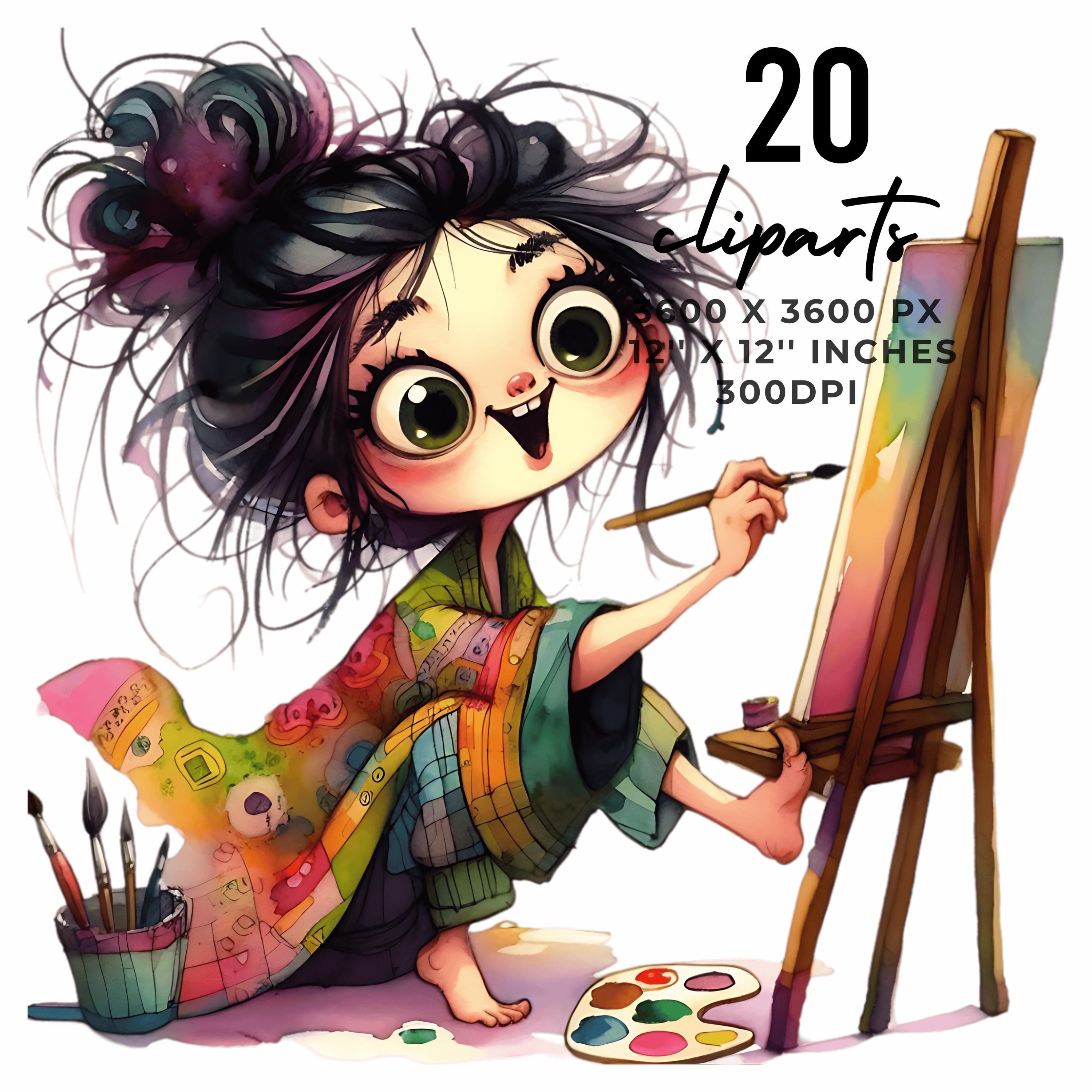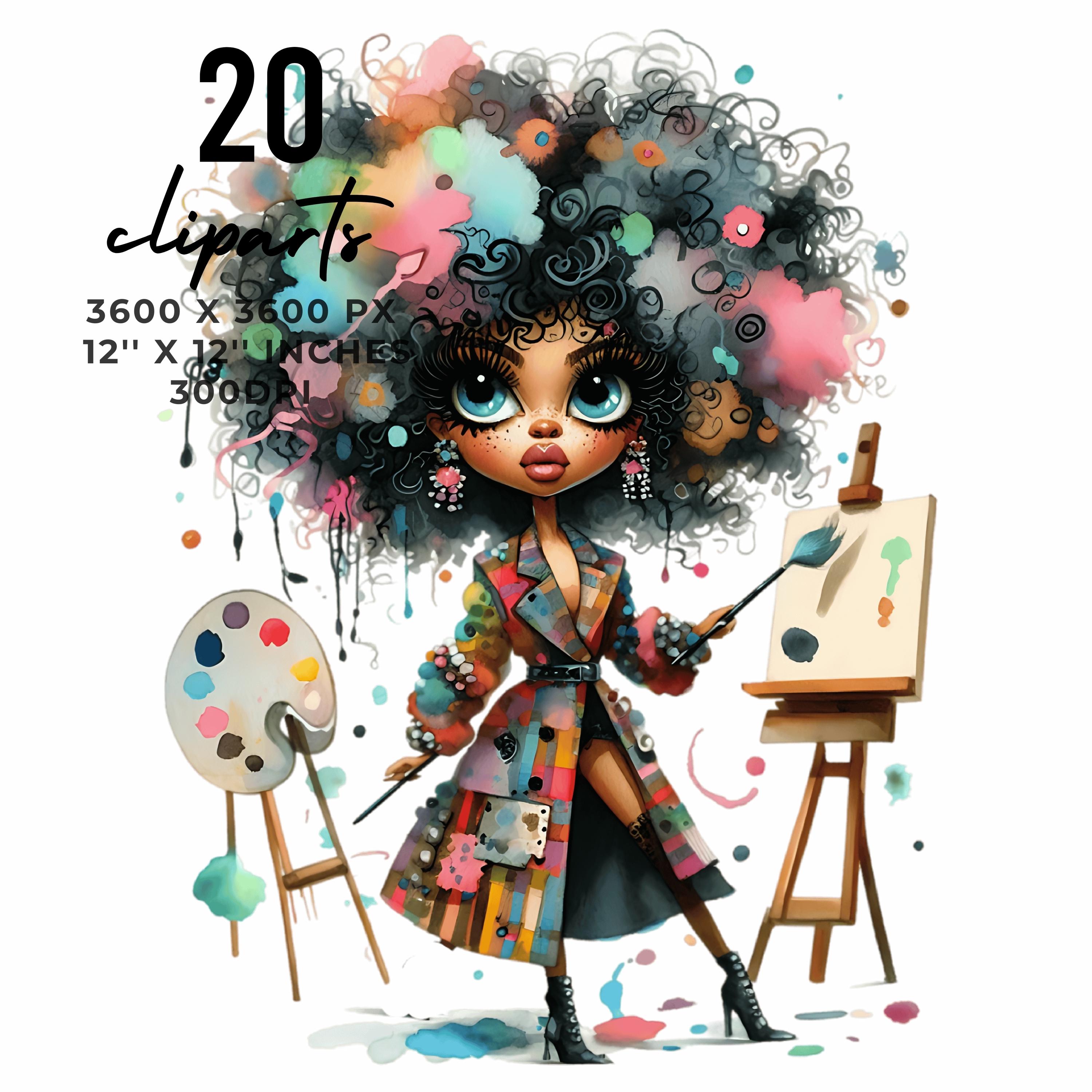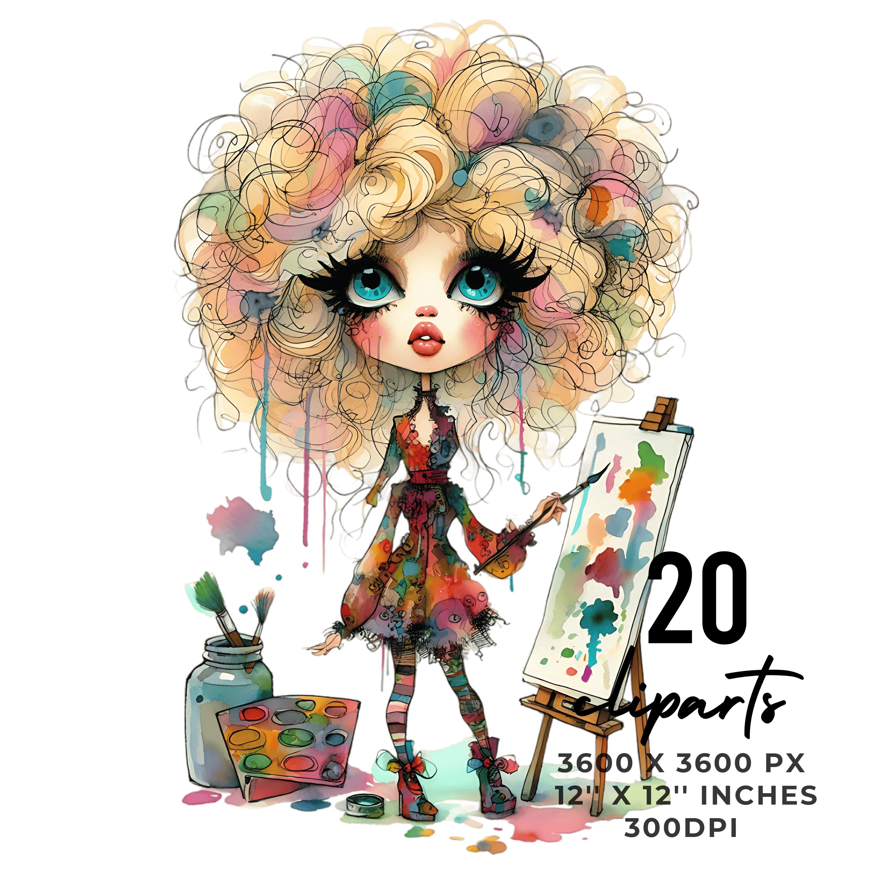 20 A quirky woman painting energetically at her easel | Whimsical Quirky messy curls Girl stands at her easel Clip Art PNG Commercial Use is an eye-catching, high-resolution digital asset designed for creators, crafters, teachers, and small business owners looking to elevate their visuals.