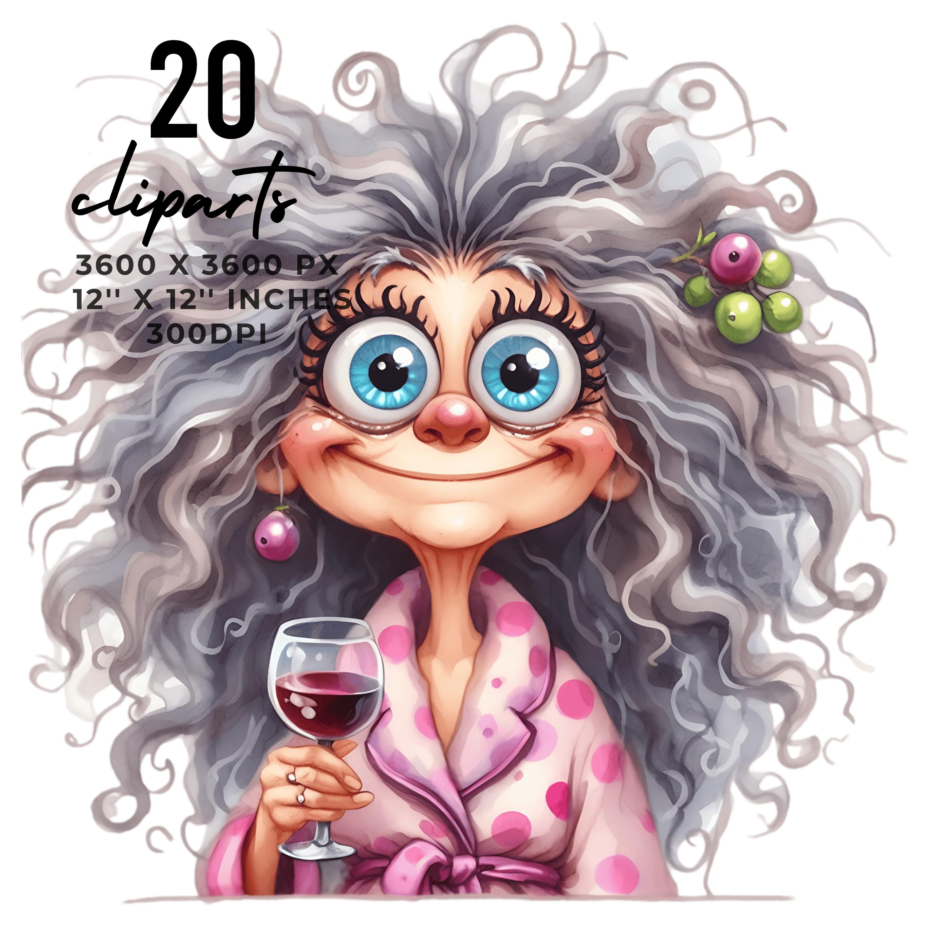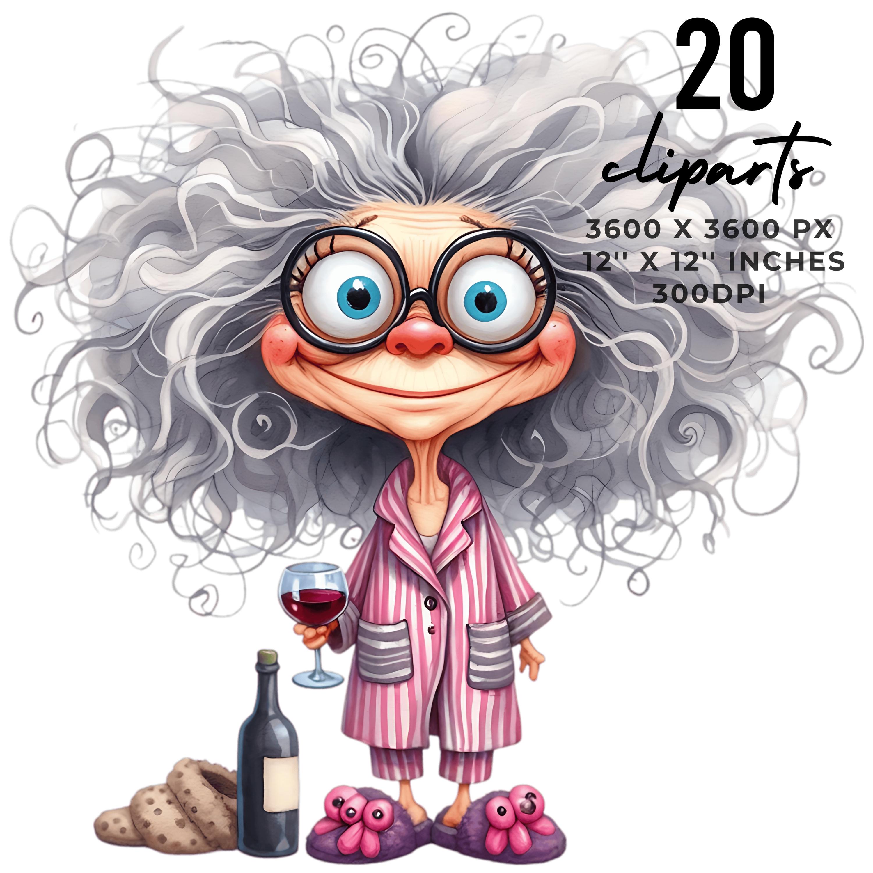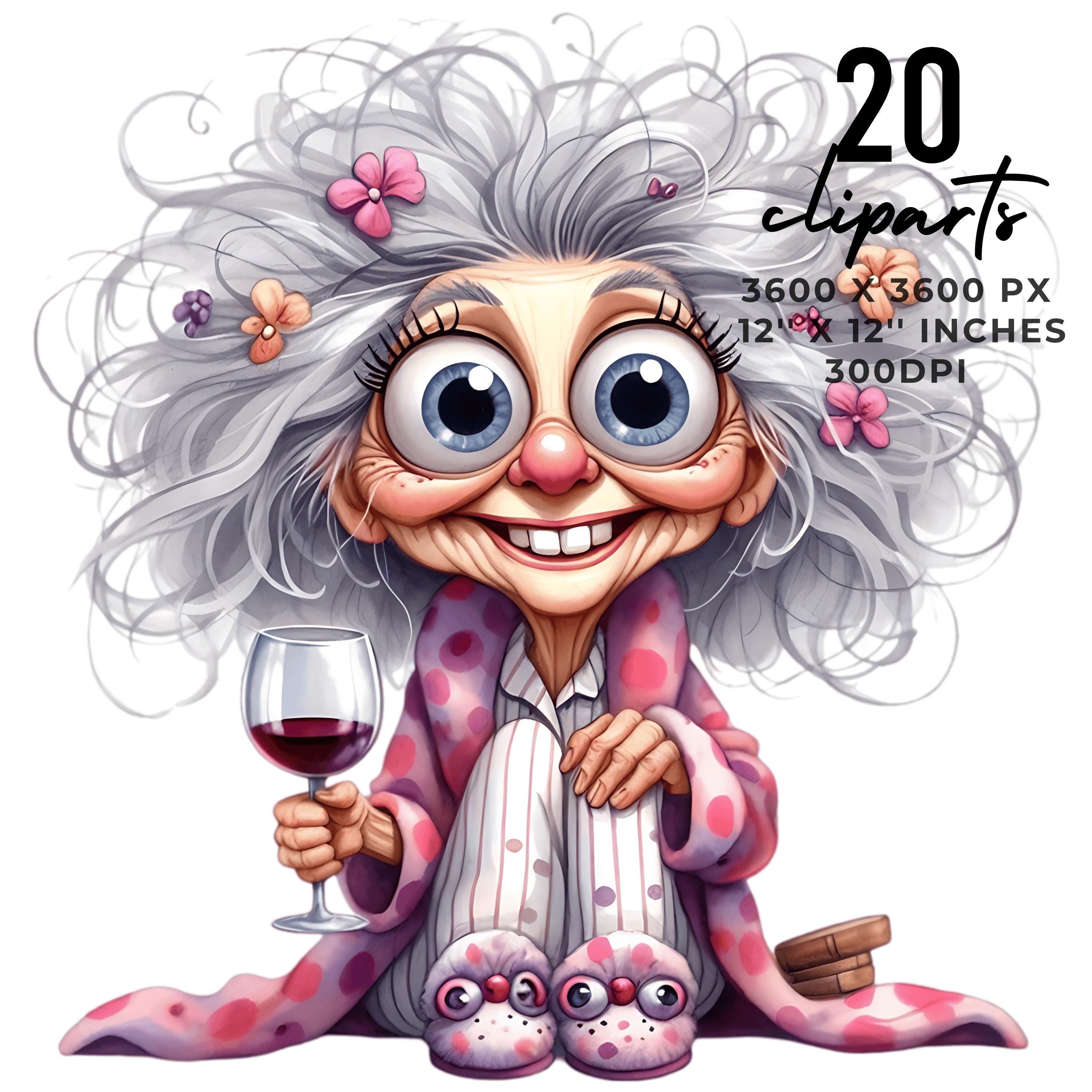 20 Crazy Grandma in Pijama Drinking Wine PNG Clipart | Funny Old Ladies | Cute Cartoon White Grandma | Happy Woman Sublimation Commercial Use