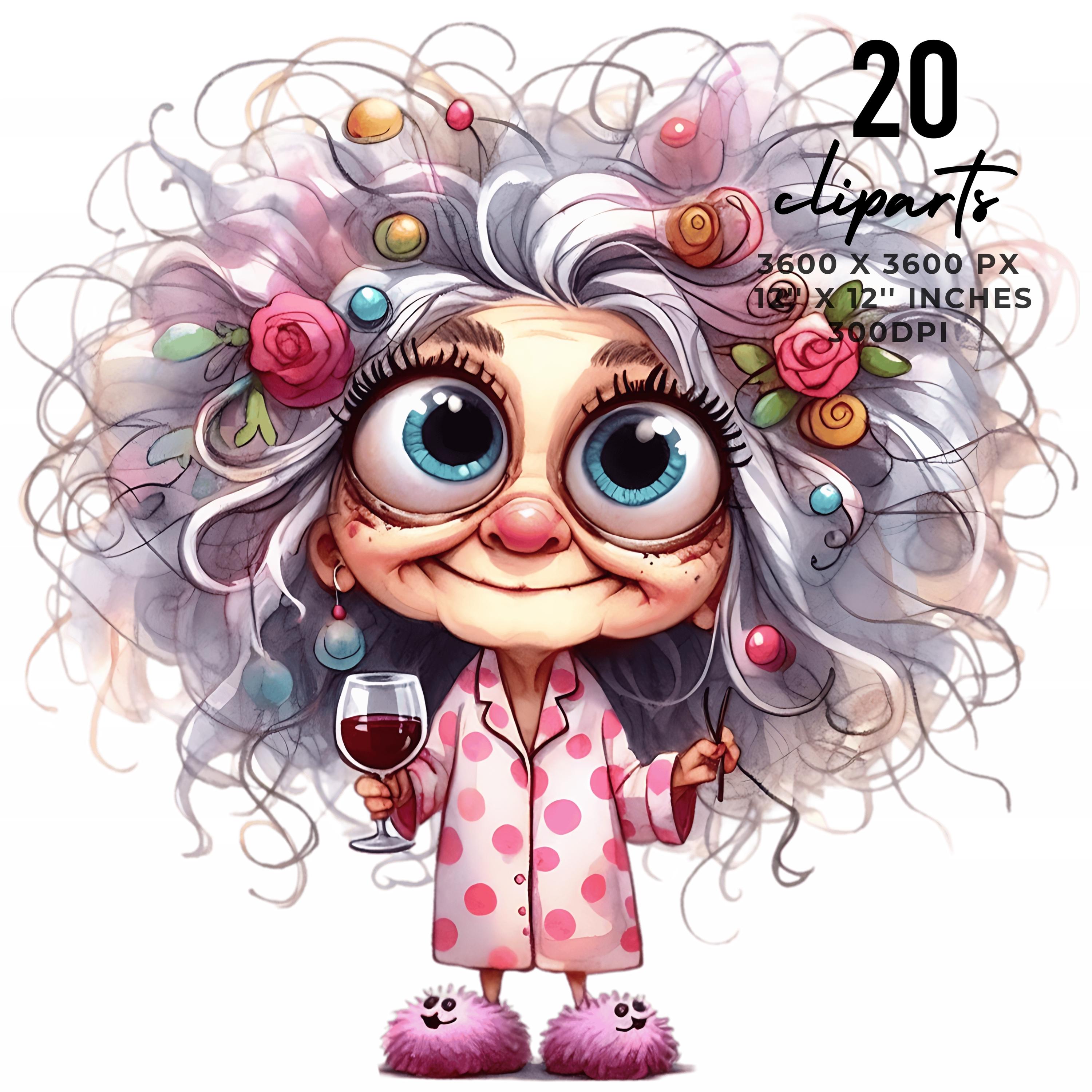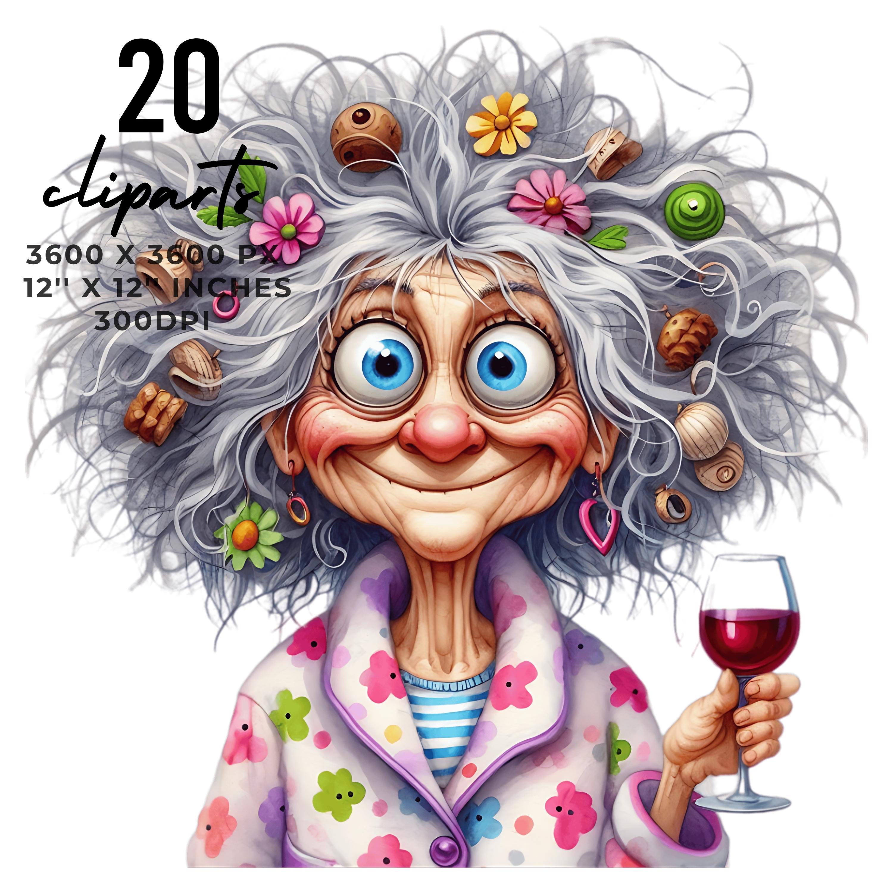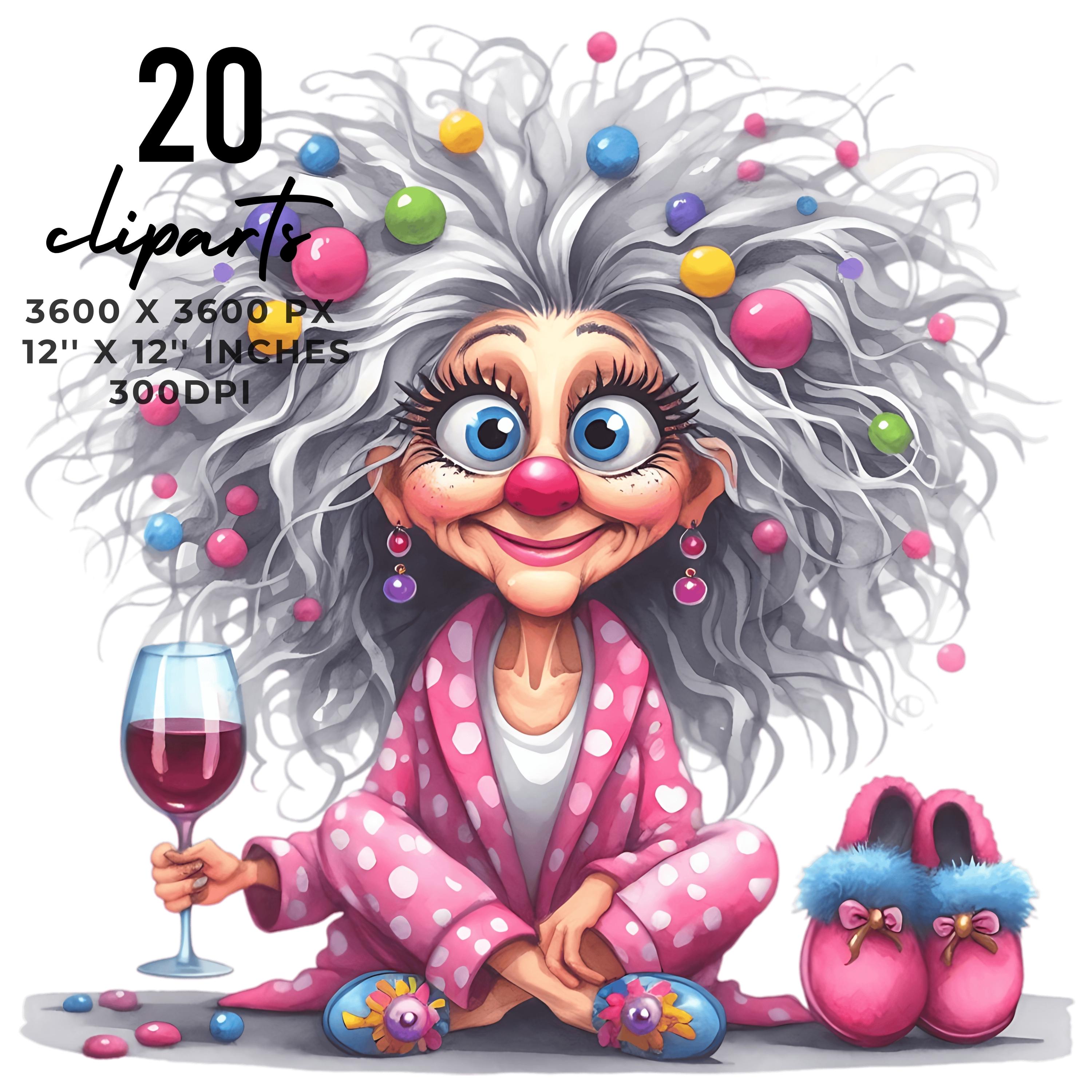 20 Crazy Grandma in Pijama Drinking Wine PNG Clipart | Funny Old Ladies | Cute Cartoon White Grandma | Happy Woman Sublimation Commercial Use