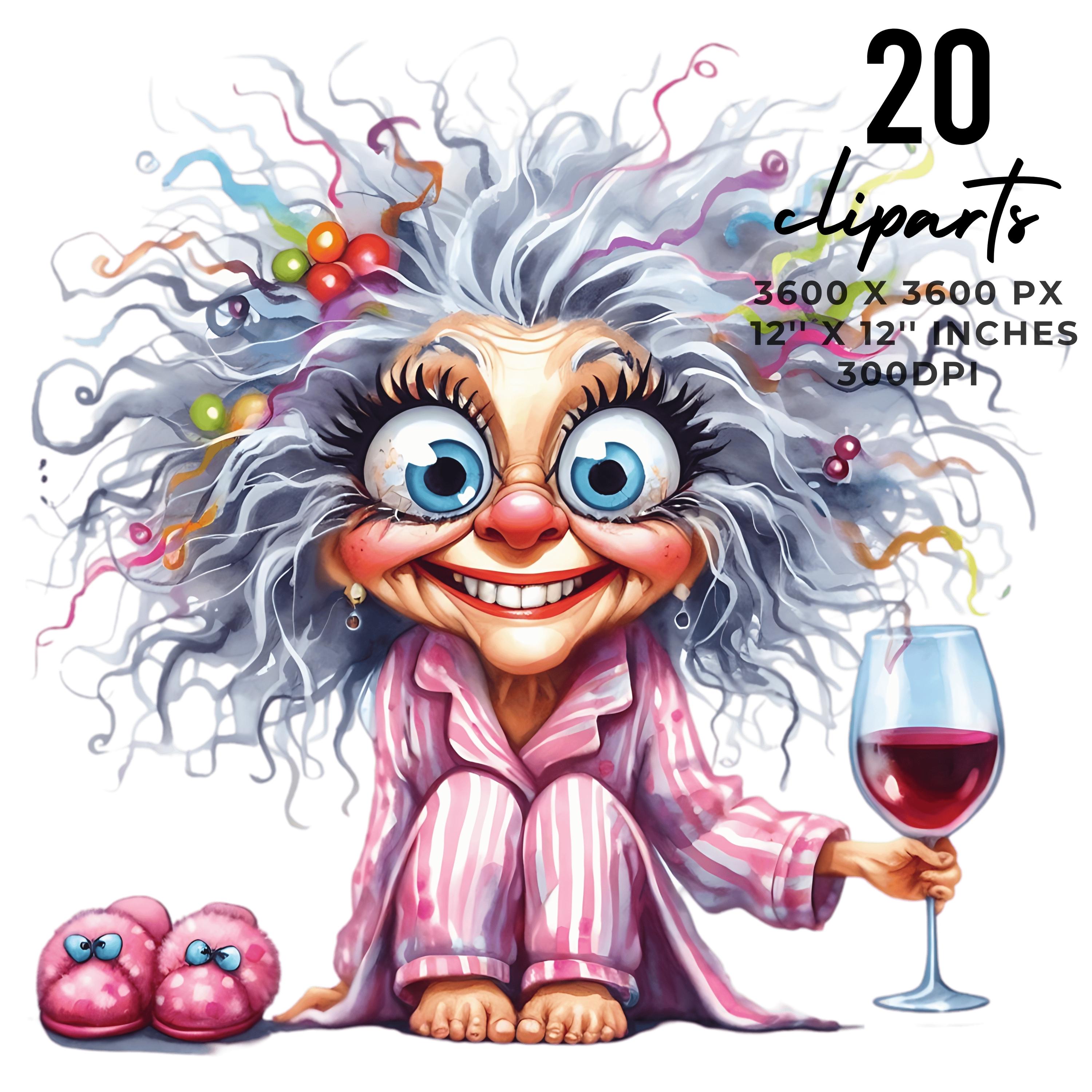 20 Crazy Grandma in Pijama Drinking Wine PNG Clipart | Funny Old Lady | Cute Cartoon White Grandma | Happy Woman Sublimation Commercial Use is an eye-catching, high-resolution digital asset designed for creators, crafters, teachers, and small business owners looking to elevate their visuals.
