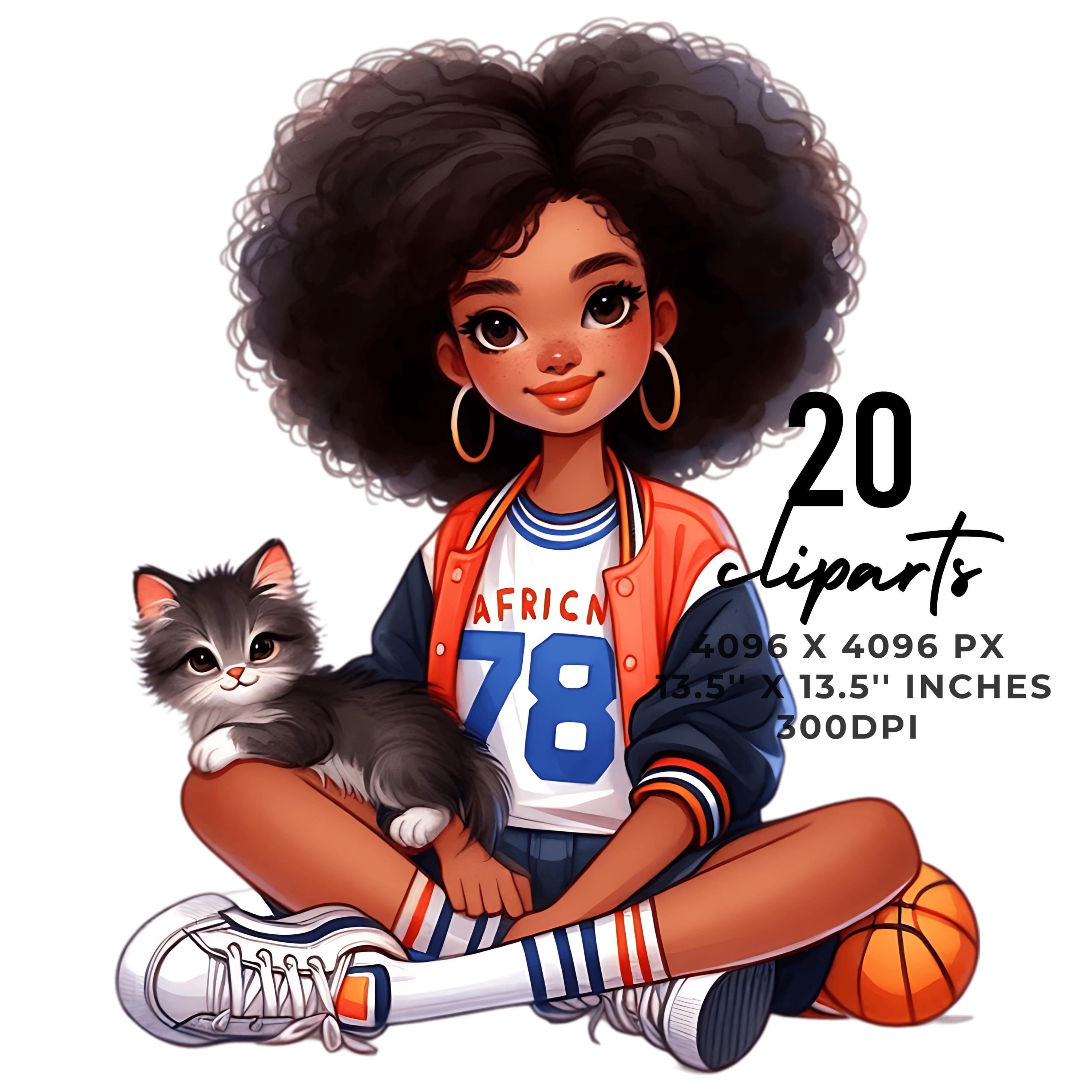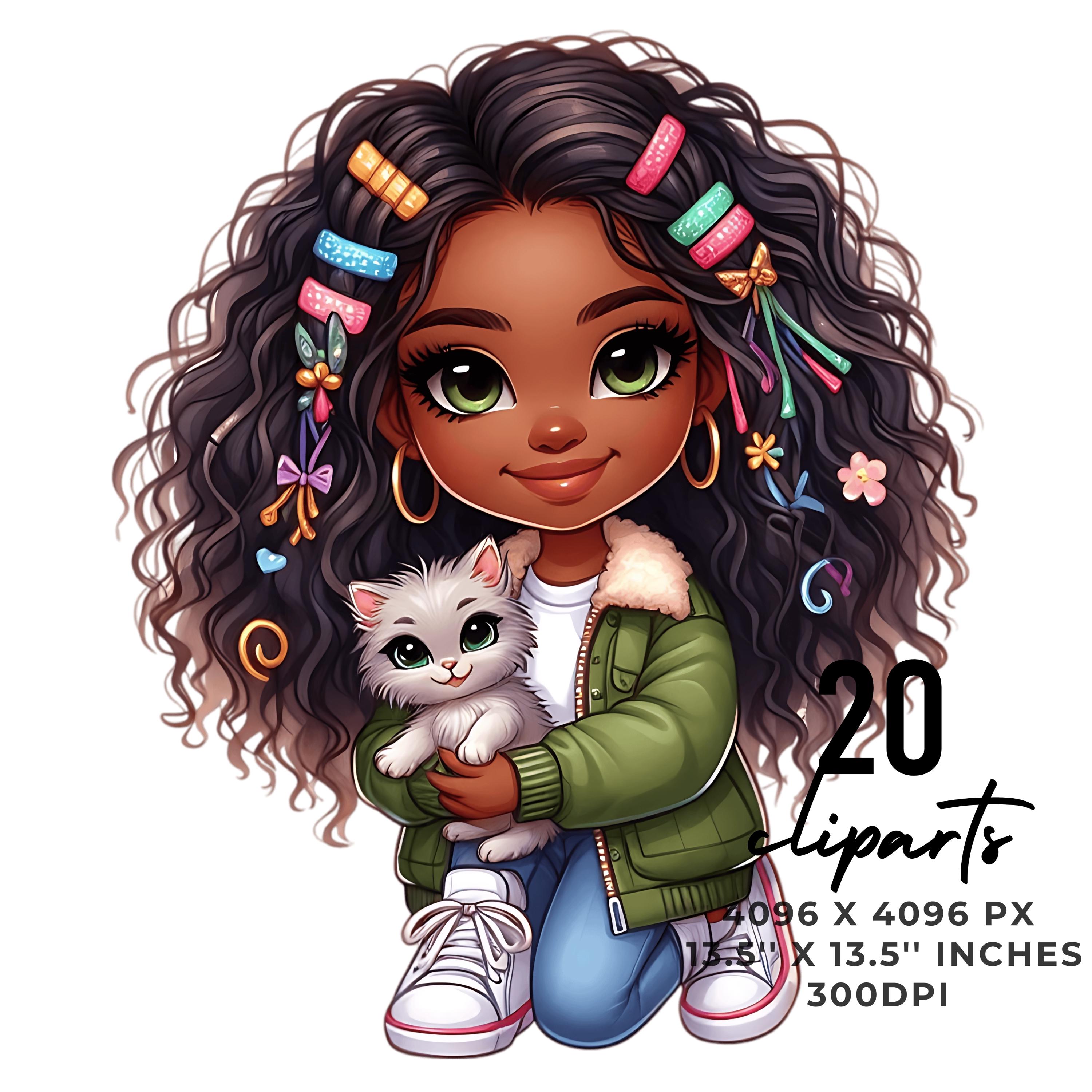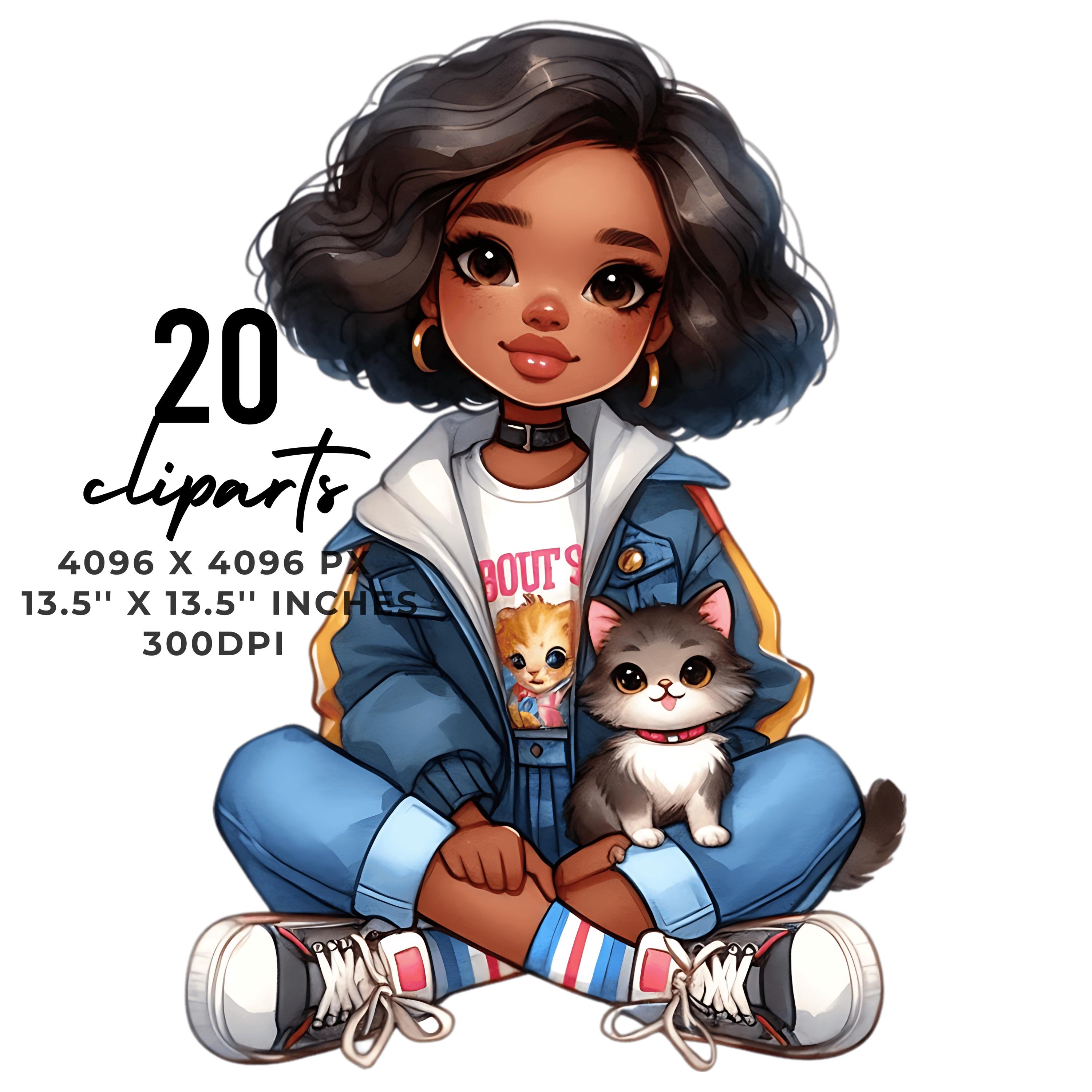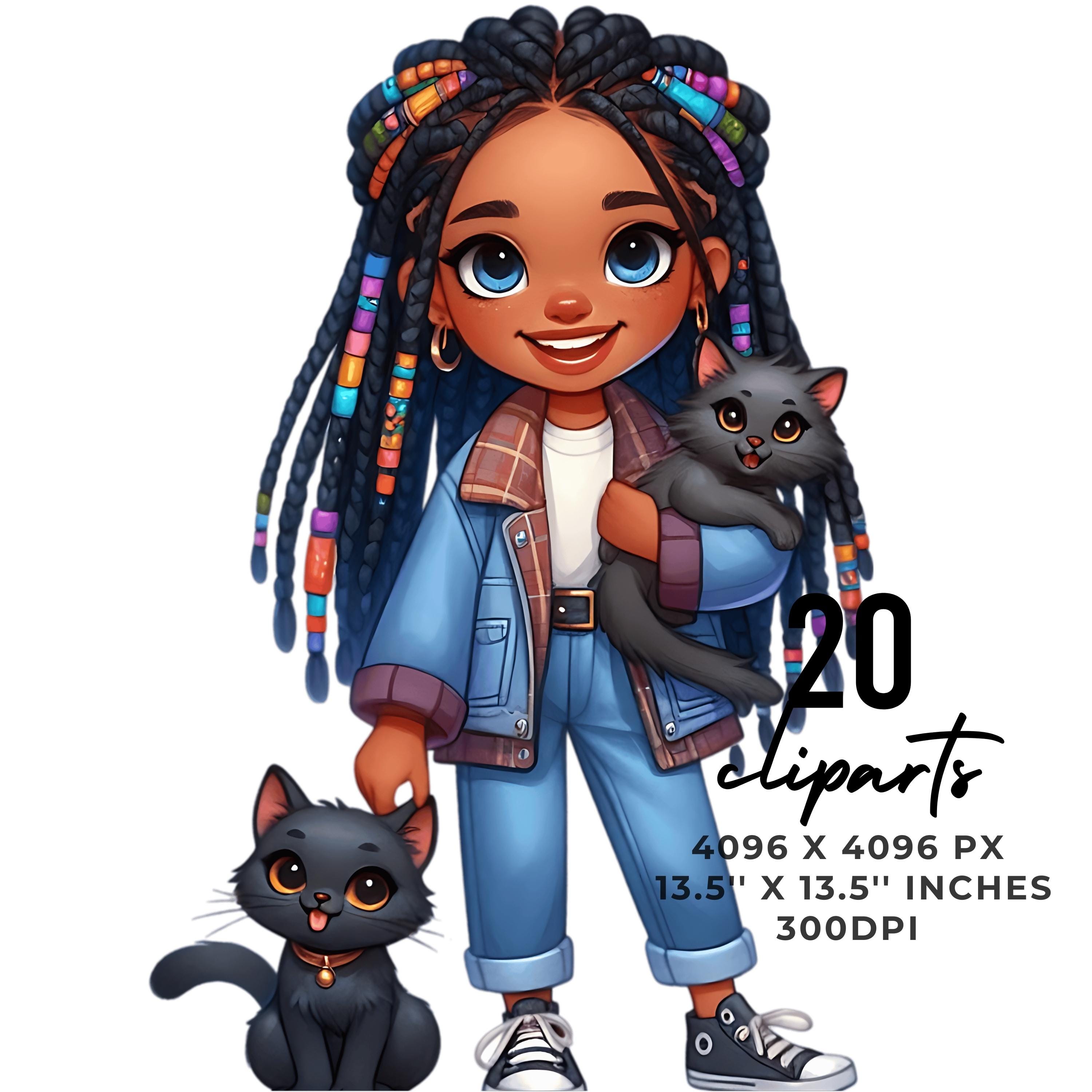 20 Quirky Girl Clipart | Quirky Black Girl with Pet PNG | Whimsical Ephemera Watercolor Girl Holding Cat | Junk Journal Paper Commercial Use
