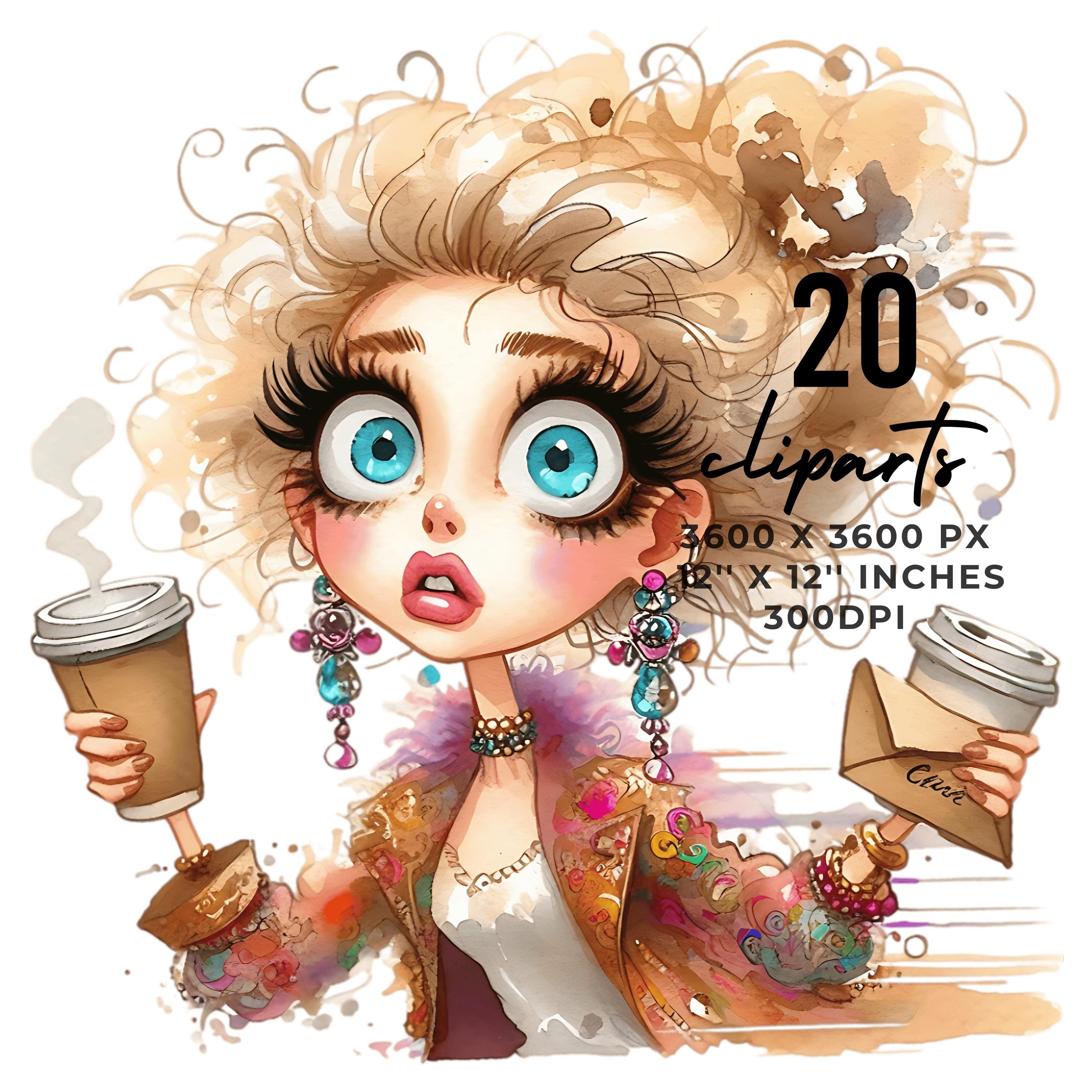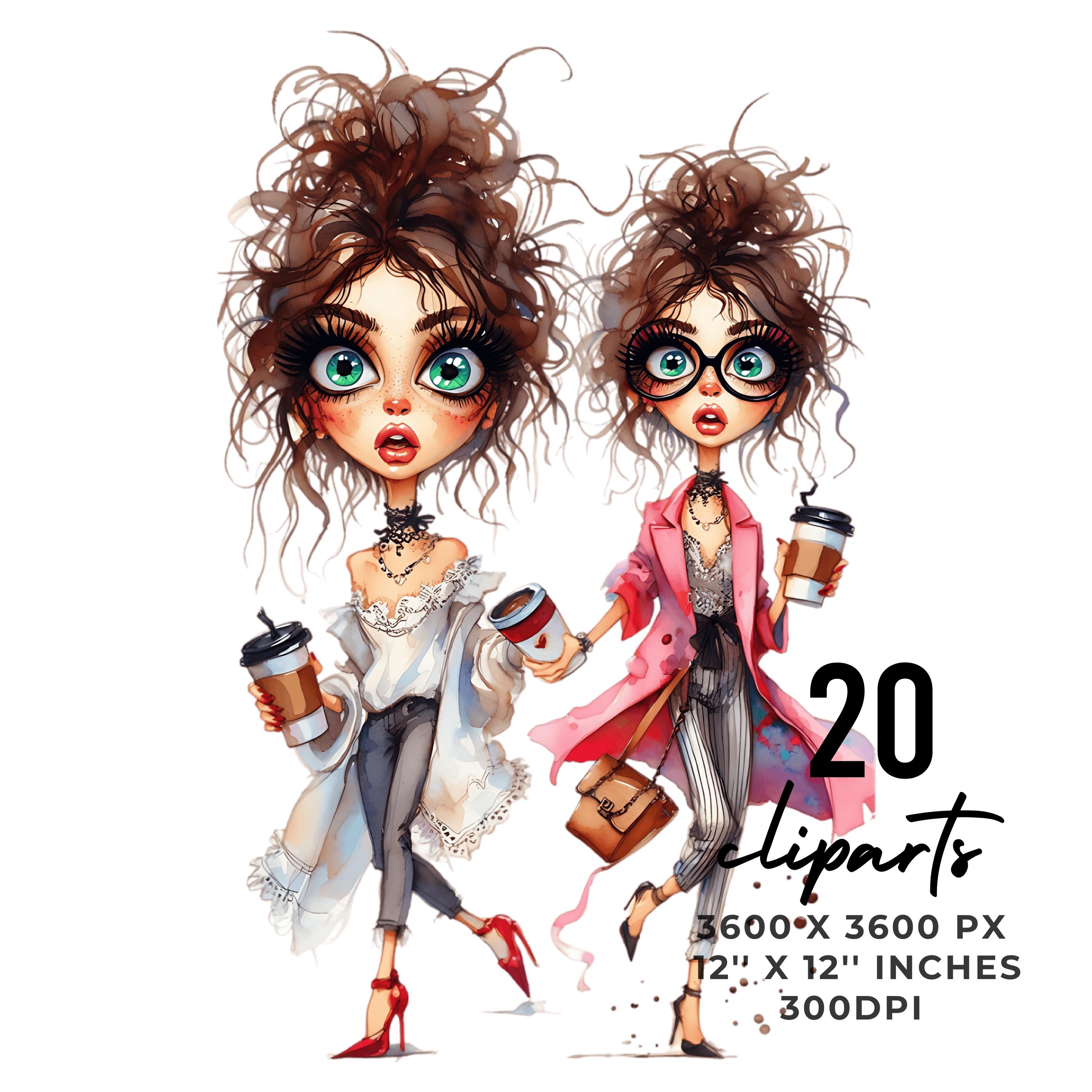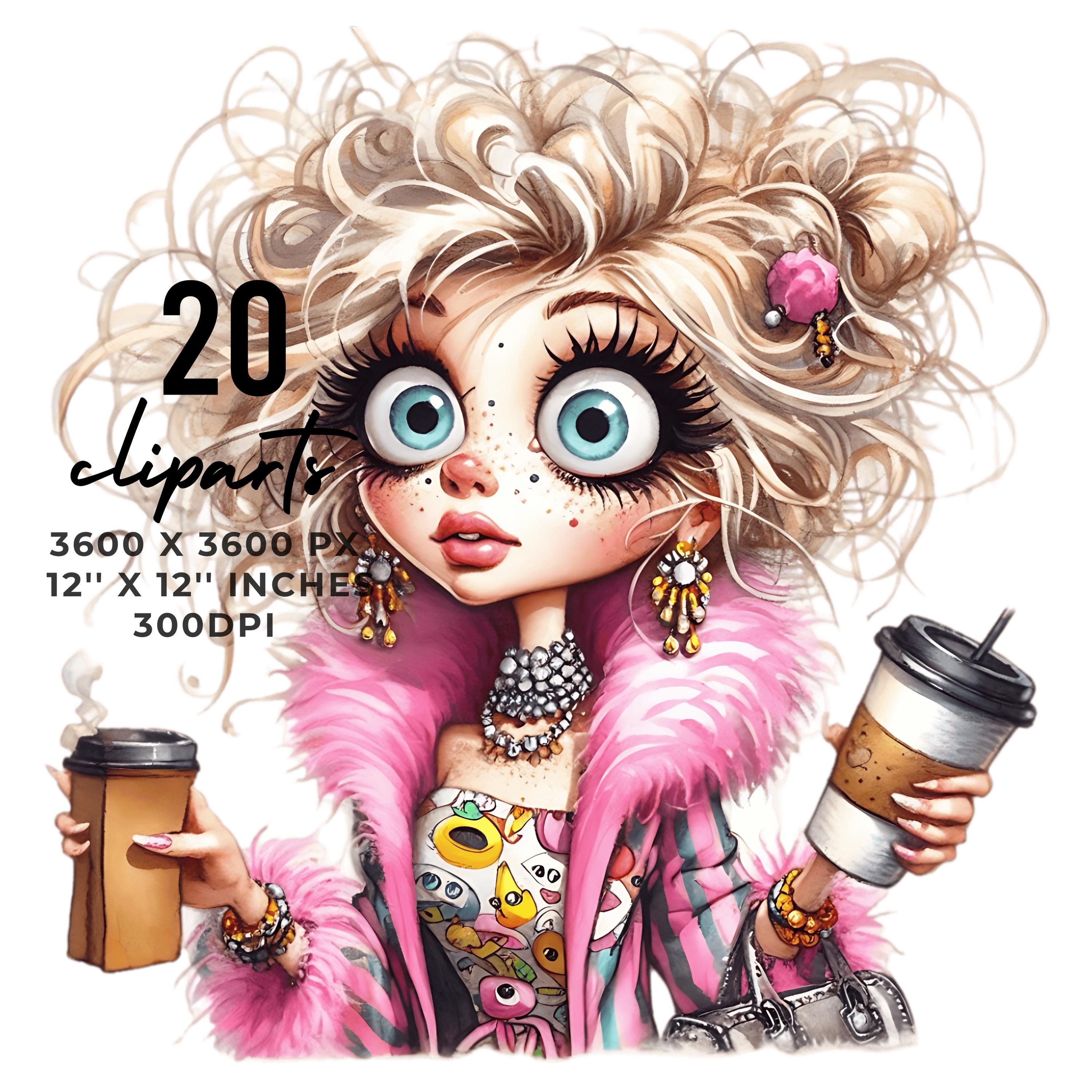 20 Quirky Haute Couture Coffee Girl Clipart PNG | Coffee Women PNG | Whimsical Scrapbooking Junk Journaling and Card Making | Commercial Use is an eye-catching, high-resolution digital asset designed for creators, crafters, teachers, and small business owners looking to elevate their visuals.
