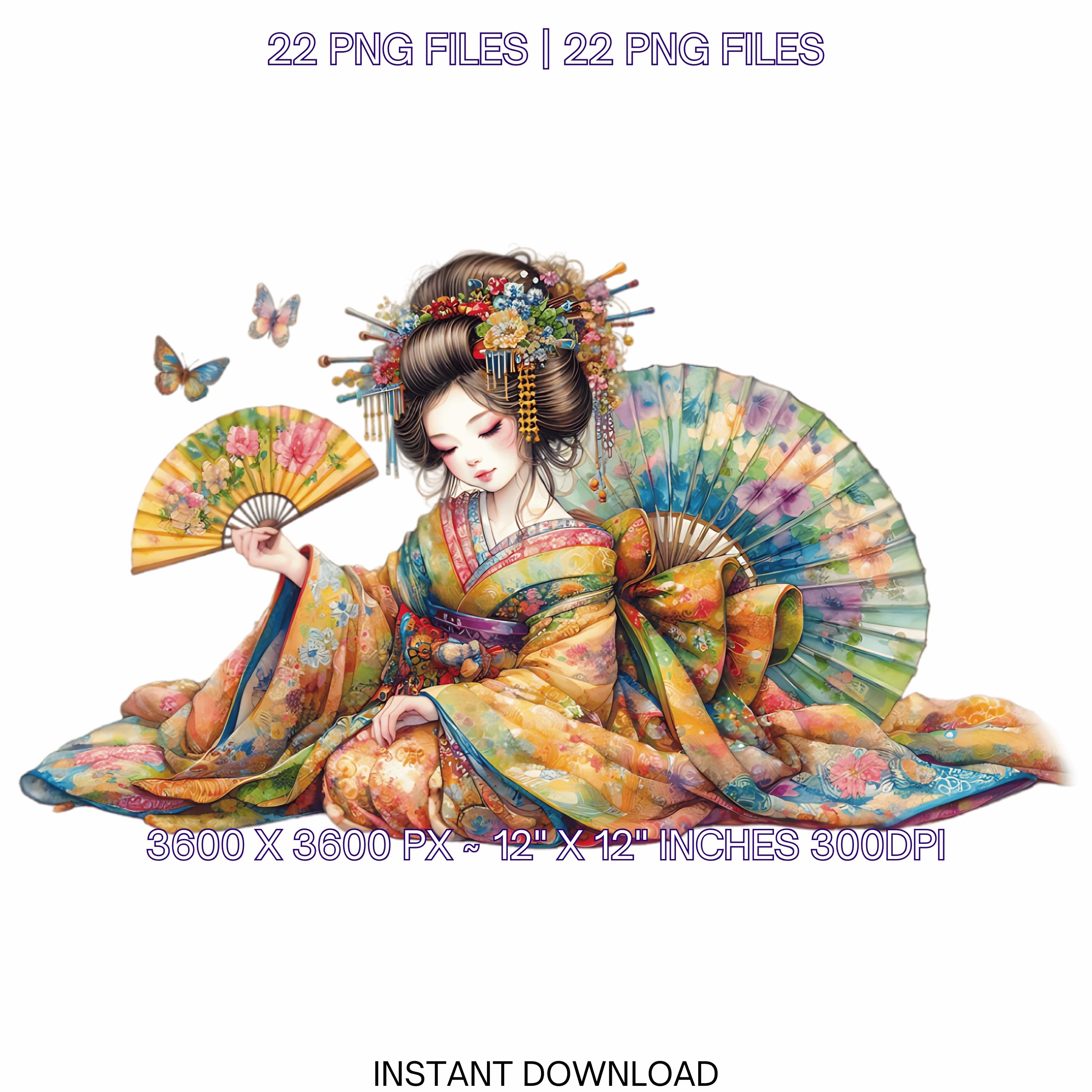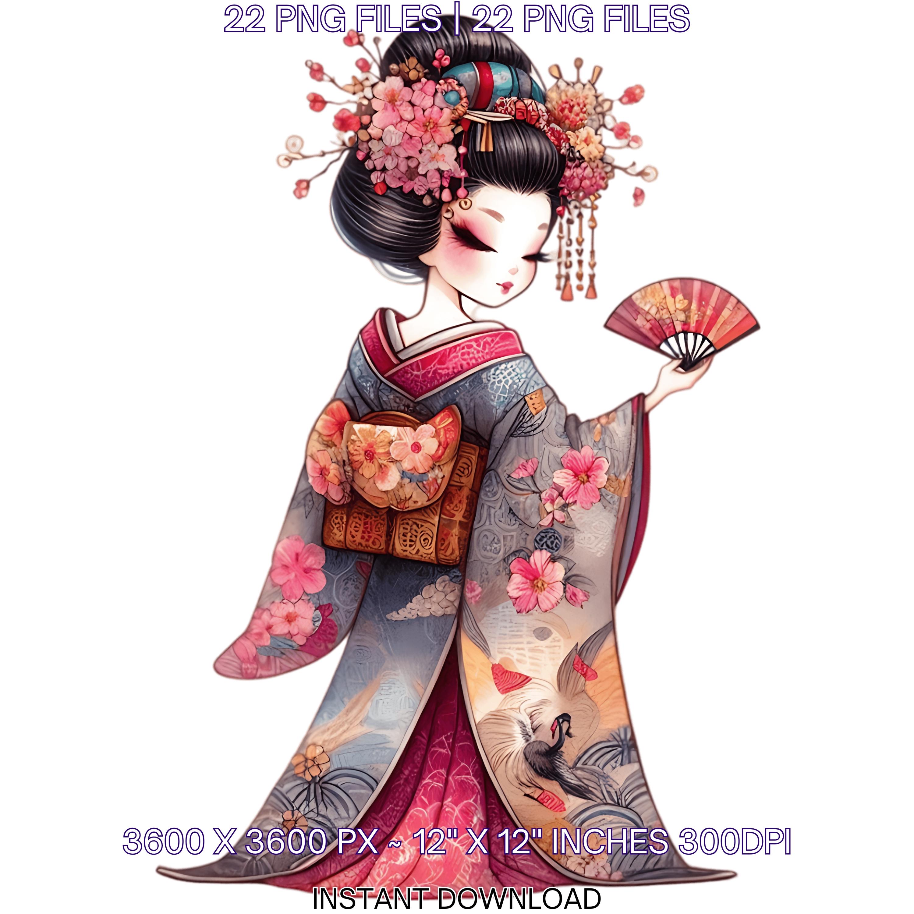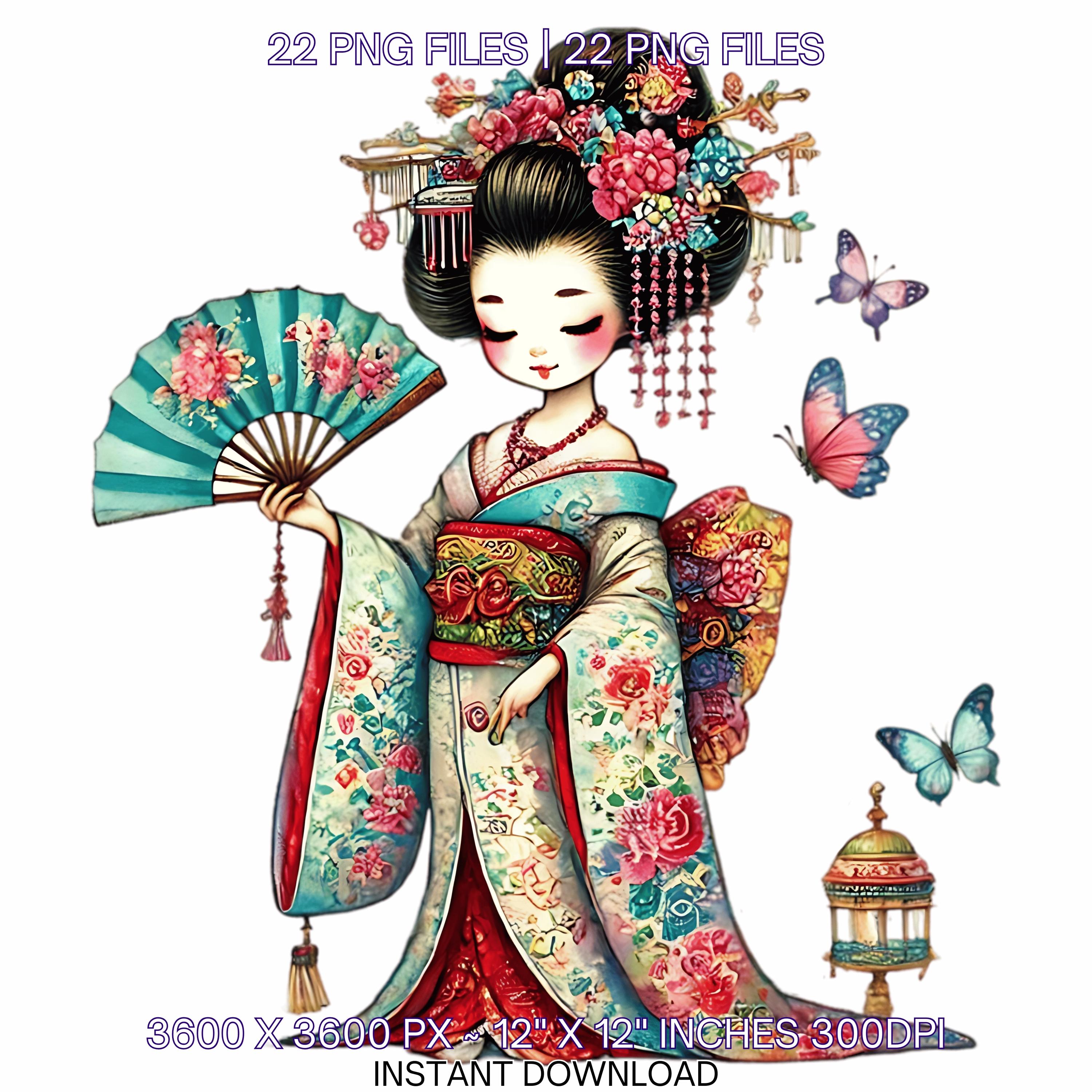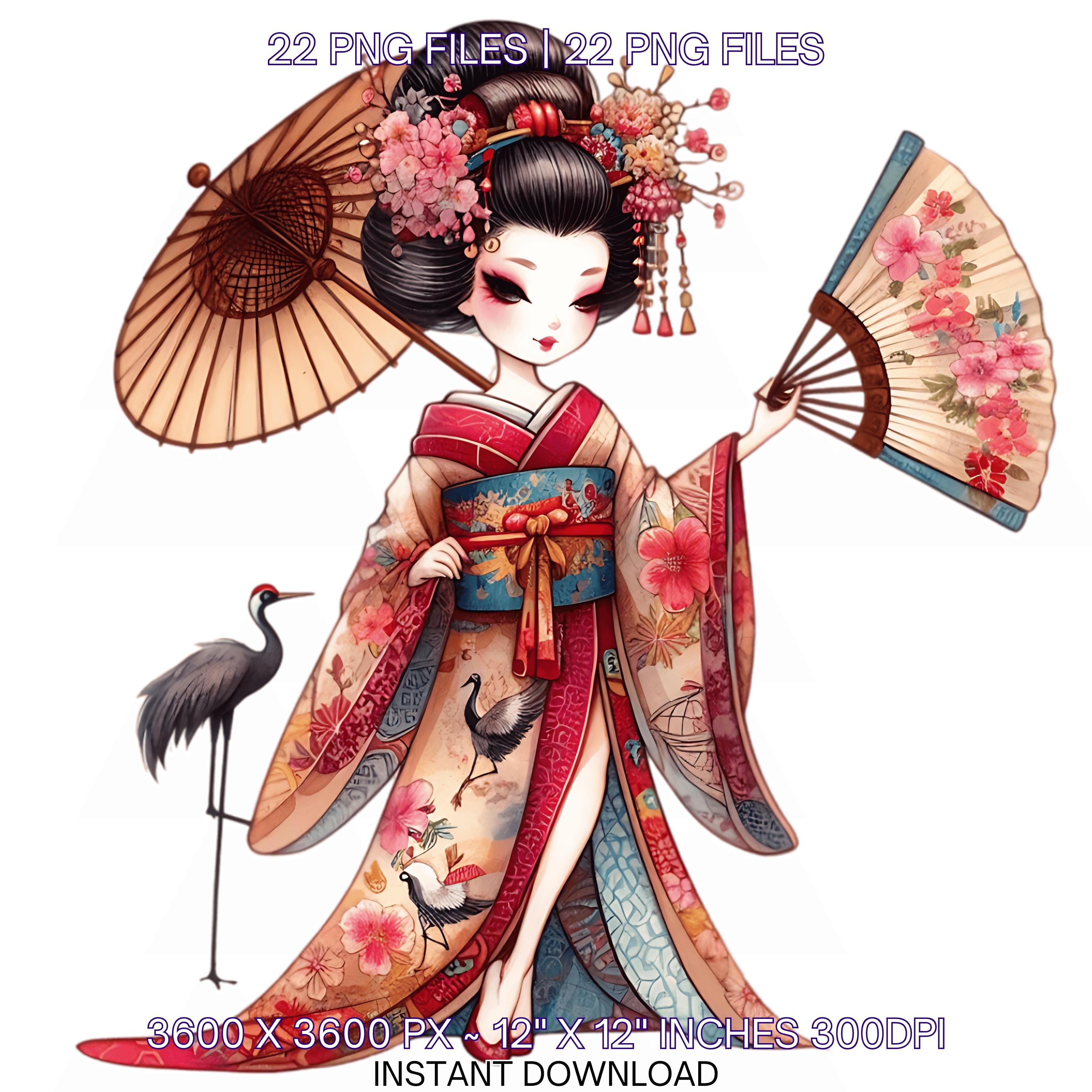 22 Quirky Geisha Clip Art PNG High Res Watercolor Fantasy, Whimsical for Sublimation, Junk Journaling, Scrapbooking, Card Making, Commercial is an eye-catching, high-resolution digital asset designed for creators, crafters, teachers, and small business owners looking to elevate their visuals.