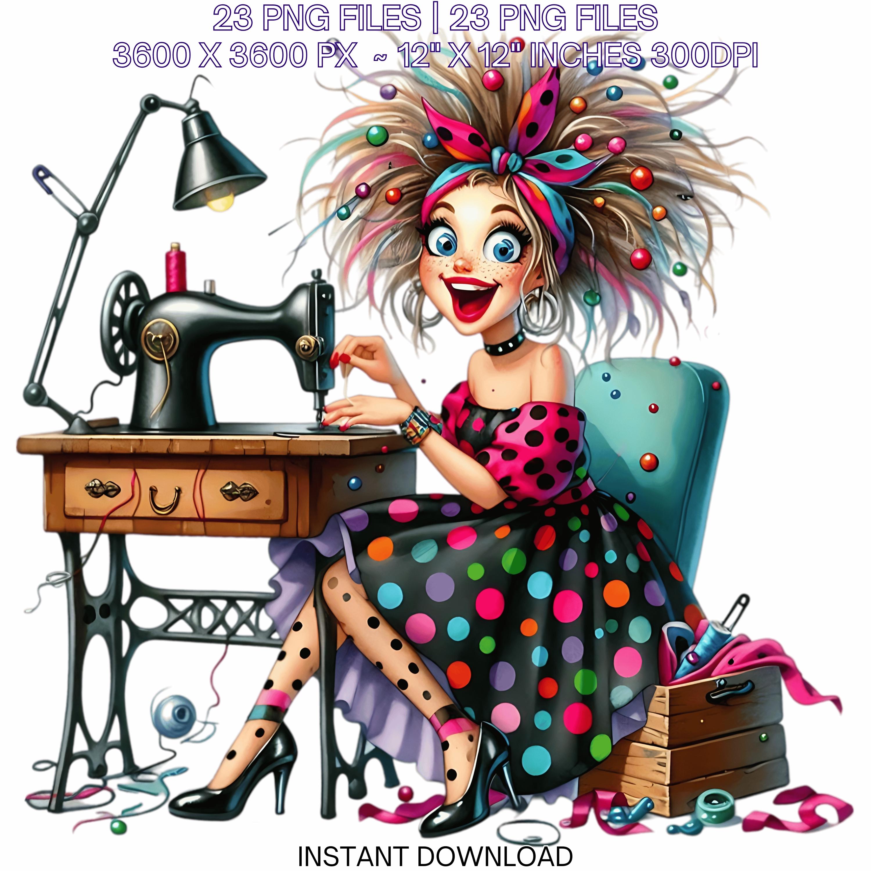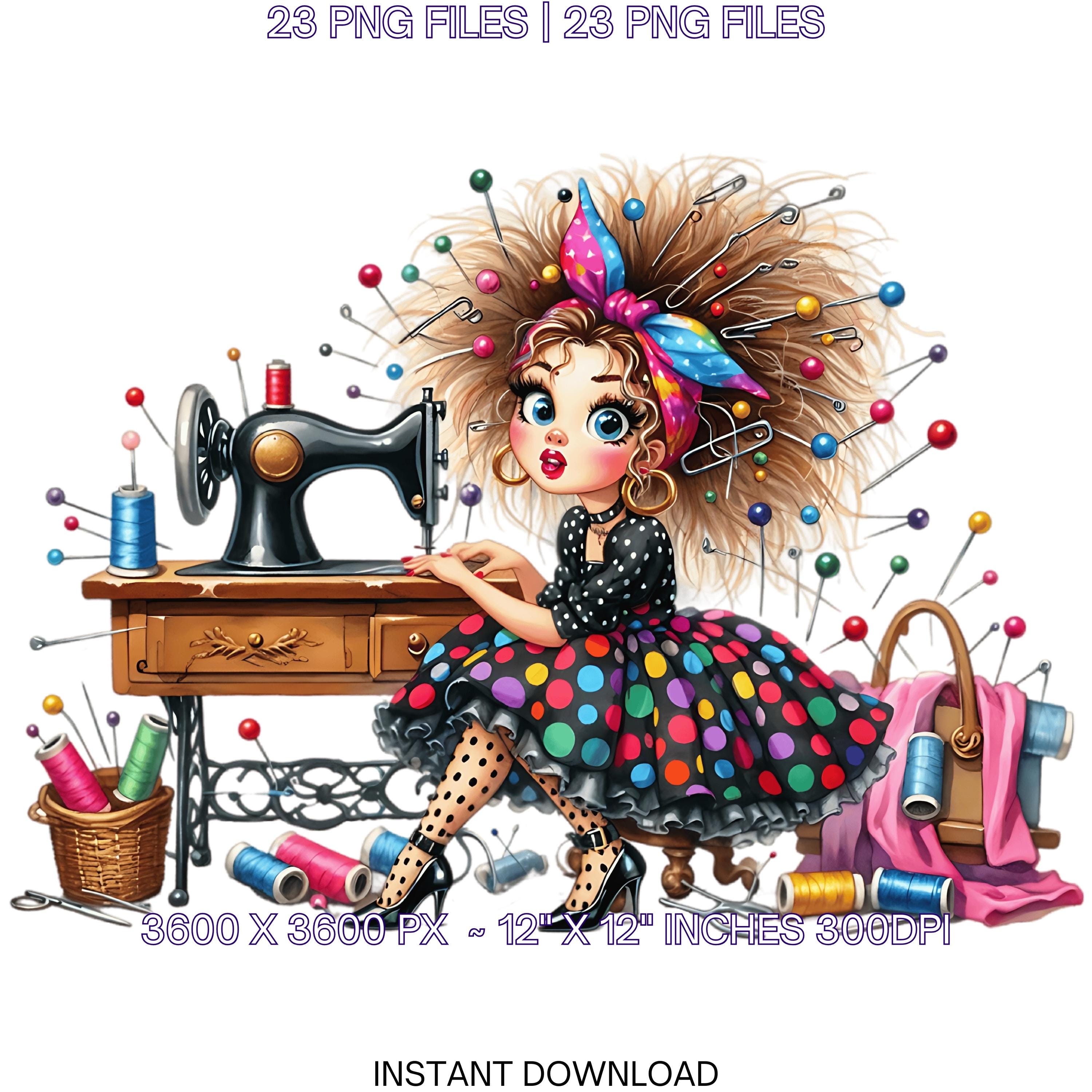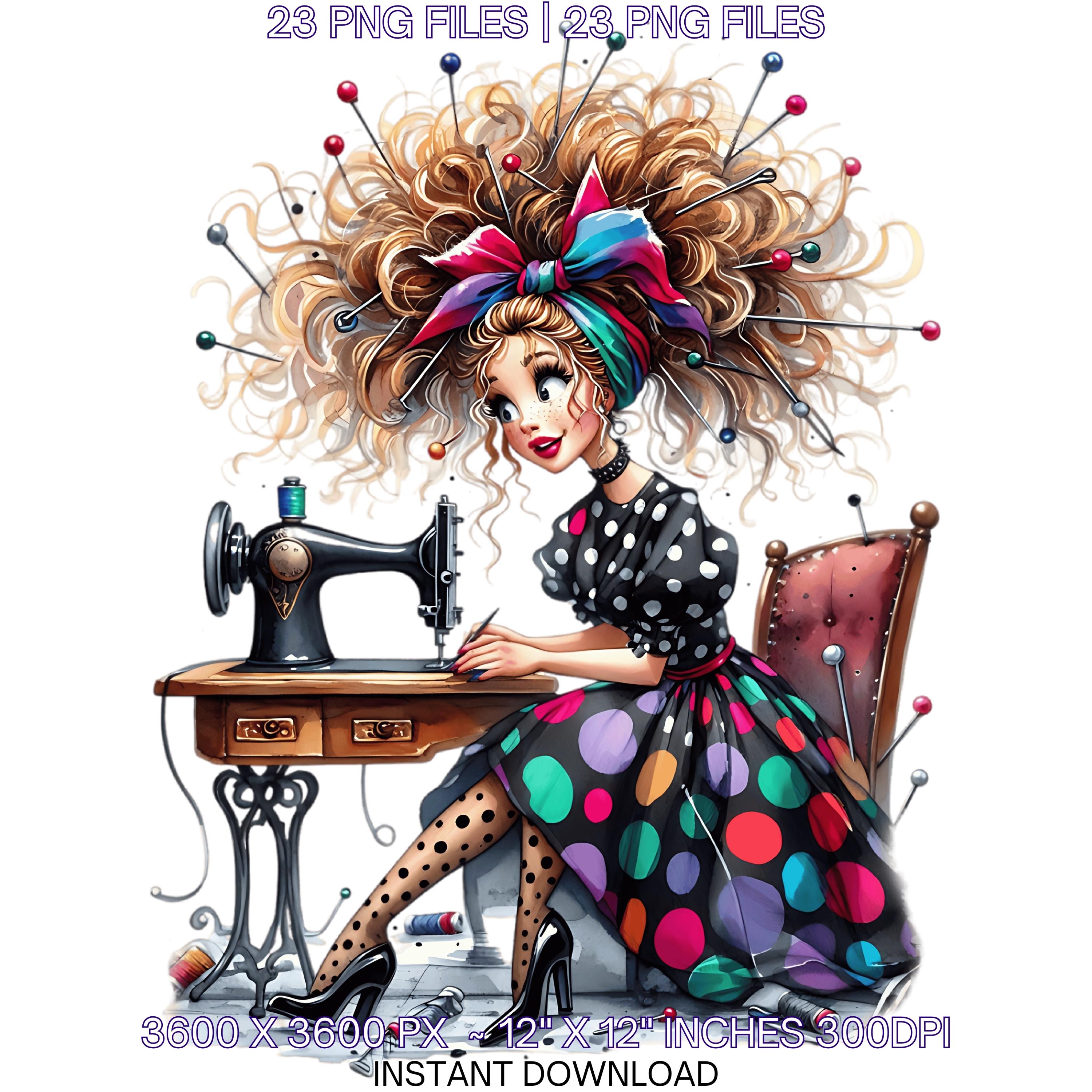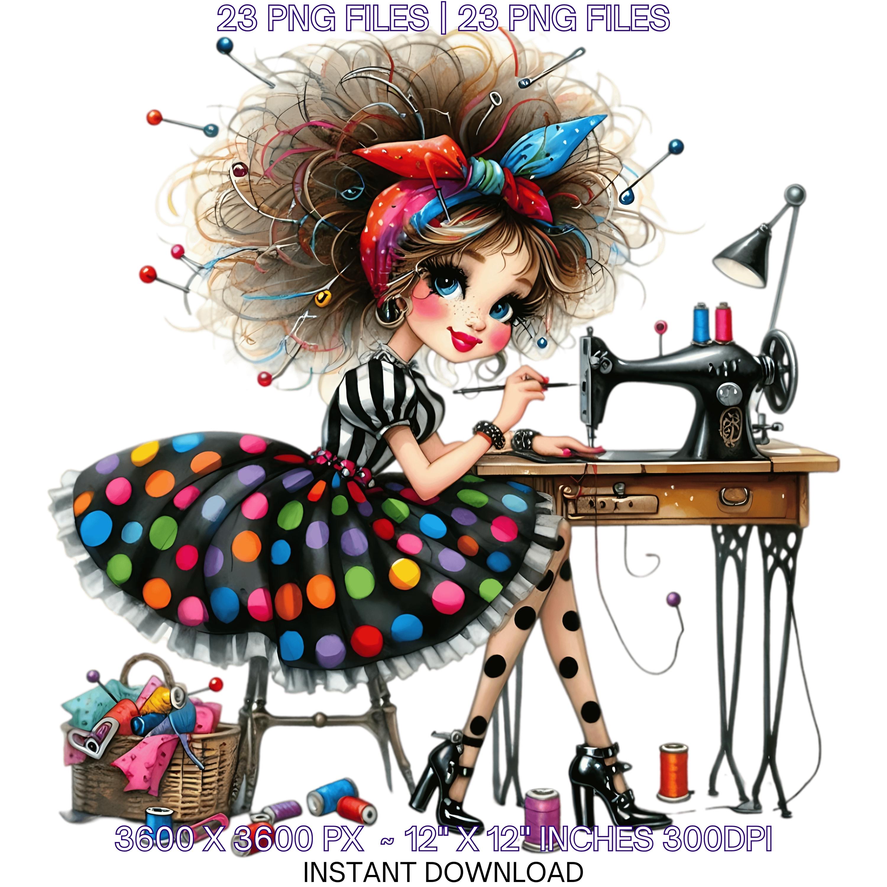 23 Quirky Sewing Girl Clip Art PNG | Watercolor Freeze Messy Girl Junk Journaling Card Making, Fantasy, Whimsical Sublimation Commercial Use