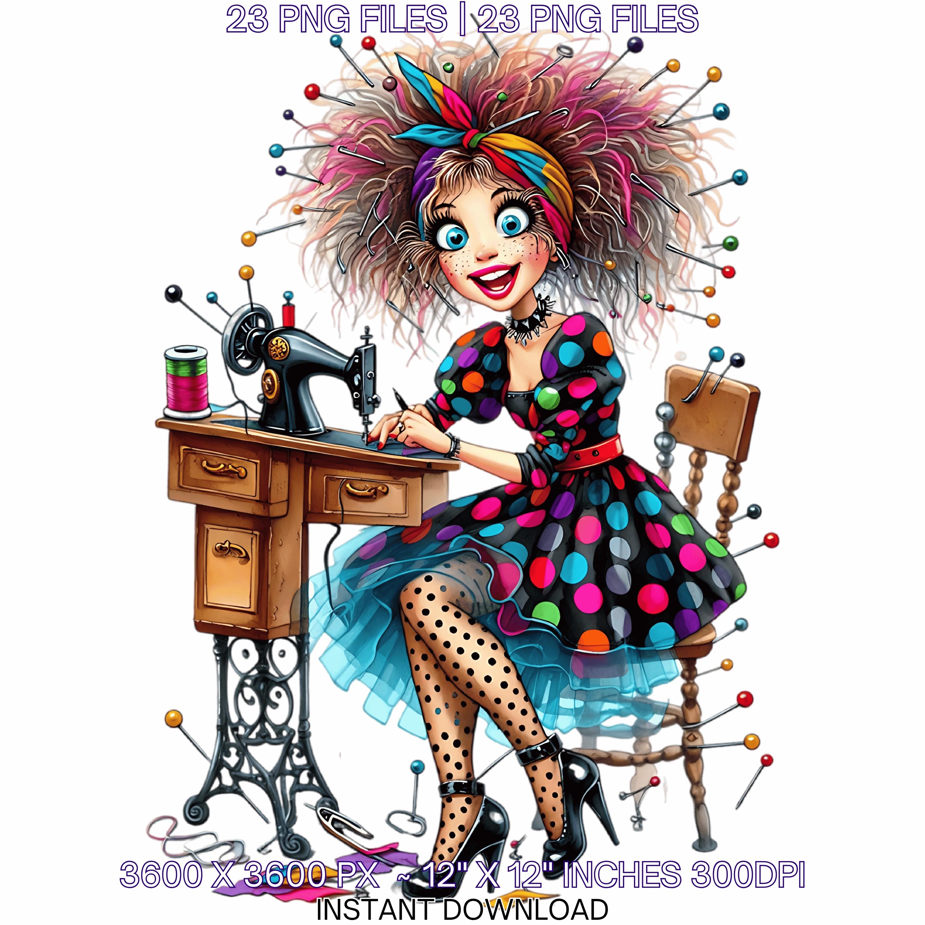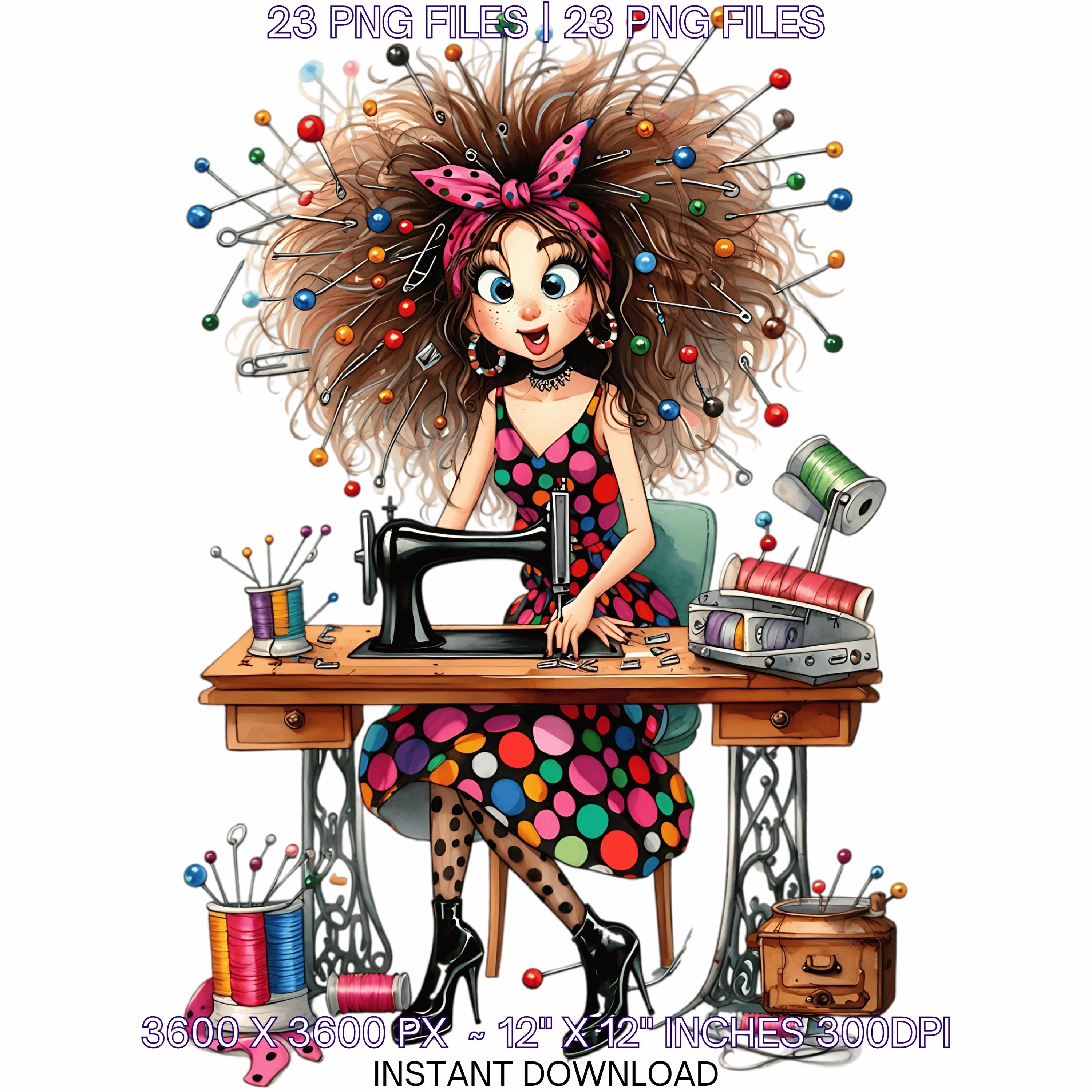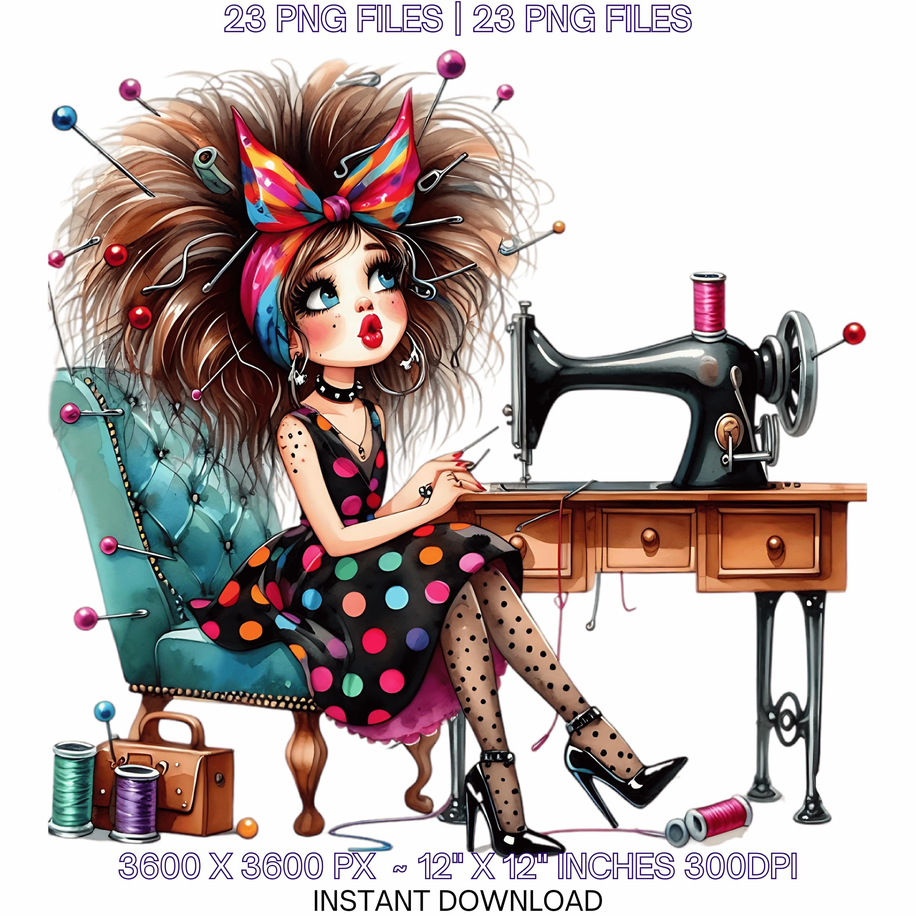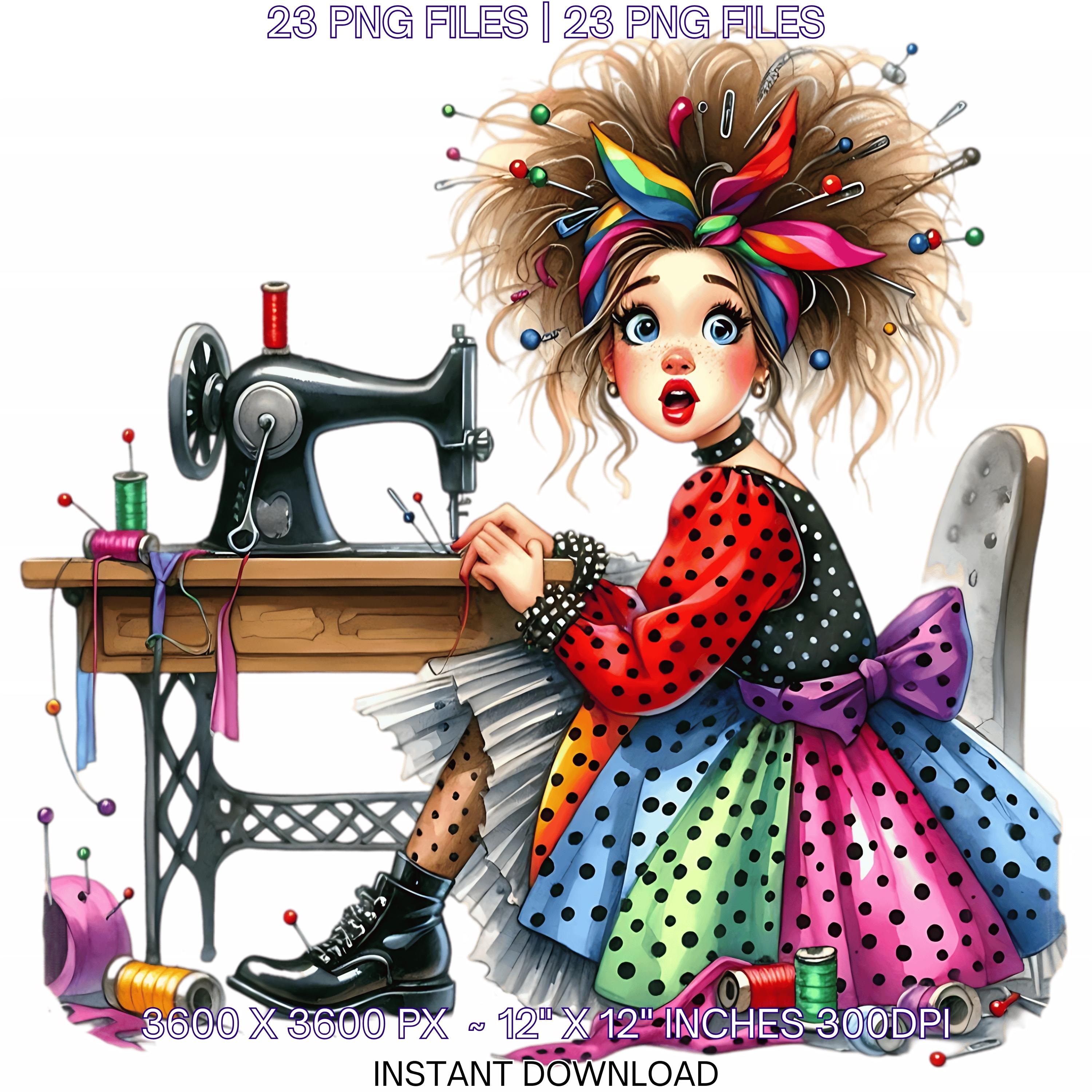 23 Quirky Sewing Girl Clip Art PNG | Watercolor Freeze Messy Girl Junk Journaling Card Making, Fantasy, Whimsical Sublimation Commercial Use is an eye-catching, high-resolution digital asset designed for creators, crafters, teachers, and small business owners looking to elevate their visuals.