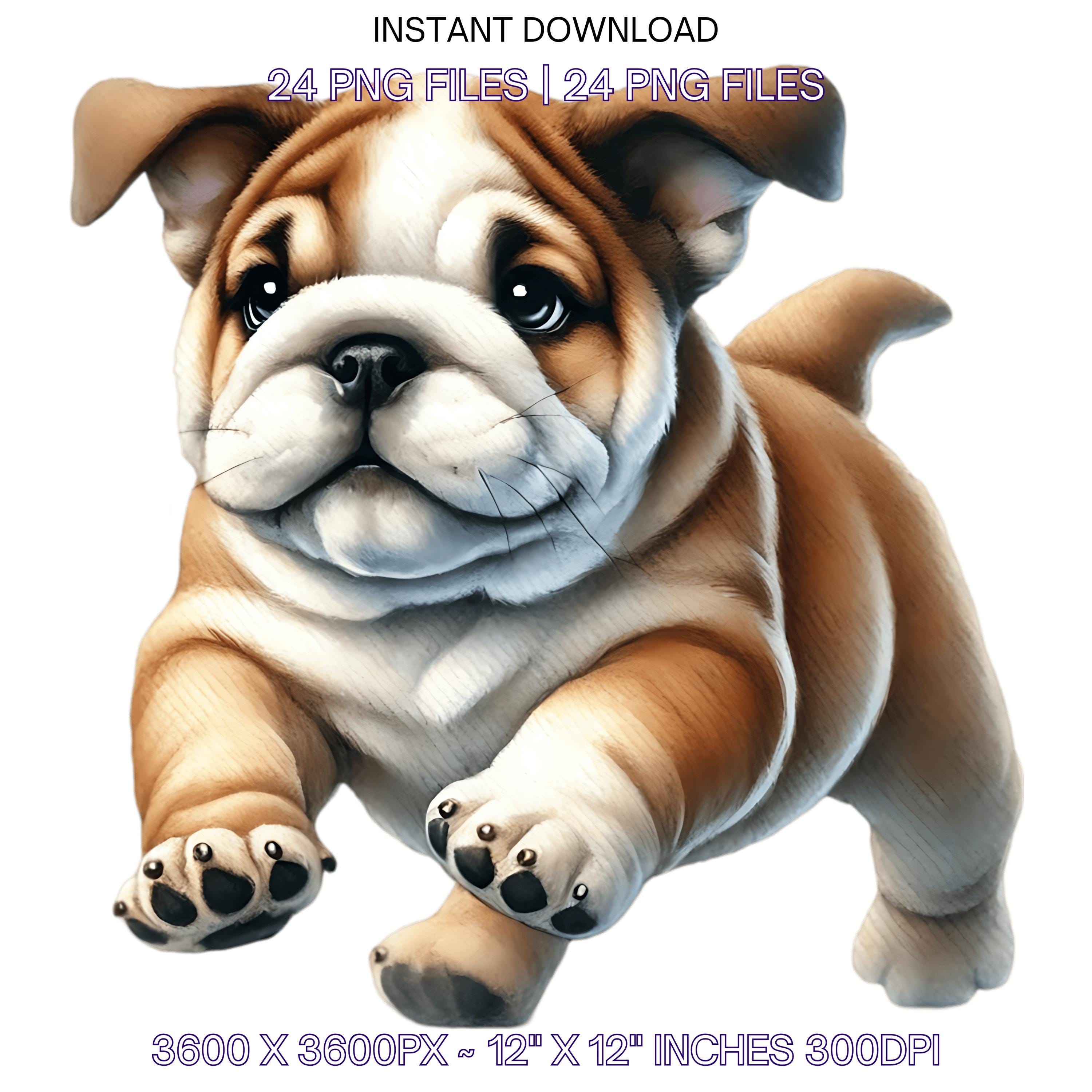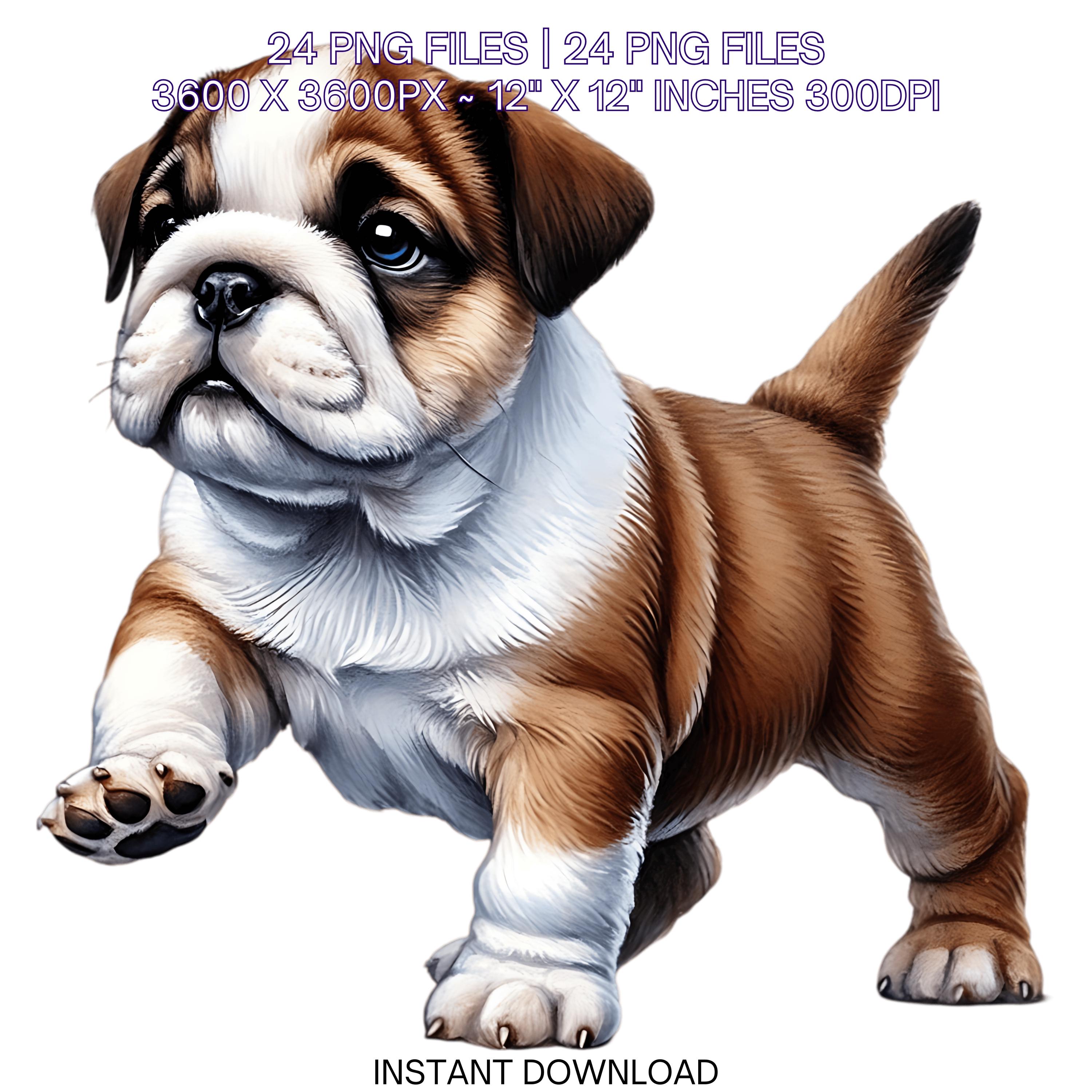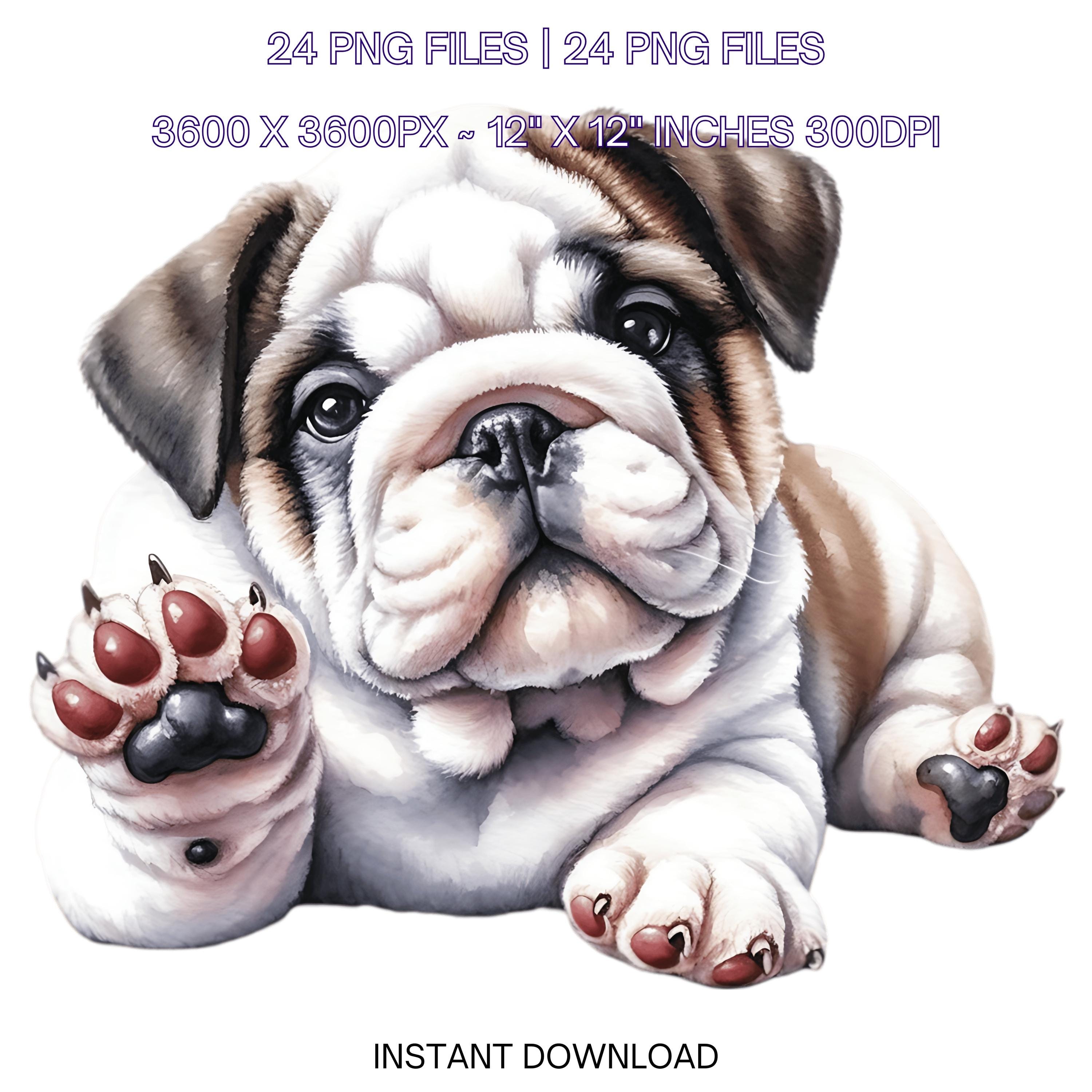24 Bulldog Puppy Dog PNG Clipart | Watercolor Bulldog Baby Dog for Card Making, Scrapbooking, Junk Journaling, Sublimation Commercial Use is an eye-catching, high-resolution digital asset designed for creators, crafters, teachers, and small business owners looking to elevate their visuals.
