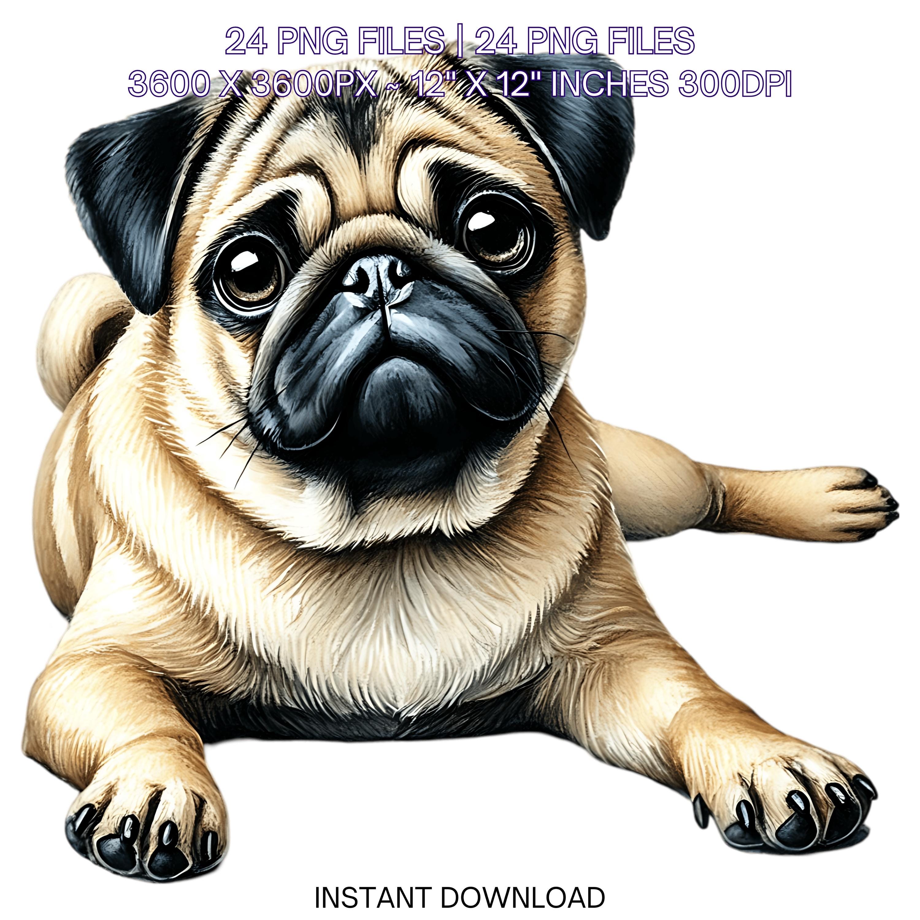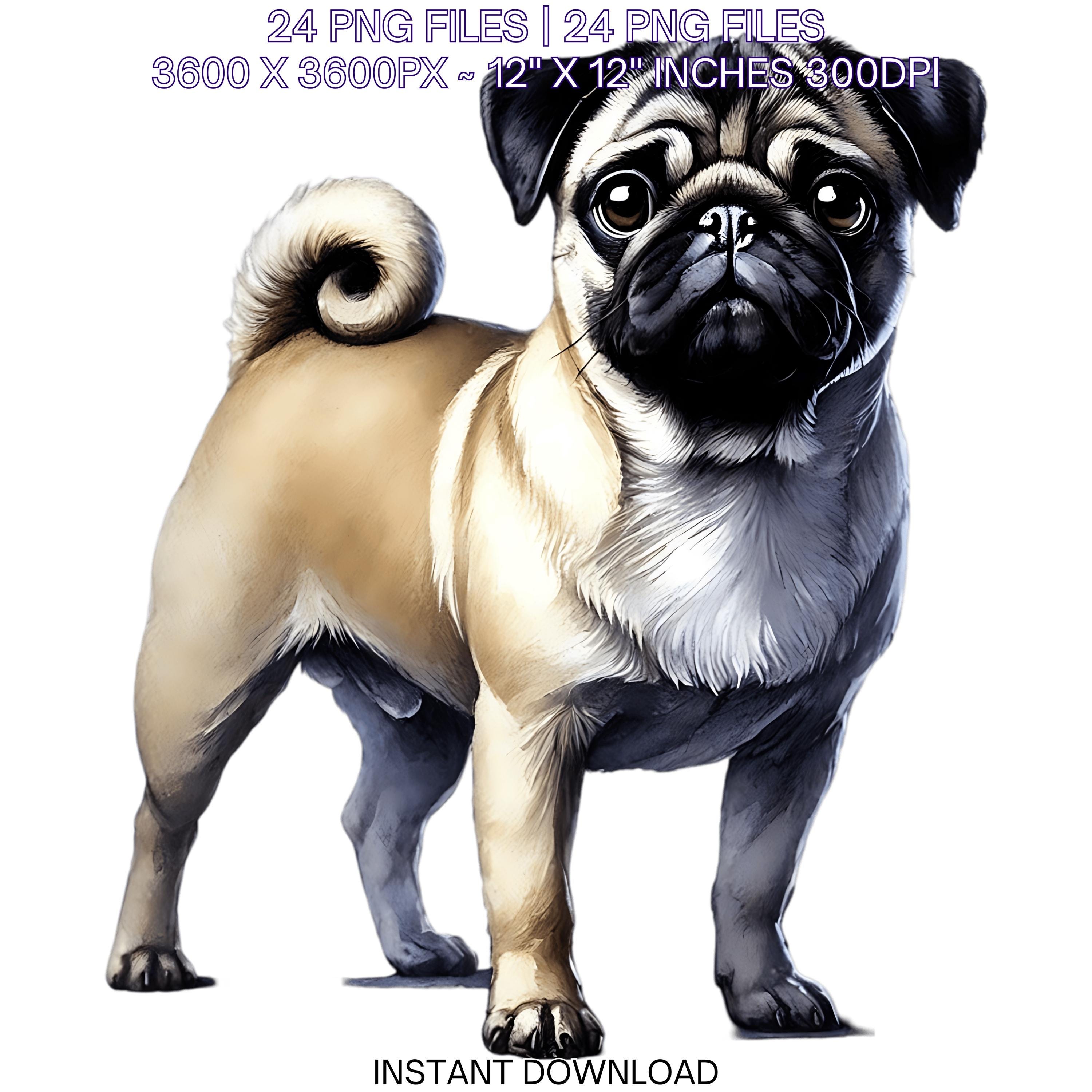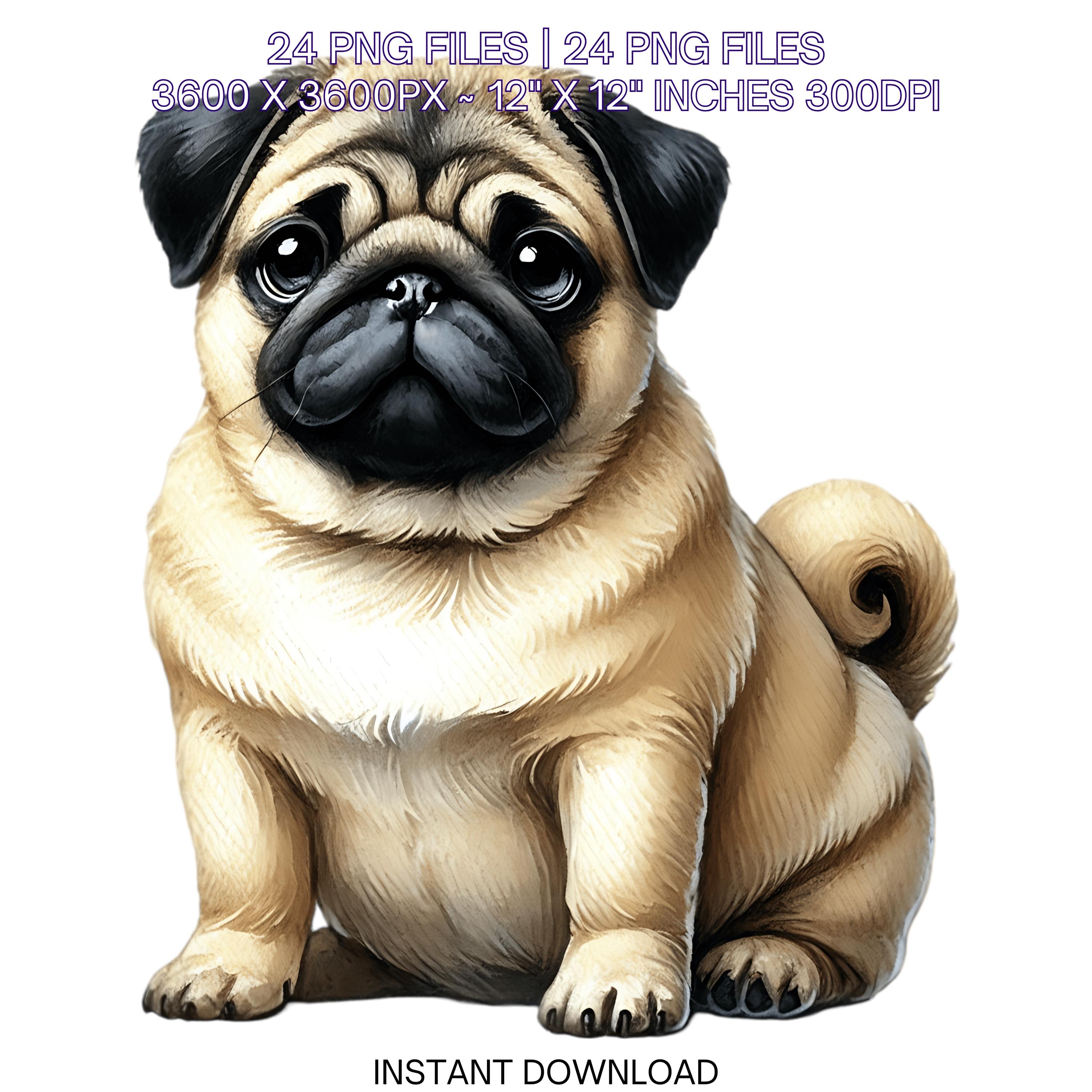 24 PUG Dog PNG Clipart, Watercolor PUG Dog for Card Making, Scrapbooking, Junk Journaling, Sublimation Illustrations Pet Portrait Commercial is an eye-catching, high-resolution digital asset designed for creators, crafters, teachers, and small business owners looking to elevate their visuals.