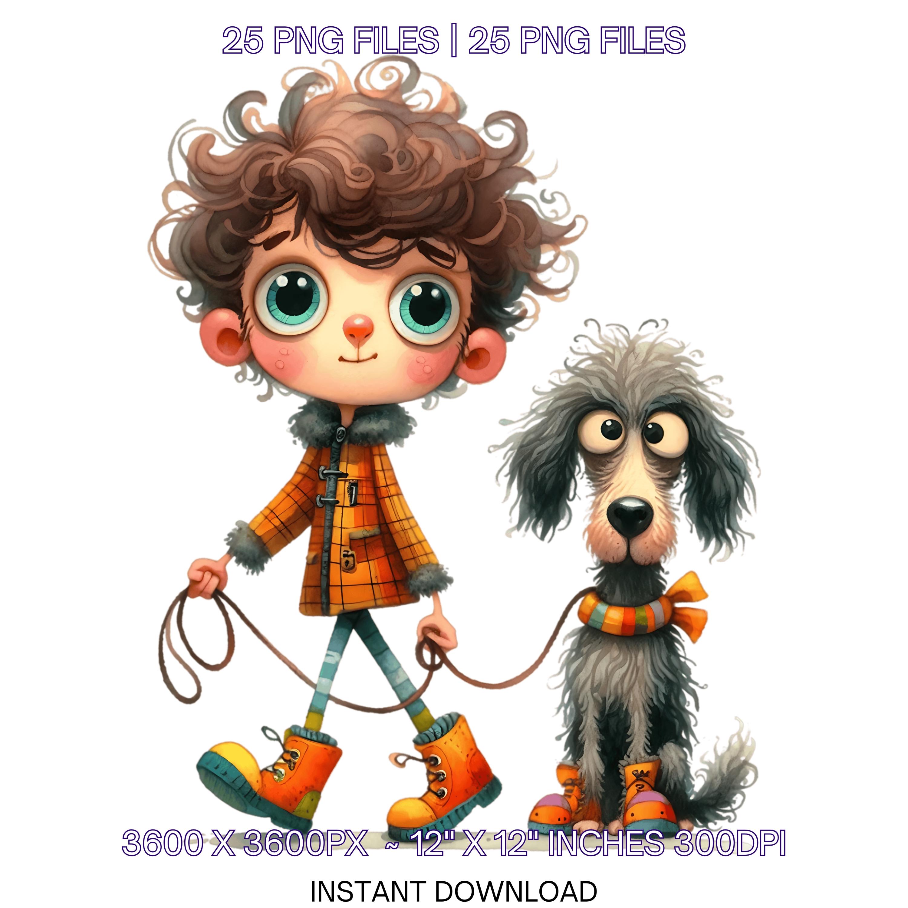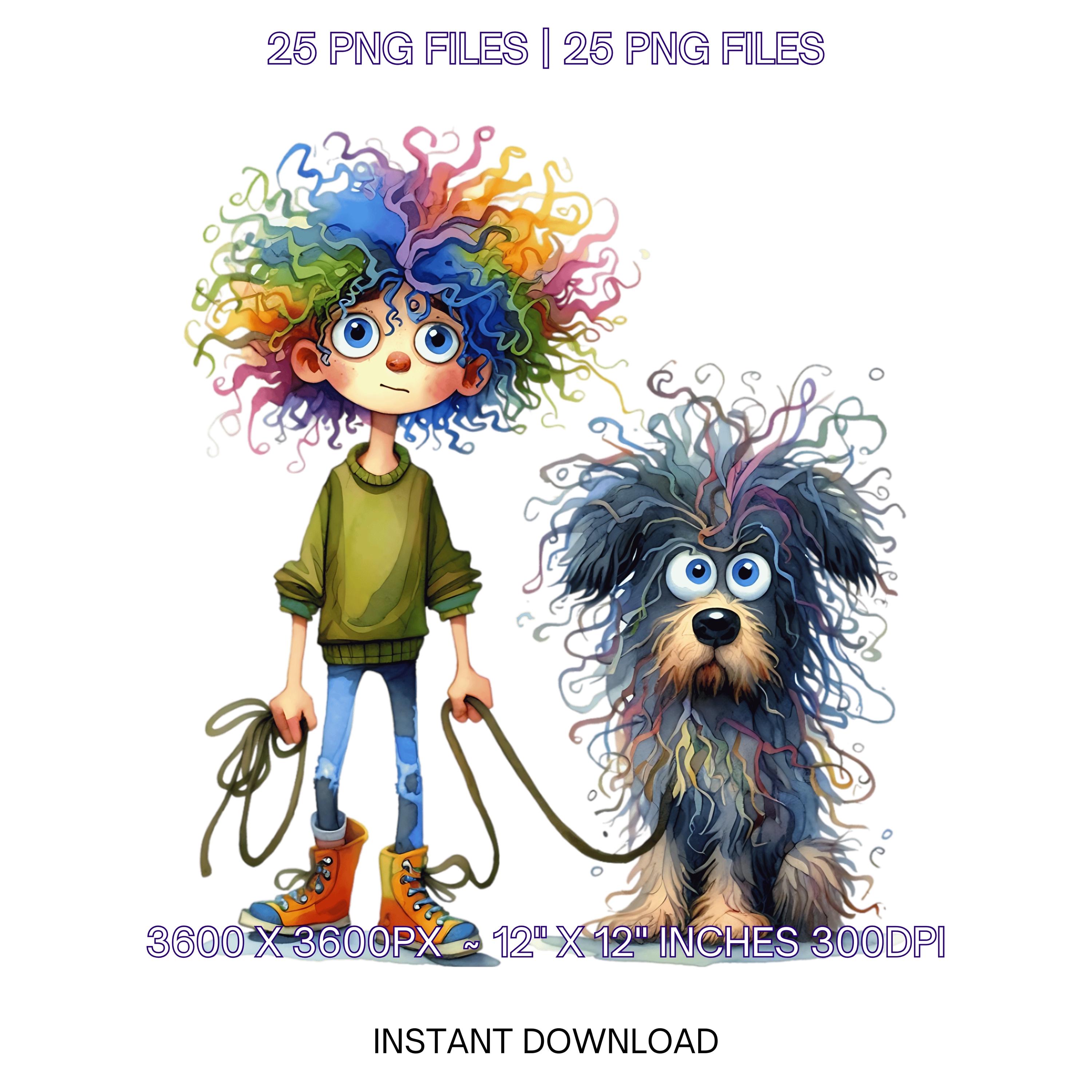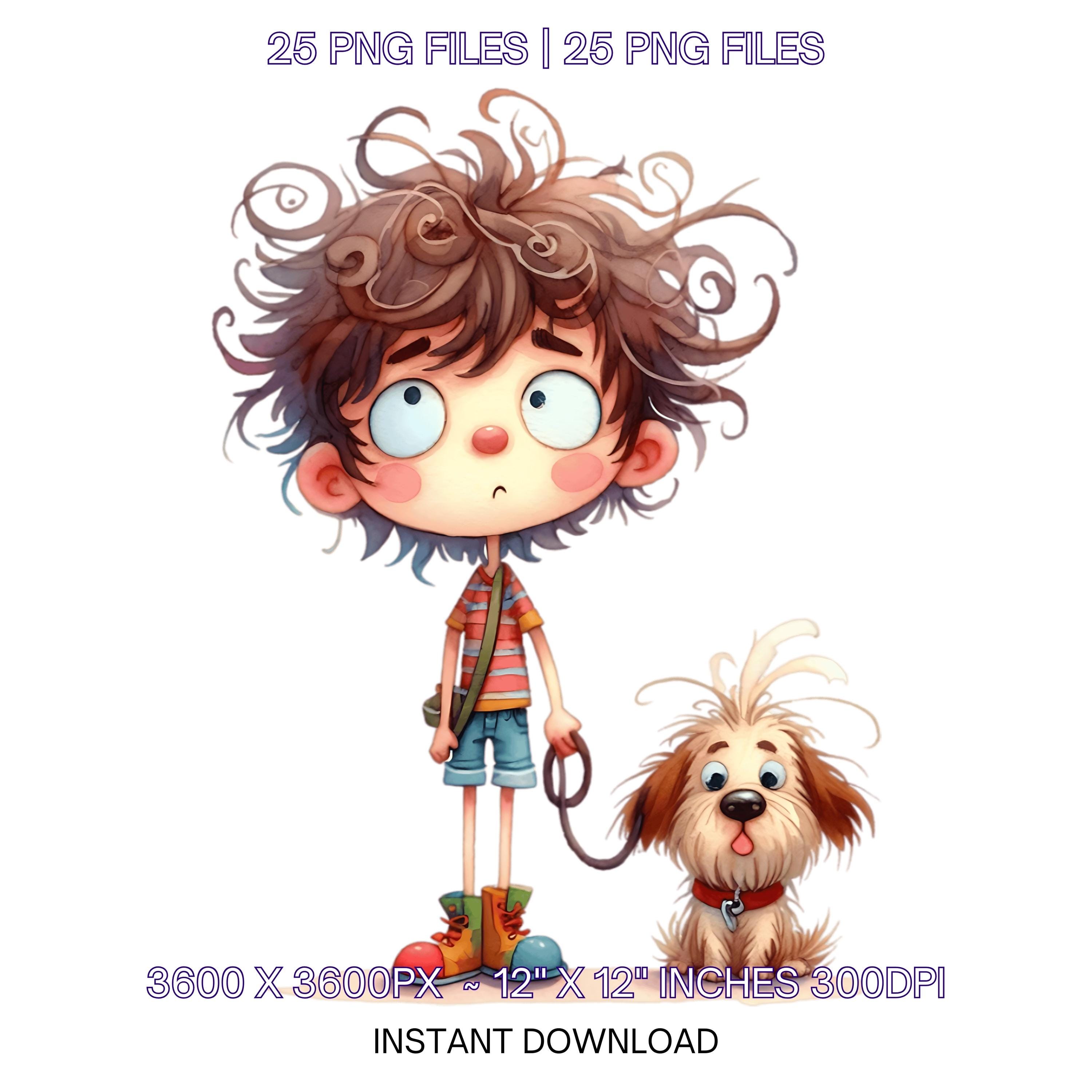 25 Quirky Boy Walking Dog Clipart PNG | Crazy Frazzled Boy PNG Fantasy Whimsical Ephemera Watercolor Junk Journal Paper Craft Commercial Use is an eye-catching, high-resolution digital asset designed for creators, crafters, teachers, and small business owners looking to elevate their visuals.