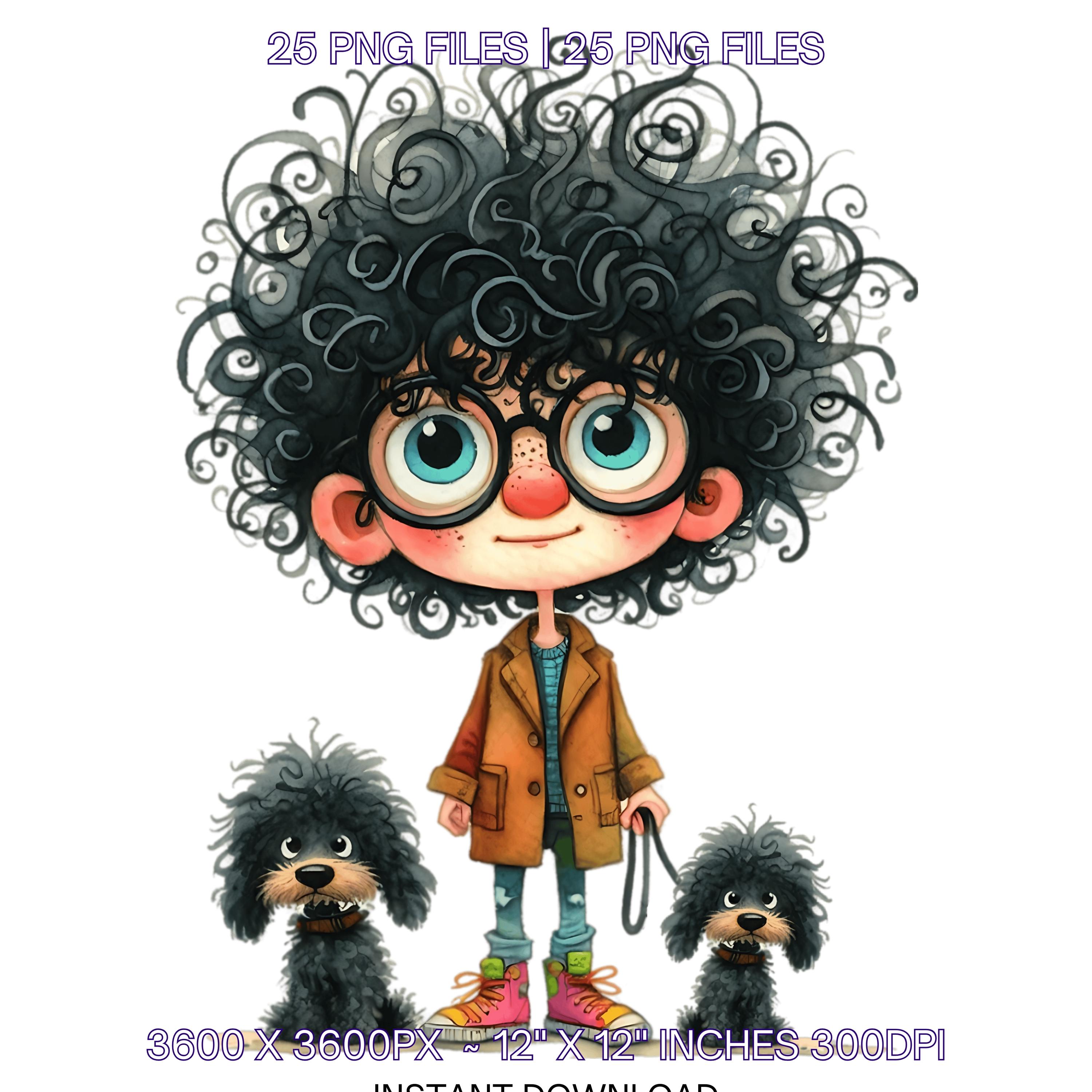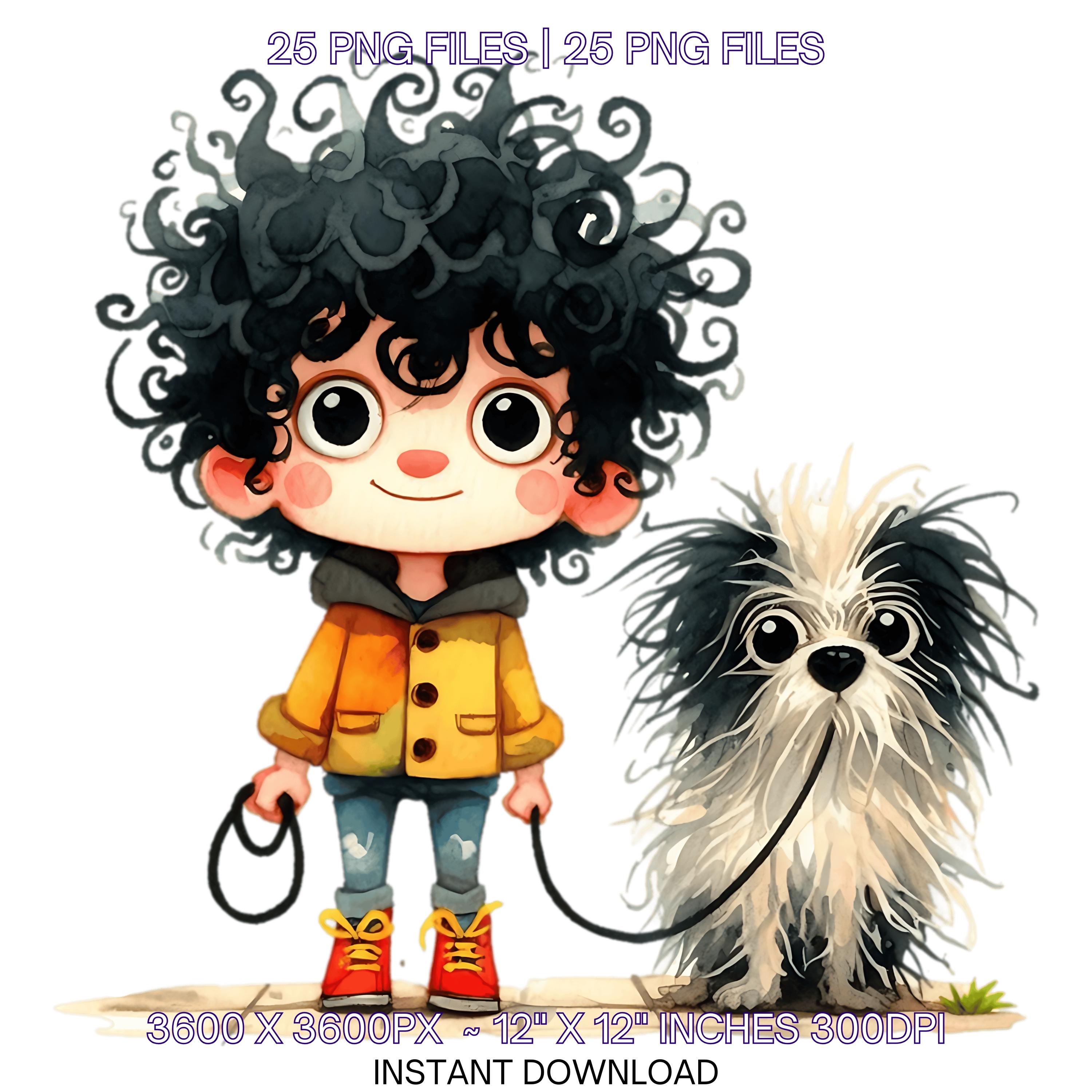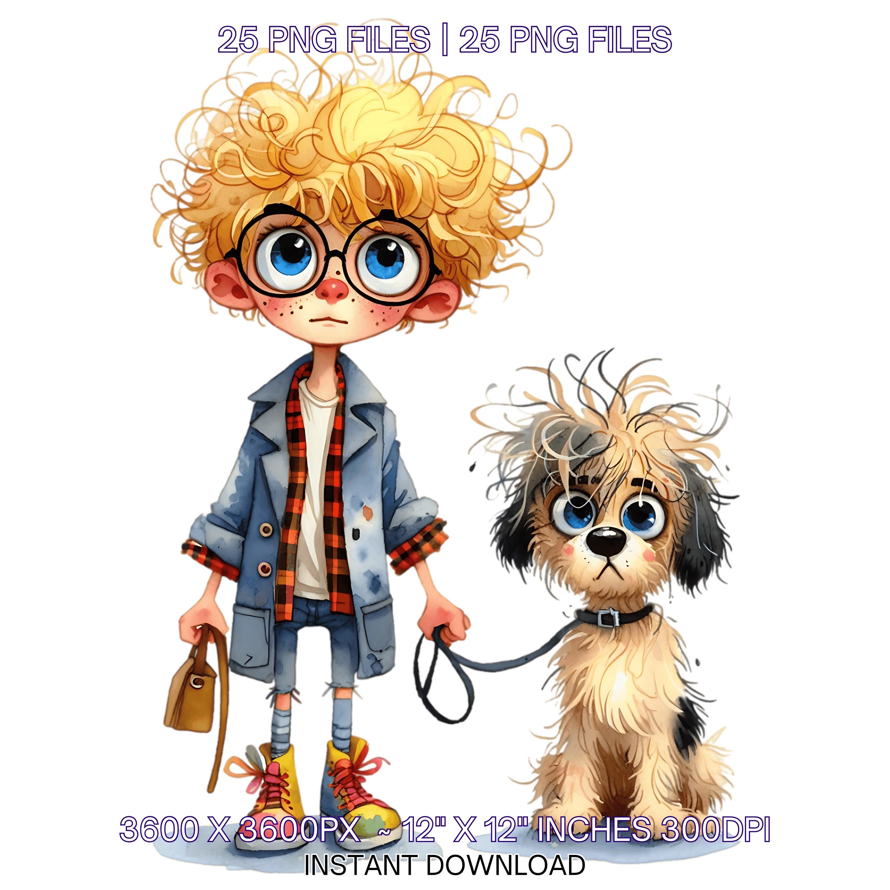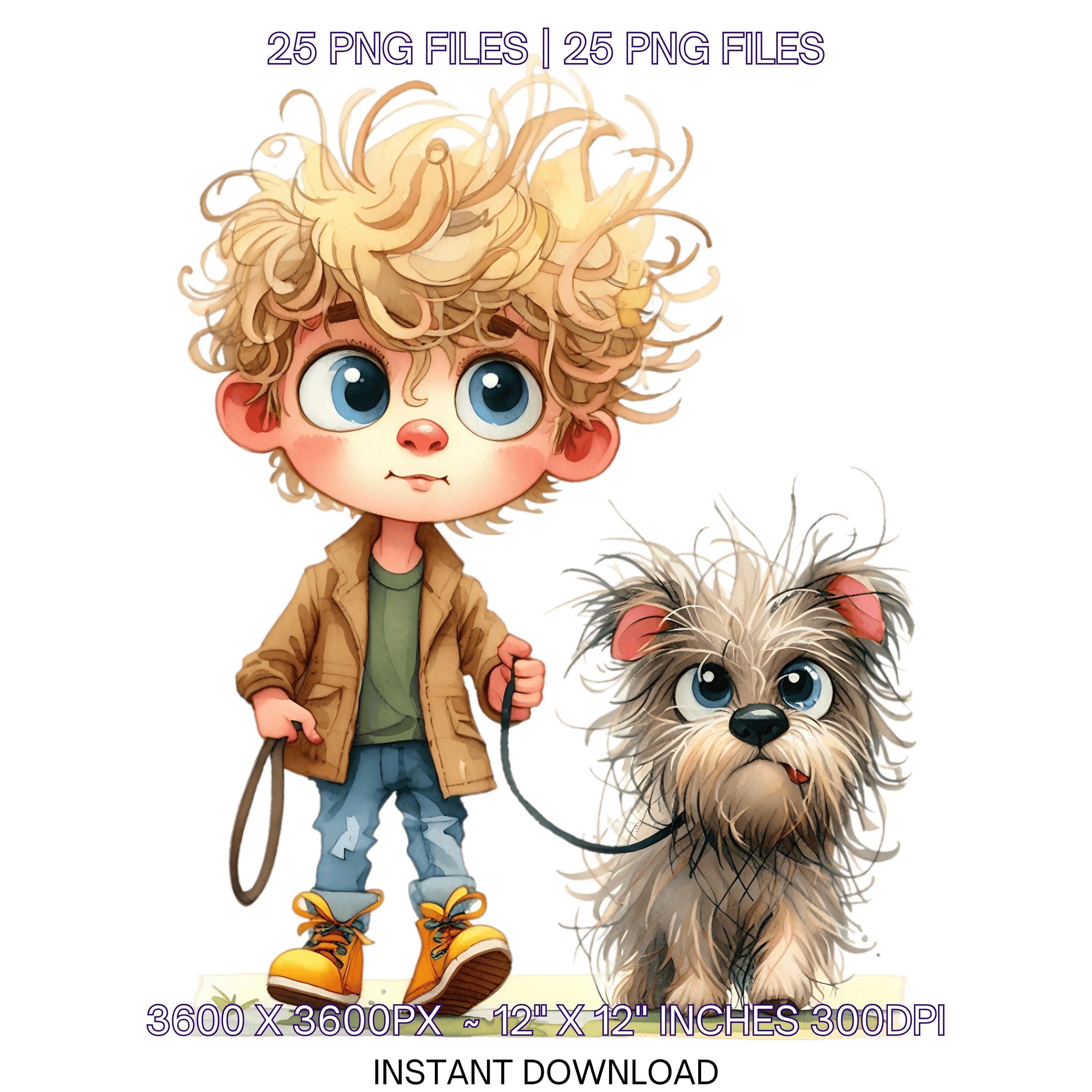 25 Quirky Boy Walking Dog Clipart PNG | Crazy Frazzled Boy PNG Fantasy Whimsical Ephemera Watercolor Junk Journal Paper Craft Commercial Use is an eye-catching, high-resolution digital asset designed for creators, crafters, teachers, and small business owners looking to elevate their visuals.