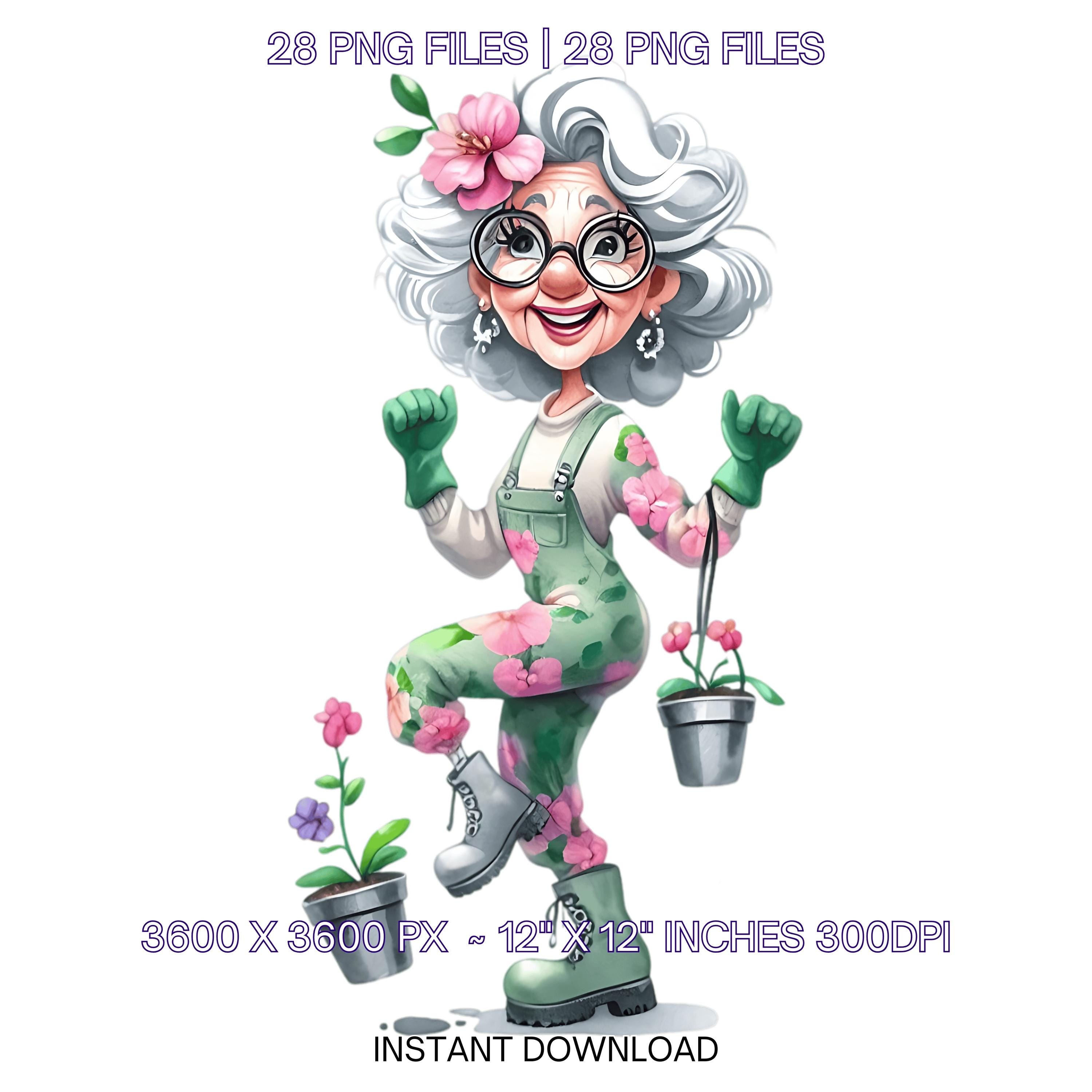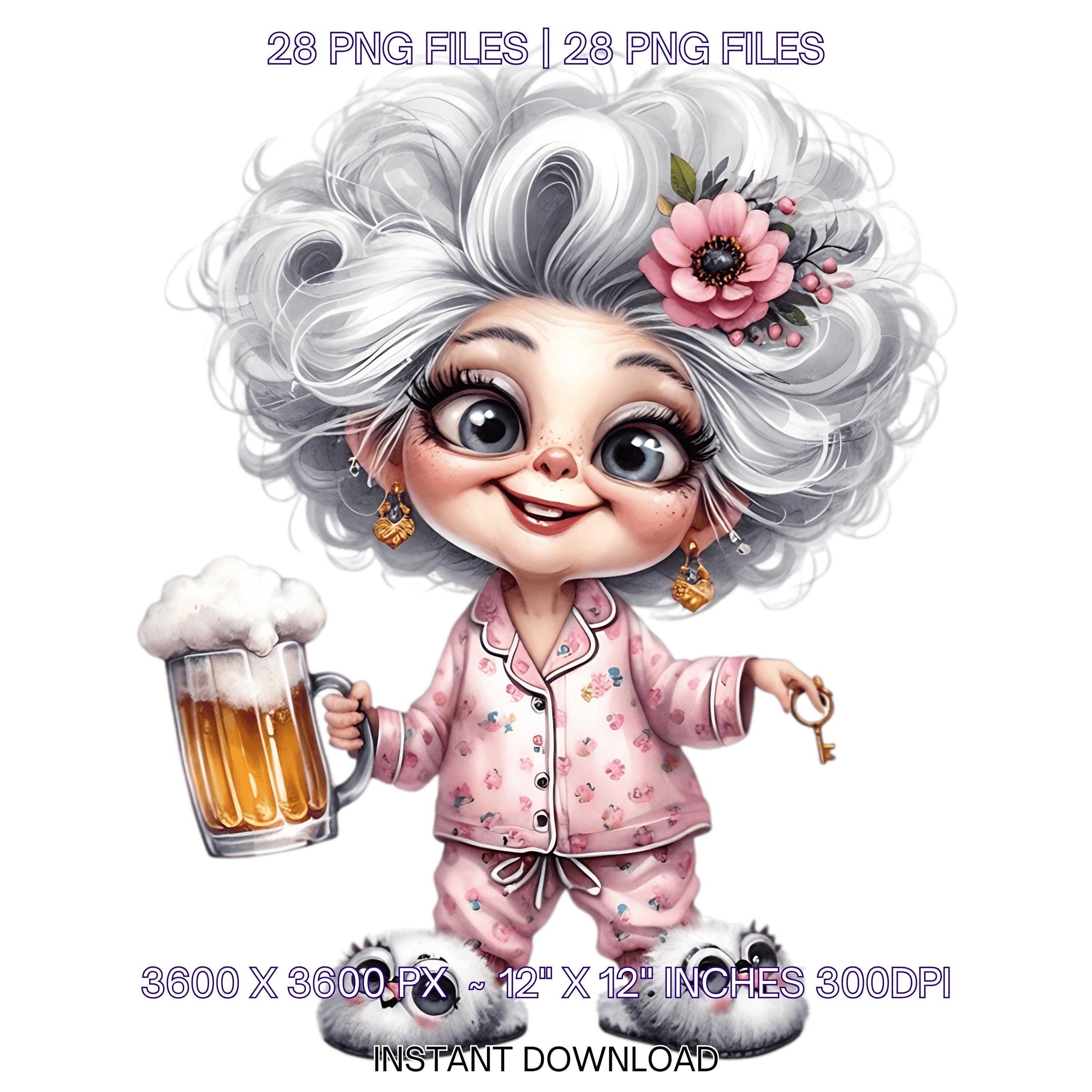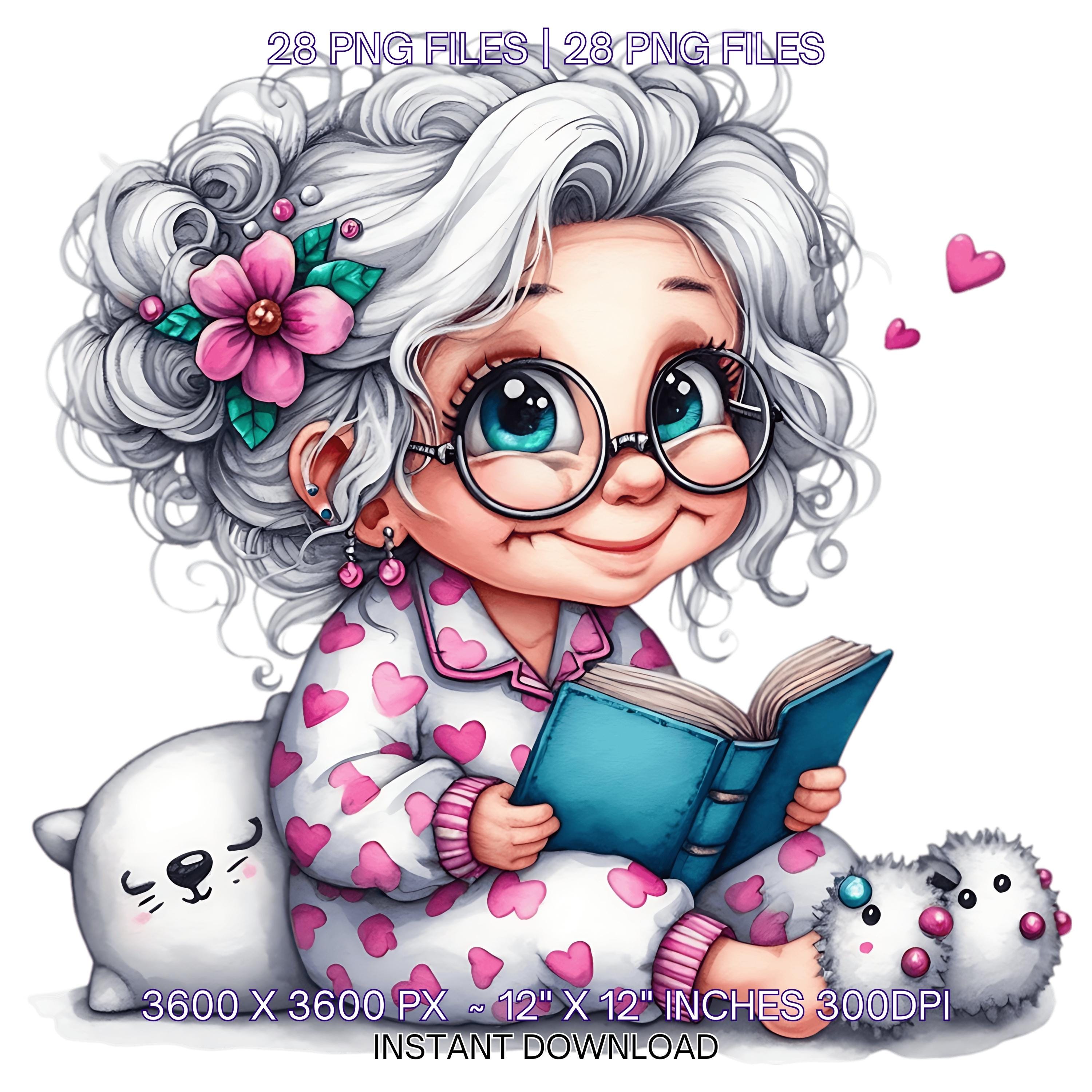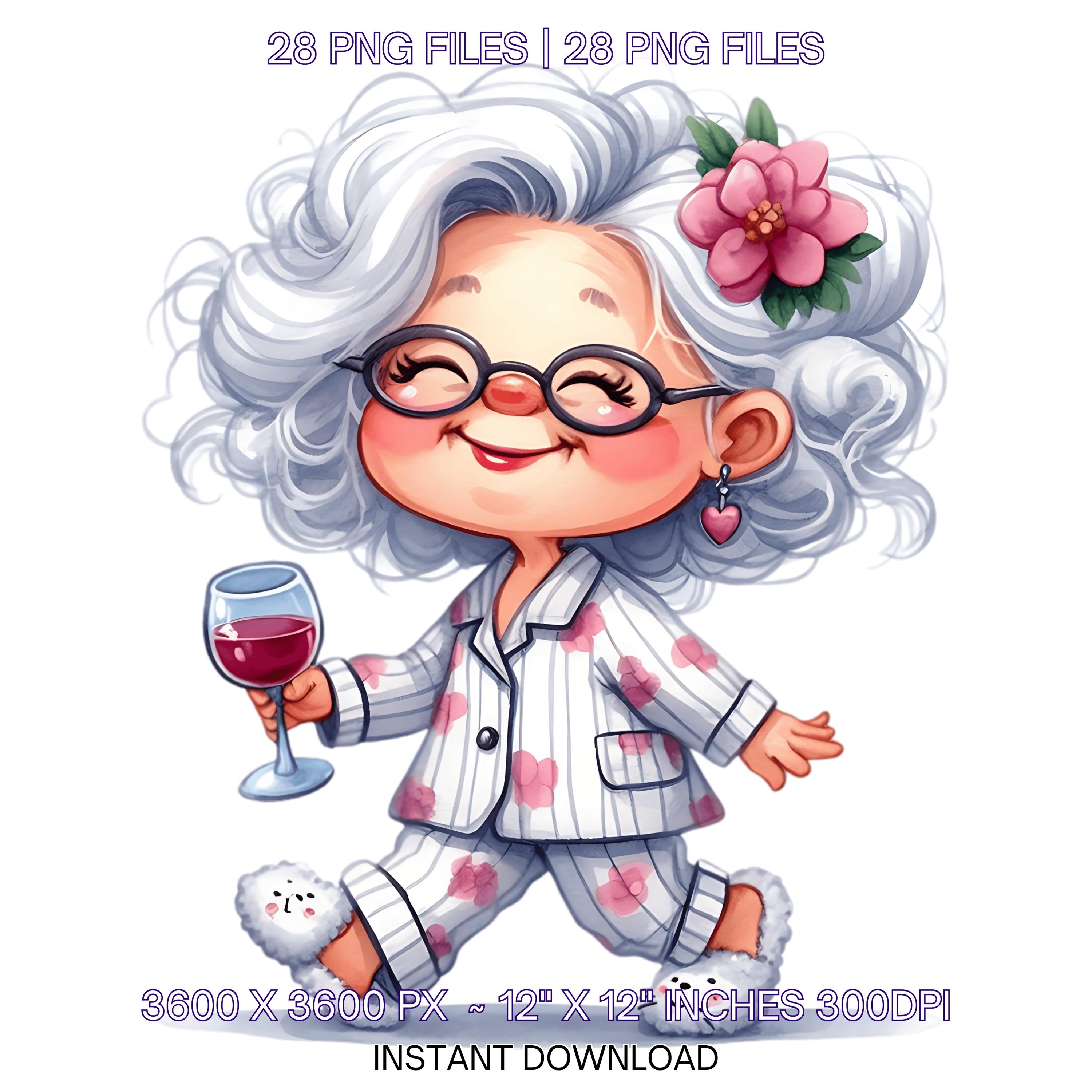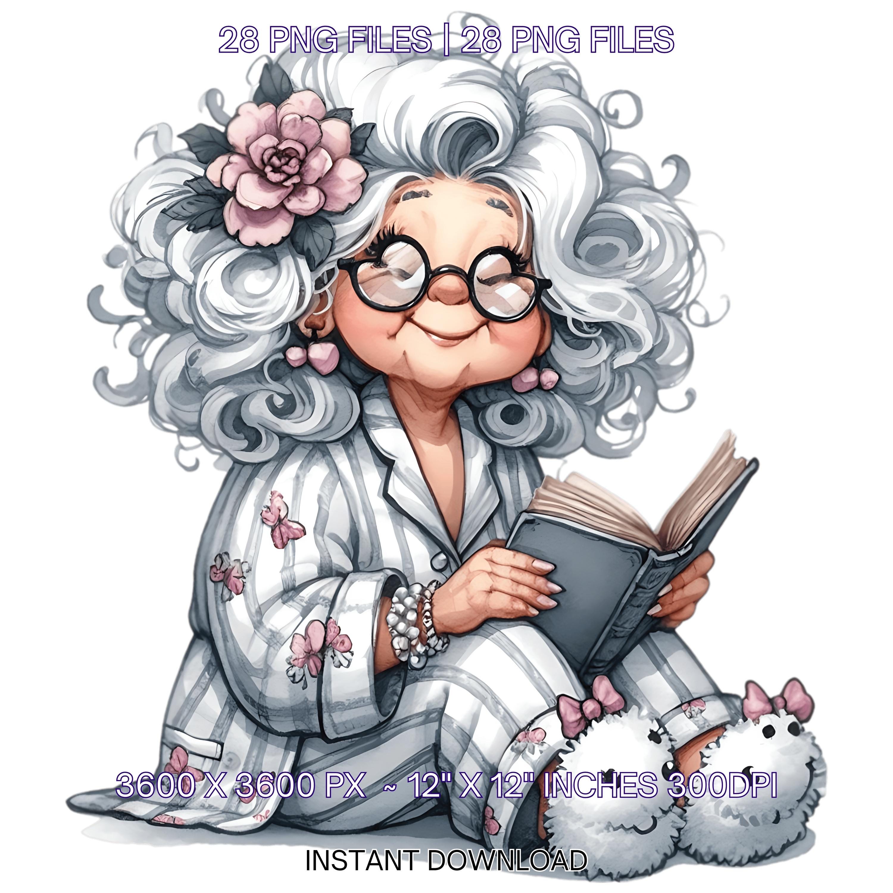 28 Crazy Grandma Day by Day wearing Pijama PNG Clipart | Funny Old Lady Cute Cartoon White Grandma | Happy Woman Sublimation Commercial Use is an eye-catching, high-resolution digital asset designed for creators, crafters, teachers, and small business owners looking to elevate their visuals.
