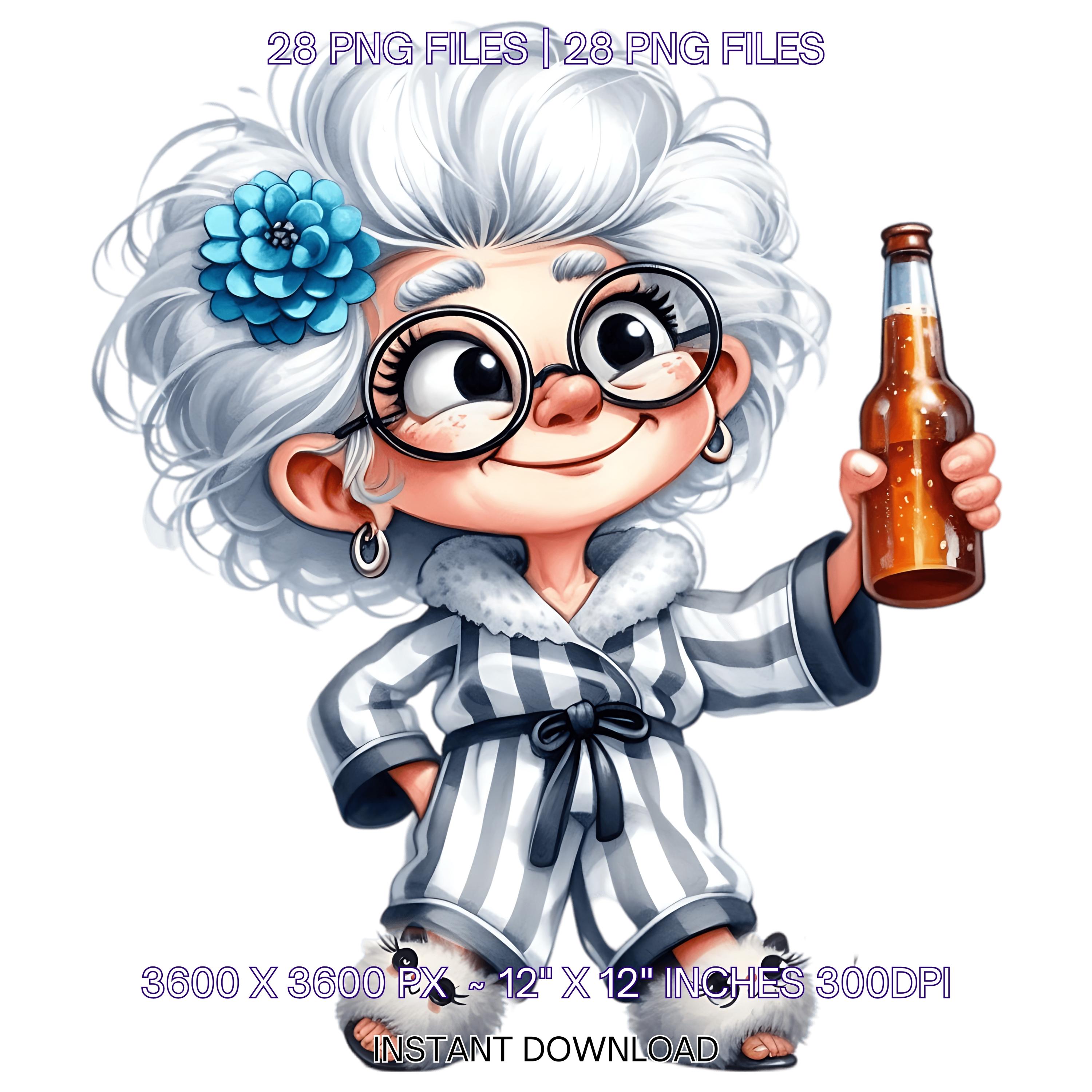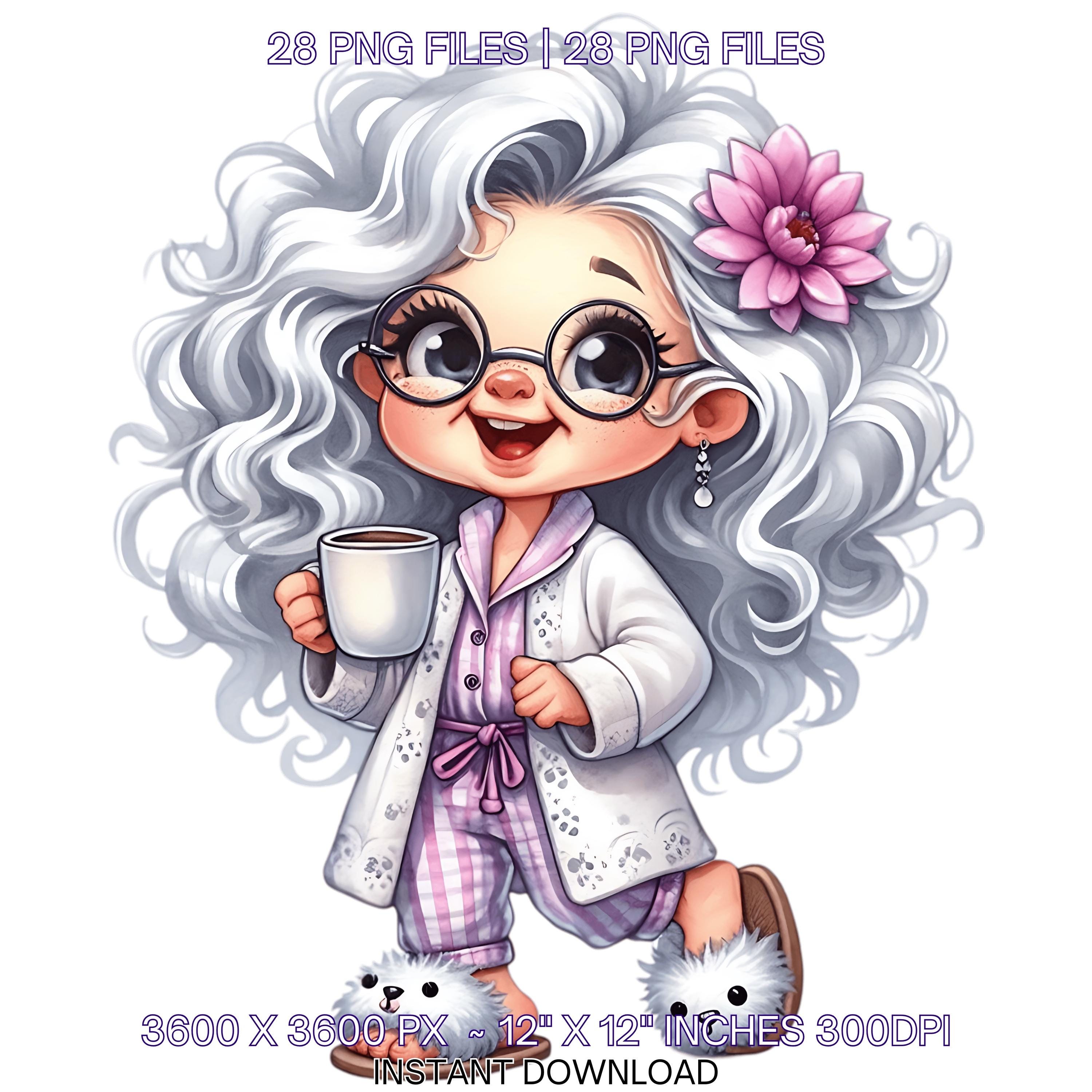 28 Crazy Grandma Day by Day wearing Pijama PNG Clipart | Funny Old Lady Cute Cartoon White Grandma | Happy Woman Sublimation Commercial Use