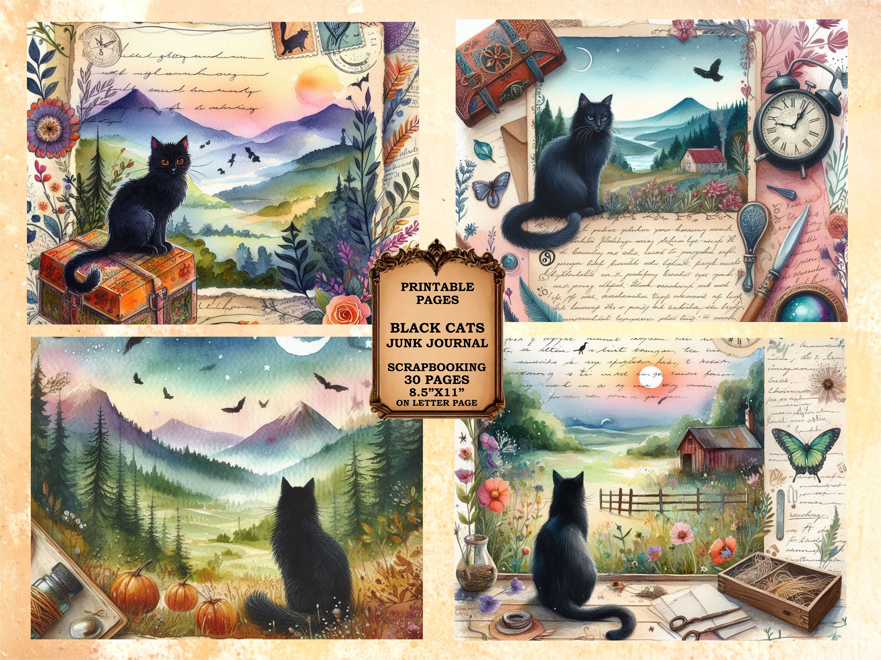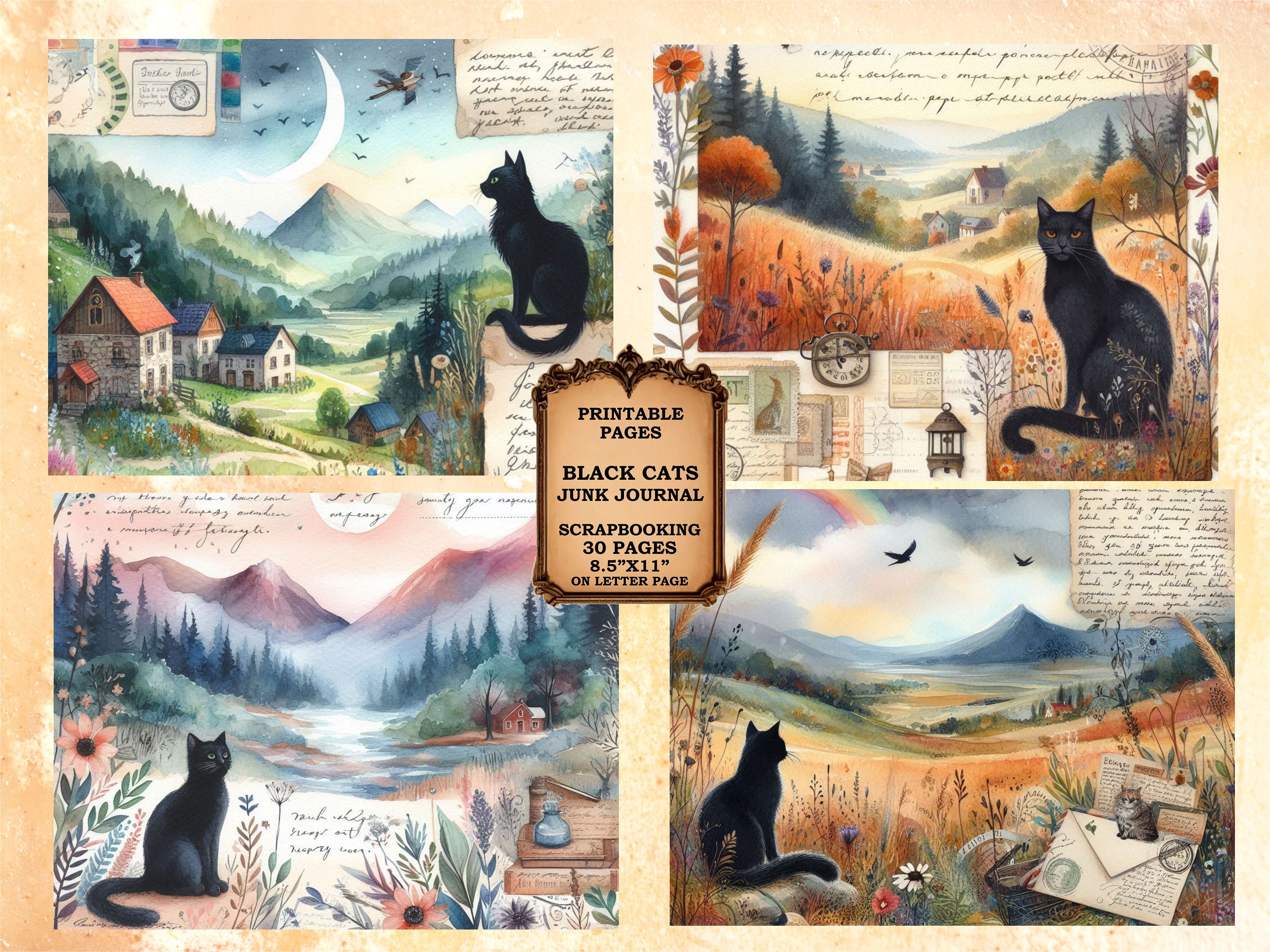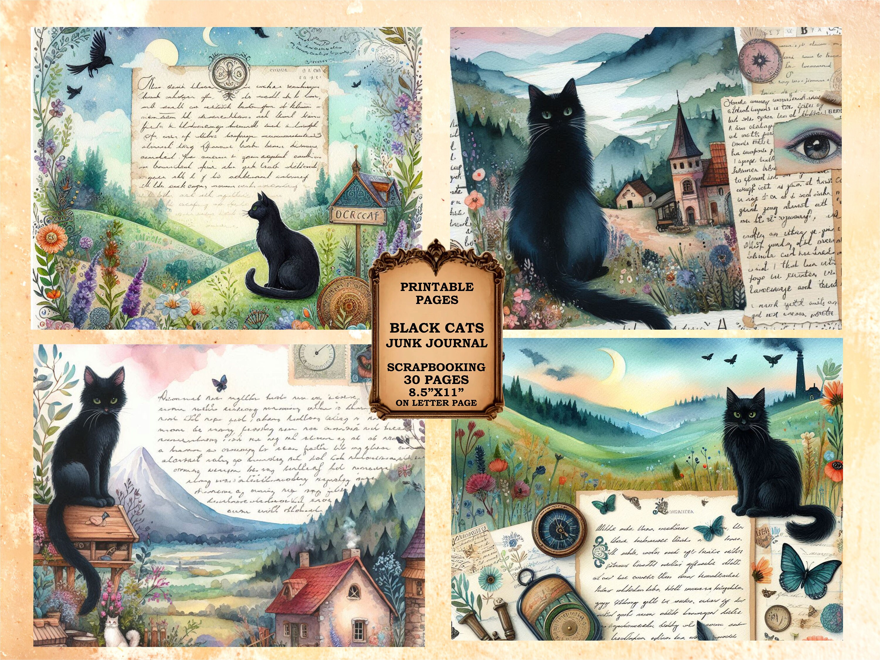 30 printable BLACK CATS themed PAGES for Printable Junk journal, Black Kitten scrapbooking paper Collaged cozy background 8.5”x11” inches is an eye-catching, high-resolution digital asset designed for creators, crafters, teachers, and small business owners looking to elevate their visuals.