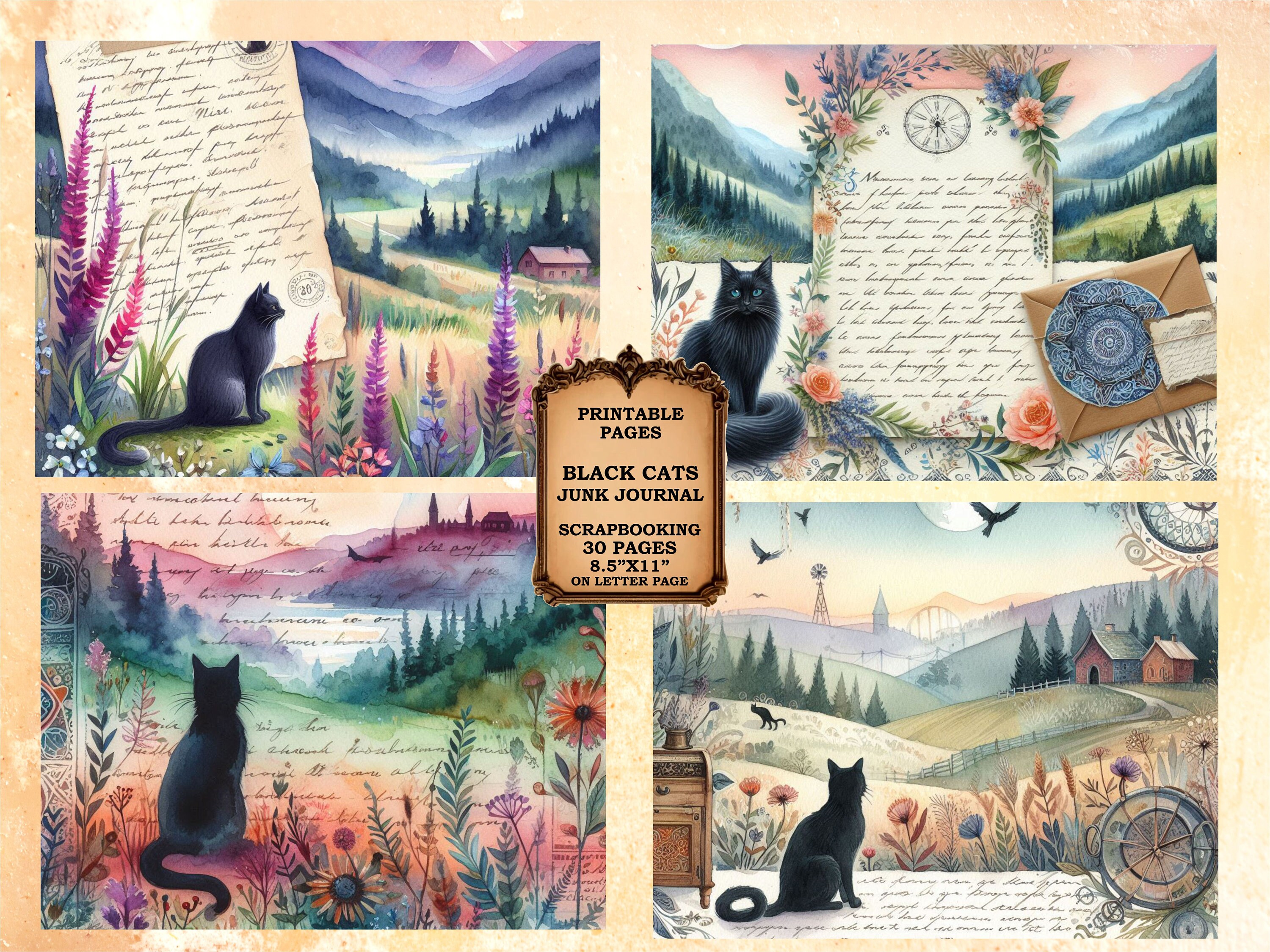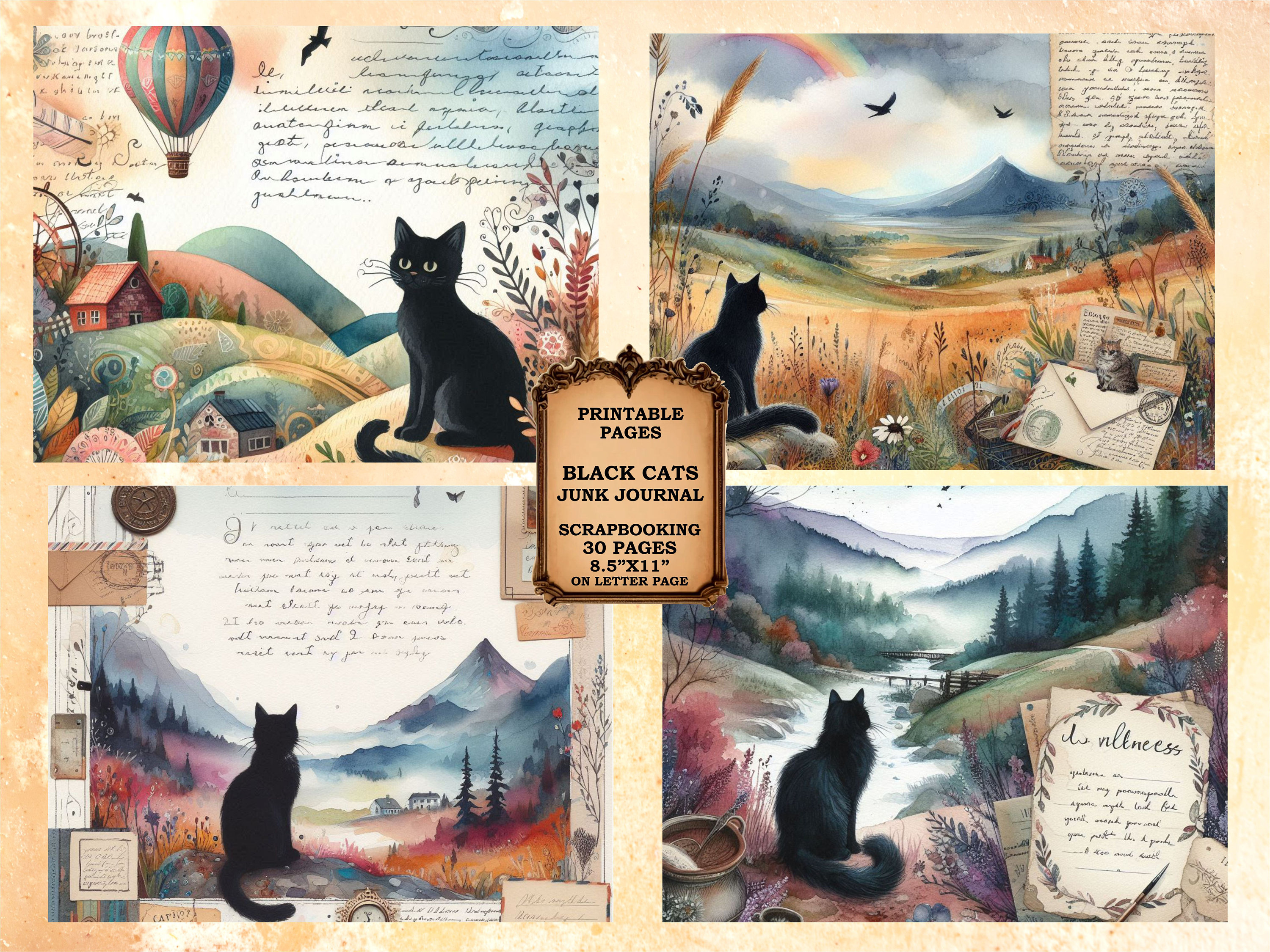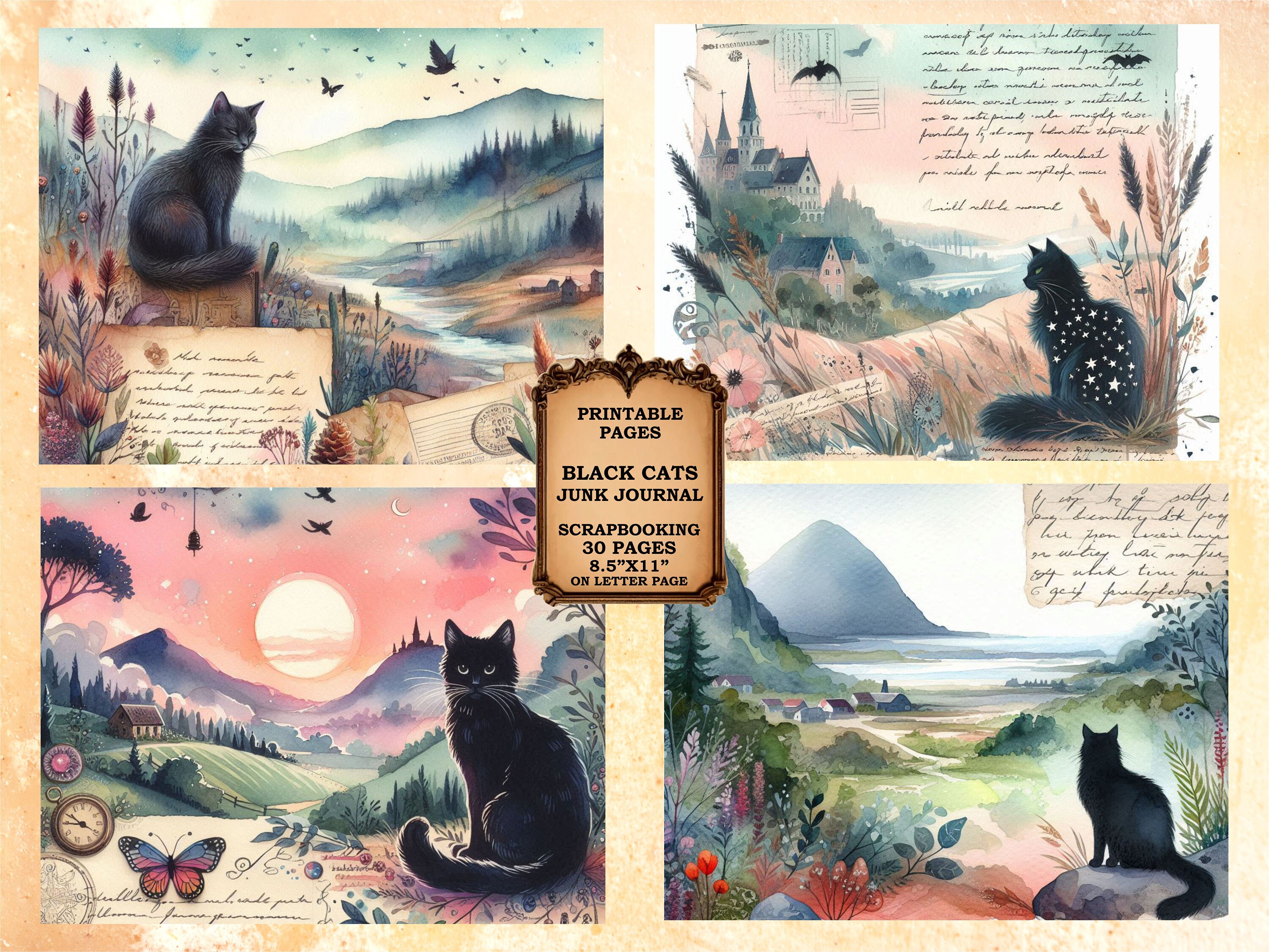 30 printable BLACK CATS themed PAGES for Printable Junk journal, Black Kitten scrapbooking paper Collaged cozy background 8.5”x11” inches is an eye-catching, high-resolution digital asset designed for creators, crafters, teachers, and small business owners looking to elevate their visuals.