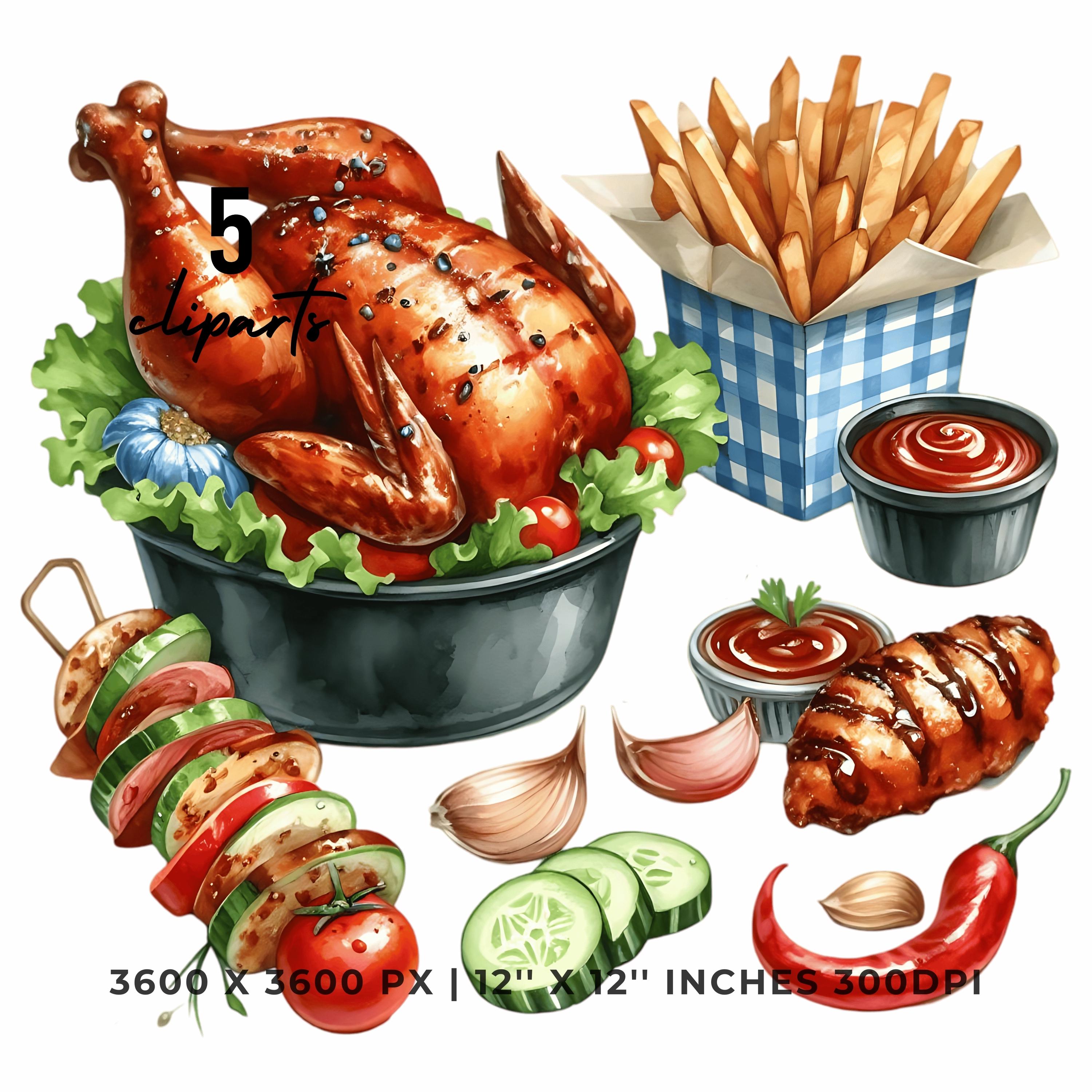 5 BBQ Chicken Clipart | Watercolor Fast Food Clipart | Backyard Party | American Culture PNGs JPGs Bundle Digital Download Commercial Use