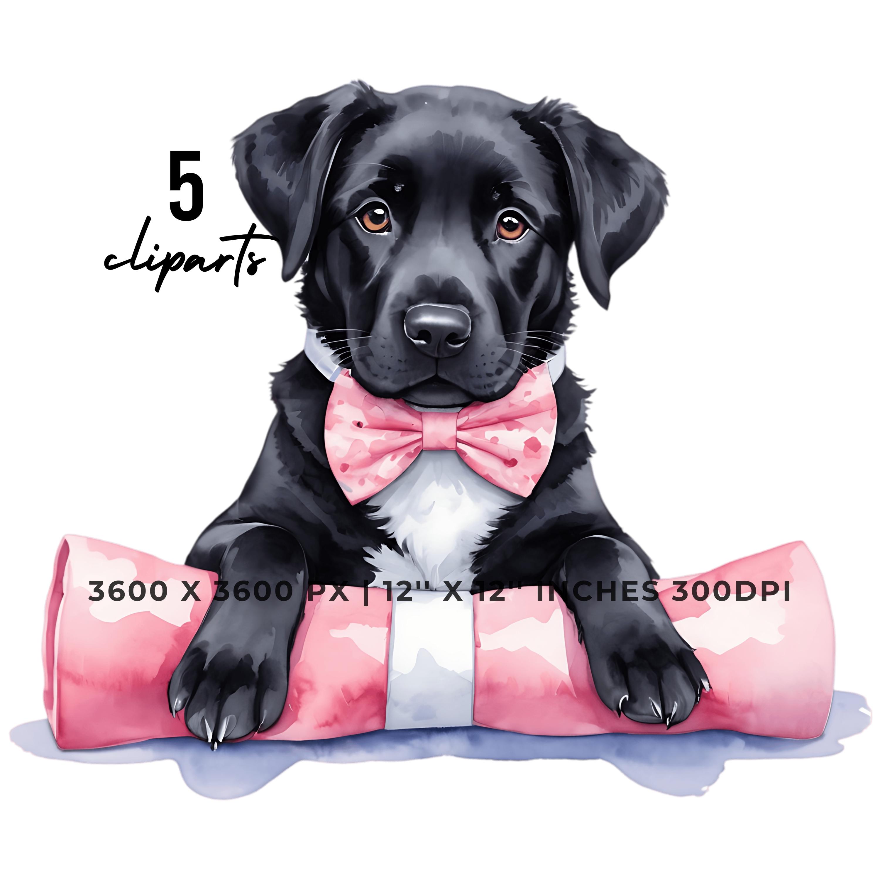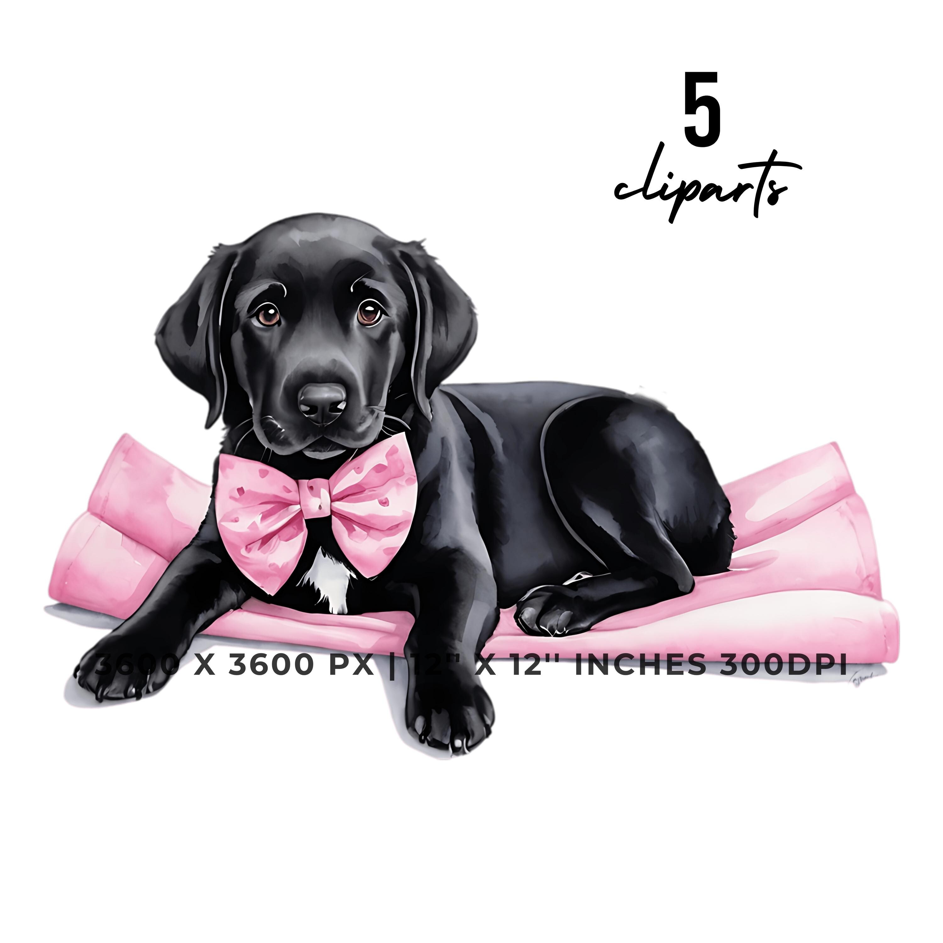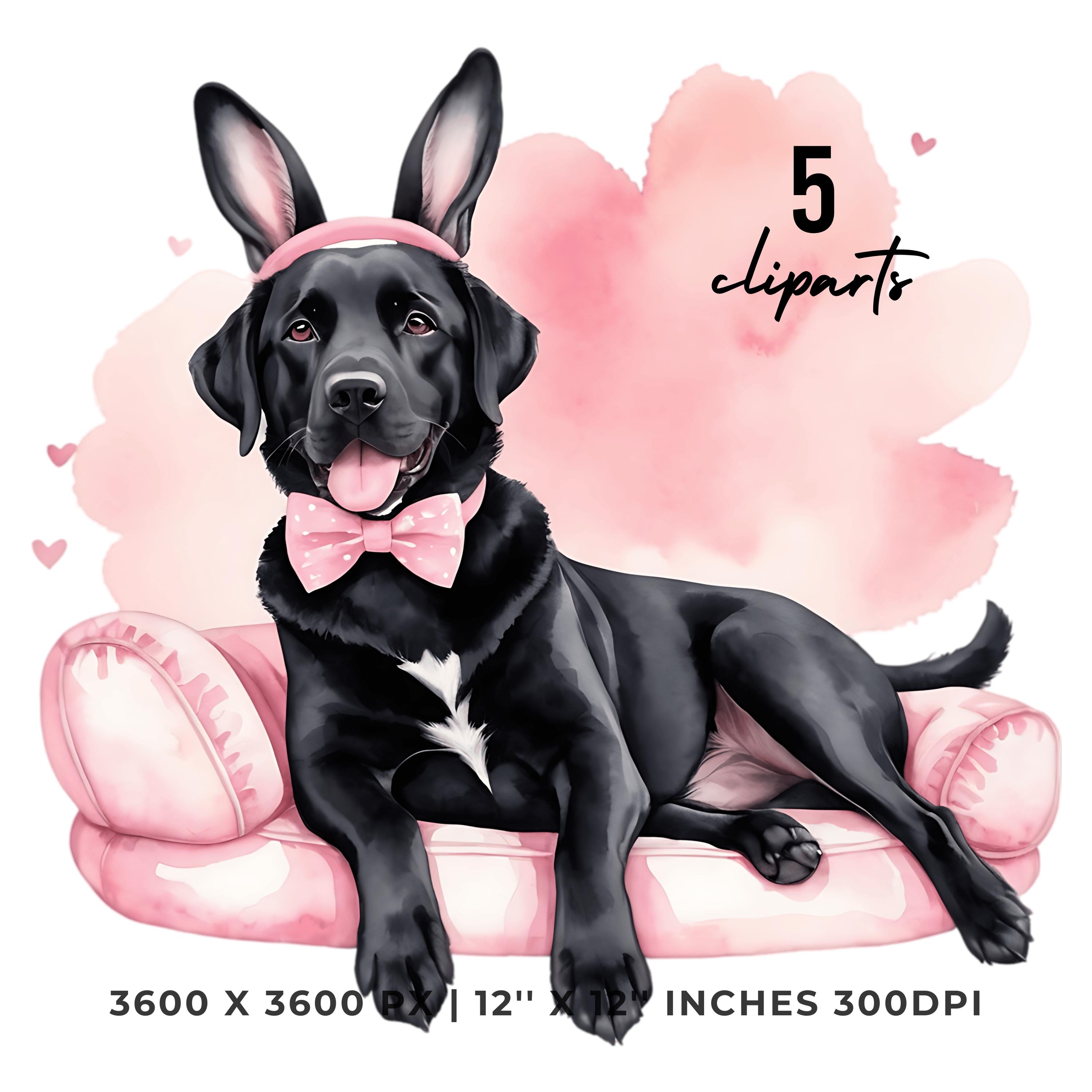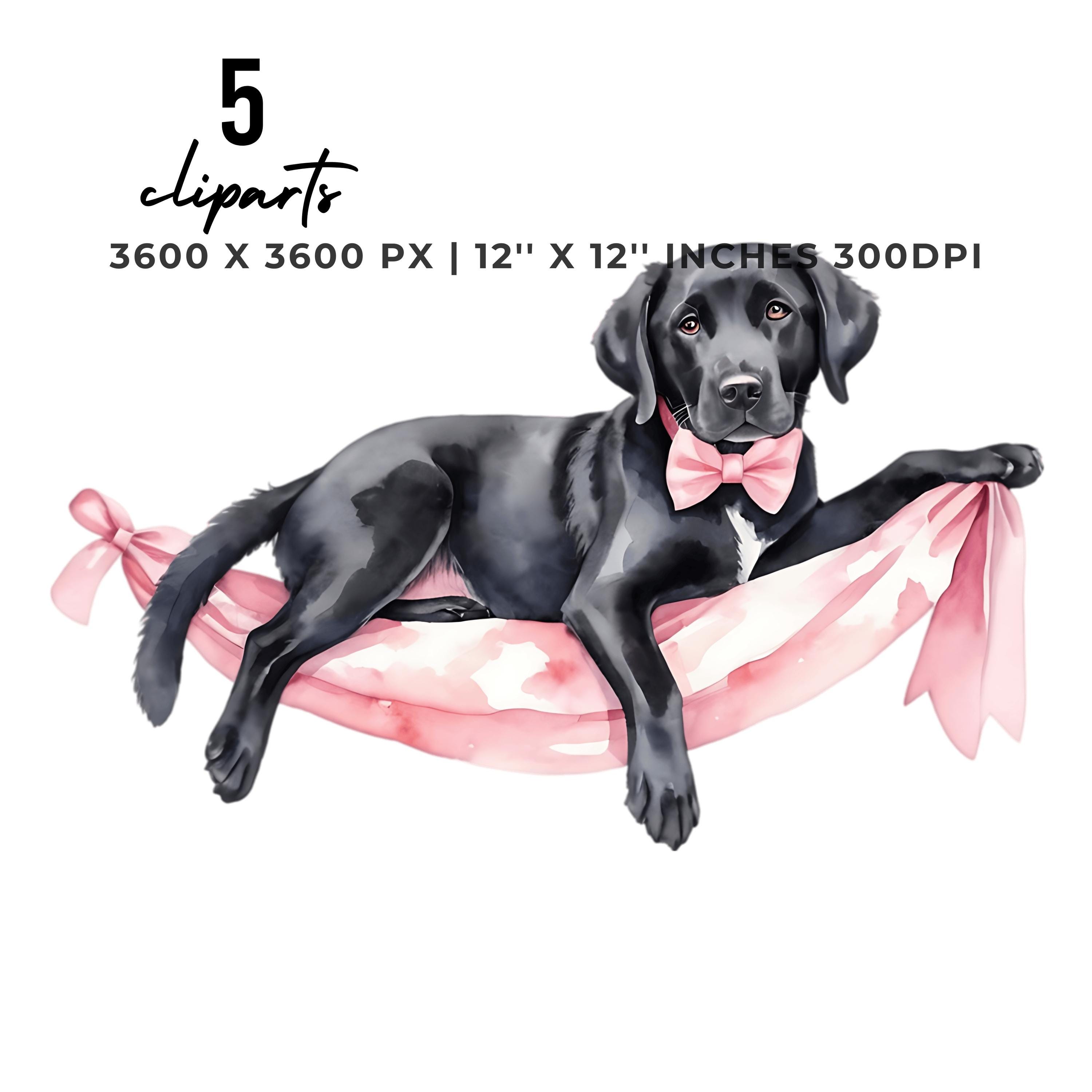 5 Relaxing Black Labrador Retriever Dog wearing Pink Bow Headband Watercolor PNG Clipart for Card, Pet Portrait, Sublimation Commercial Use is an eye-catching, high-resolution digital asset designed for creators, crafters, teachers, and small business owners looking to elevate their visuals.