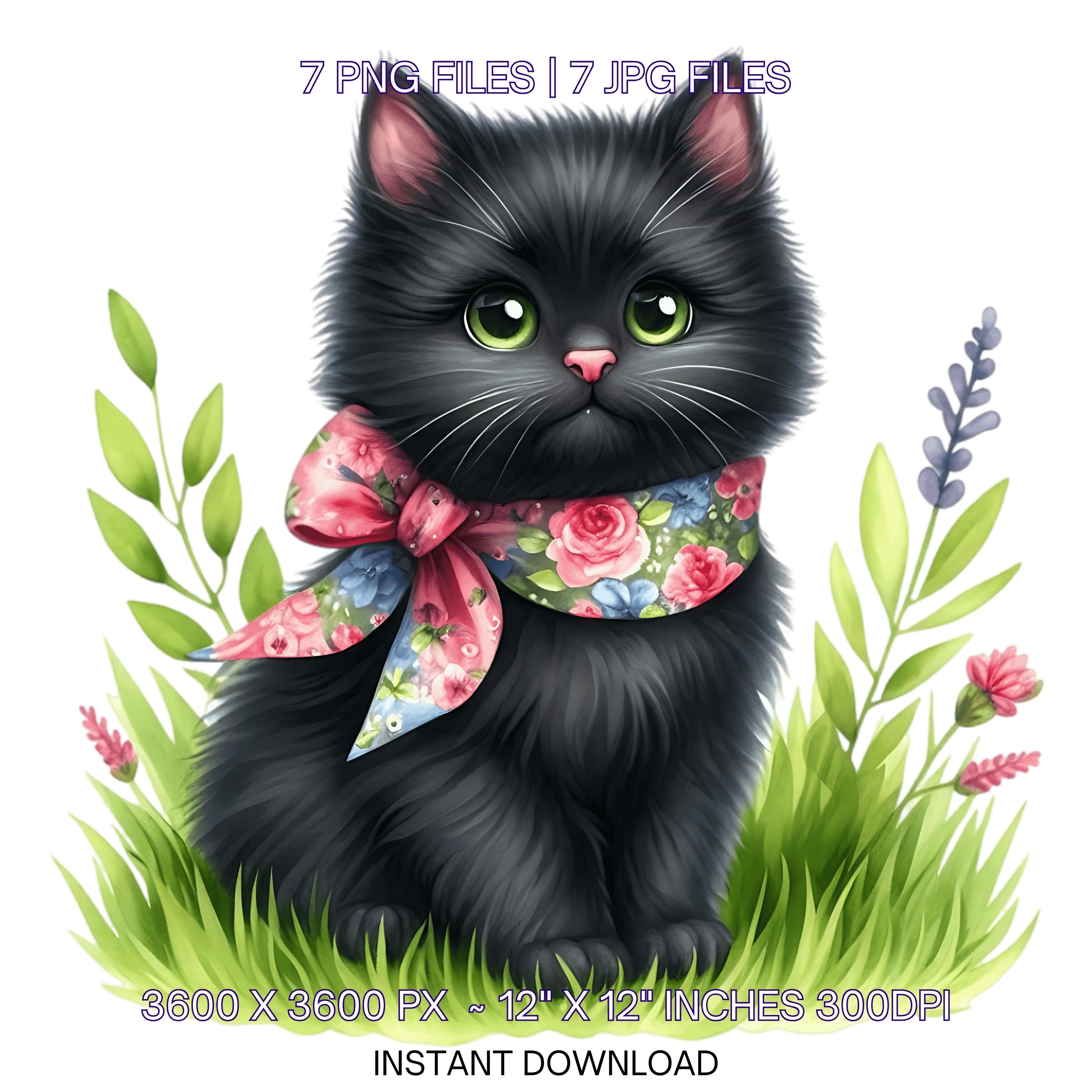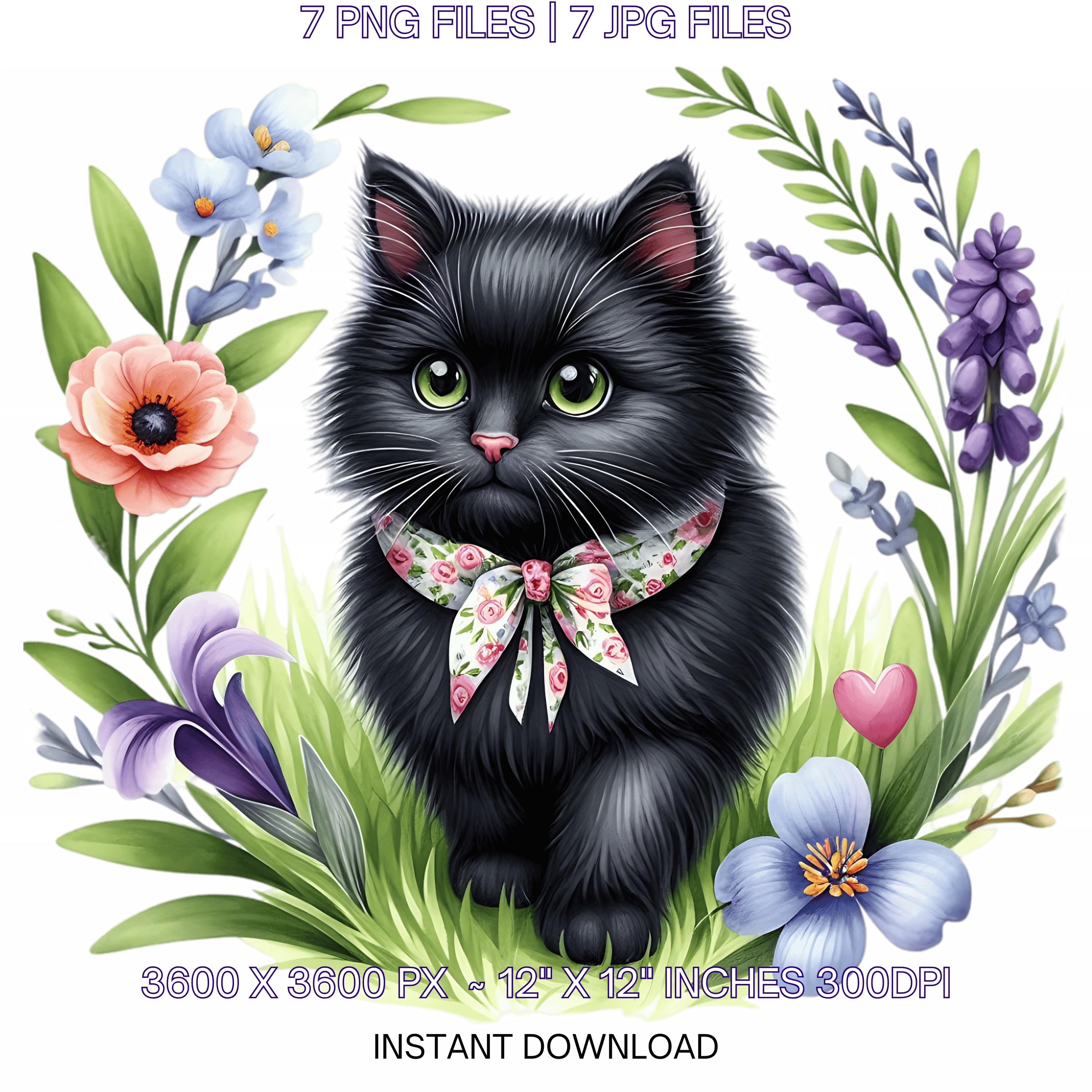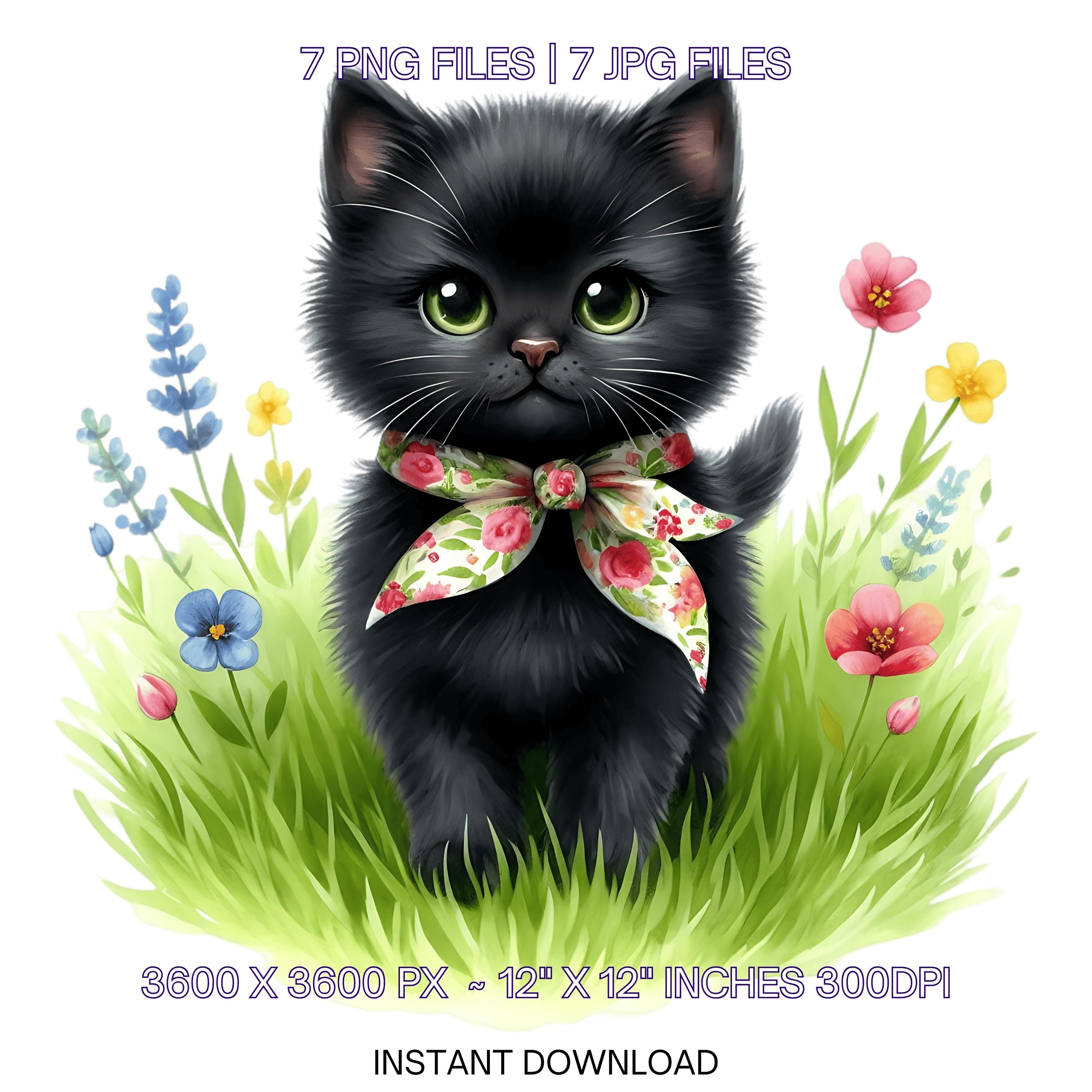 7 Spring Black Little Cat PNG Clipart, Watercolor Cat, Family Pet, Card Making, Scrapbooking, Junk Journaling, Sublimation, Commercial Use is an eye-catching, high-resolution digital asset designed for creators, crafters, teachers, and small business owners looking to elevate their visuals.