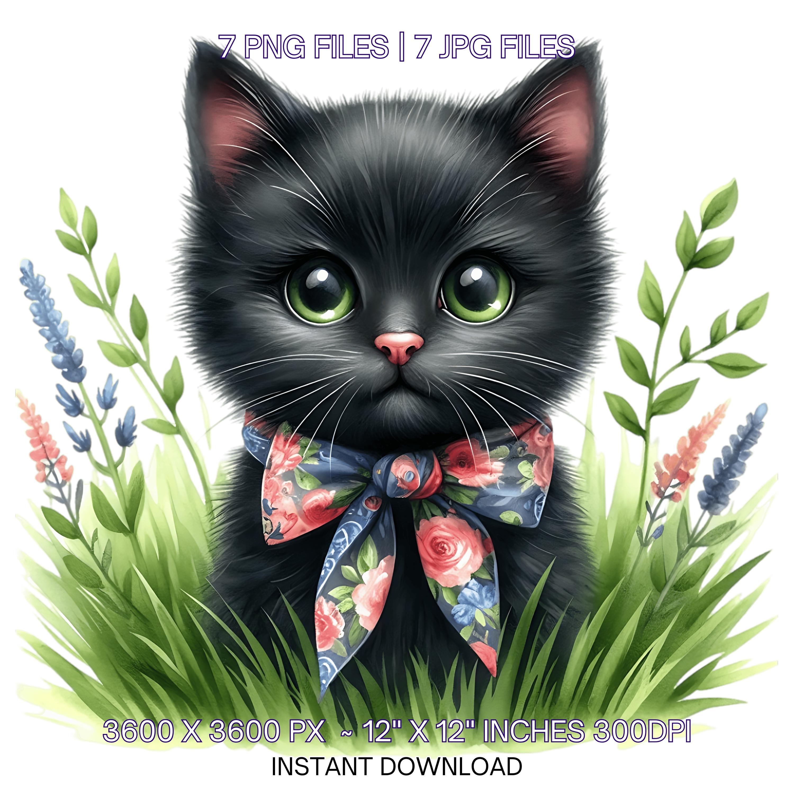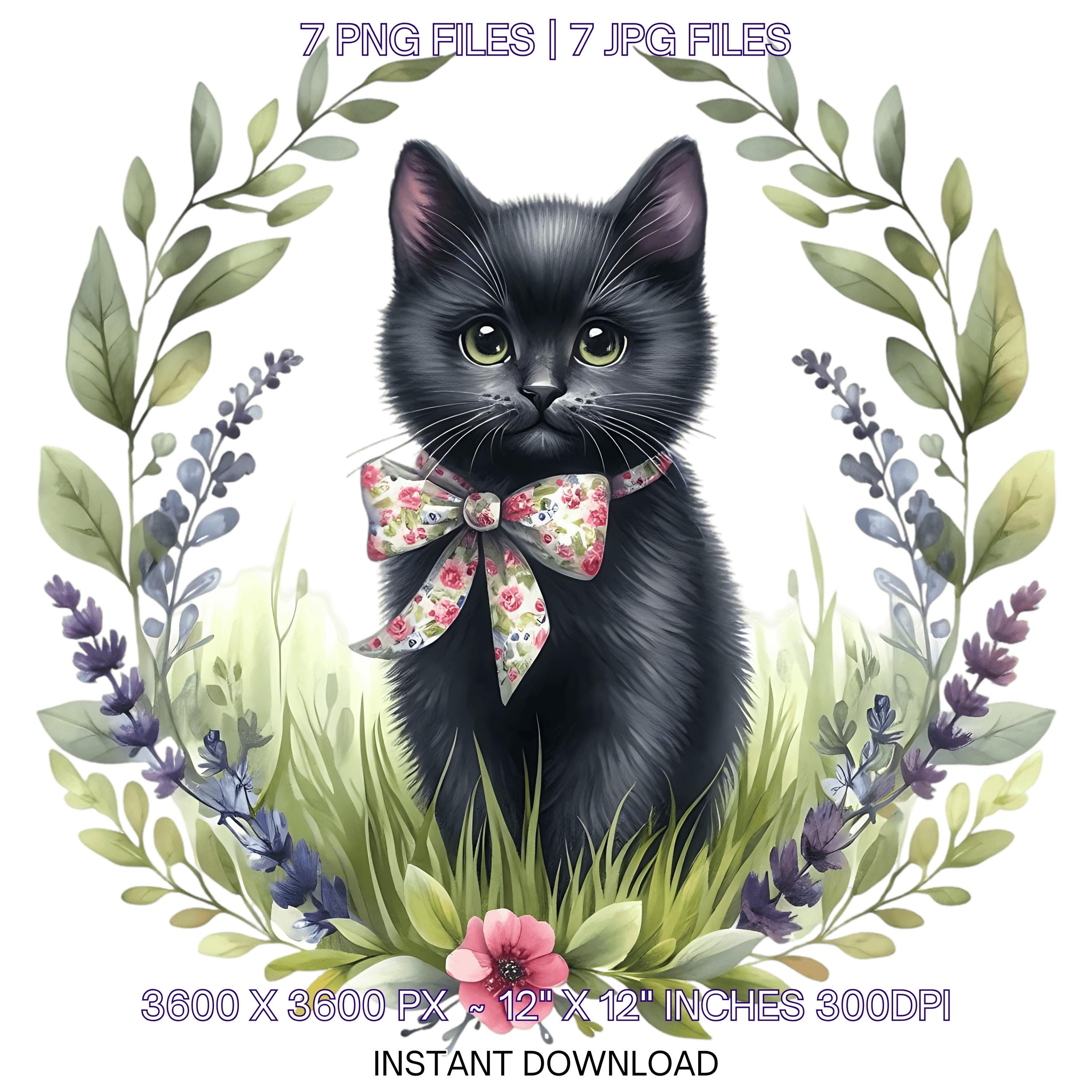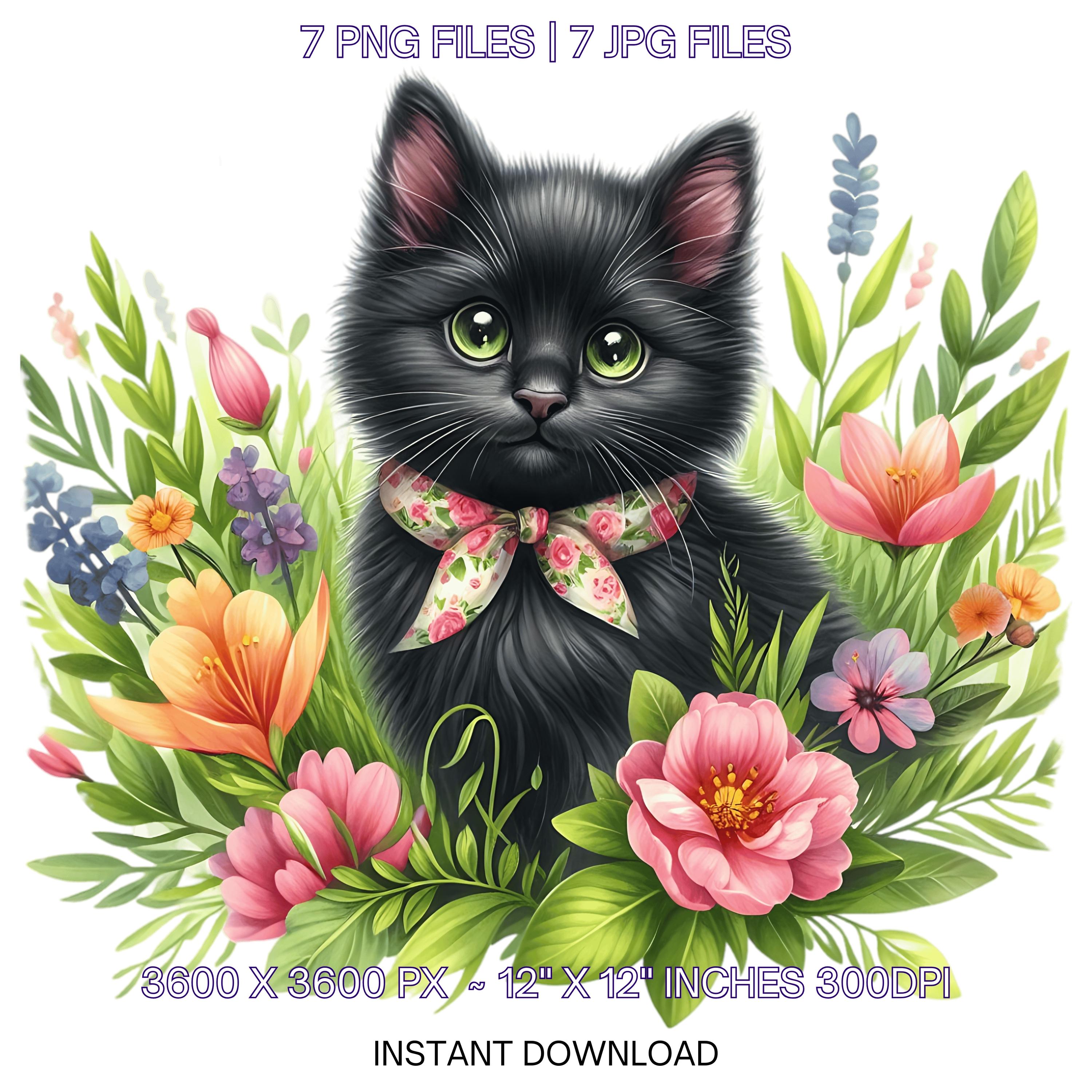7 Spring Black Little Cat PNG Clipart, Watercolor Cat, Family Pet, Card Making, Scrapbooking, Junk Journaling, Sublimation, Commercial Use is an eye-catching, high-resolution digital asset designed for creators, crafters, teachers, and small business owners looking to elevate their visuals.