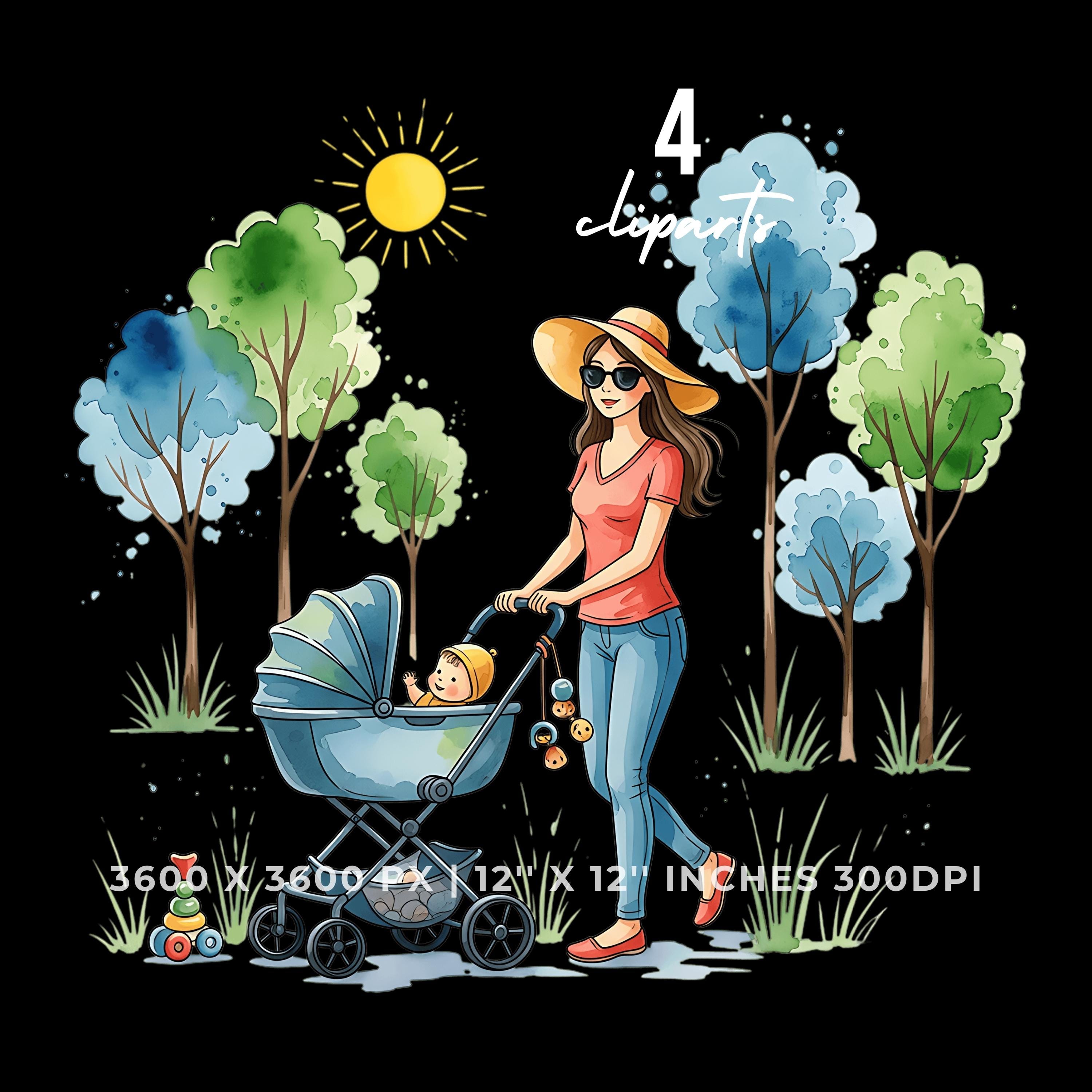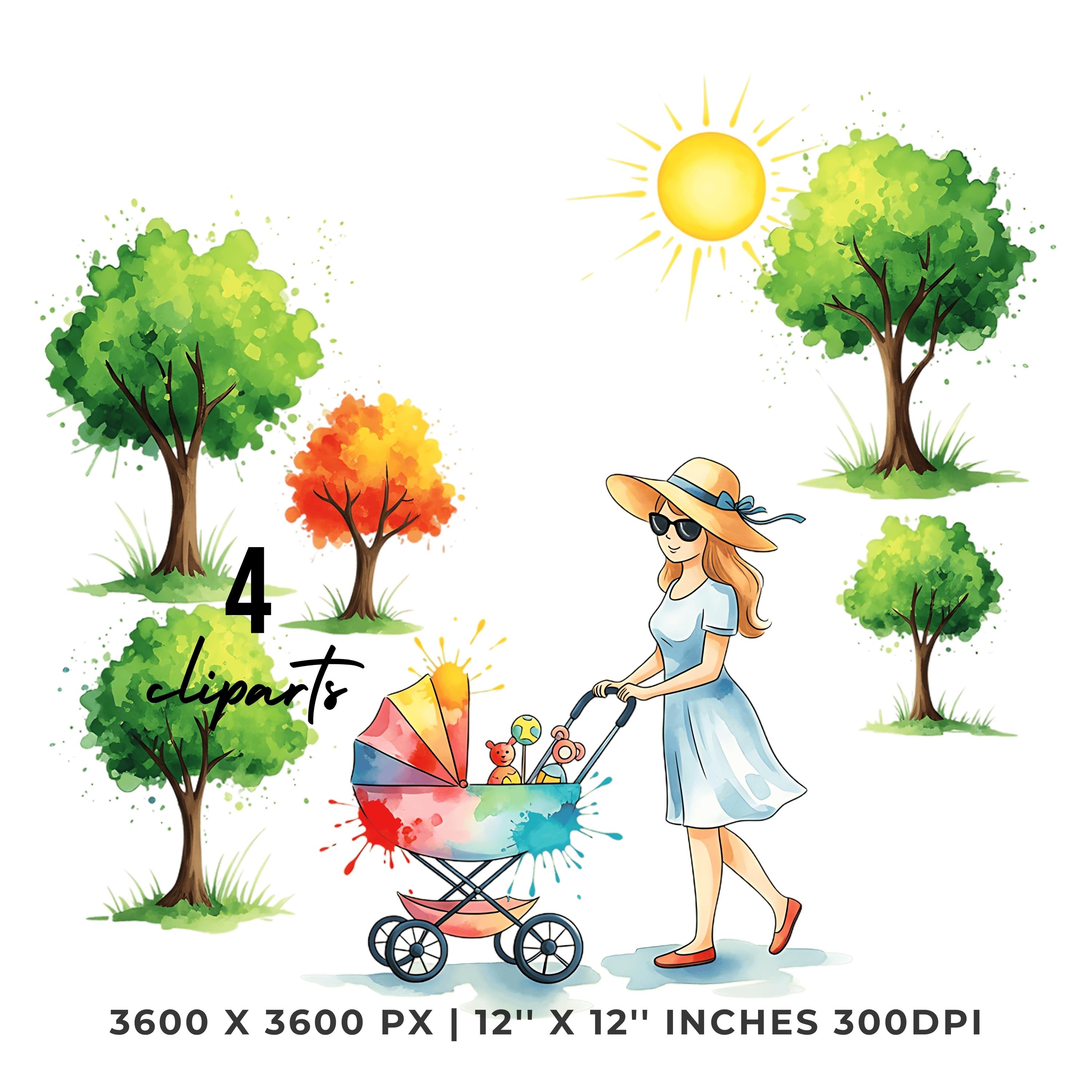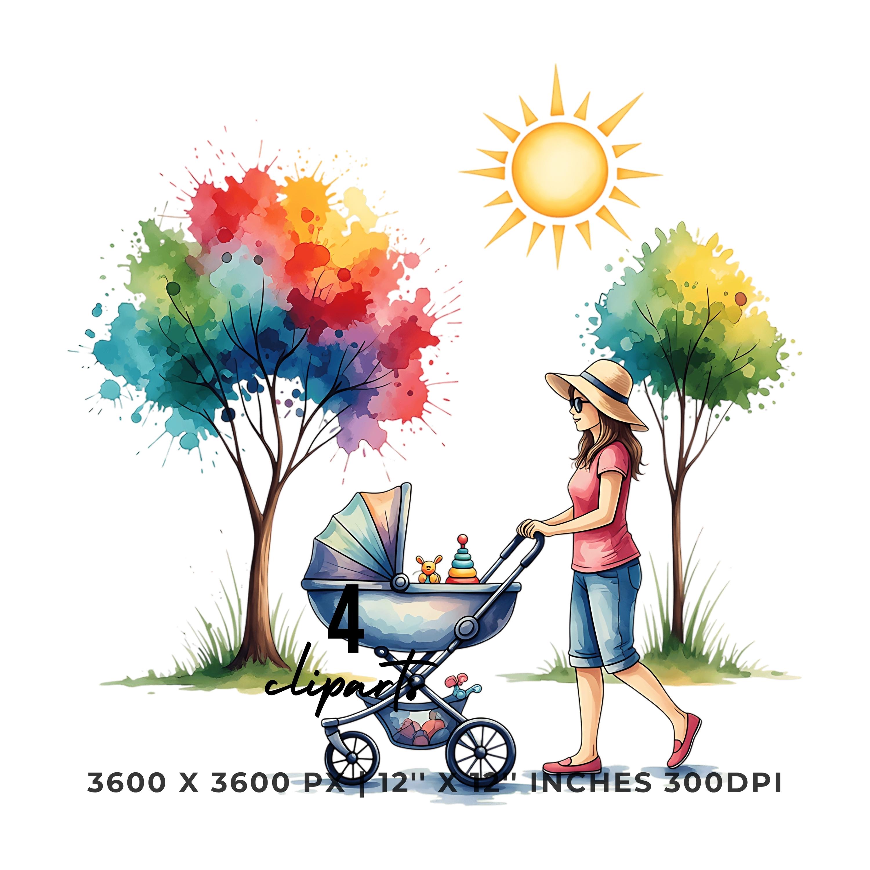 Babysitter PNG Clipart | Watercolor Babysitter pushing a stroller through a sunny park | 4 PNG – 4 JPG Graphic Commercial Use is an eye-catching, high-resolution digital asset designed for creators, crafters, teachers, and small business owners looking to elevate their visuals.