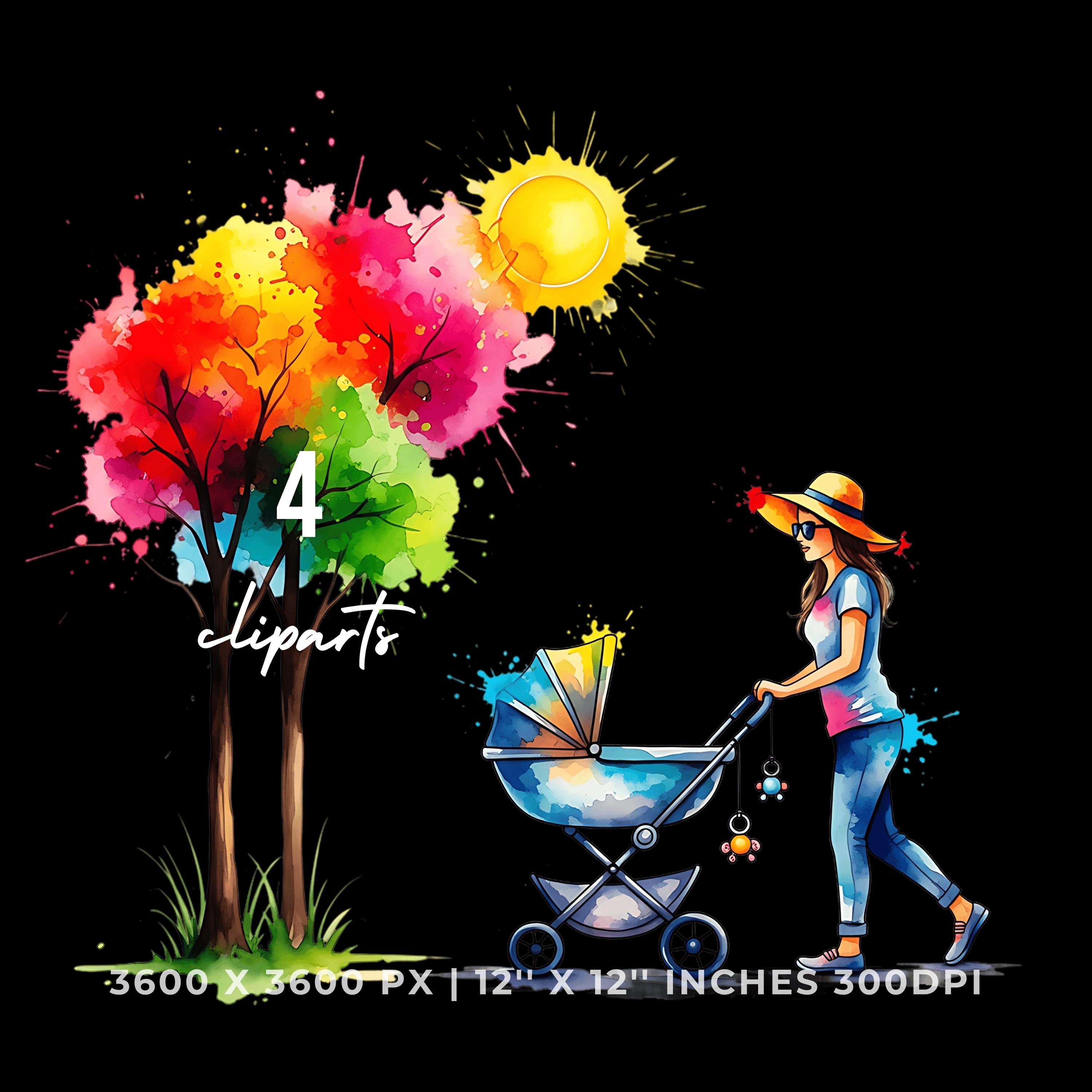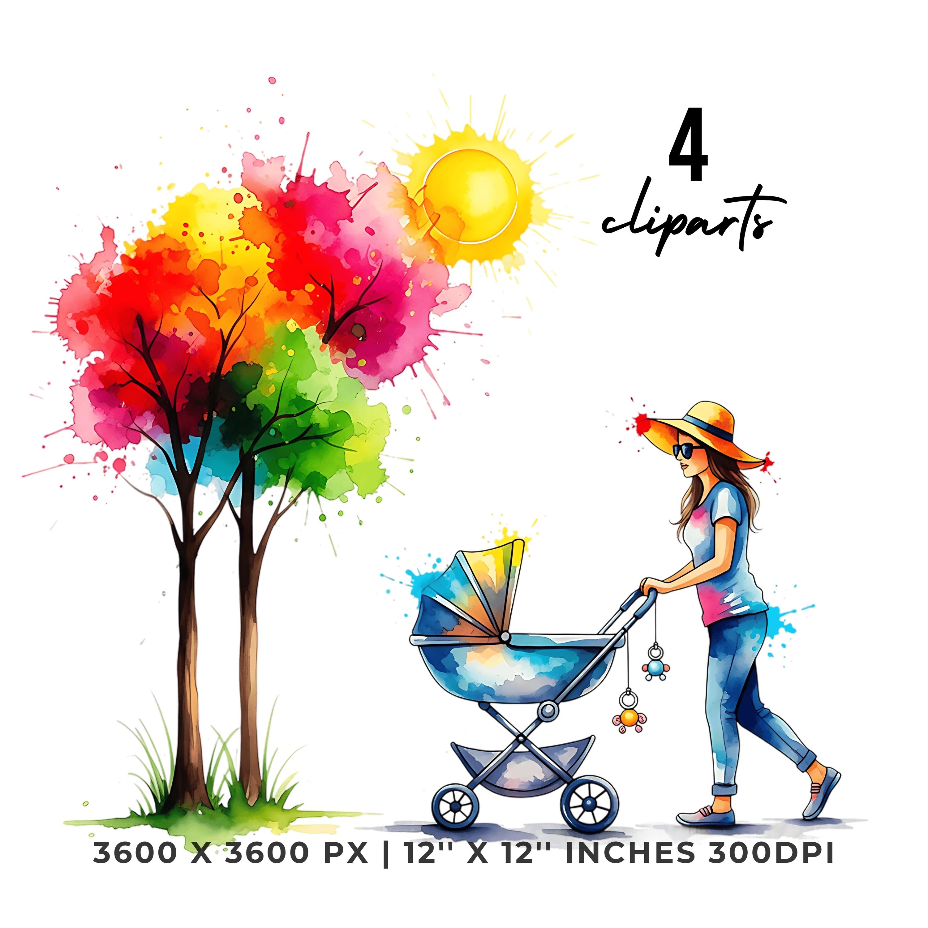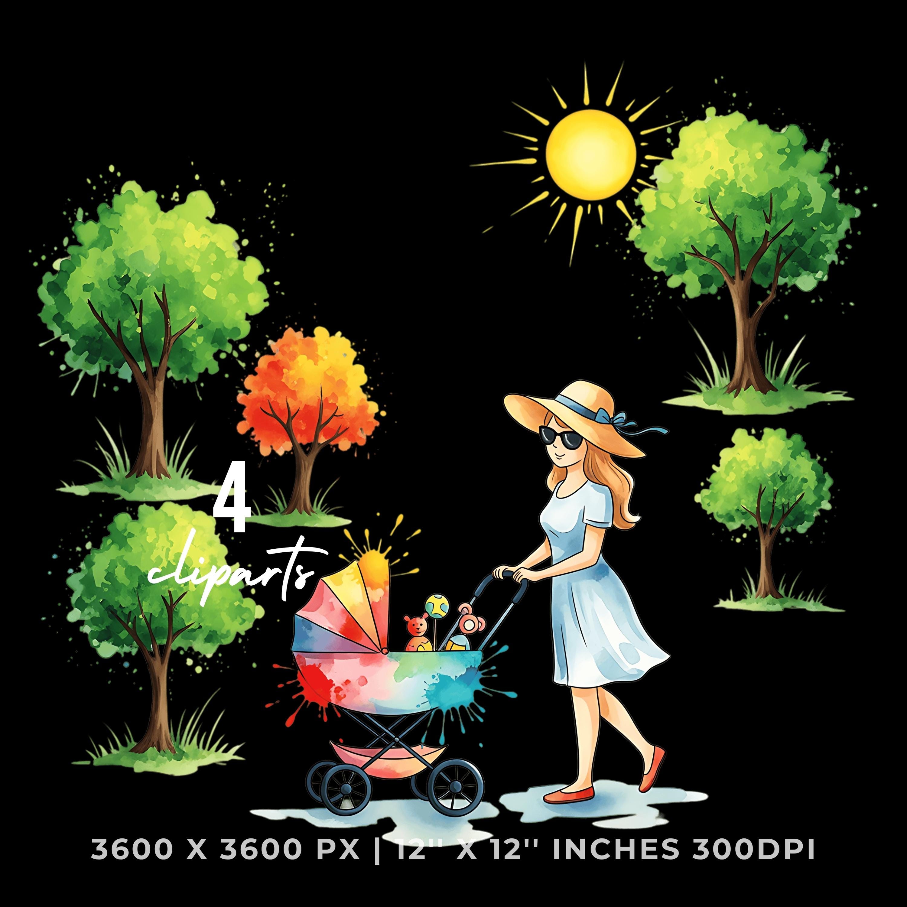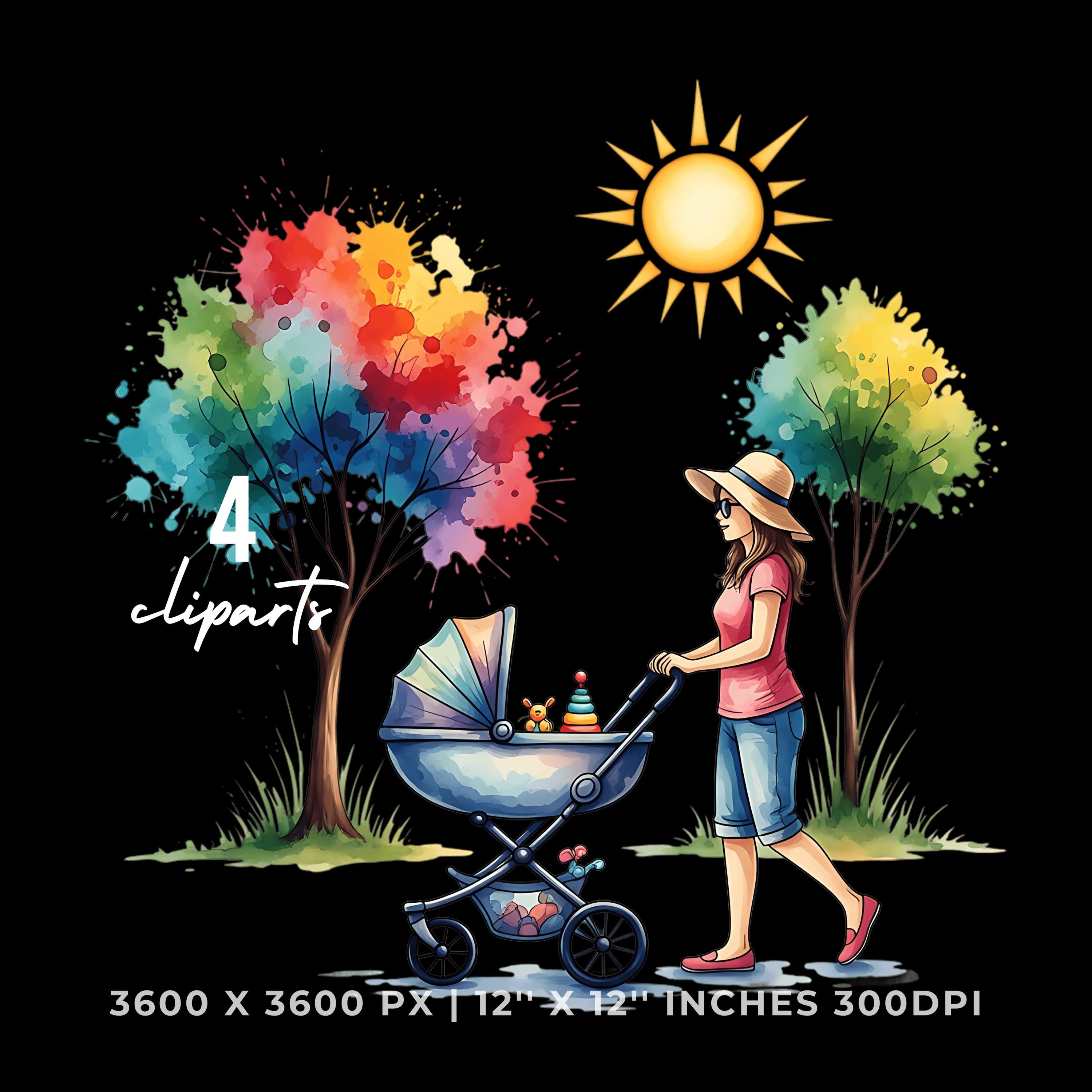 Babysitter PNG Clipart | Watercolor Babysitter pushing a stroller through a sunny park | 4 PNG – 4 JPG Graphic Commercial Use is an eye-catching, high-resolution digital asset designed for creators, crafters, teachers, and small business owners looking to elevate their visuals.