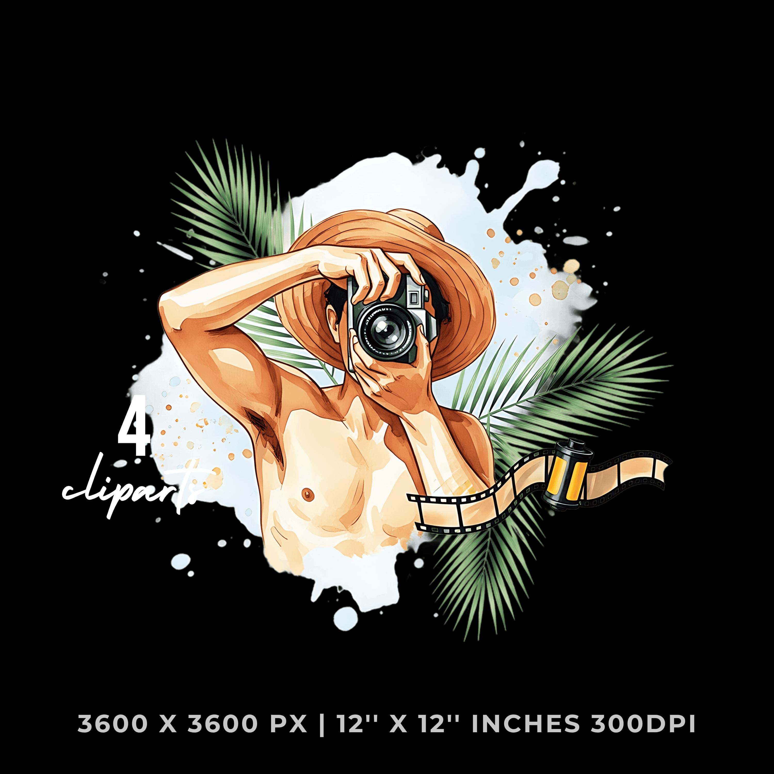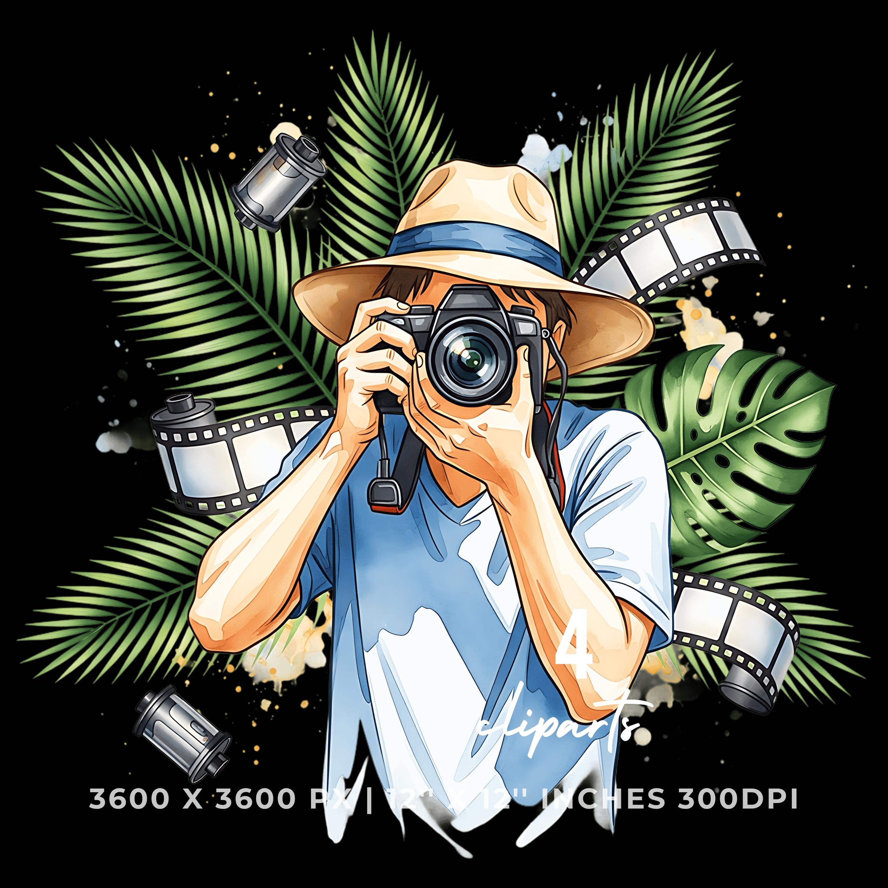 Beach photographer PNG Clipart | Watercolor Beach photographer snapping a shot with a camera, sunhat tilted, film roll & palm leaves | Summer job 4 PNG – 4 JPG Graphic Commercial Use