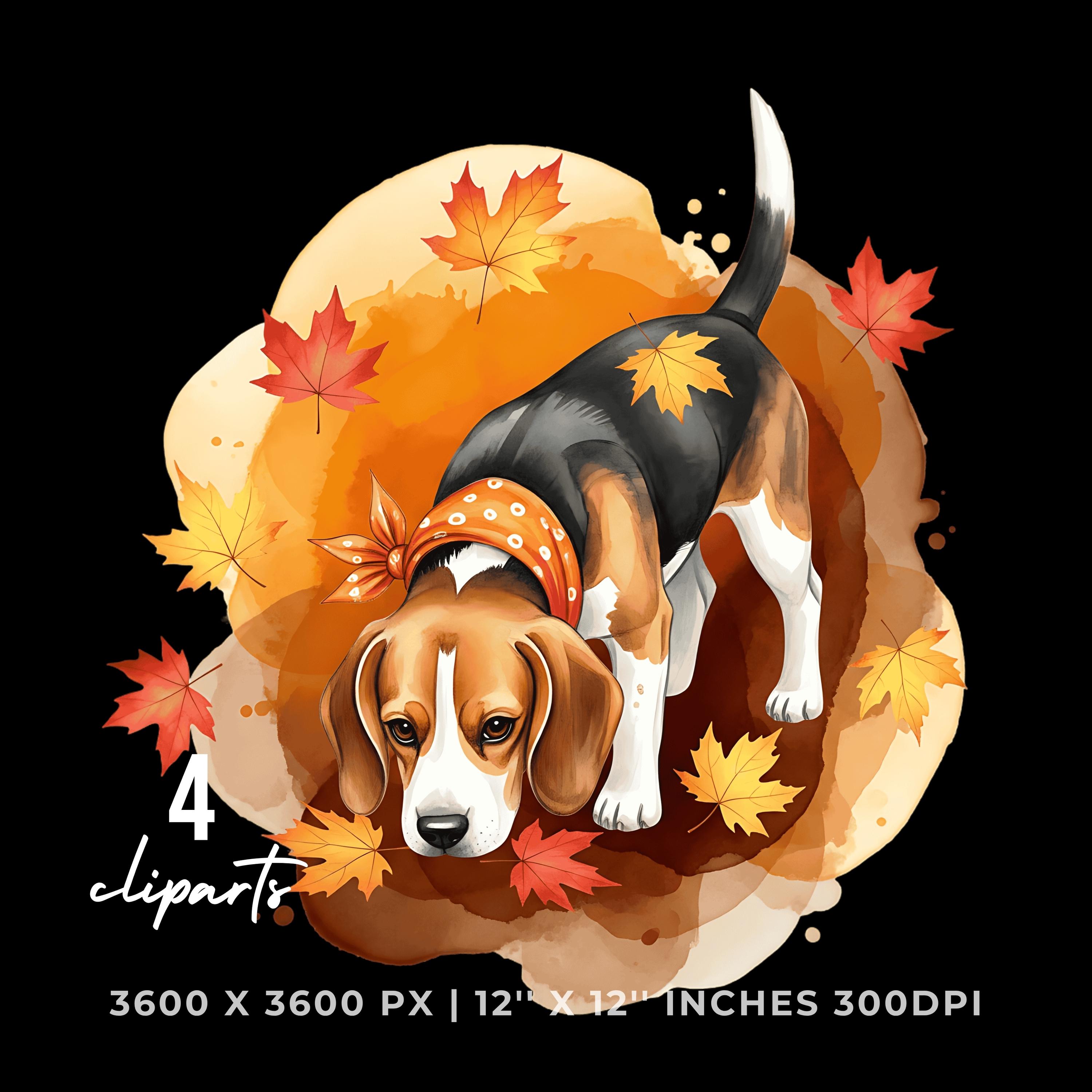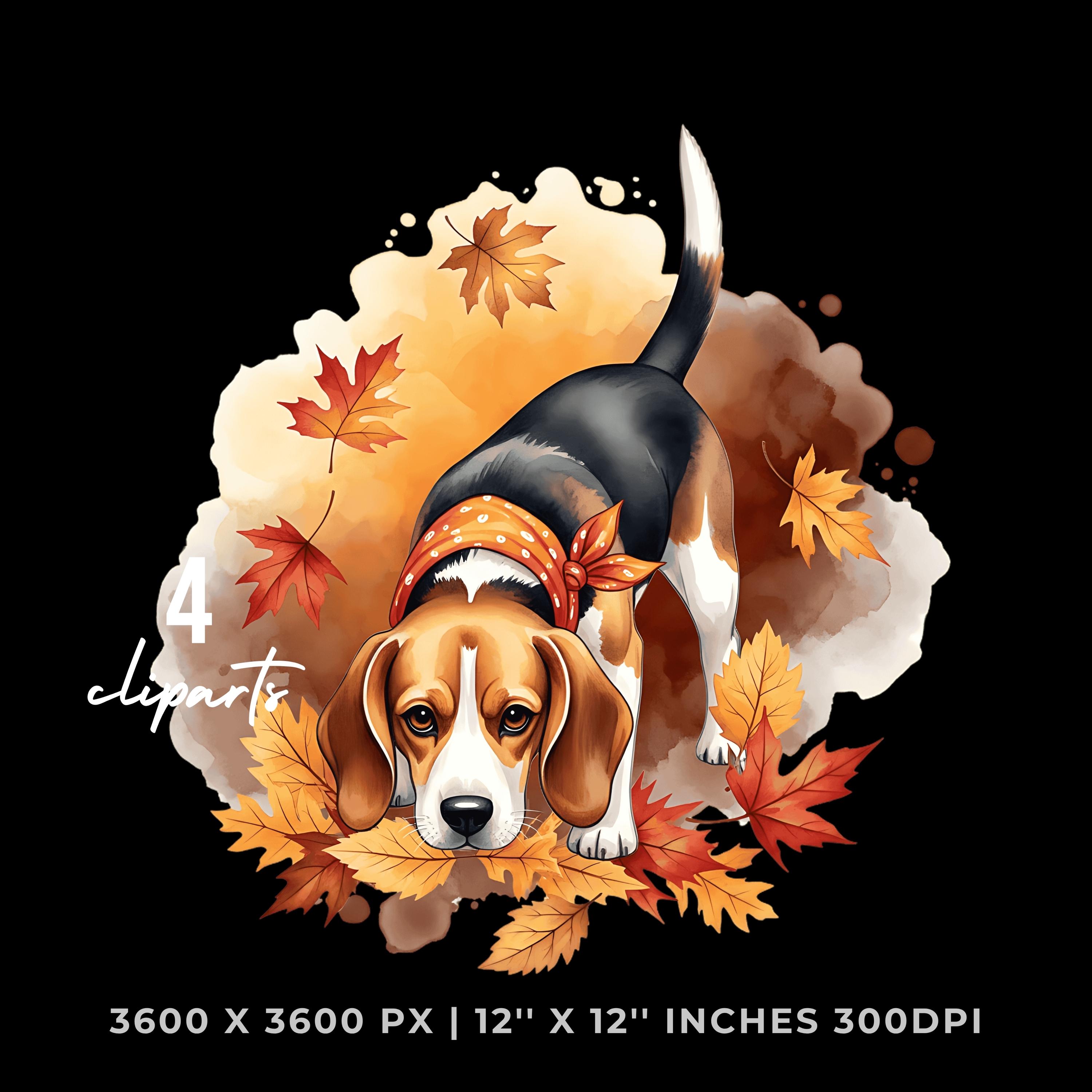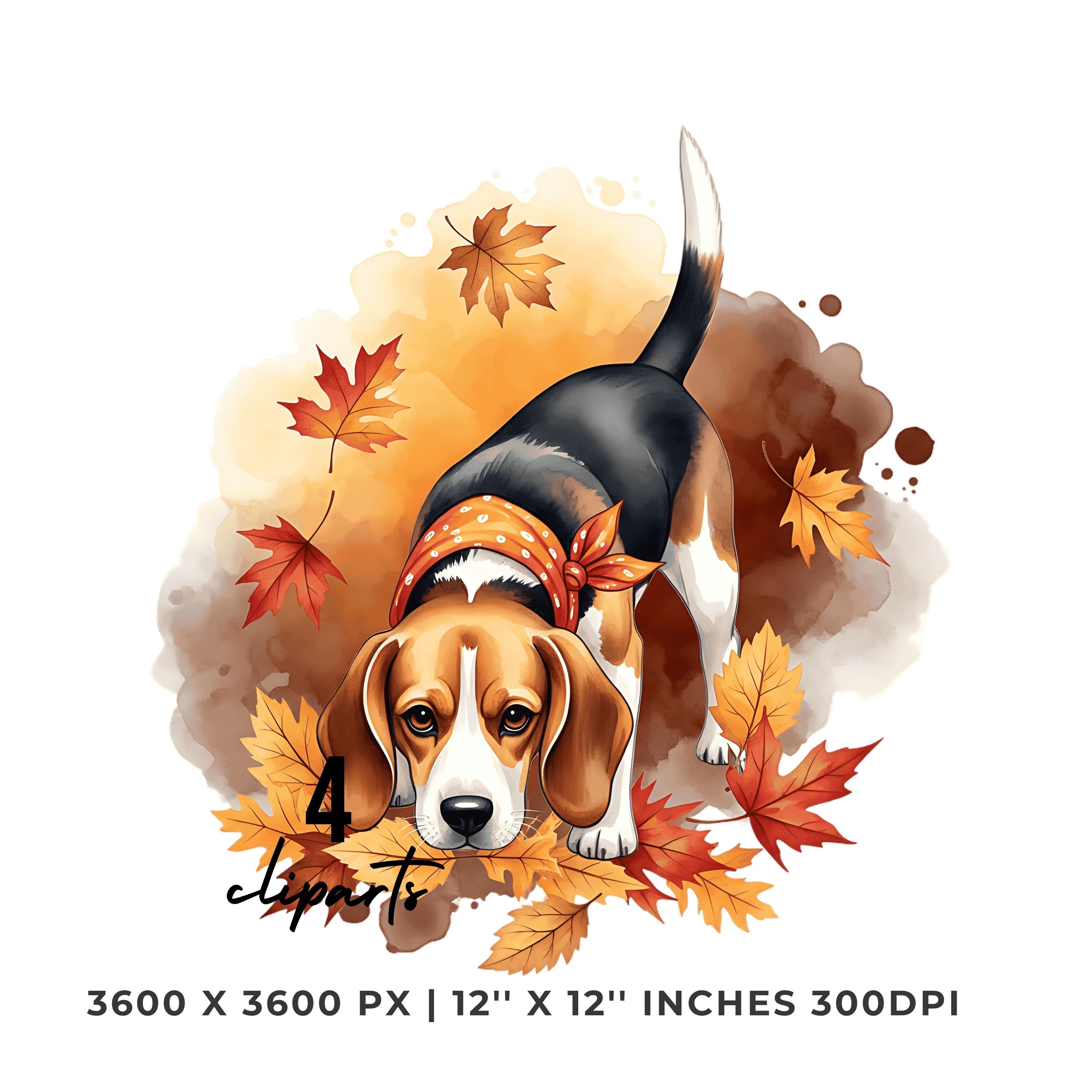 Beagle Clipart PNG | Watercolor Beagle nose to the ground, tracking a scent trail through autumn leaves | Autumn 4 PNG 4 JPG Sublimation Transparent Commercial Use