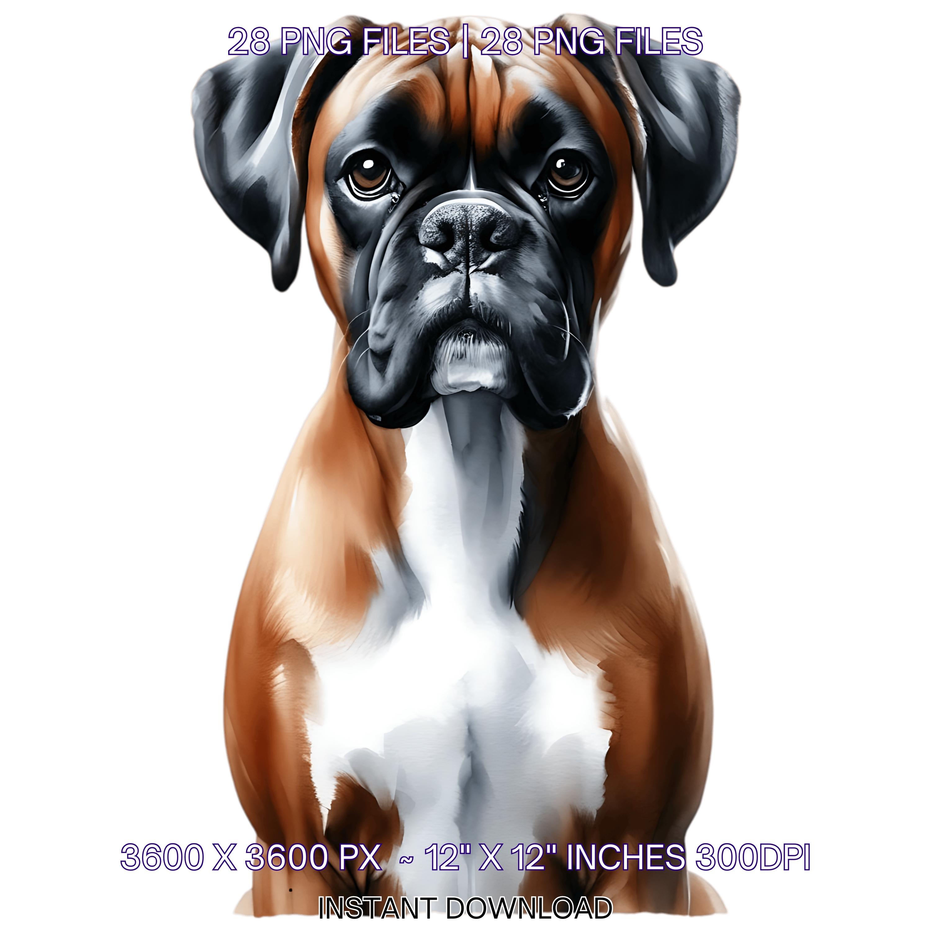 Boxer Dog Clipart Bundle | 28 PNG 28 JPG Watercolor Boxer | Dog Clip Art for Card Making, Junk Journaling, Sublimation | Commercial Use is an eye-catching, high-resolution digital asset designed for creators, crafters, teachers, and small business owners looking to elevate their visuals.