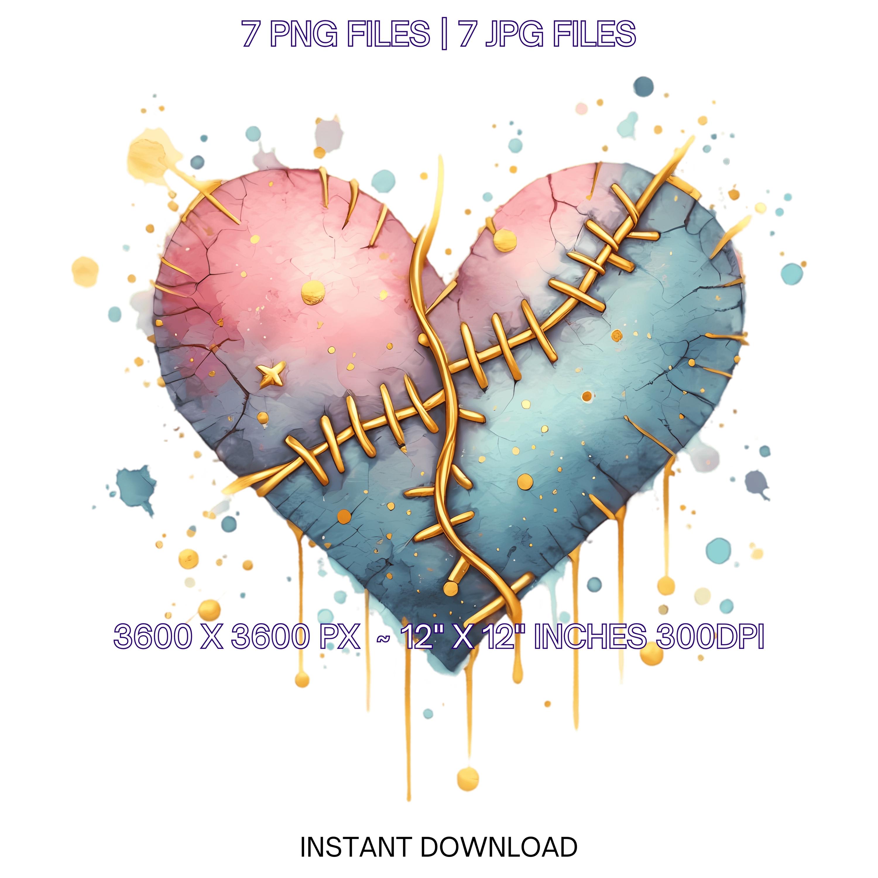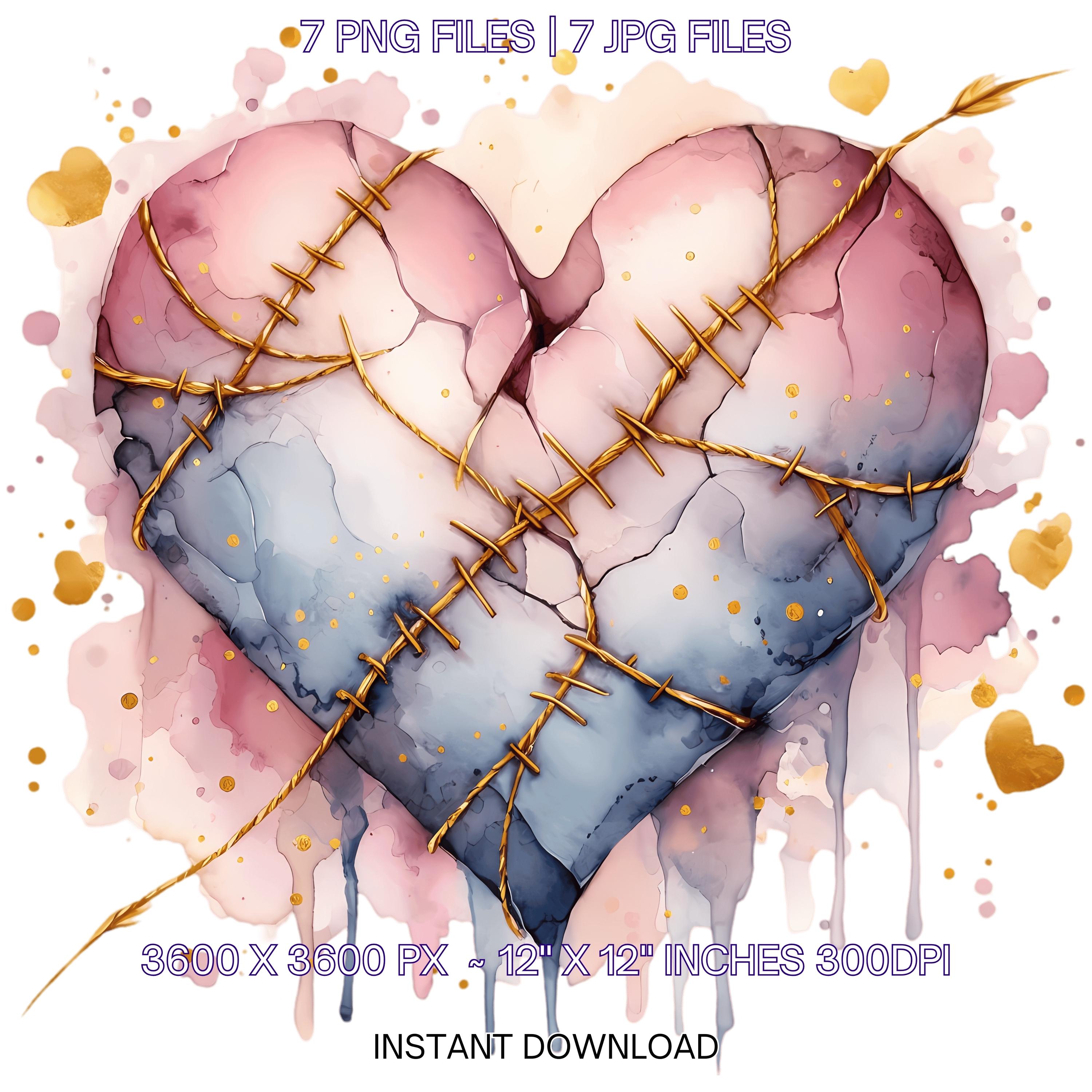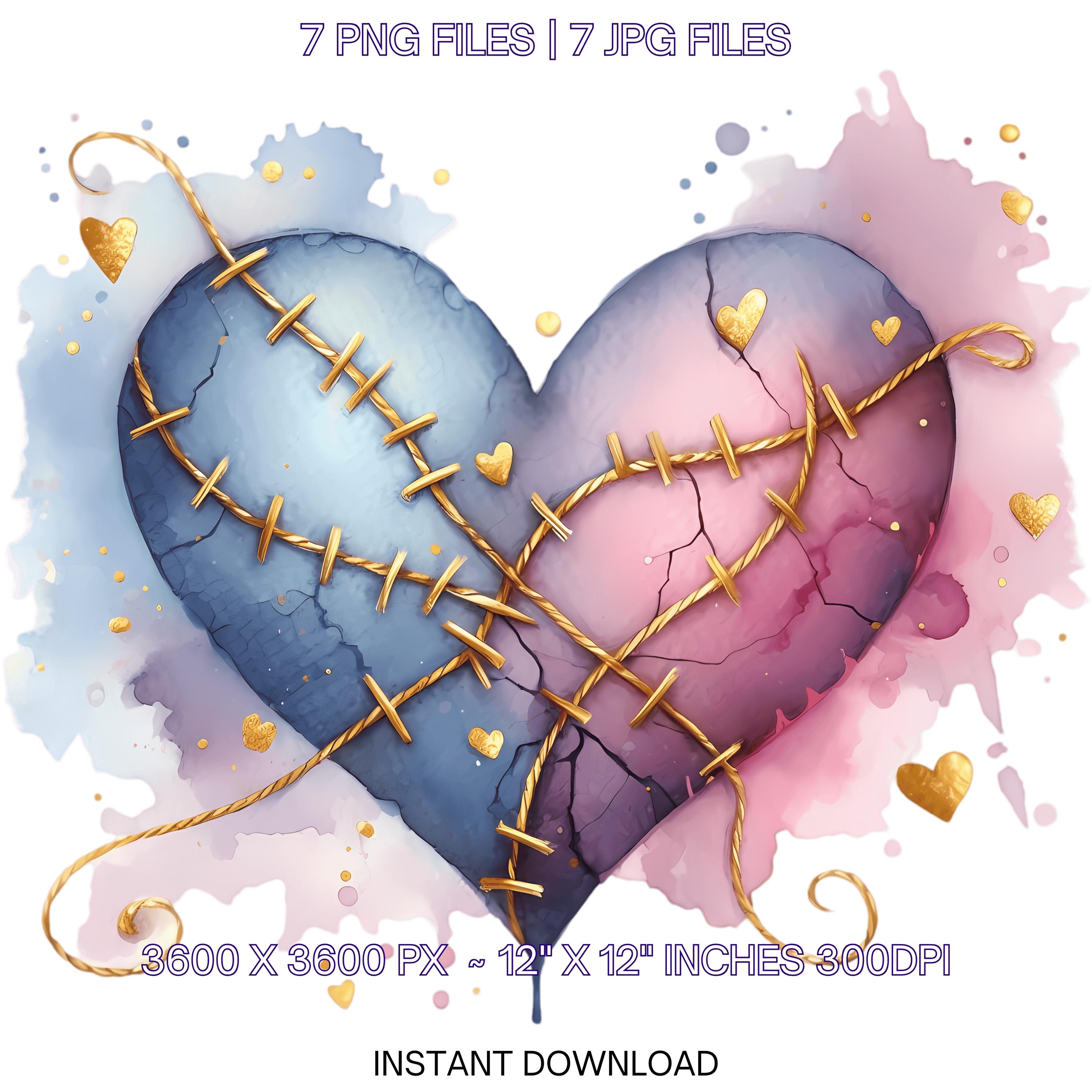 Broken Heart PNG Clipart | Watercolor Broken Heart Stitched with Golden Thread | Heart Illustration 7 JPG โ€“ 7 PNG Sublimation Commercial Use โ€“ Instant Digital Download - TumblersGalaxy