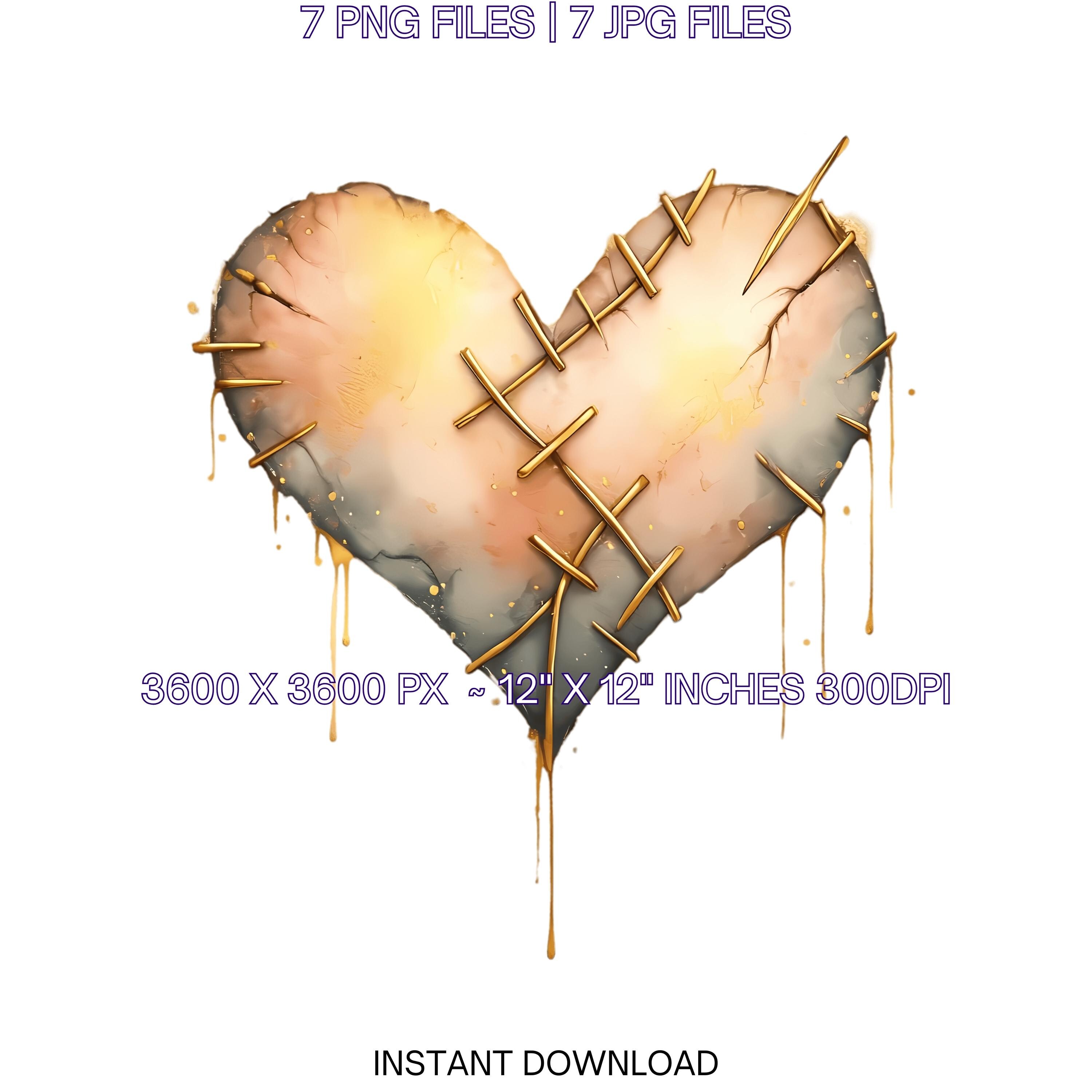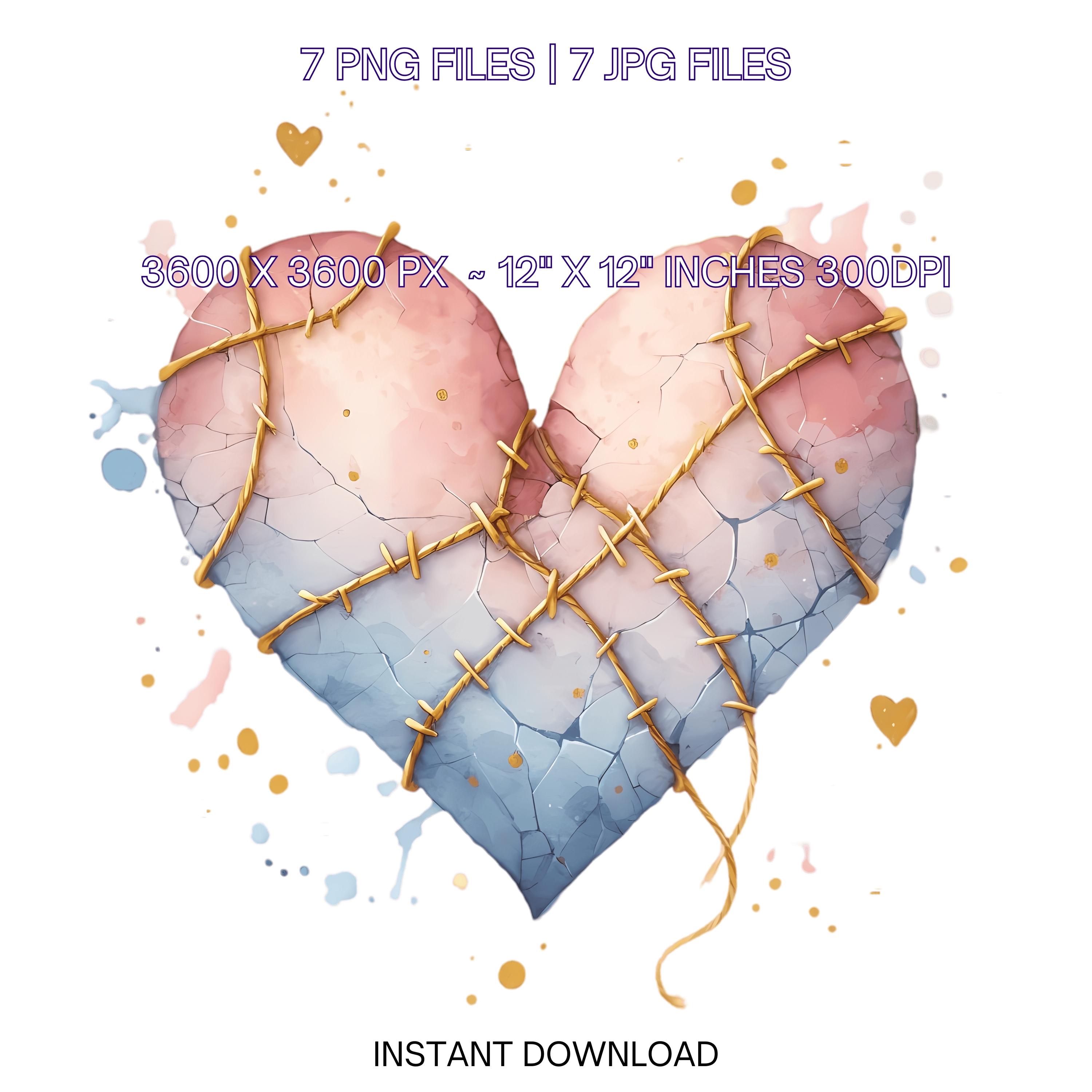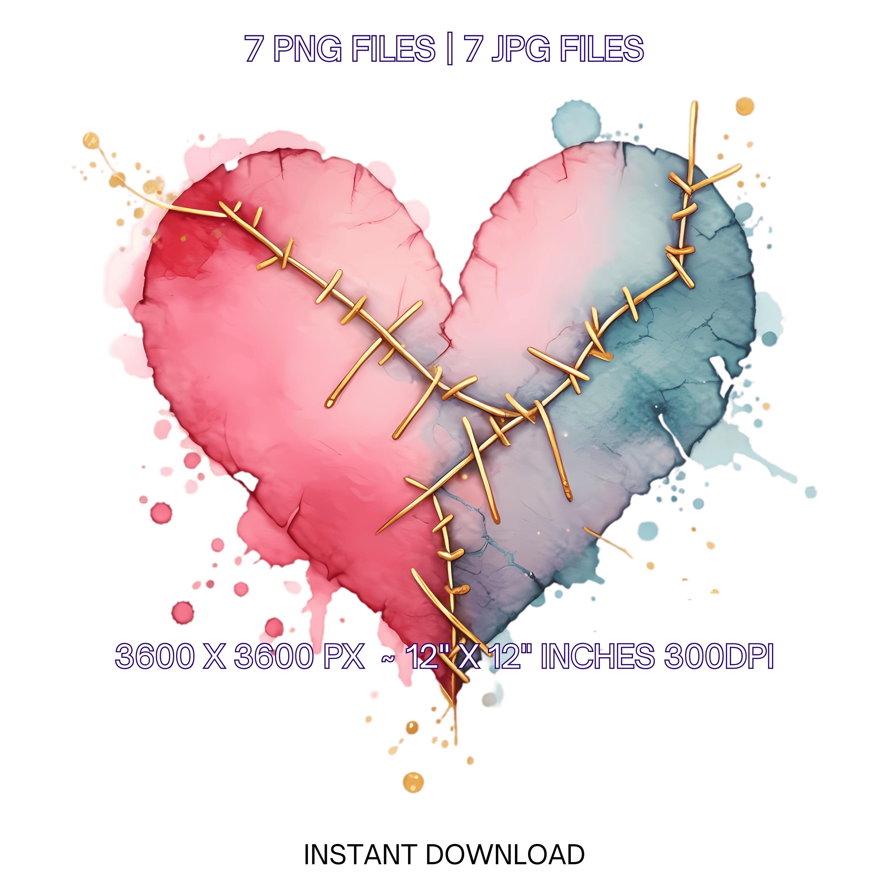 Broken Heart PNG Clipart | Watercolor Broken Heart Stitched with Golden Thread | Heart Illustration 7 JPG โ€“ 7 PNG Sublimation Commercial Use โ€“ Instant Digital Download - TumblersGalaxy