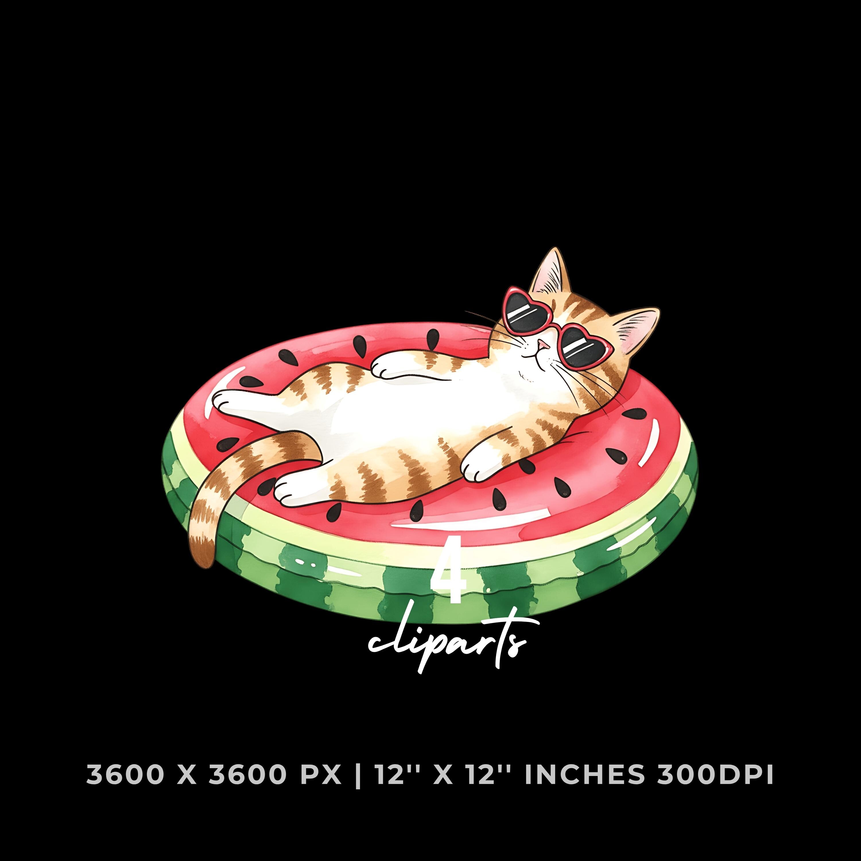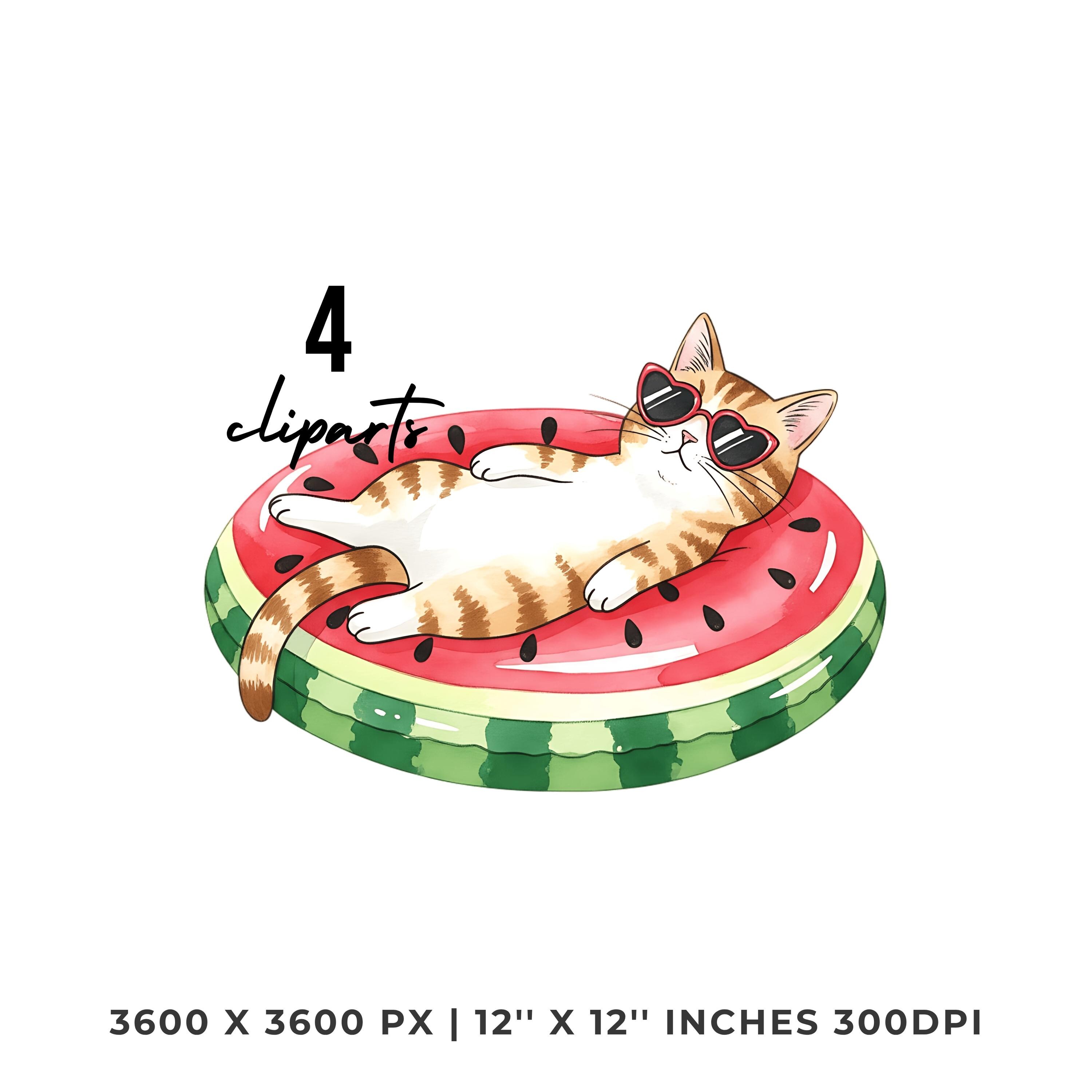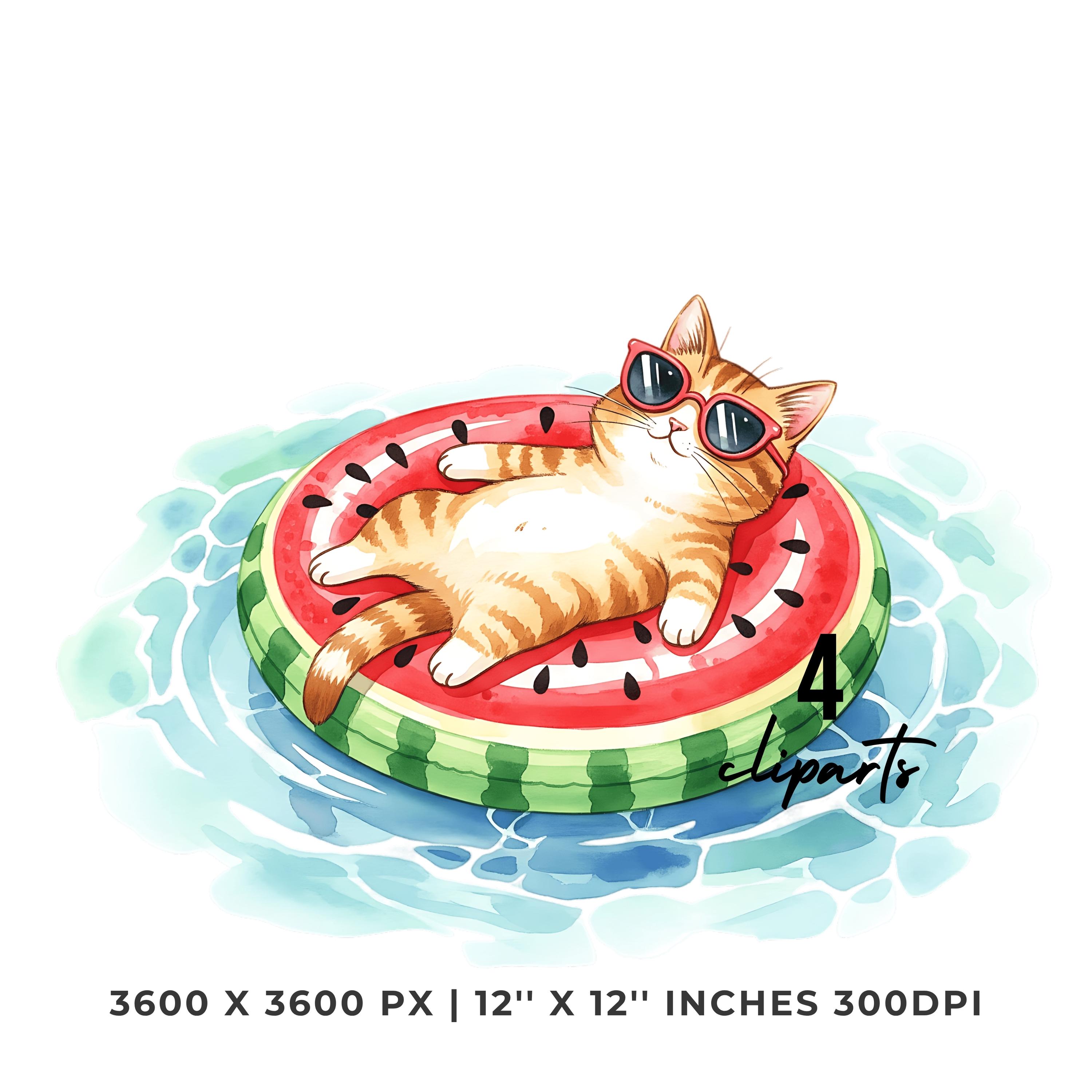 Cat Lazily Floating Clipart PNG |4 Watercolor Cat Lazily Floating on a pool inflatable shaped like a watermelon | Sublimation Commercial Use is an eye-catching, high-resolution digital asset designed for creators, crafters, teachers, and small business owners looking to elevate their visuals.