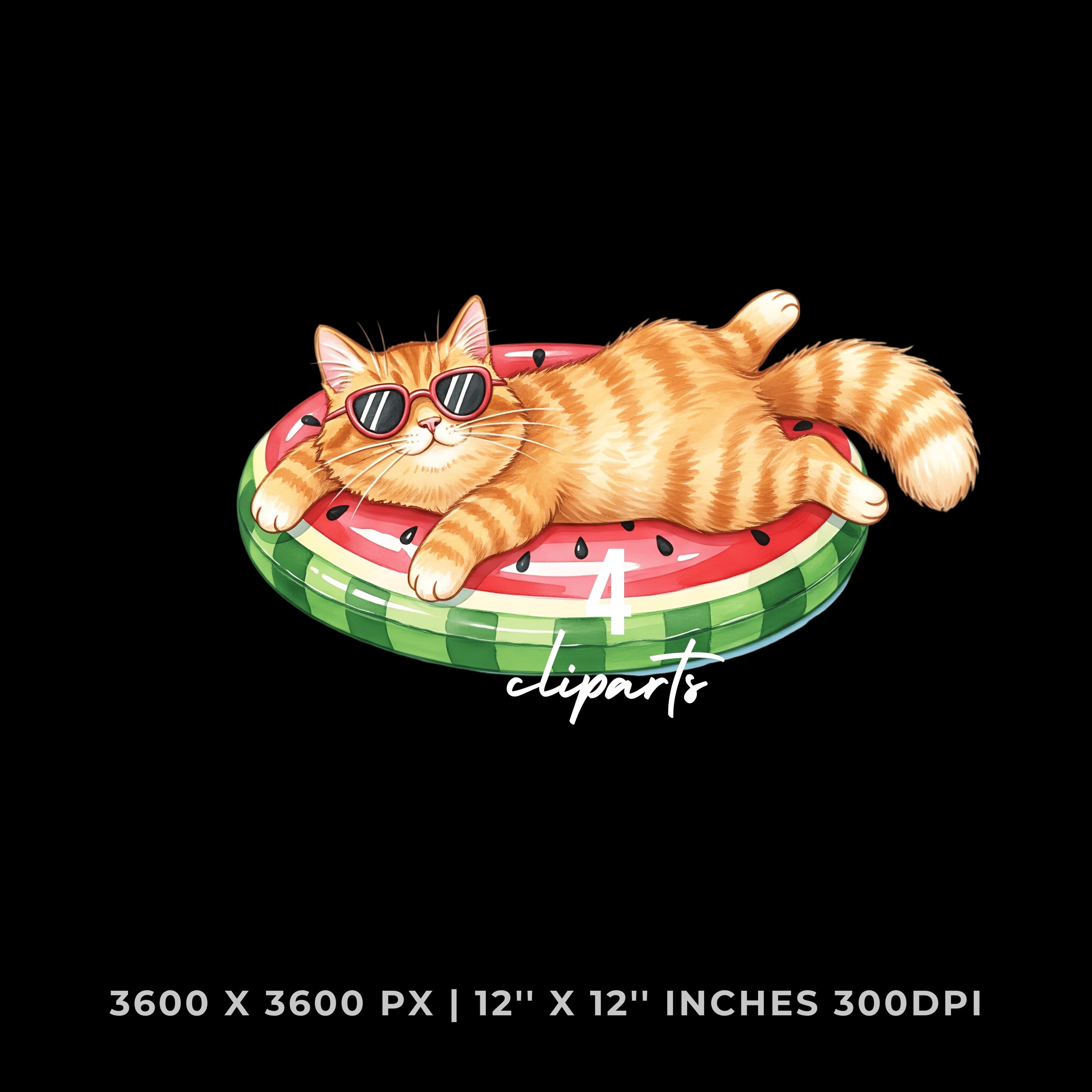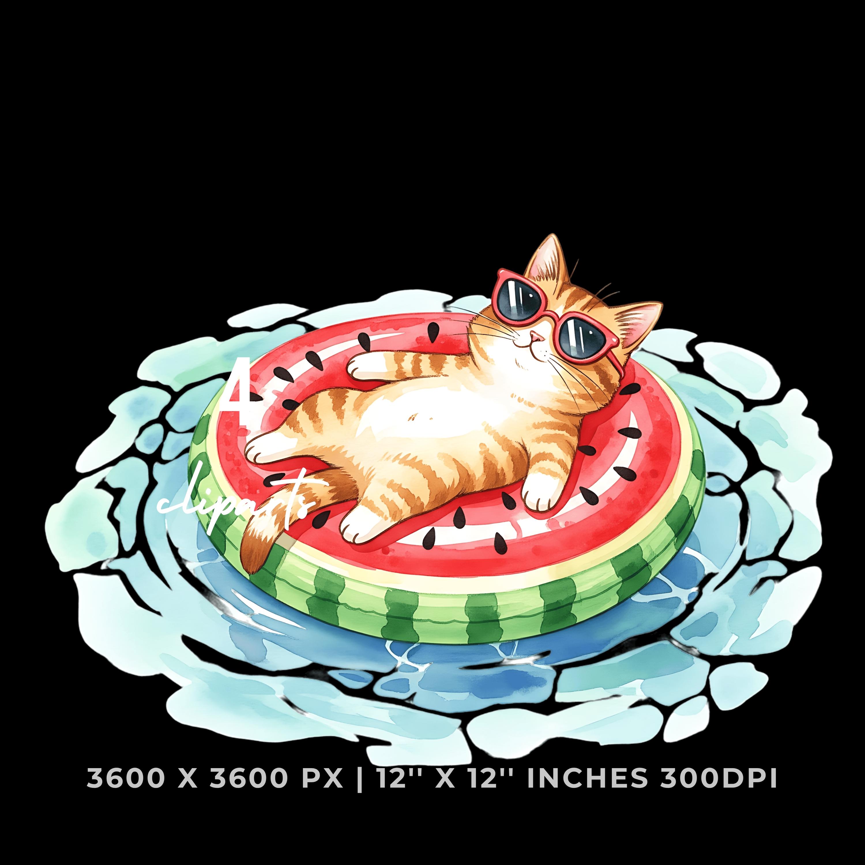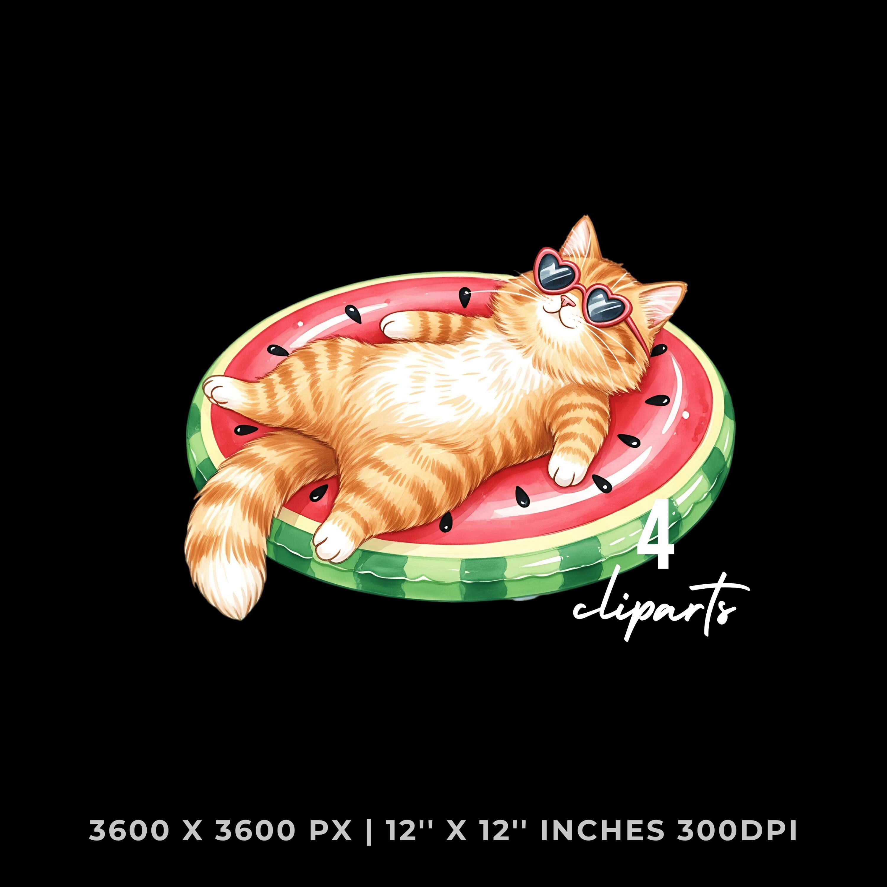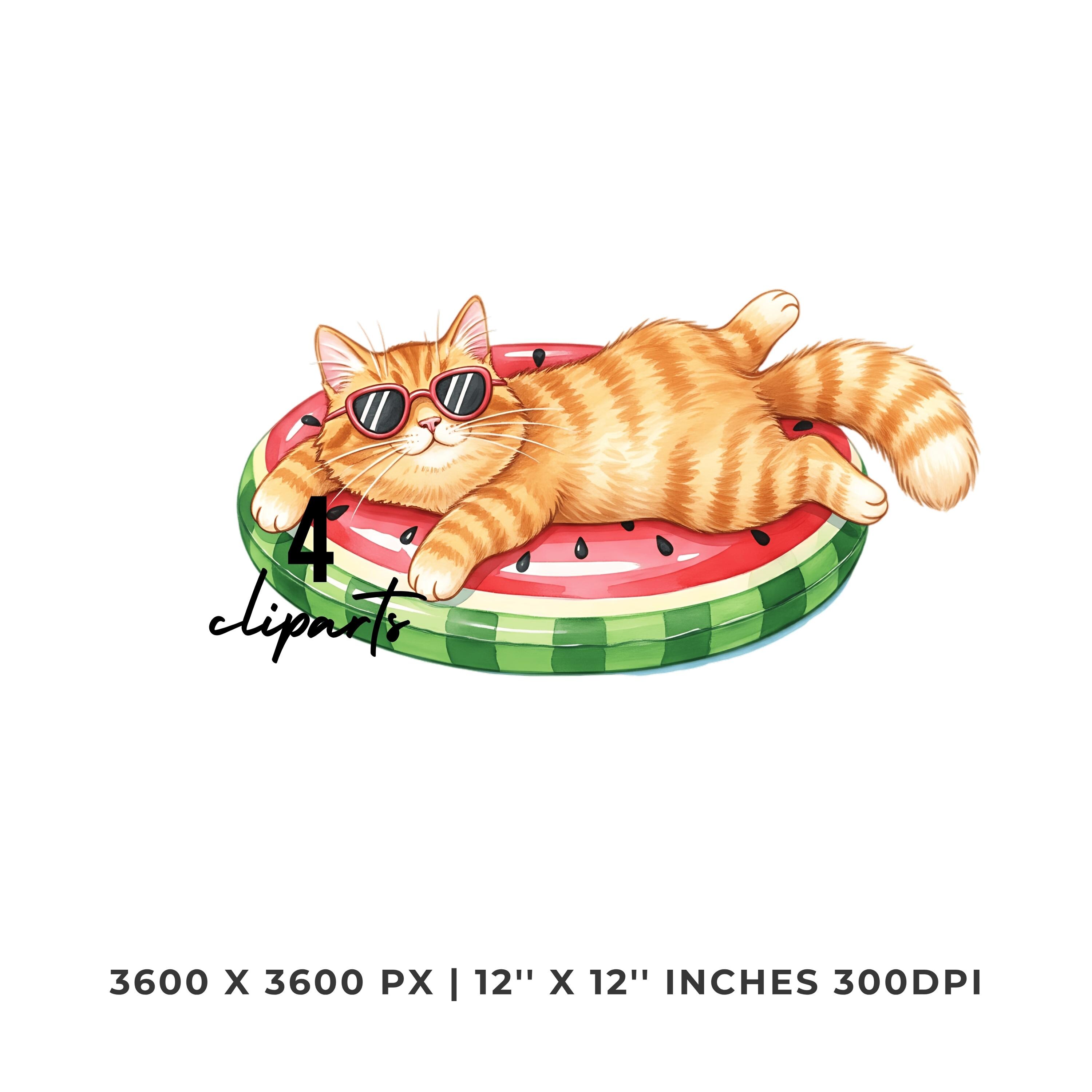 Cat Lazily Floating Clipart PNG |4 Watercolor Cat Lazily Floating on a pool inflatable shaped like a watermelon | Sublimation Commercial Use is an eye-catching, high-resolution digital asset designed for creators, crafters, teachers, and small business owners looking to elevate their visuals.