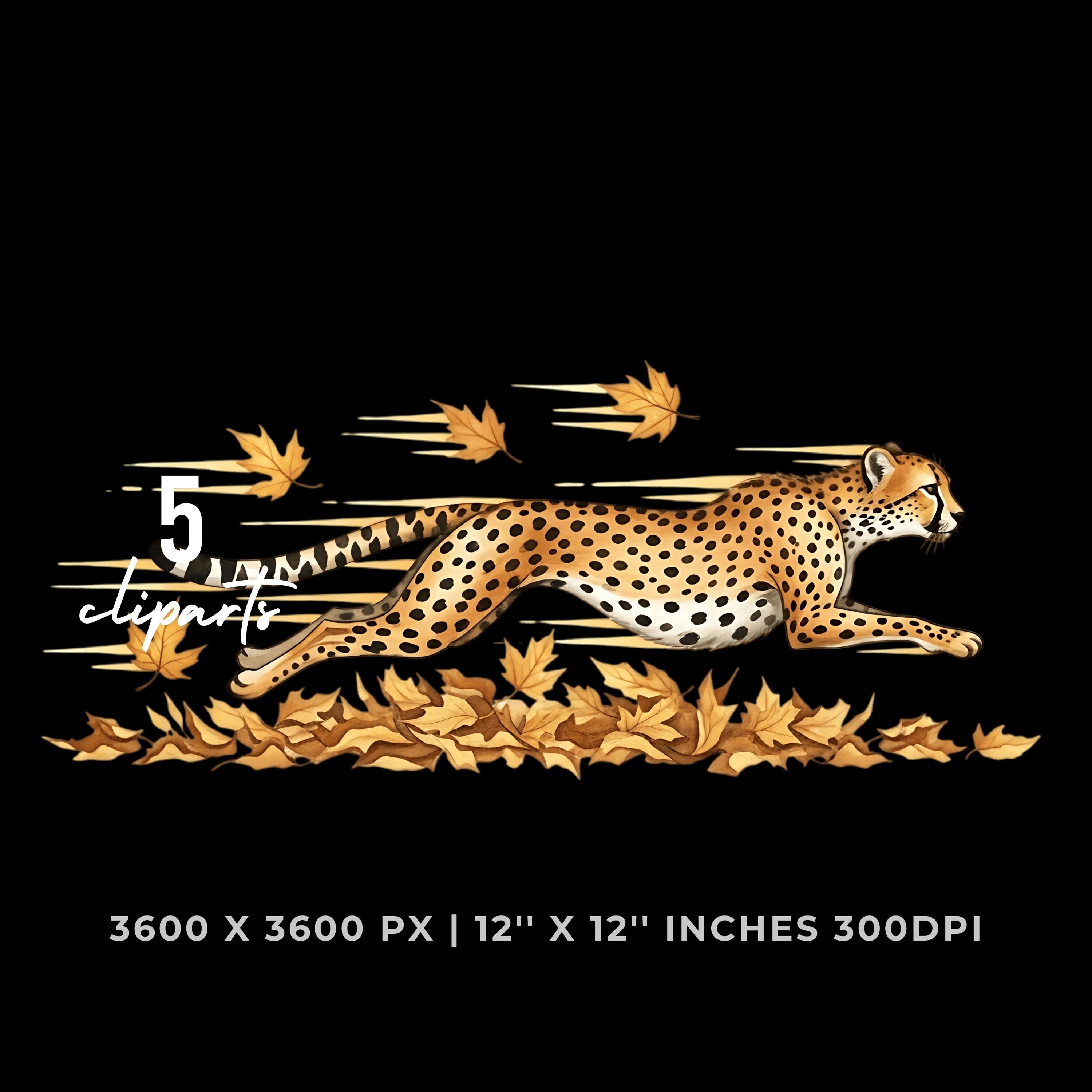 Cheetah Running with Autumn Leaves Clipart PNG JPG | Fall Cheetah Speed Illustration | 12×12″ 300DPI Instant Download | 12″x12″ 300DPI Digital Download | 5 PNG & 5 JPG Sublimation Transparent Hi-Res Commercial Use