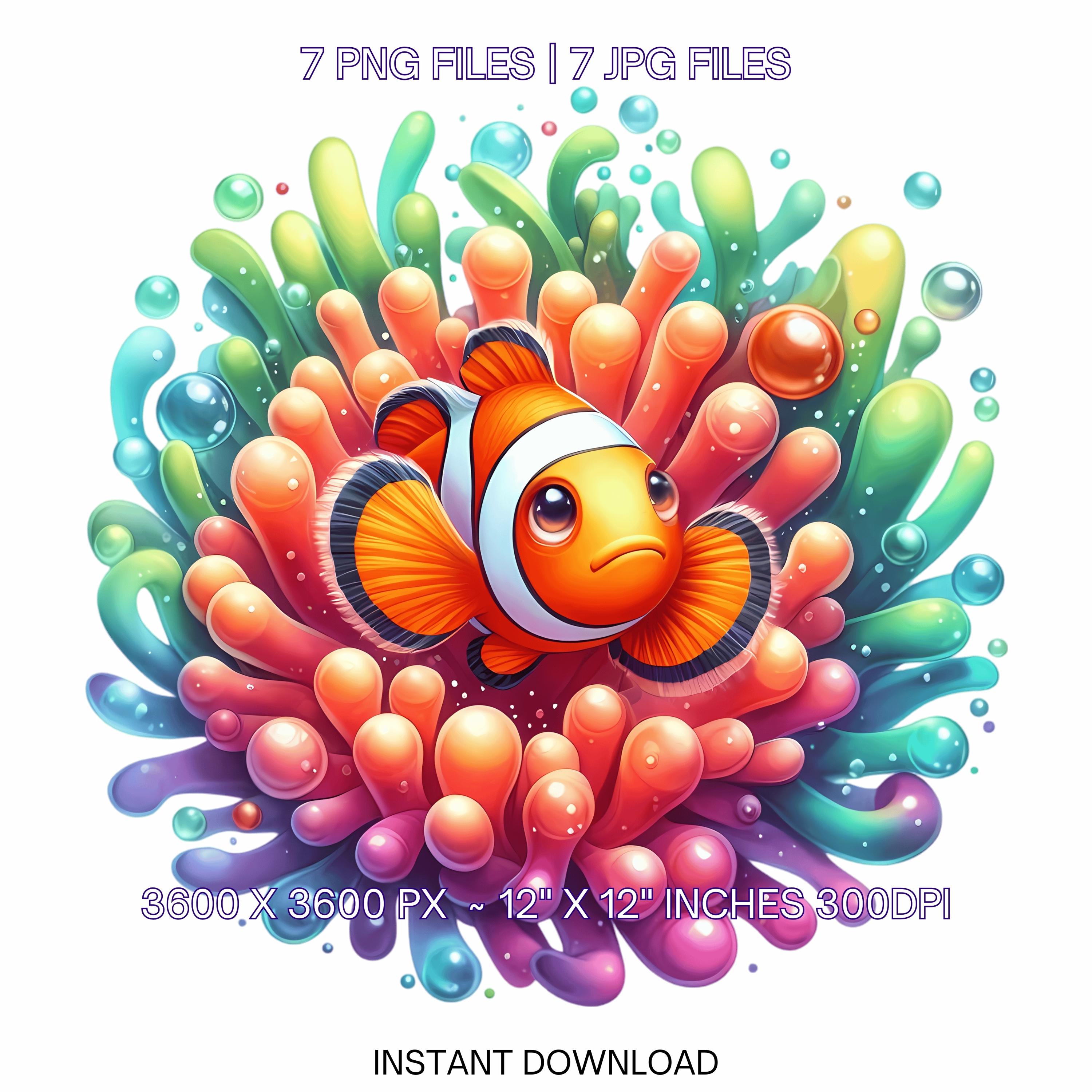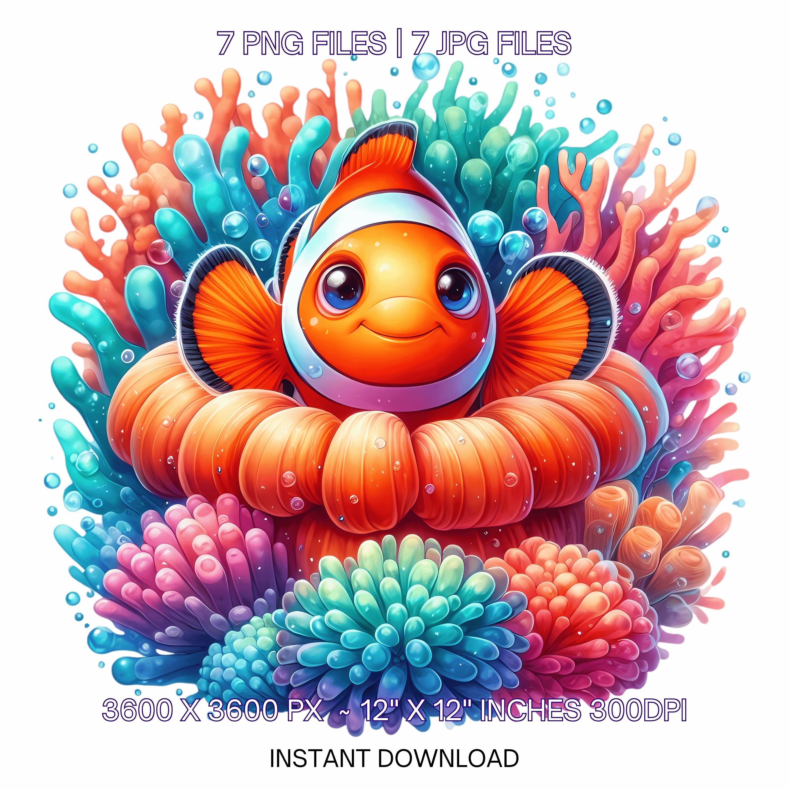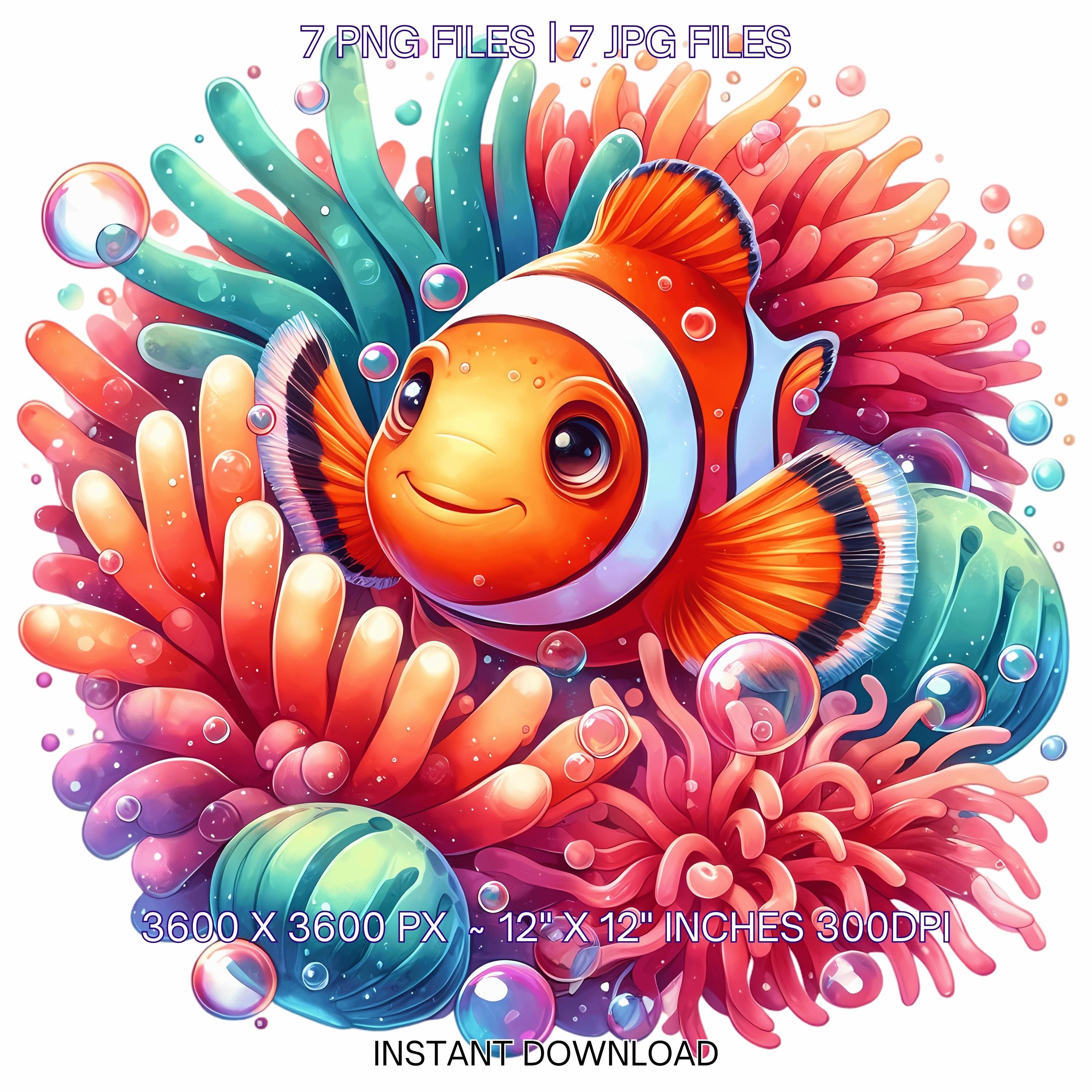 Clownfish Clipart PNG | 6 Watercolor Bright Clownfish Peeking out of a sea anemone with vivid coral and bubble | Underwater Commercial Use is an eye-catching, high-resolution digital asset designed for creators, crafters, teachers, and small business owners looking to elevate their visuals.