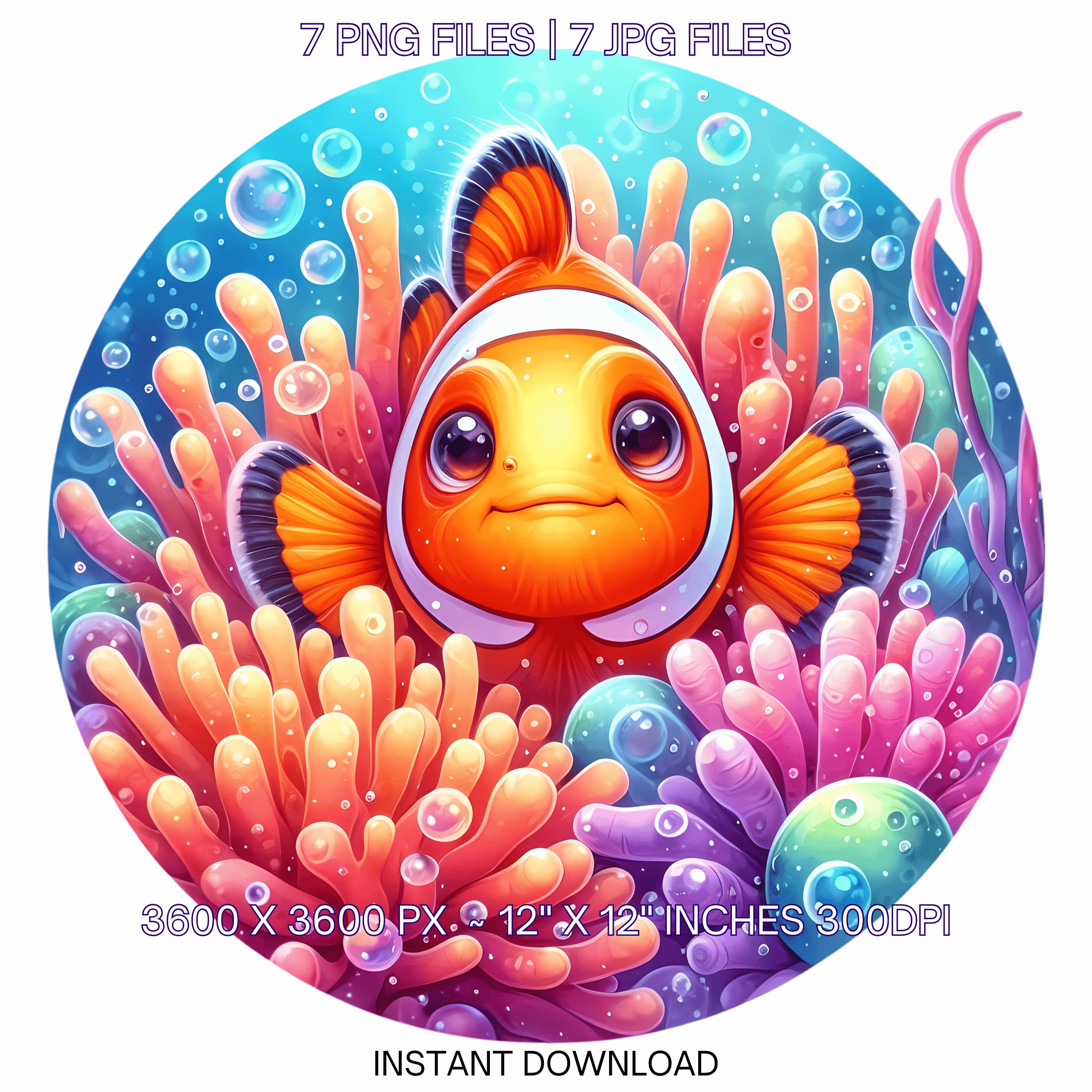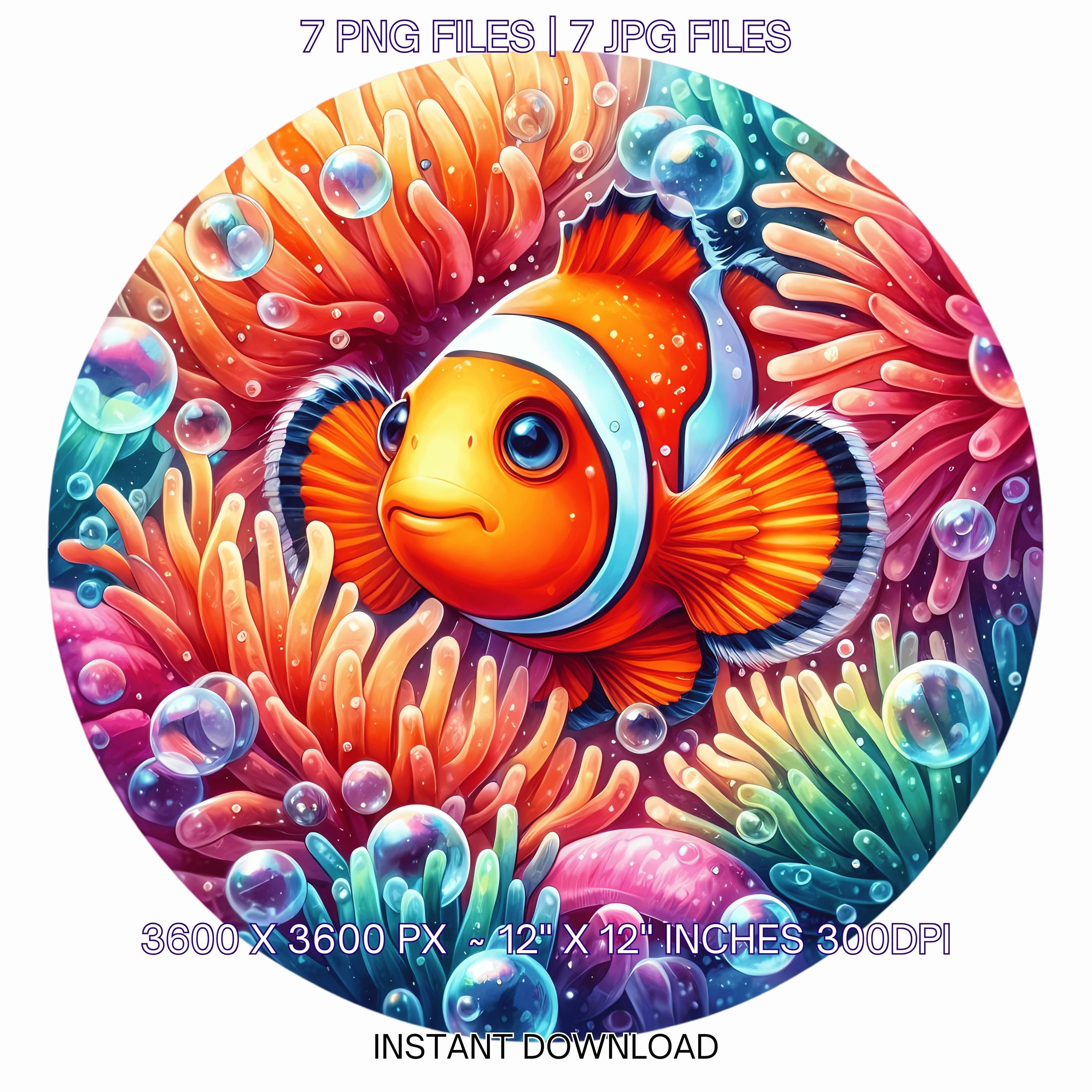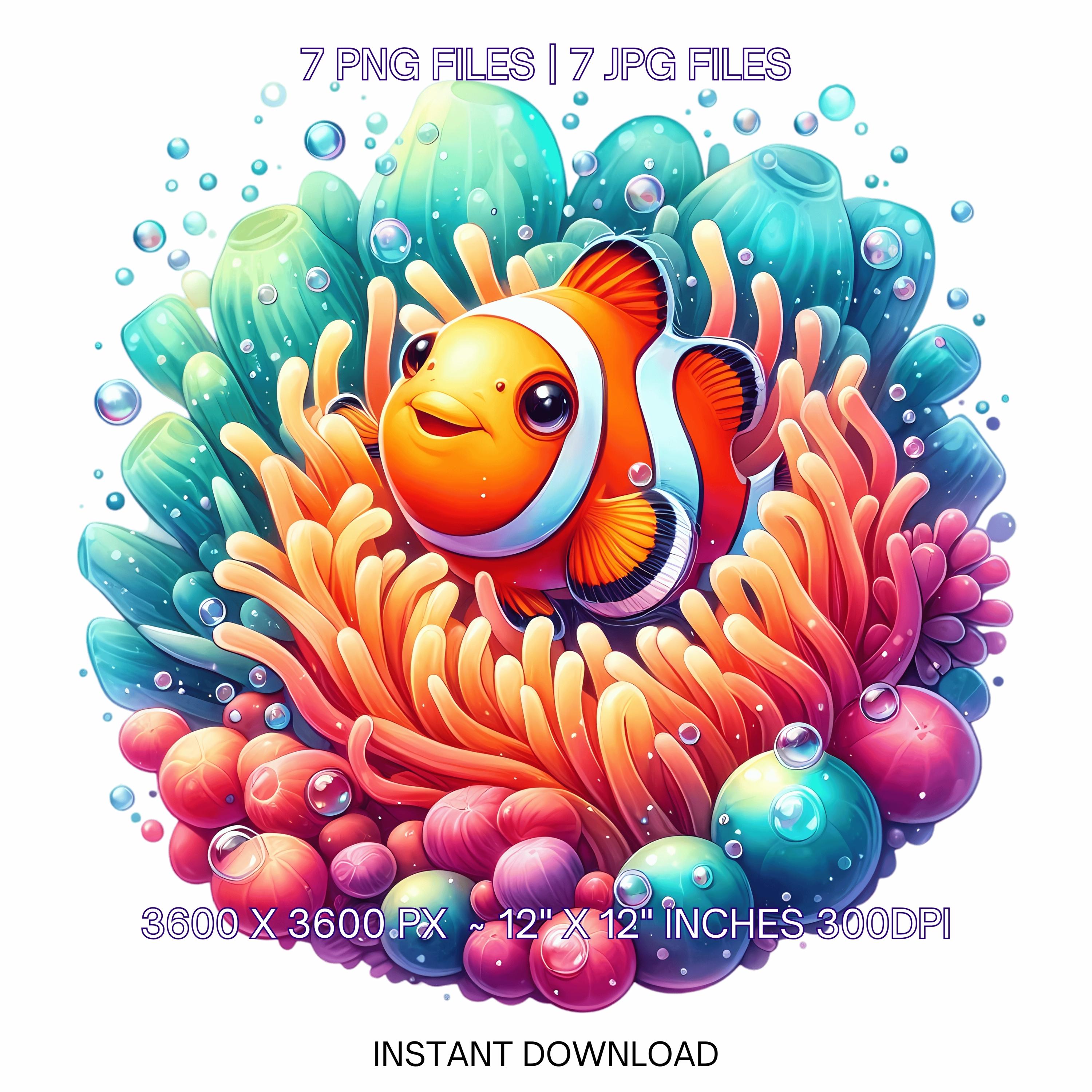 Clownfish Clipart PNG | 6 Watercolor Bright Clownfish Peeking out of a sea anemone with vivid coral and bubble | Underwater Commercial Use is an eye-catching, high-resolution digital asset designed for creators, crafters, teachers, and small business owners looking to elevate their visuals.