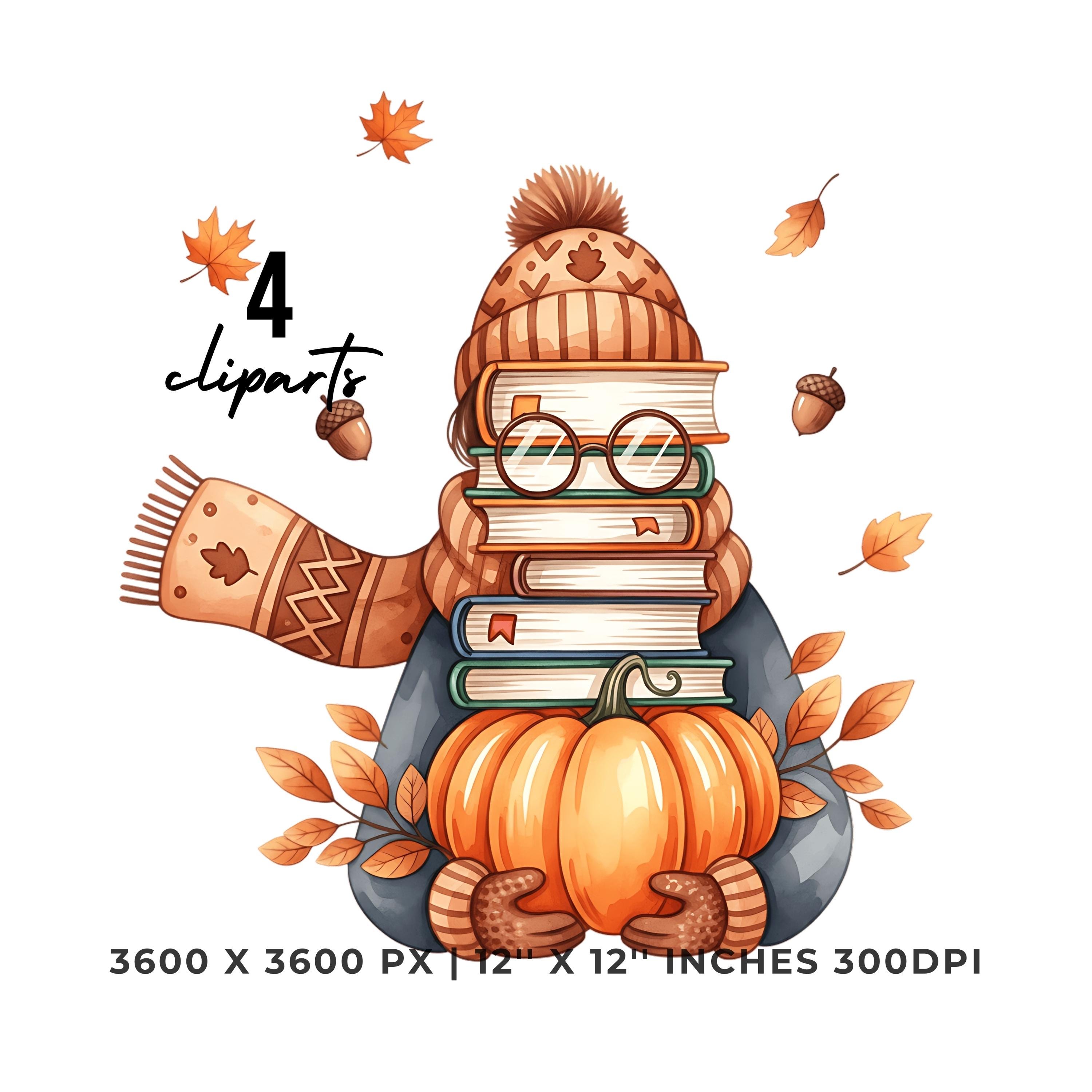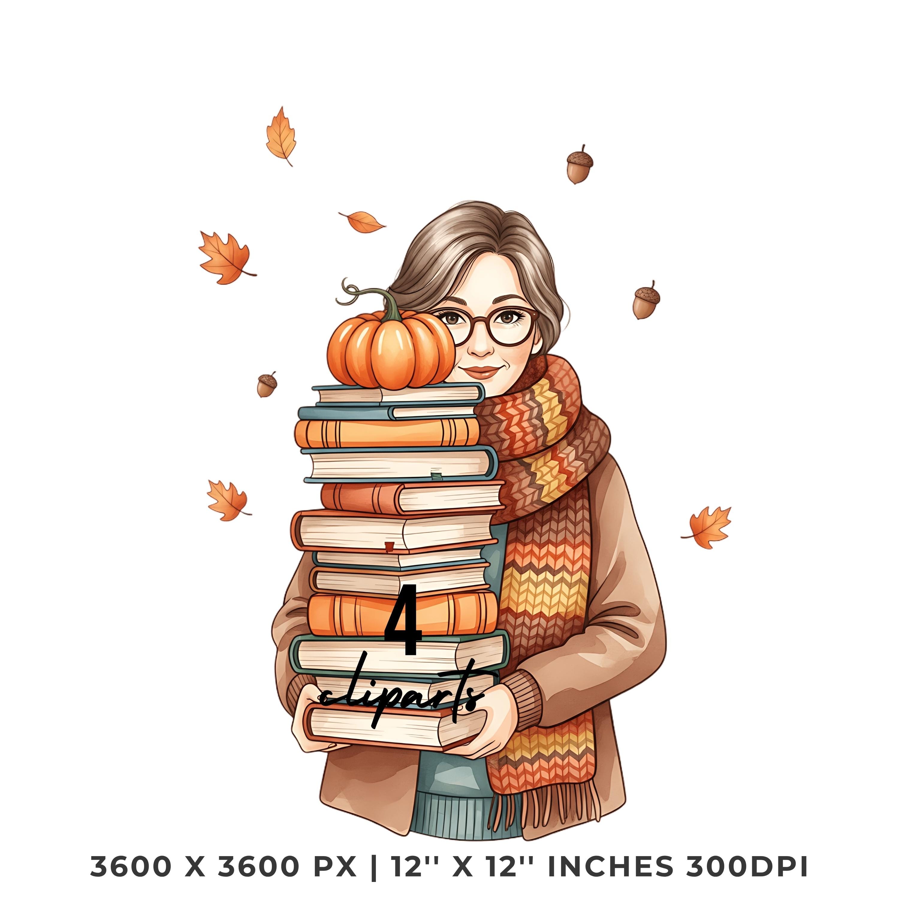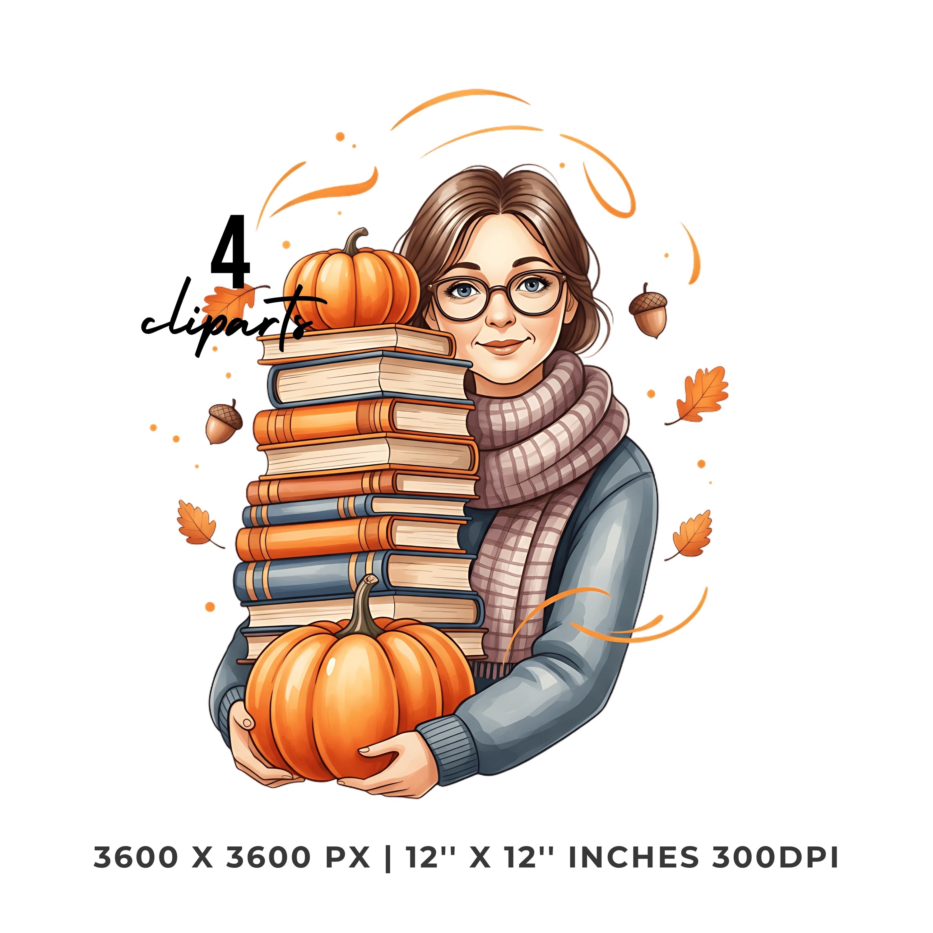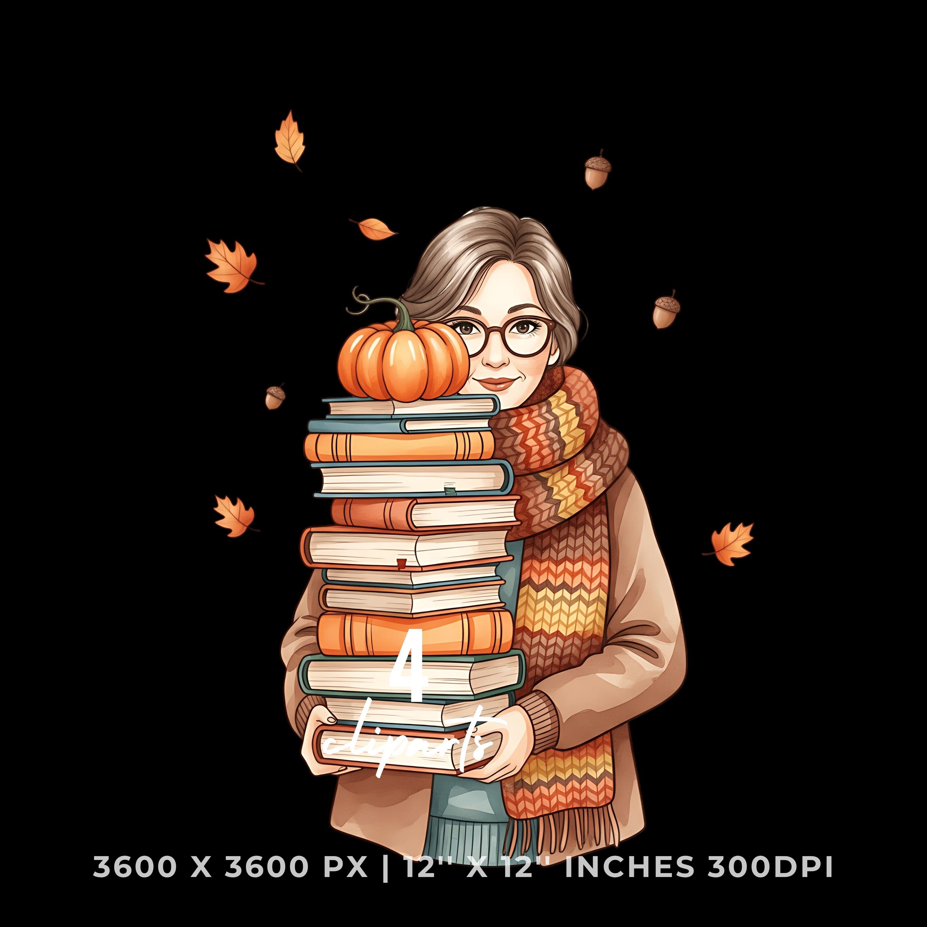Cozy Librarian Fall Clipart PNG JPG | Autumn Pumpkin Books Stack Clip Art Set | 4 PNG & 4 JPG | Sublimation Design | 12″x12″ 300DPI Graphic Commercial Use