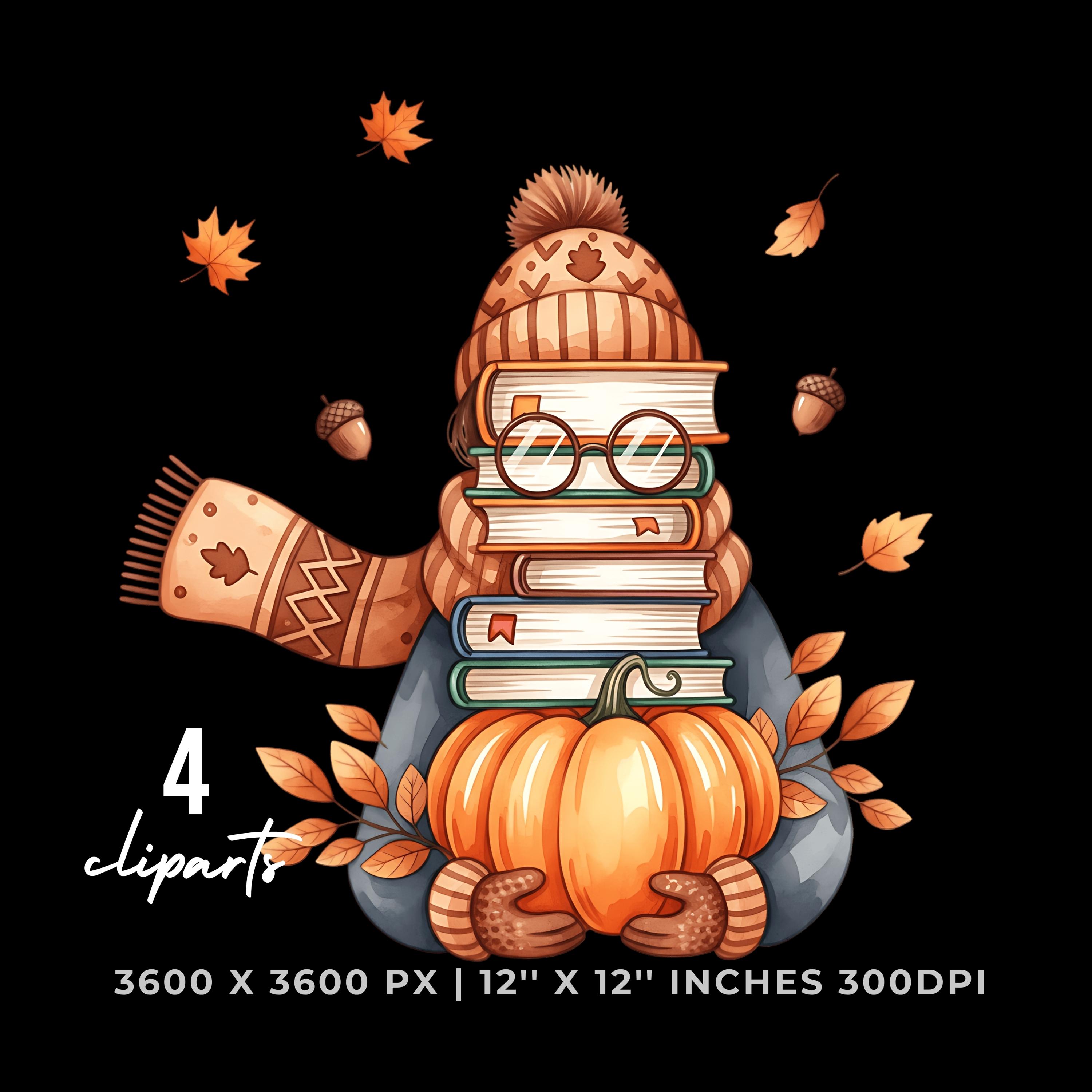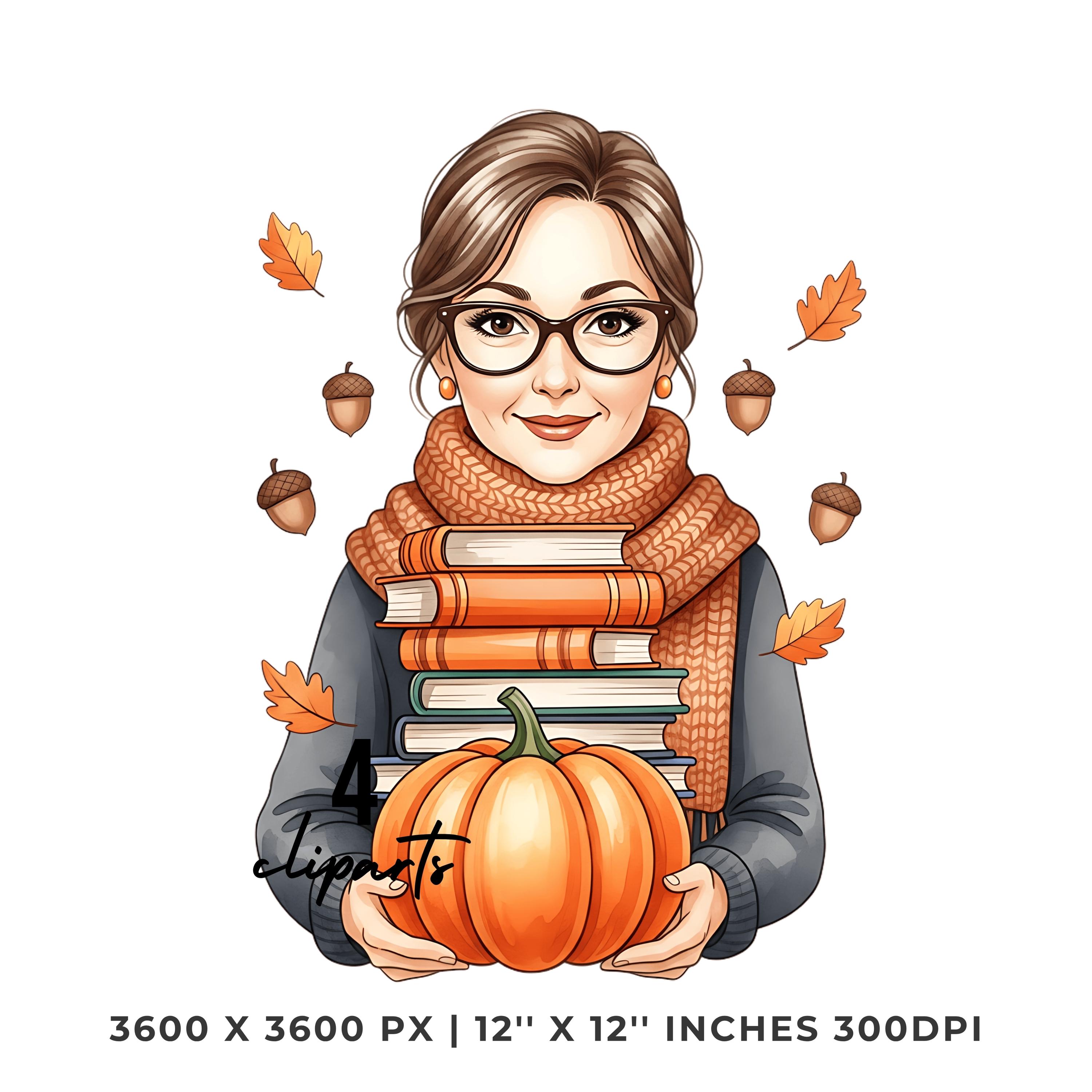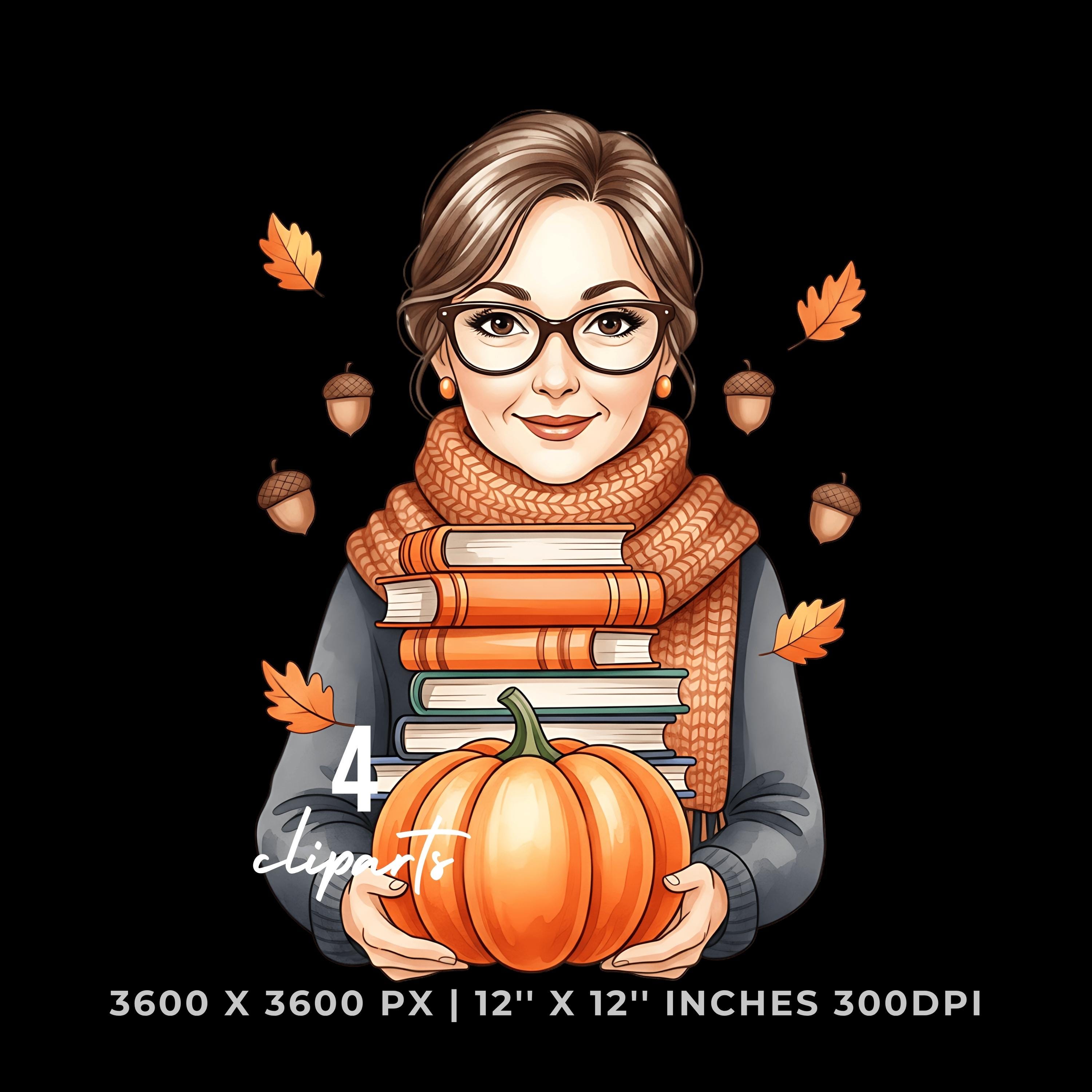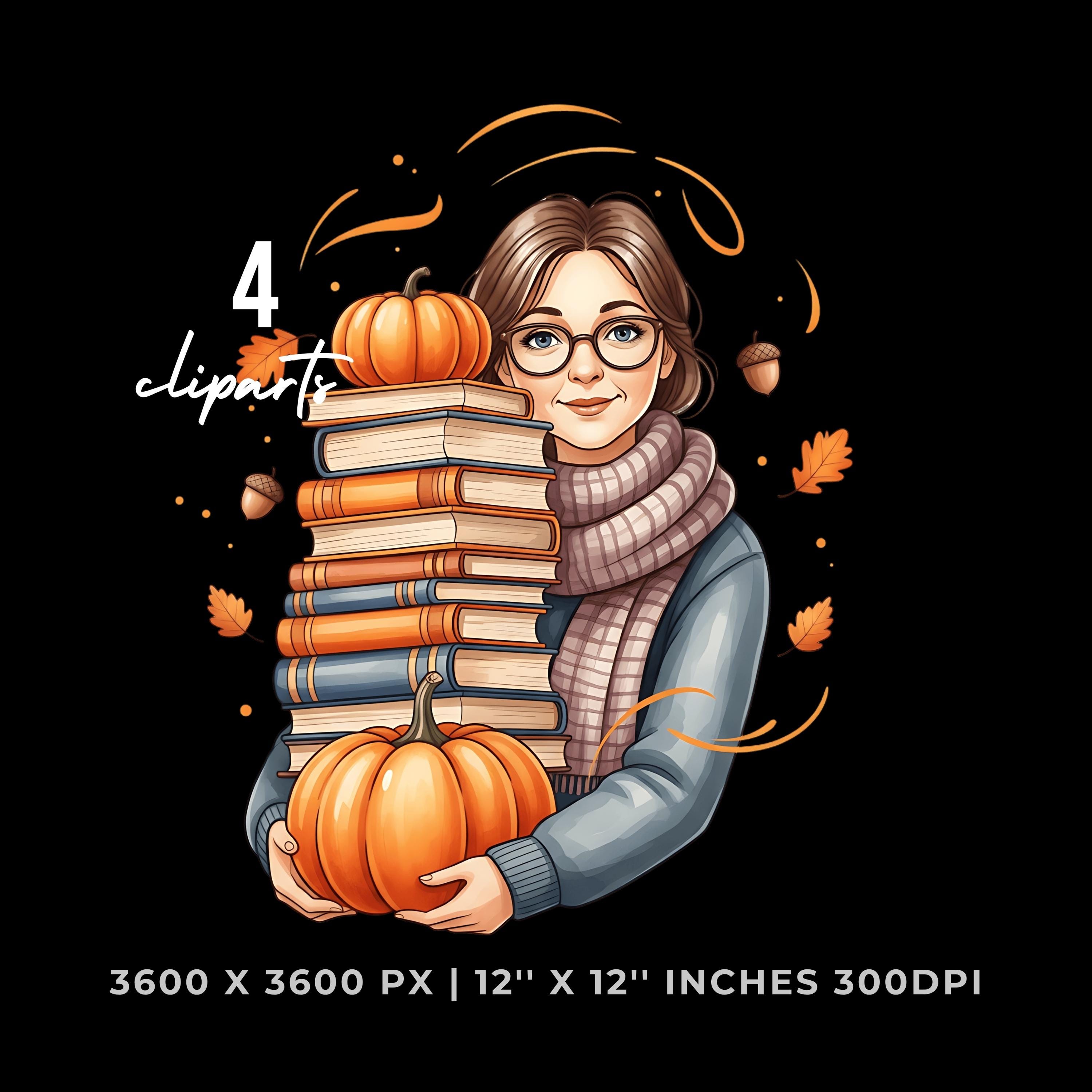 Cozy Librarian Fall Clipart PNG JPG | Autumn Pumpkin Books Stack Clip Art Set | 4 PNG & 4 JPG | Sublimation Design | 12″x12″ 300DPI Graphic Commercial Use