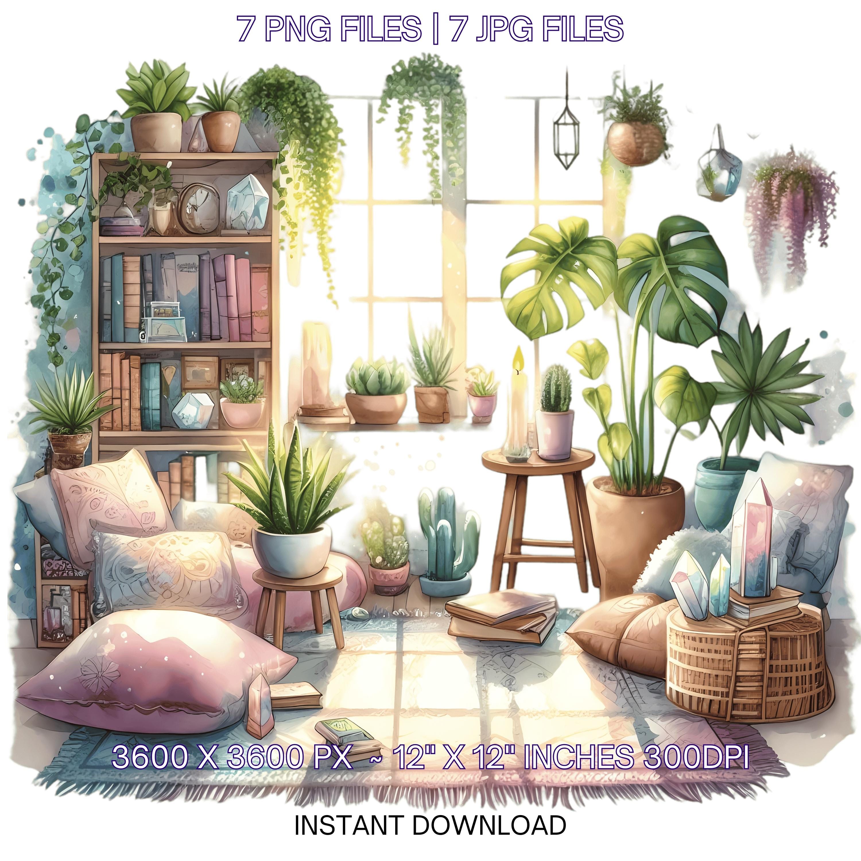 Cozy Room with Plants PNG Clipart | Watercolor Cozy Room with Plants | Watercolor Illustration Clipart | 7 JPG – 7 PNG Sublimation Commercial Use