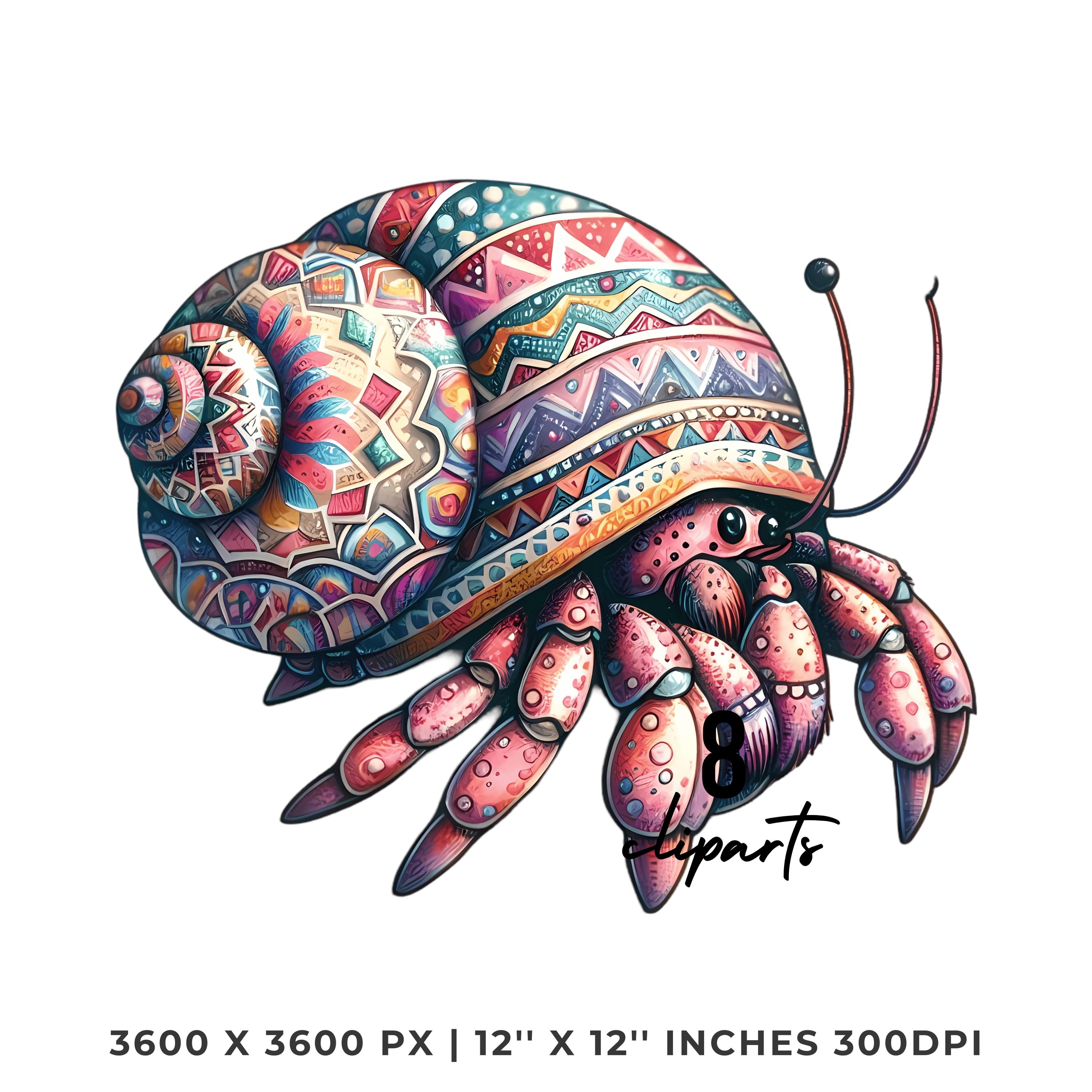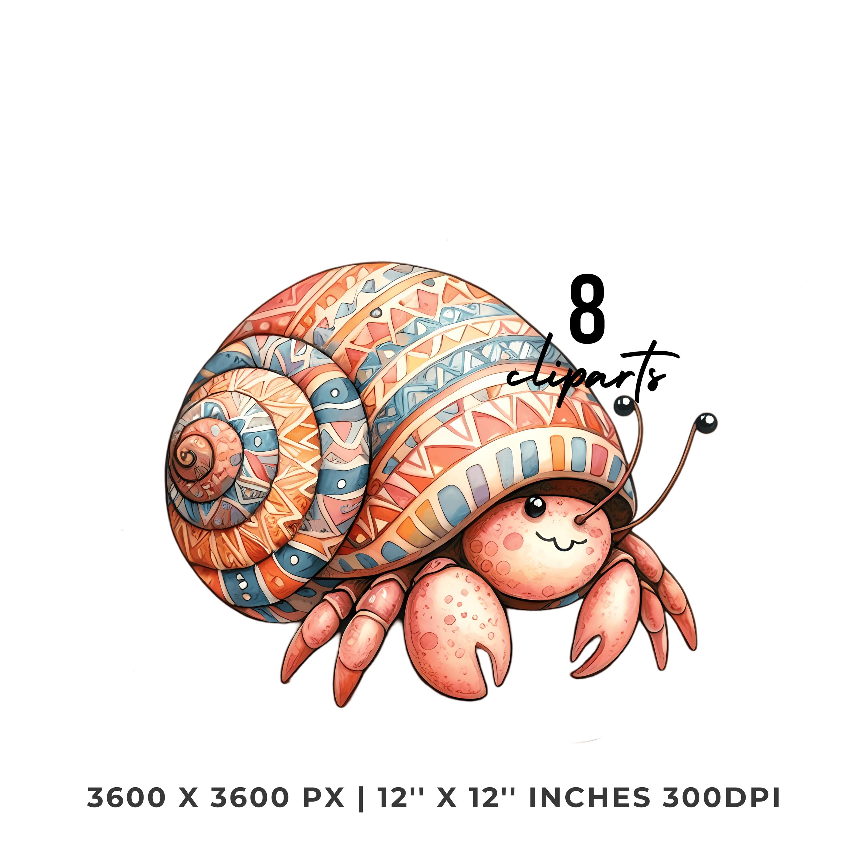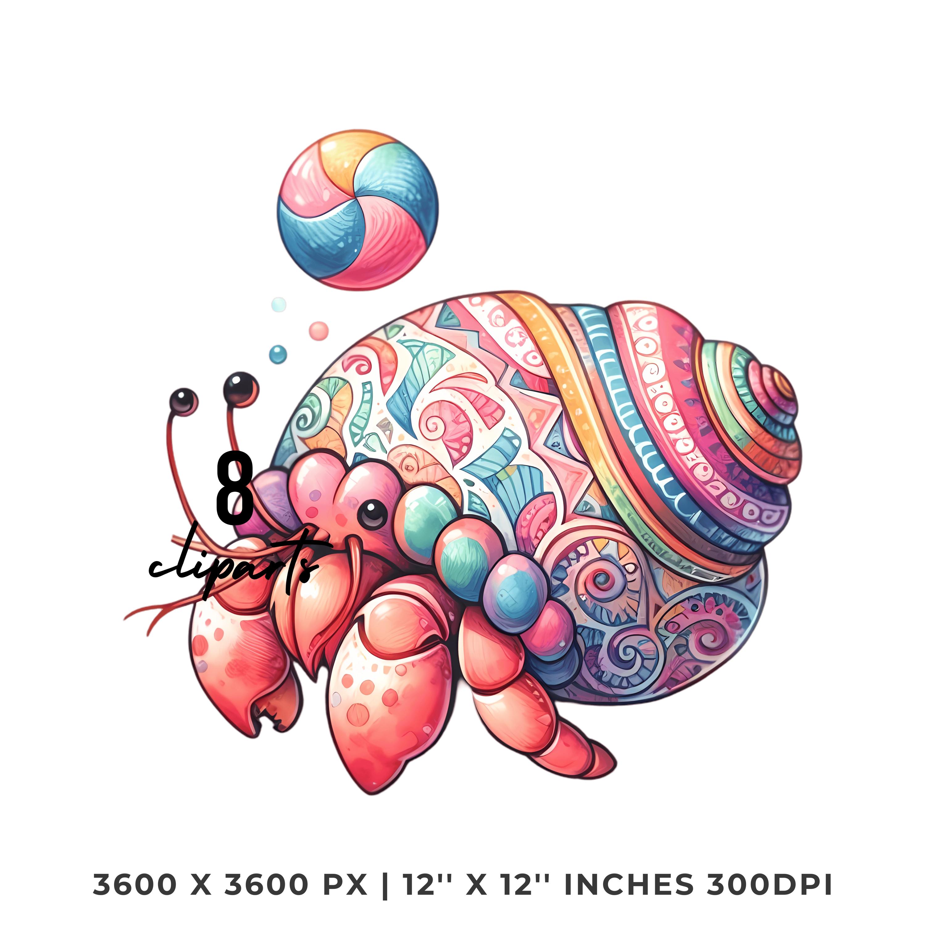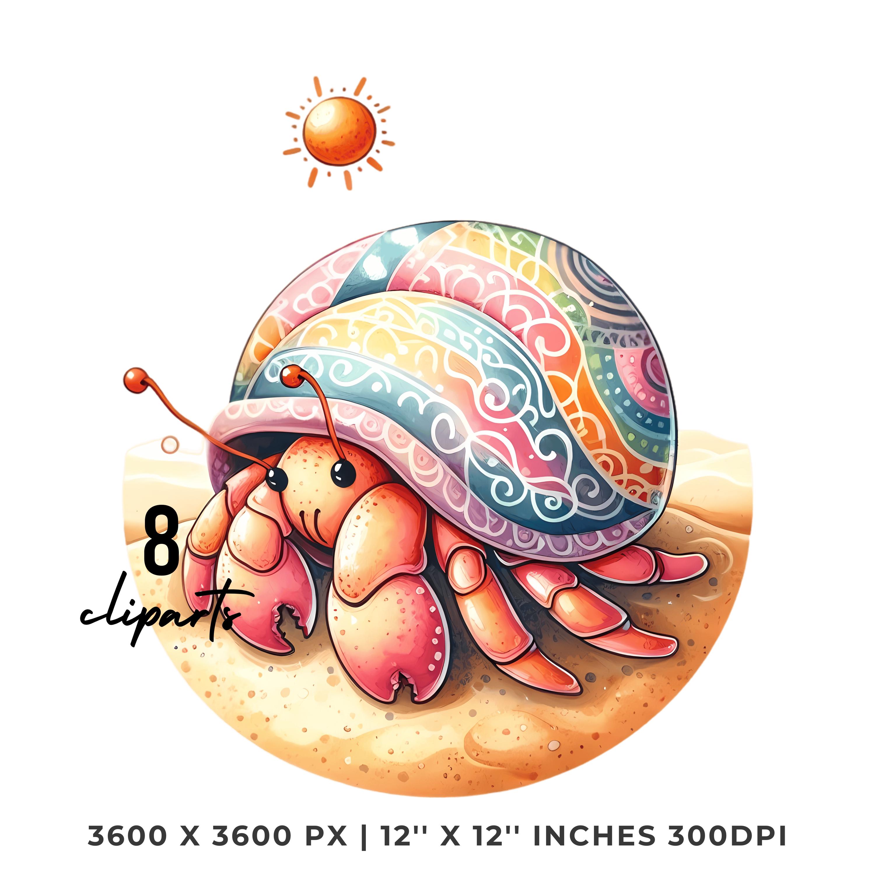 Crab Clipart PNG | 8 Watercolor Hermit Crab in a patterned shell walking on sand with beach toys & seashells | Sublimation Commercial Use is an eye-catching, high-resolution digital asset designed for creators, crafters, teachers, and small business owners looking to elevate their visuals.
