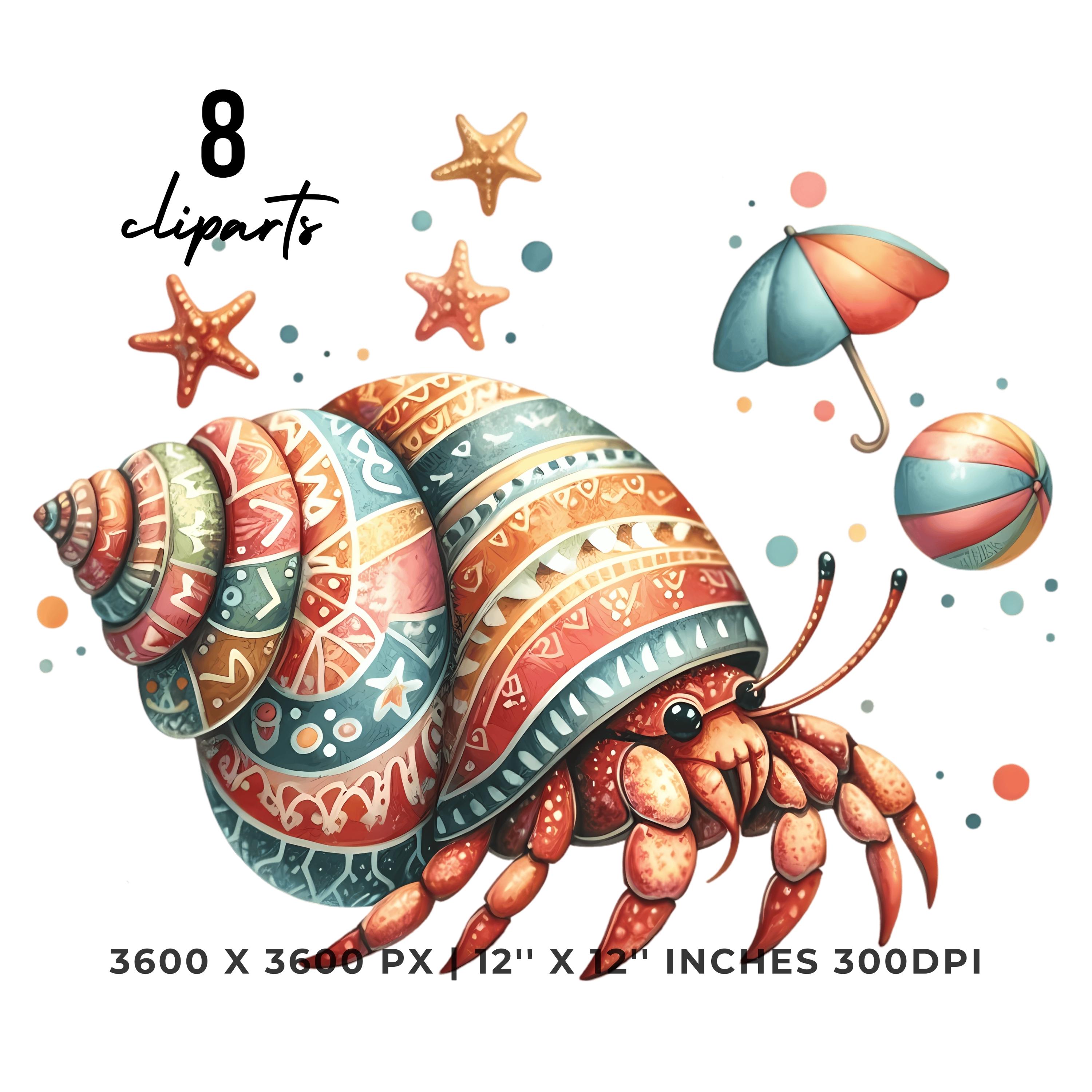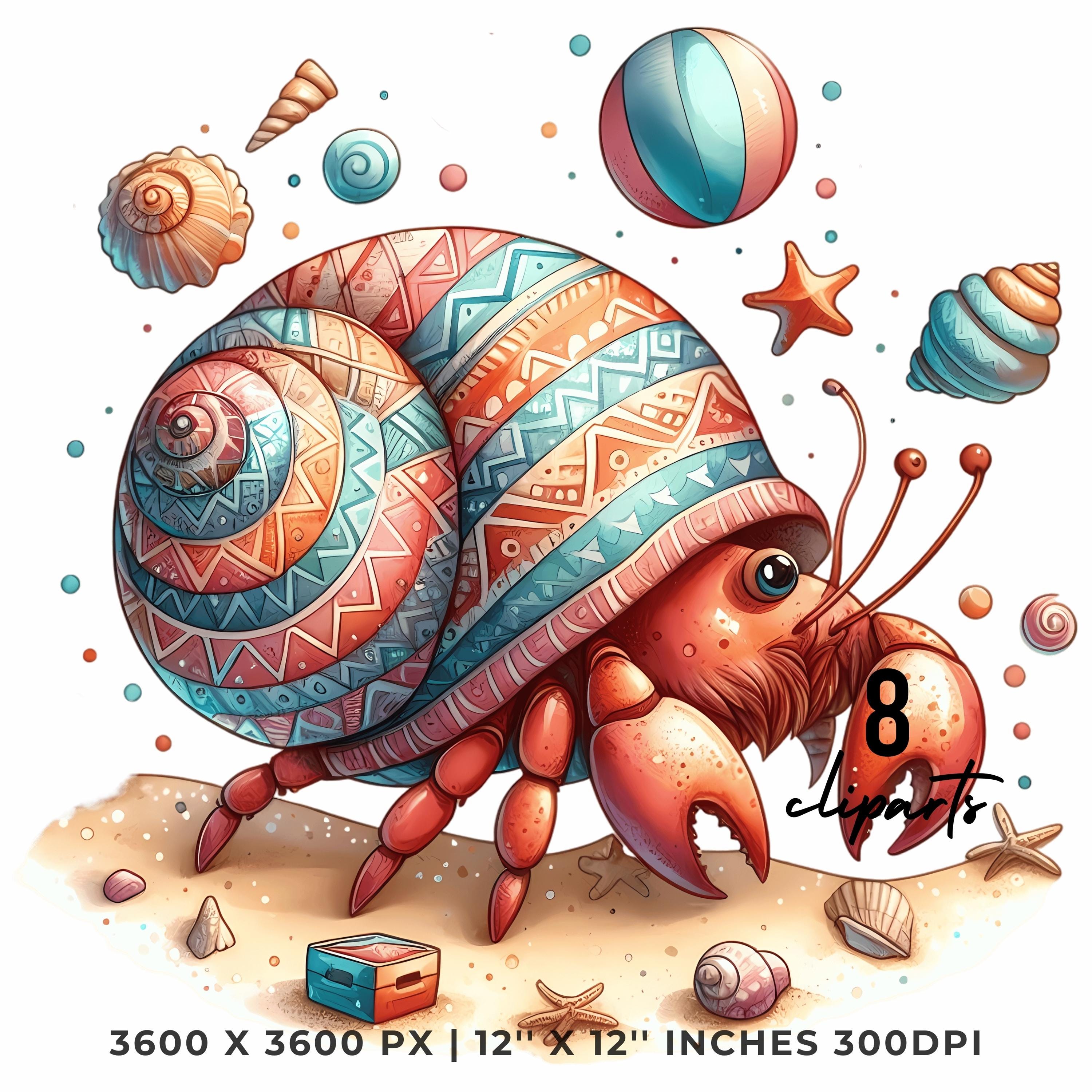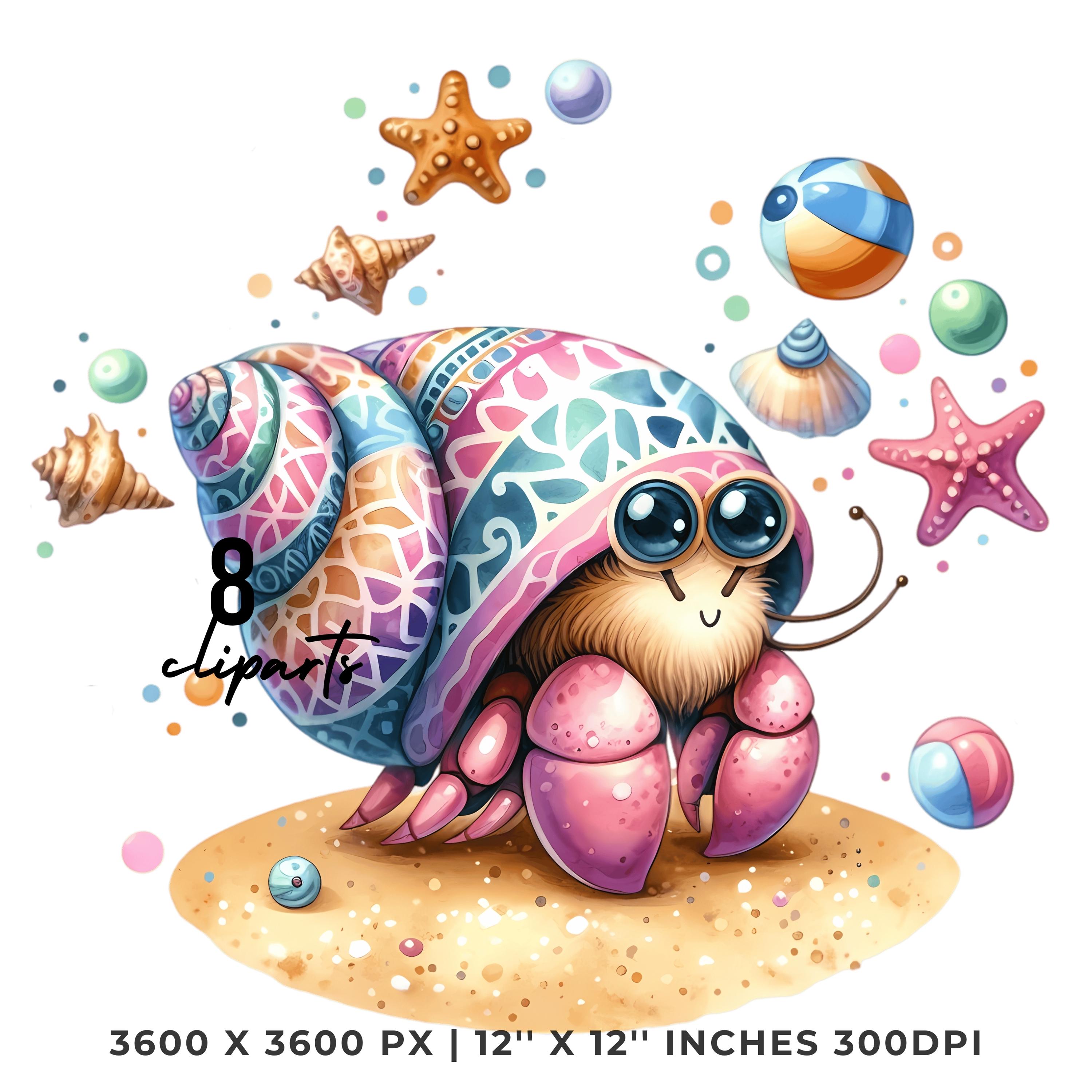 Crab Clipart PNG | 8 Watercolor Hermit Crab in a patterned shell walking on sand with beach toys & seashells | Sublimation Commercial Use