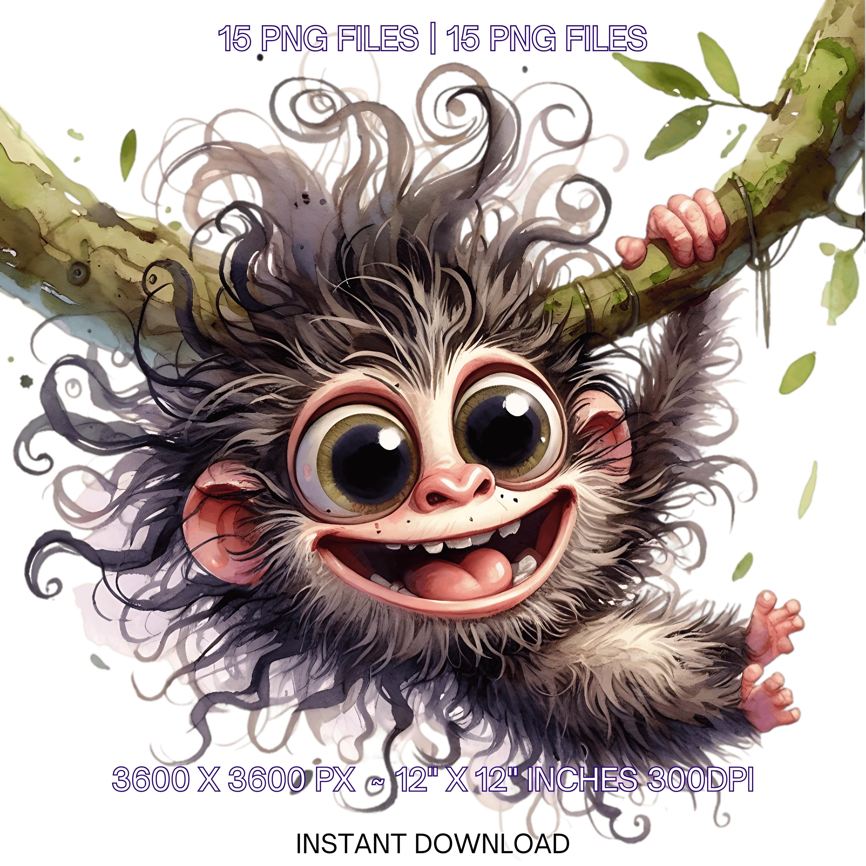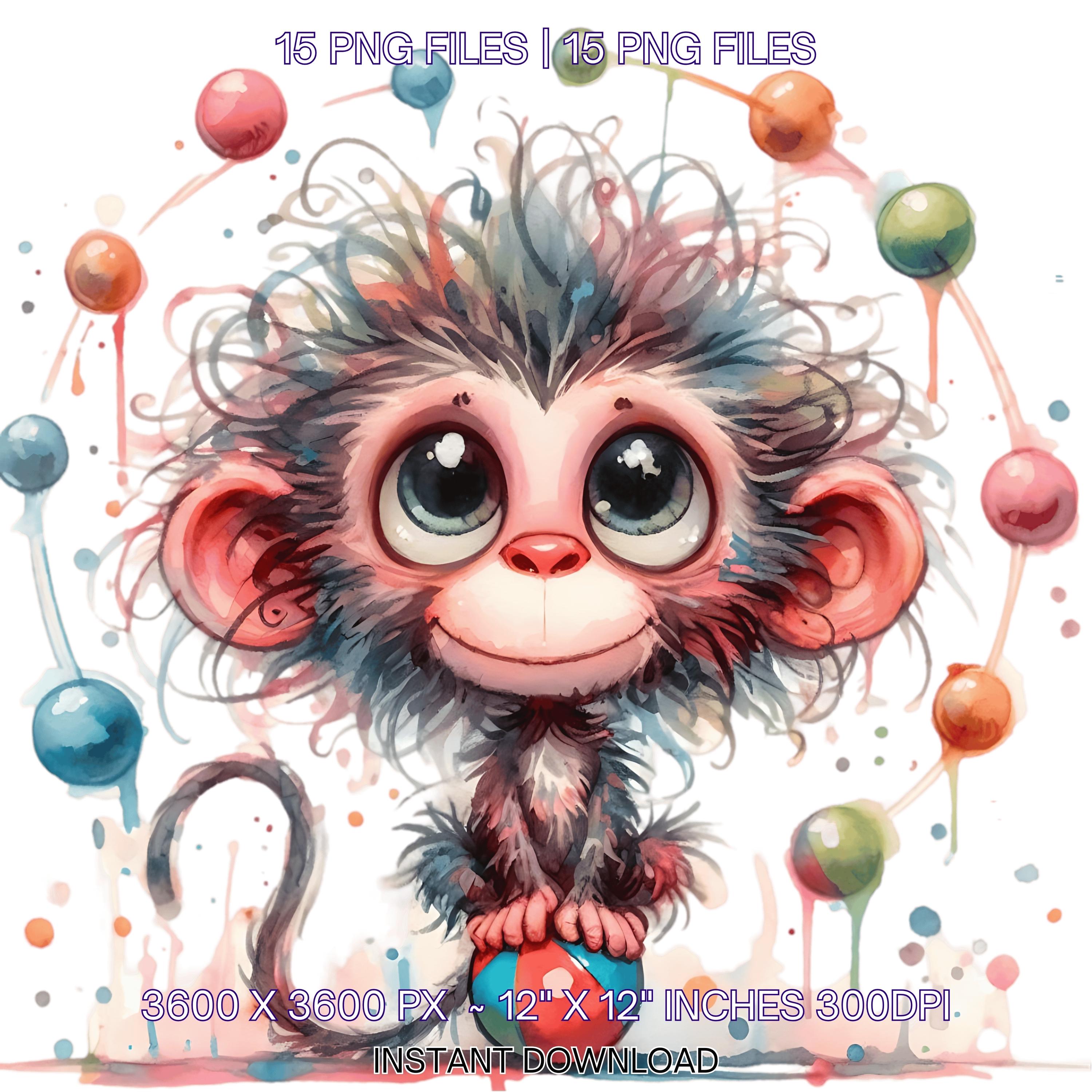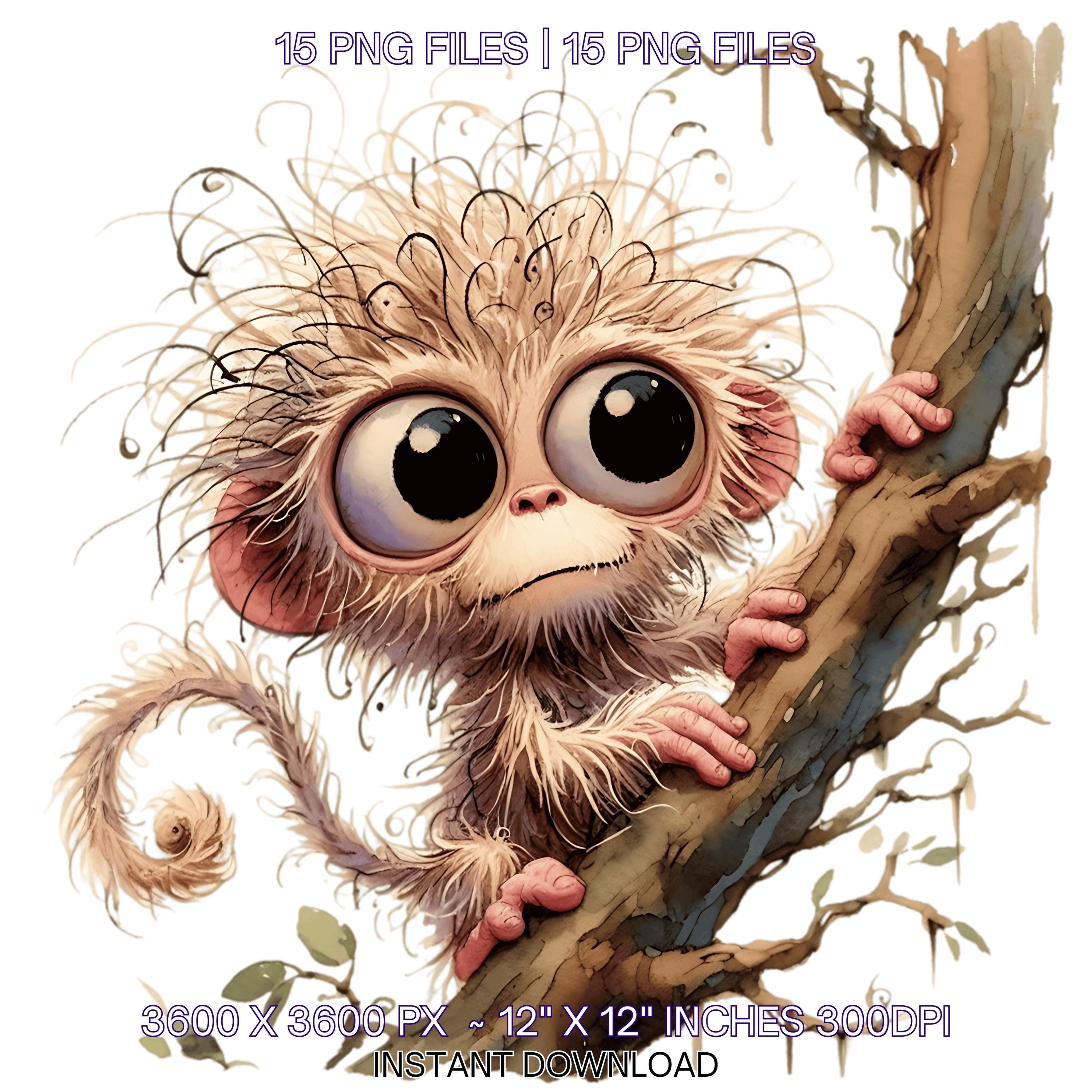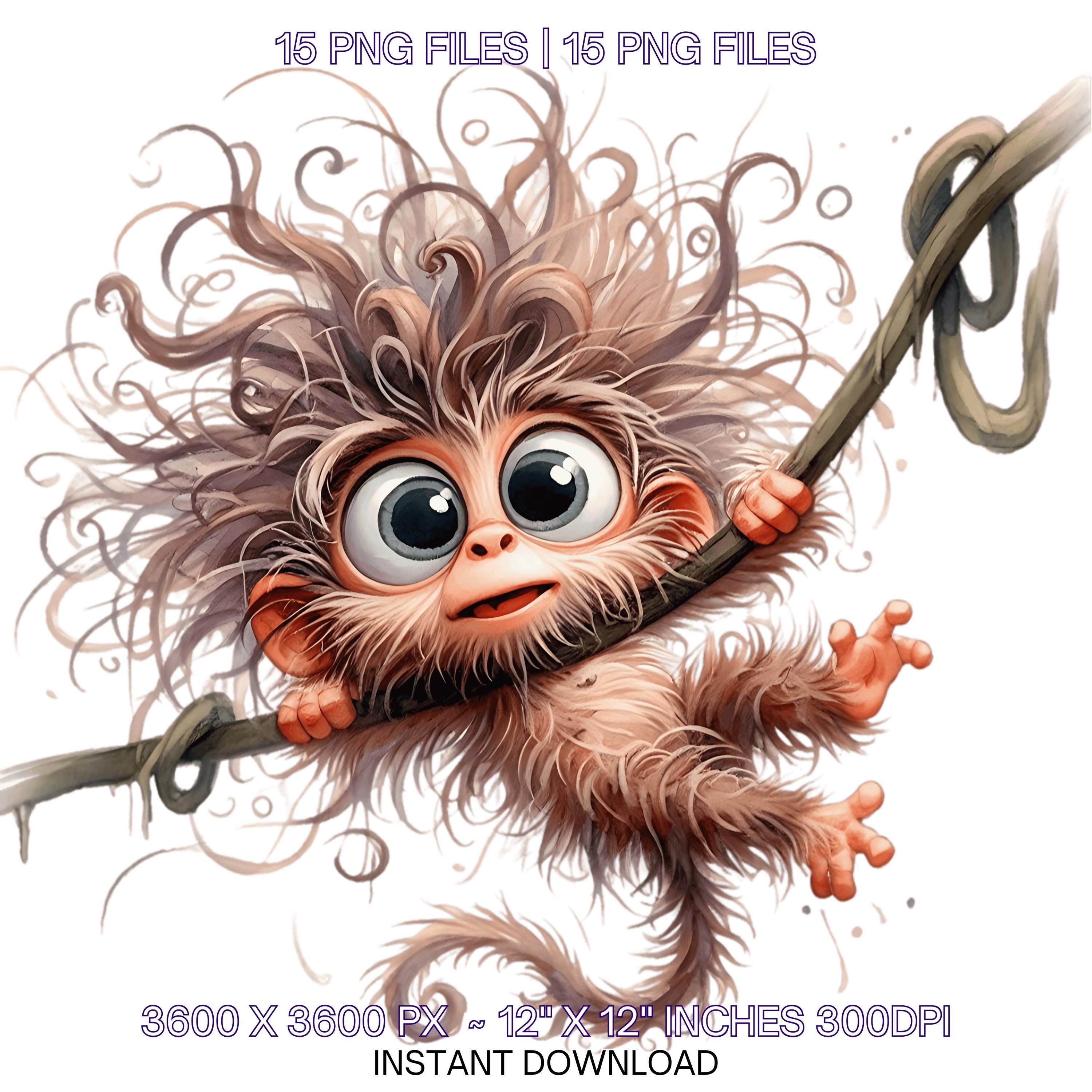 Crazy Monkey Clip Art PNG JPG Bundle | Quirky Frazzled Monkey in Tree | Whimsical Animal Clipart for Scrapbooking, Junk Journals, Cards | 15 PNG + 15 JPG | Commercial Use