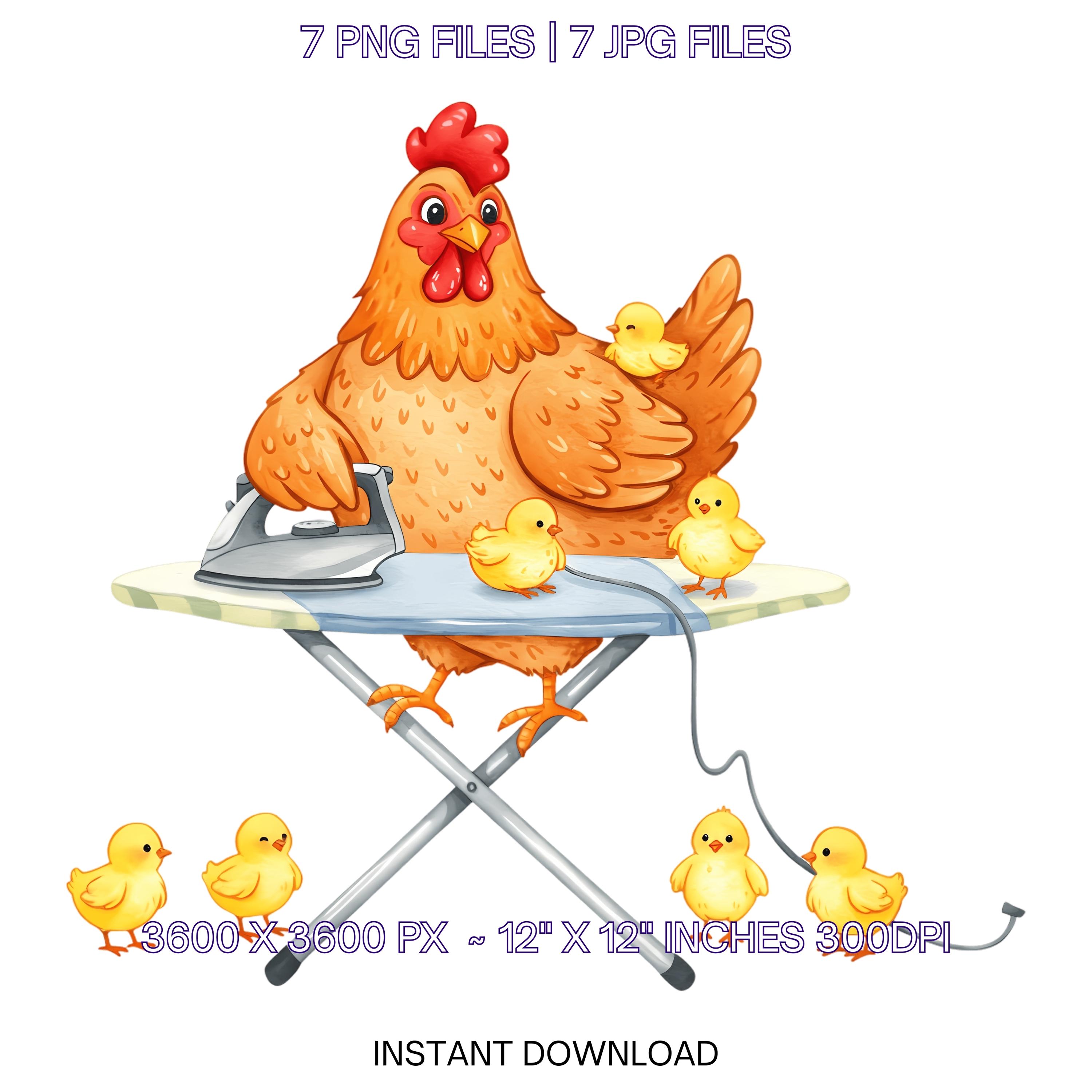 Cute Chicks with Hen PNG Clipart | Frazzled Quirky Whimsical Funny Happy Hen Holds an Iron with Chicks | 7 PNG – 7 JPG Sublimation Commercial Use | Farm Life