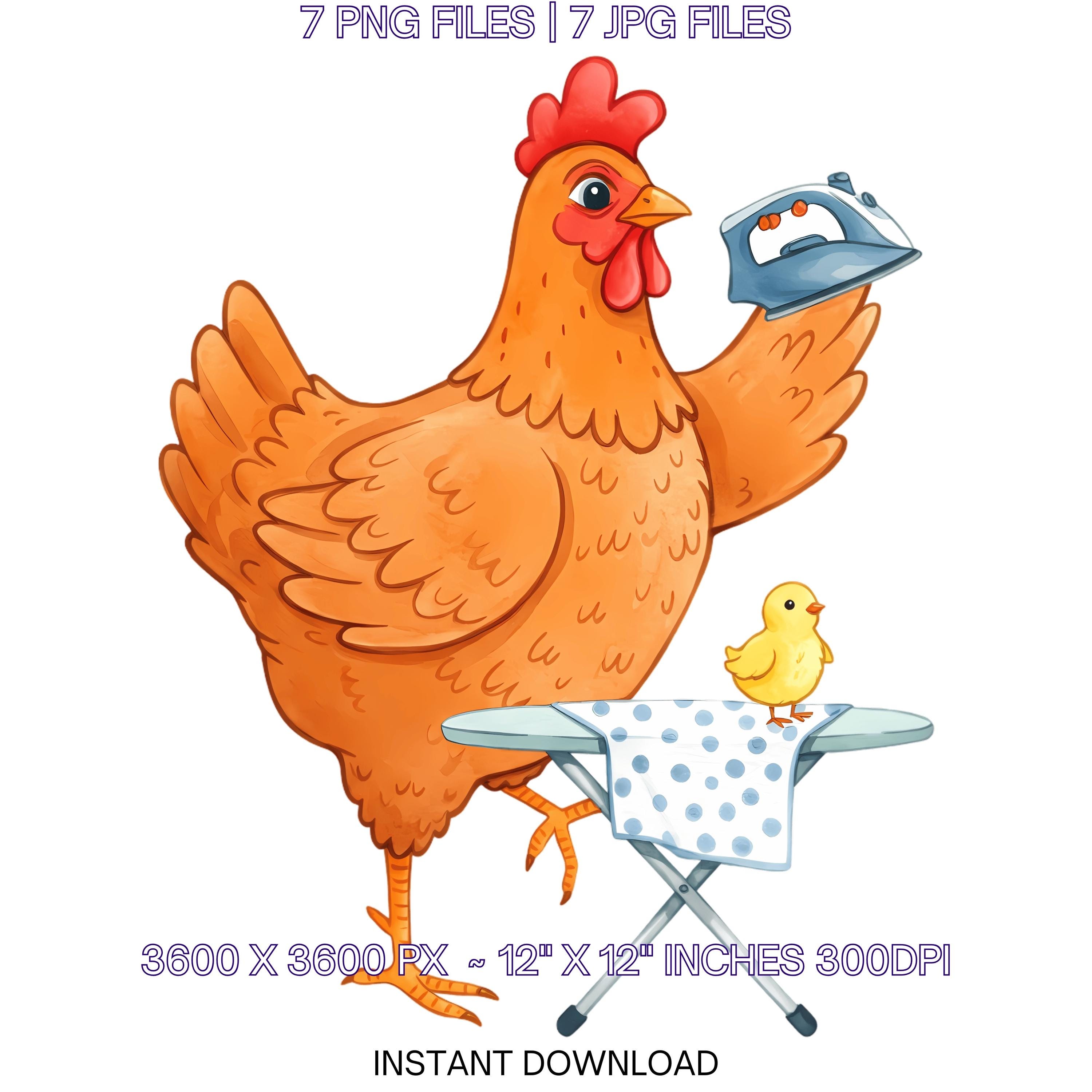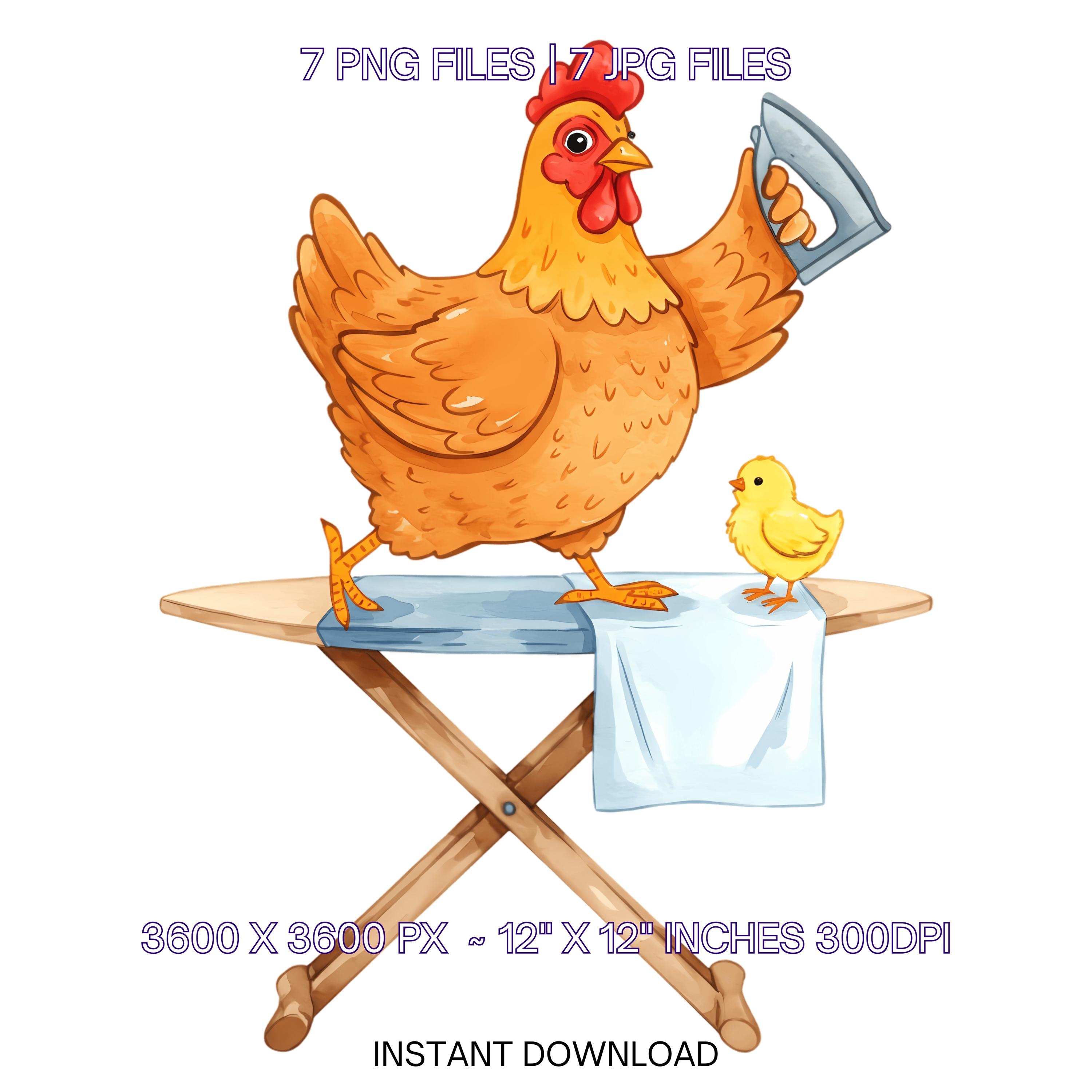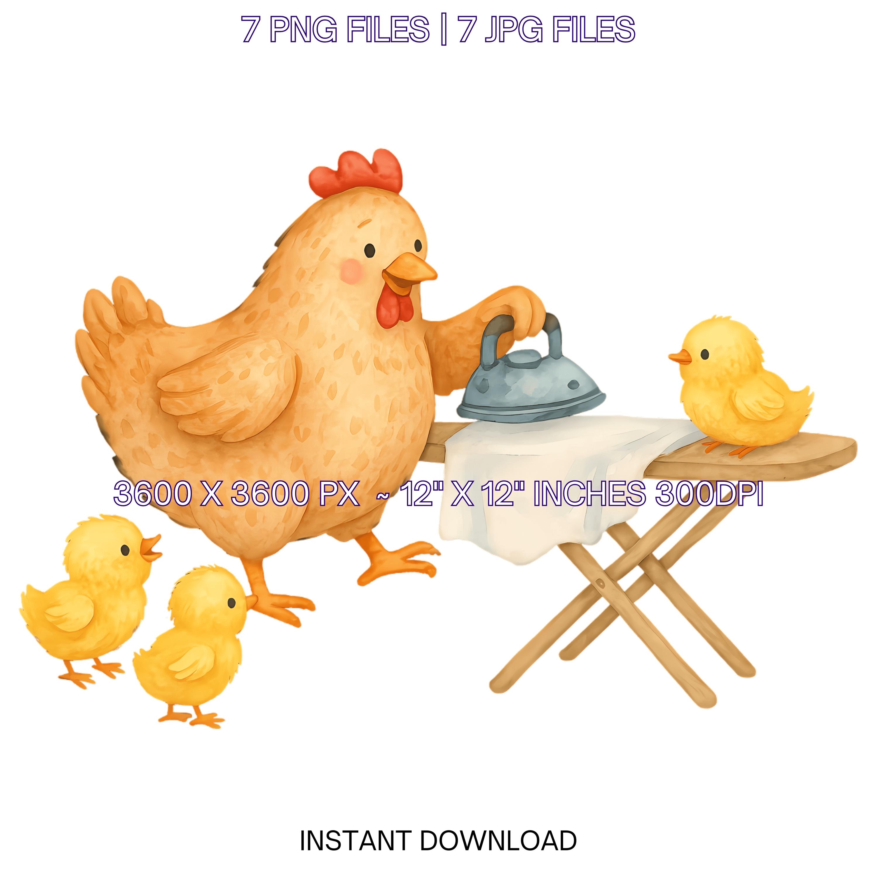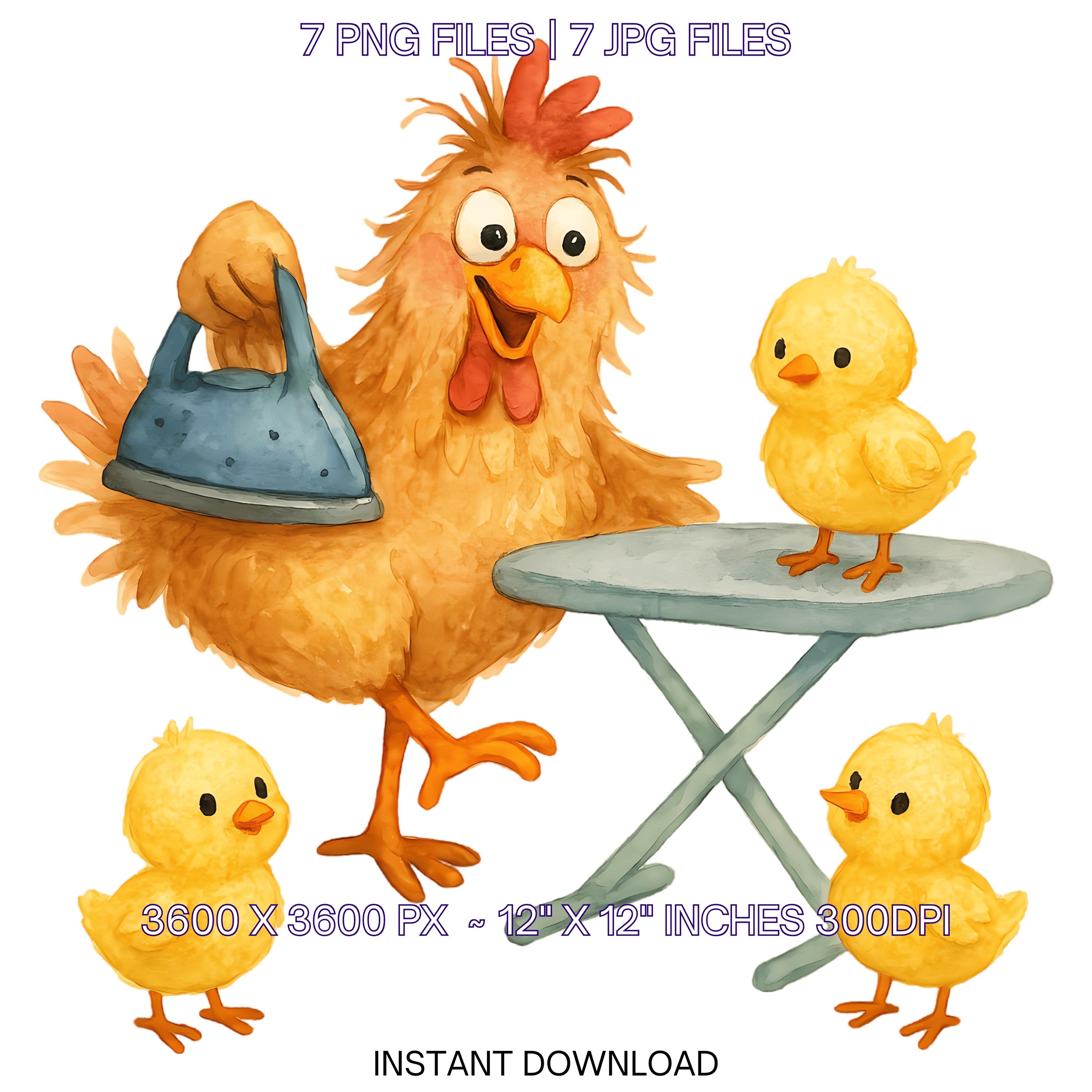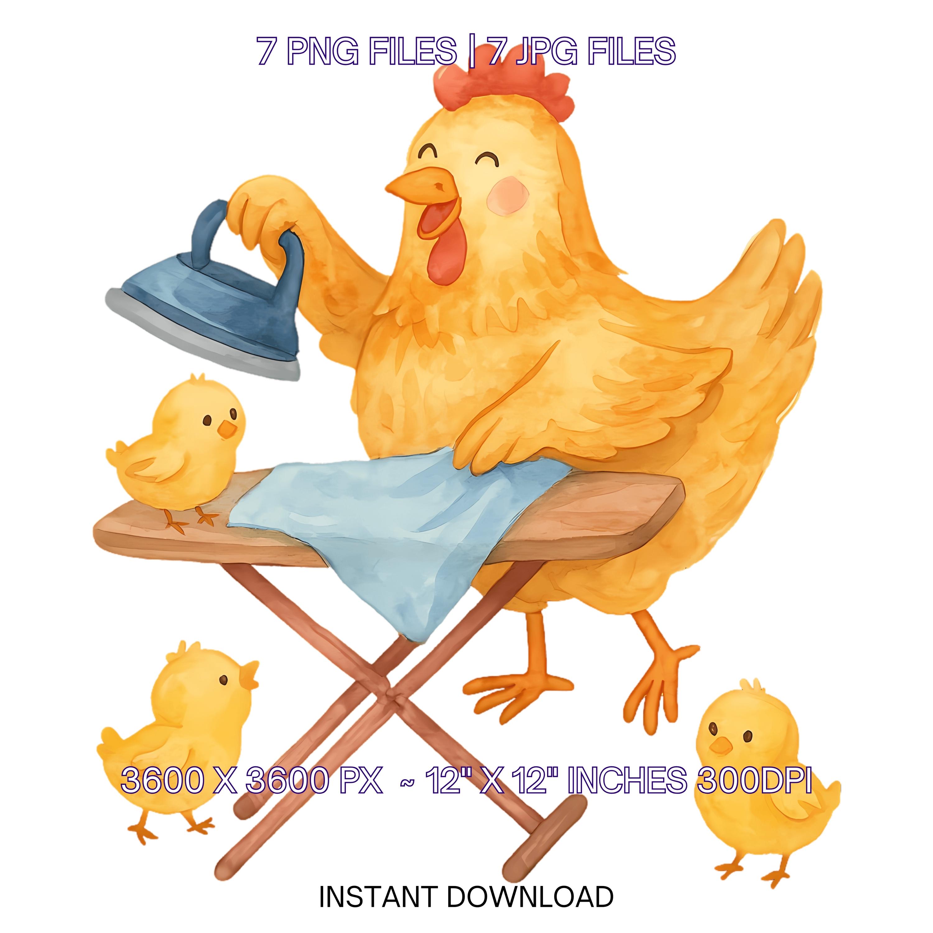 Cute Chicks with Hen Clipart | Frazzled Quirky Whimsical Hen Holds an Iron with Chicks | 7 PNG – 7 JPG Sublimation Commercial Use Farm Life is an eye-catching, high-resolution digital asset designed for creators, crafters, teachers, and small business owners looking to elevate their visuals.